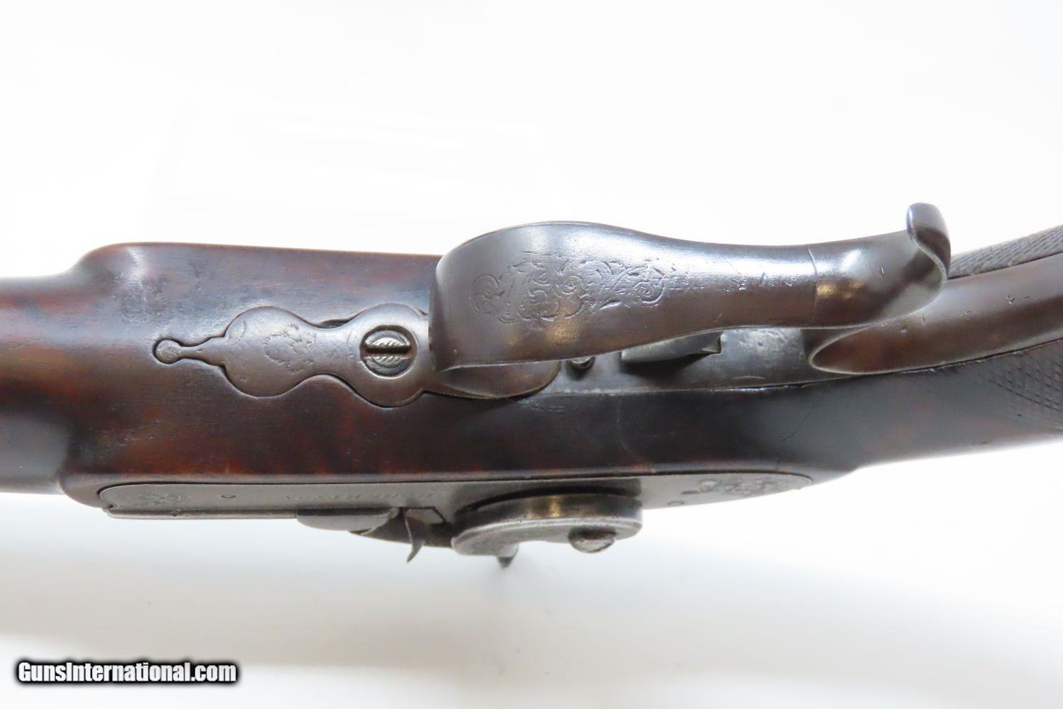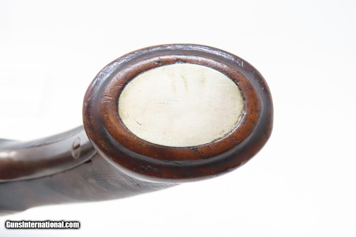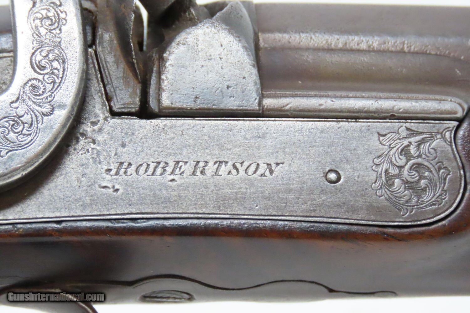 Description: Antique ROBERTSON of PHILADELPHIA Percussion Target Pistol Dueling .48 Cal. 19th Century Percussion Single Shot Pistol Here we present an antique William Robertson Percussion Target Pistol, made circa the 1830s-40s in Philadelphia, Pennsylvania. William Robertson was a Philadelphia gunsmith, known for his fine dueling pistols, between the years of 1829 through 1855. Robertson was located on Gunmaker’s Row on Walnut Street between Front & Second, 2 doors down from famous gunmaker and retailer John Krider. This pistol is quite large and features a heavy octagonal barrel in .48 caliber. The trigger guard has the spur as such target and dueling pistols tend to have. German silver barrel wedge escutcheons and pommel cap. The top barrel flat is faintly marked “ROBERTSON PHILADA”. The locks are also engraved for the maker. The overall condition is good. The action is under great spring tension and the hammer/trigger do function; however, the hammer is sluggish to stay in the fully cocked position. The set part of the trigger needs adjustment. The bore is smooth and in good shape. The stock has been repaired around the lock. This is a large and handsome pistol that would be great on display. Own the original! This is a legitimate antique and not a reproduction. Barrel is 10 inches. Caliber: .48 Percussion Overall condition as seen in photos. Very Fast. Very Safe. FREE SHIPPING WORLDWIDE. Delivered directly to your door by express mail! Guaranteed AUTHENTIC & Includes CERTIFICATE OF AUTHENTICITY. ancestryguns $1515 #210587 SOLD Antique: Yes |