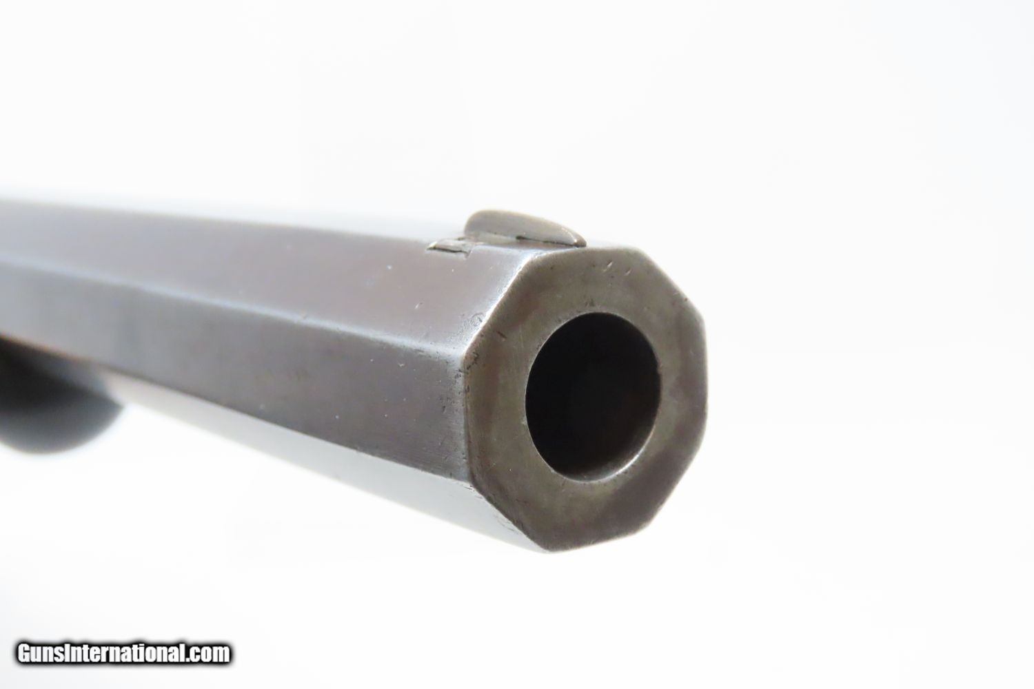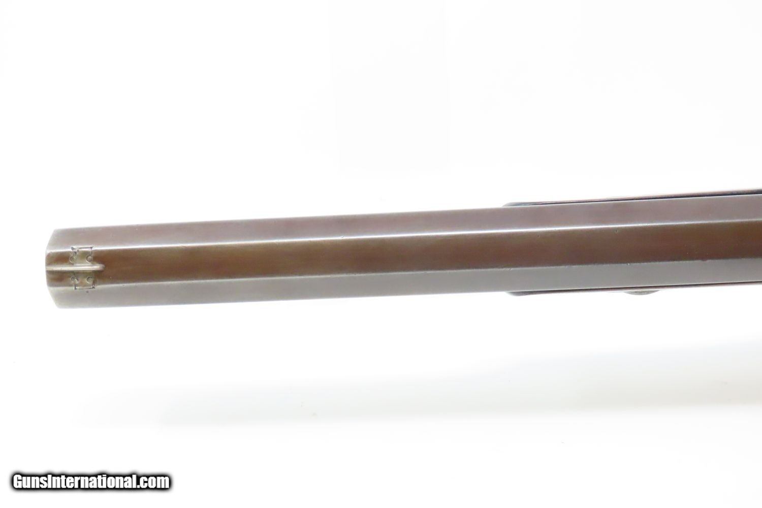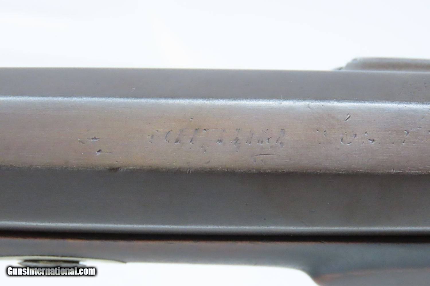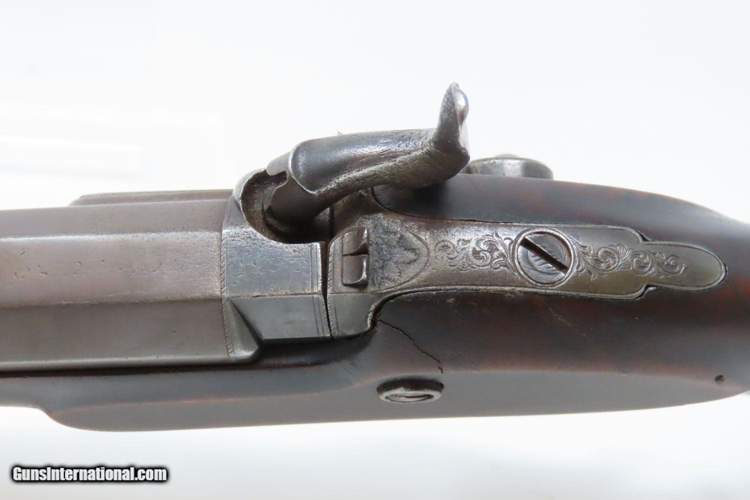 Description: Antique ROBERTSON of PHILADELPHIA Percussion Target Pistol Dueling .48 Cal. 19th Century Percussion Single Shot Pistol Here we present an antique William Robertson Percussion Target Pistol, made circa the 1830s-40s in Philadelphia, Pennsylvania. William Robertson was a Philadelphia gunsmith, known for his fine dueling pistols, between the years of 1829 through 1855. Robertson was located on Gunmaker’s Row on Walnut Street between Front & Second, 2 doors down from famous gunmaker and retailer John Krider. This pistol is quite large and features a heavy octagonal barrel in .48 caliber. The trigger guard has the spur as such target and dueling pistols tend to have. German silver barrel wedge escutcheons and pommel cap. The top barrel flat is faintly marked “ROBERTSON PHILADA”. The locks are also engraved for the maker. The overall condition is good. The action is under great spring tension and the hammer/trigger do function; however, the hammer is sluggish to stay in the fully cocked position. The set part of the trigger needs adjustment. The bore is smooth and in good shape. The stock has been repaired around the lock. This is a large and handsome pistol that would be great on display. Own the original! This is a legitimate antique and not a reproduction. Barrel is 10 inches. Caliber: .48 Percussion Overall condition as seen in photos. Very Fast. Very Safe. FREE SHIPPING WORLDWIDE. Delivered directly to your door by express mail! Guaranteed AUTHENTIC & Includes CERTIFICATE OF AUTHENTICITY. ancestryguns $1515 #210587 SOLD Antique: Yes |