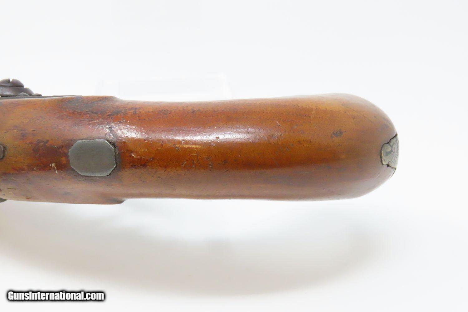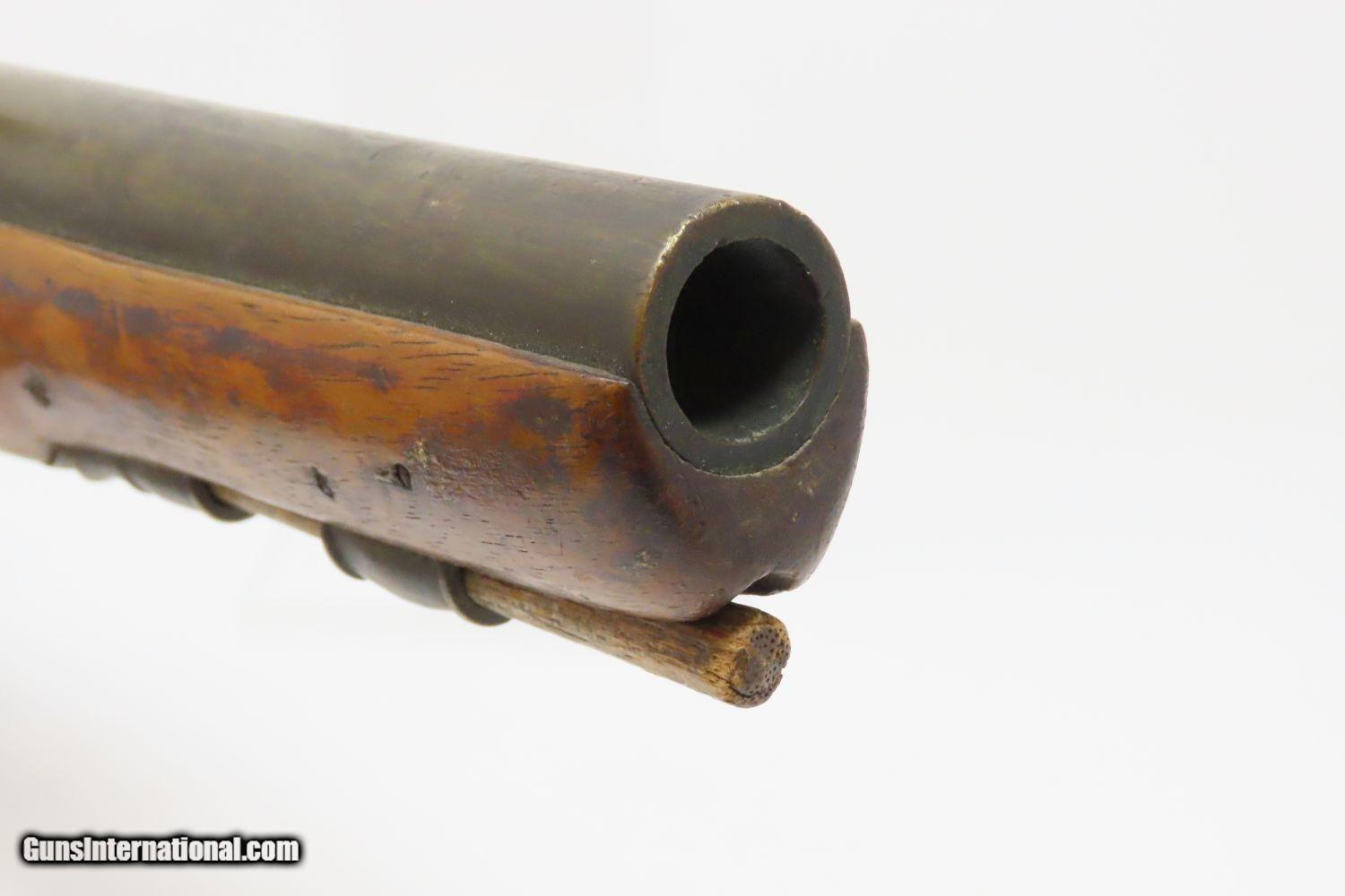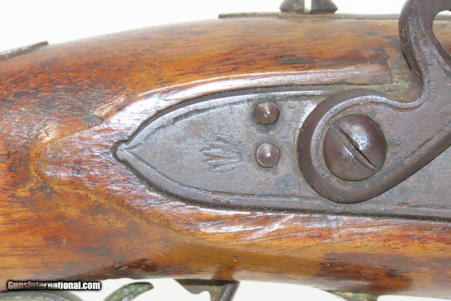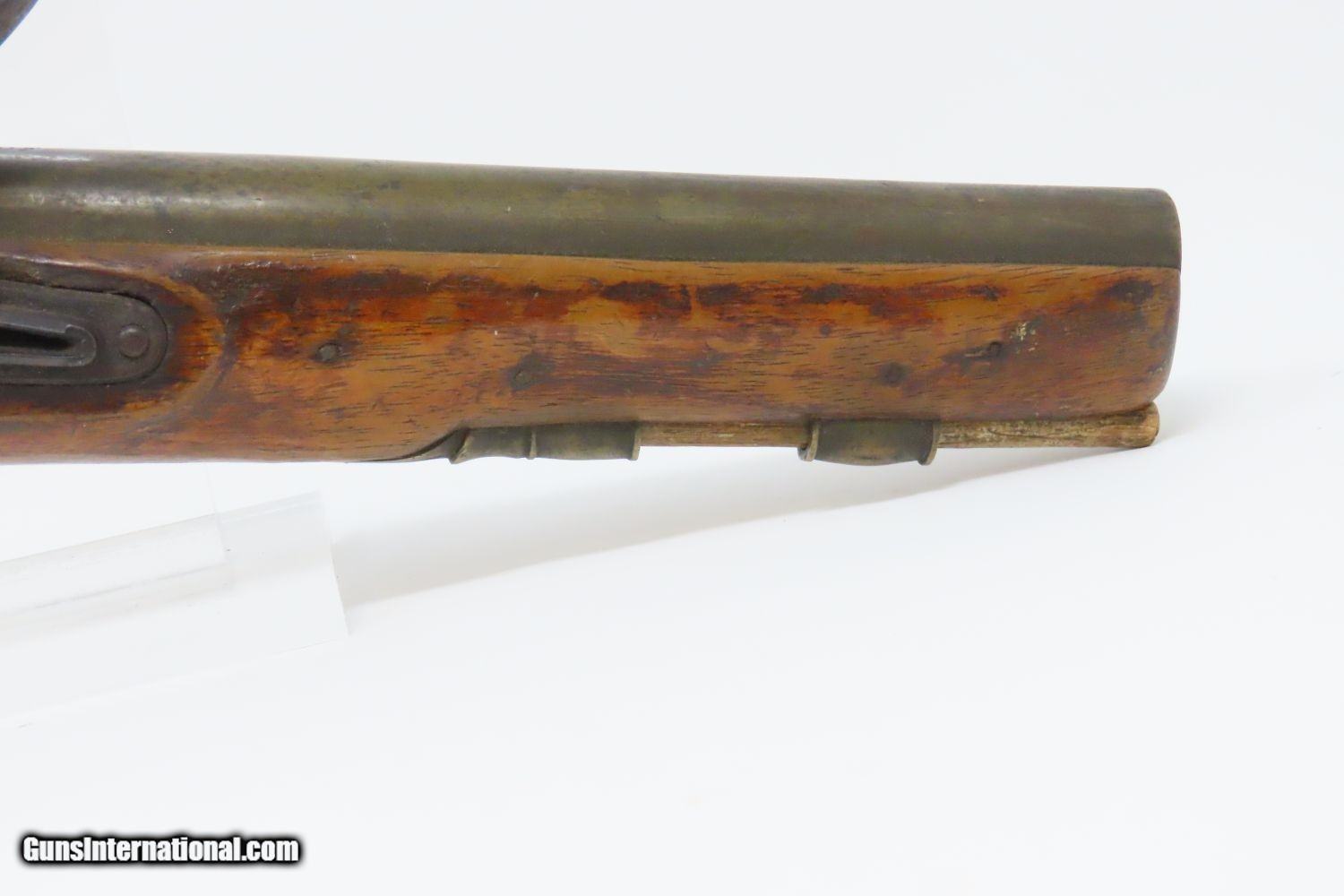 Description: Antique SHARPE of LONDON “Extra Sharpe Proof” Flintlock INDIAN TRADE Pistol British with Birmingham Proofs & Brass Barrel Here we present an antique Sharpe Flintlock Trade Pistol, made circa the early 1800s in Birmingham, England. This London Gun maker "SHARPE" was in business from around 1800 until 1840. He initially contracted with the Hudson Bay Company to supply these good quality Flintlock pistols that were traded to the Indigenous Indians in exchange for fur pelts that were eagerly desired in the European Fashion Trade. The Hudson Bay company was founded in May of 1670 primarily serving in the fur trading industry in its early years and has continued for 350 years to present day in London, England. This pistol was designed to make massive holes in things. This pistol would have been a horse carried pistol or perhaps even worn on a belt. The overall condition is good. The lock reads “SHARPE”. Atop the barrel “EXTRA/SHARPE/PROOF” is engraved. The action is strong, although the top jaw is missing. The bore is smooth and dark. The stock is solid and remains in great shape. Own the original! This is a legitimate antique and not a reproduction. Barrel is 8 inches. Caliber: .60 Overall condition as seen in photos. Very Fast. Very Safe. FREE SHIPPING WORLDWIDE. Delivered directly to your door by express mail! Guaranteed AUTHENTIC & Includes CERTIFICATE OF AUTHENTICITY. ancestryguns $1565 #20671 SOLD Antique: Yes |
