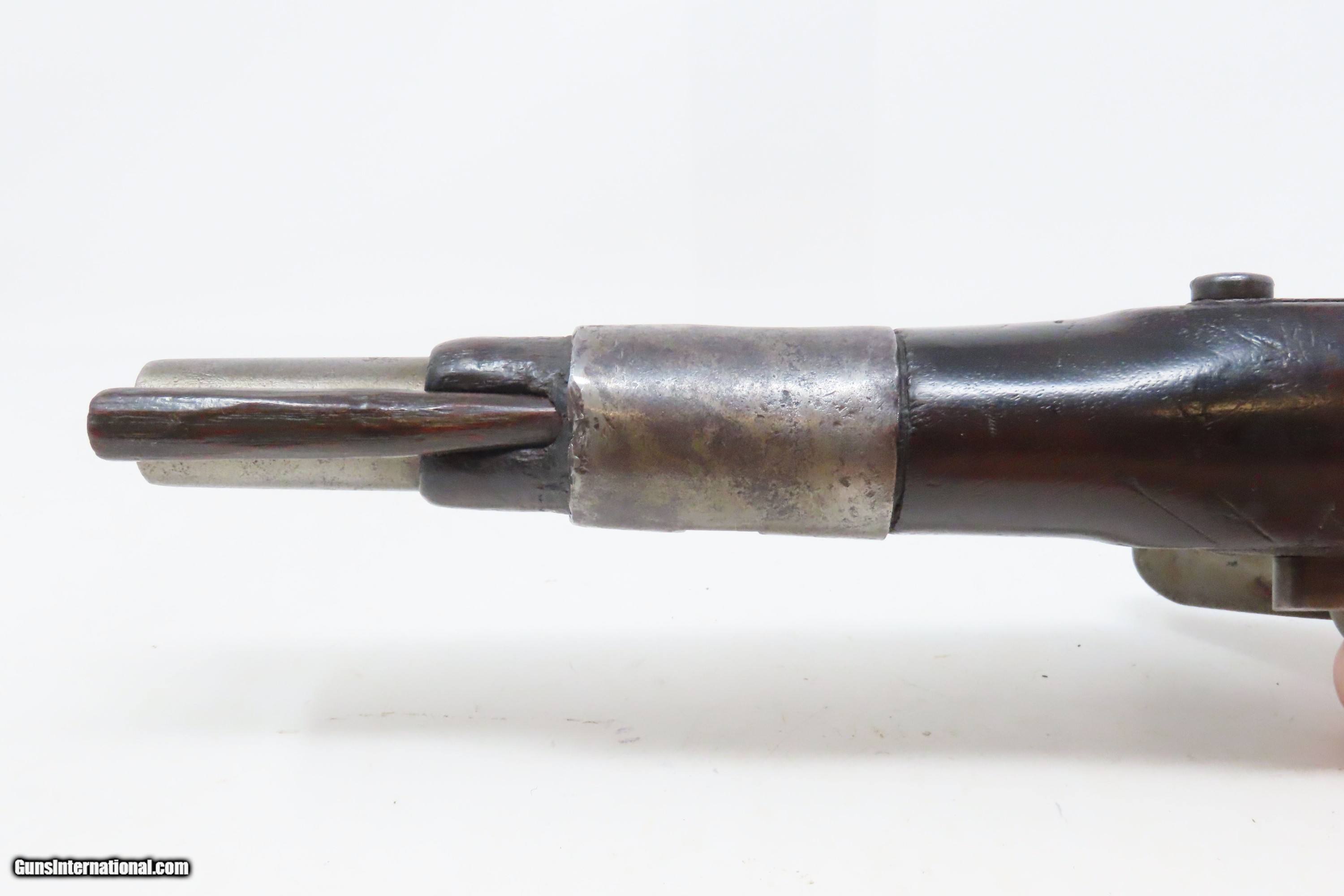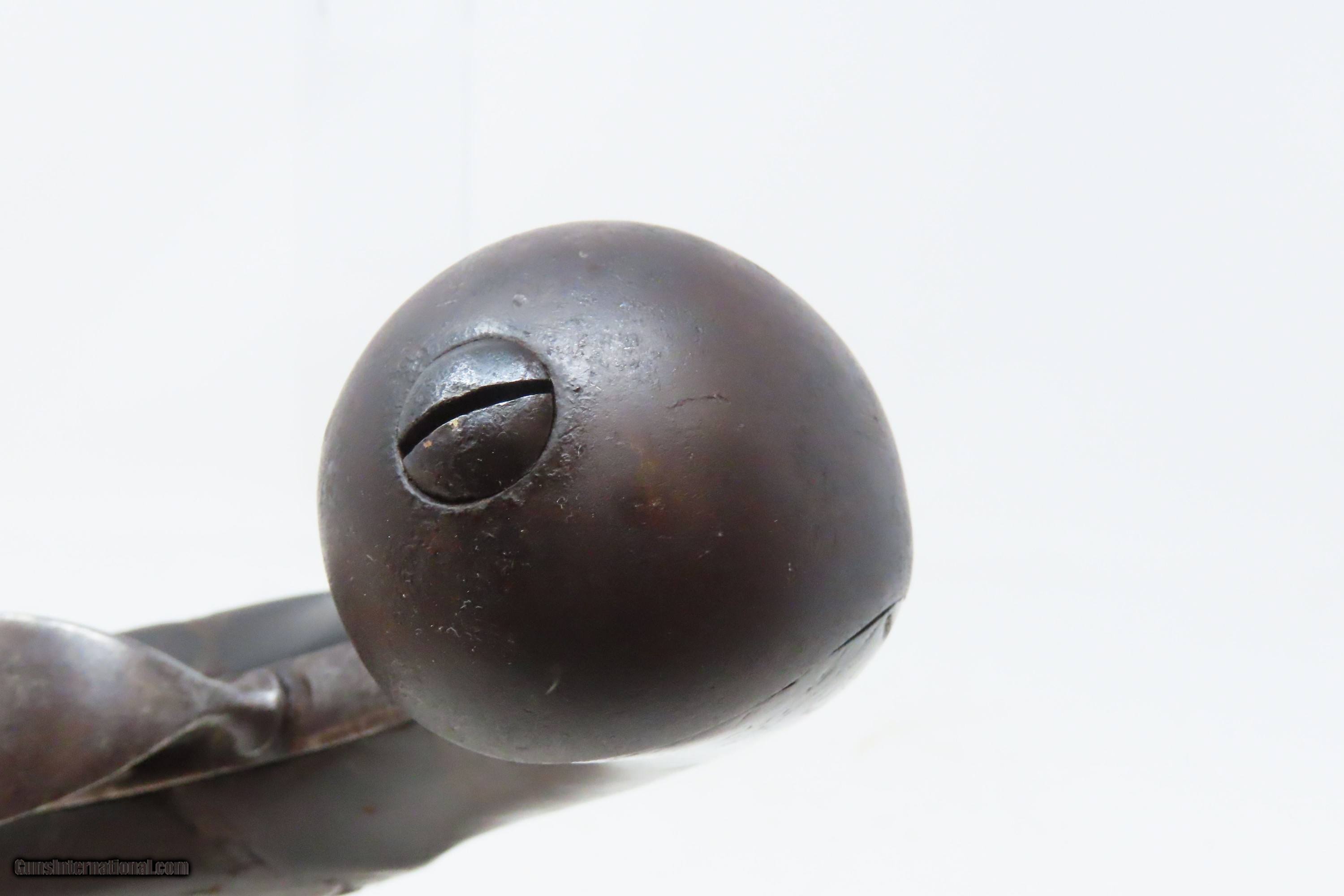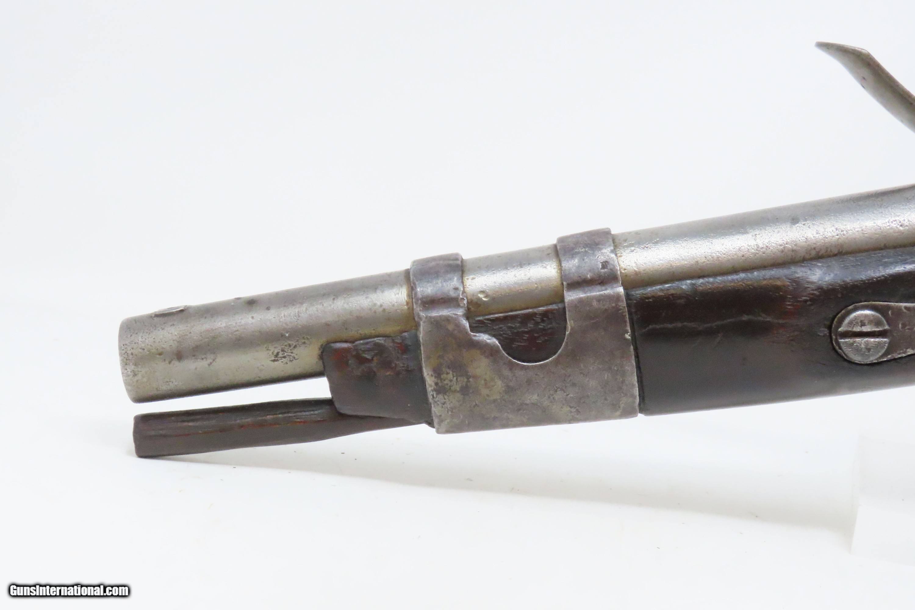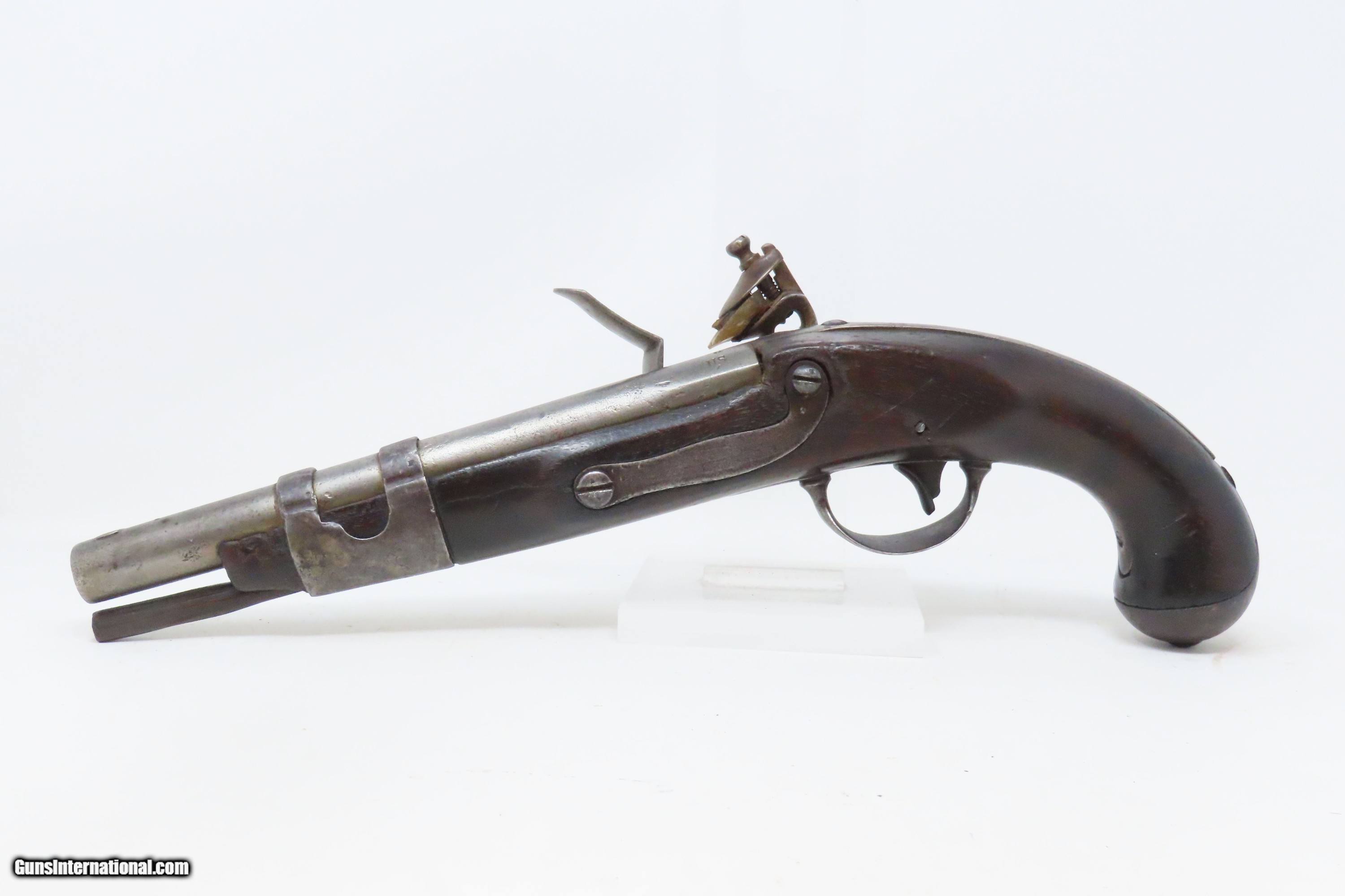 Description: Antique SIMEON NORTH U.S. M1816 .54 Military FLINTLOCK Pistol KIT CARSON U.S. CONTRACT Early American Army & Navy Sidearm Here we present an antique Simeon North U.S. Contract Model 1816 Flintlock Pistol, manufactured between 1817-20 in Middletown, Connecticut. 19,374 of these were made for the U.S. military. Many were updated to the much more reliable percussion system in the 1830s. The service life was quite long for this pistol. The famous scout and Indian fighter Kit Carson fought with one of these, still in its original flintlock form, during the Mexican-American War from 1846-48. Even though percussion arms, including pistols, had been adopted by the U.S. in the 30s, it was not unusual for flintlocks to still be in use. Primary conflicts that would have involved this piece during its service life were the Seminole Wars, the Pawnee Expedition, the Mexican-American War and even the American Civil War. The lock is marked “S. NORTH, US, MIDL. CON.”. along with the Federal Eagle. The barrel is also marked “US”. The overall condition is rough. Reconverted to flintlock. The action does not go to the full-cock position. The bore is smooth and patinated. The stock has been broken and repaired all the way around the lock inlet area. Own the original! This is a legitimate antique and not a reproduction. Barrel is 9-1/8 inches. Caliber: .54 Flintlock Overall condition as seen in photos. Very Fast. Very Safe. FREE SHIPPING WORLDWIDE. Delivered directly to your door by express mail! Guaranteed AUTHENTIC & Includes CERTIFICATE OF AUTHENTICITY. ancestryguns $1200 #233546 SOLD Antique: Yes |