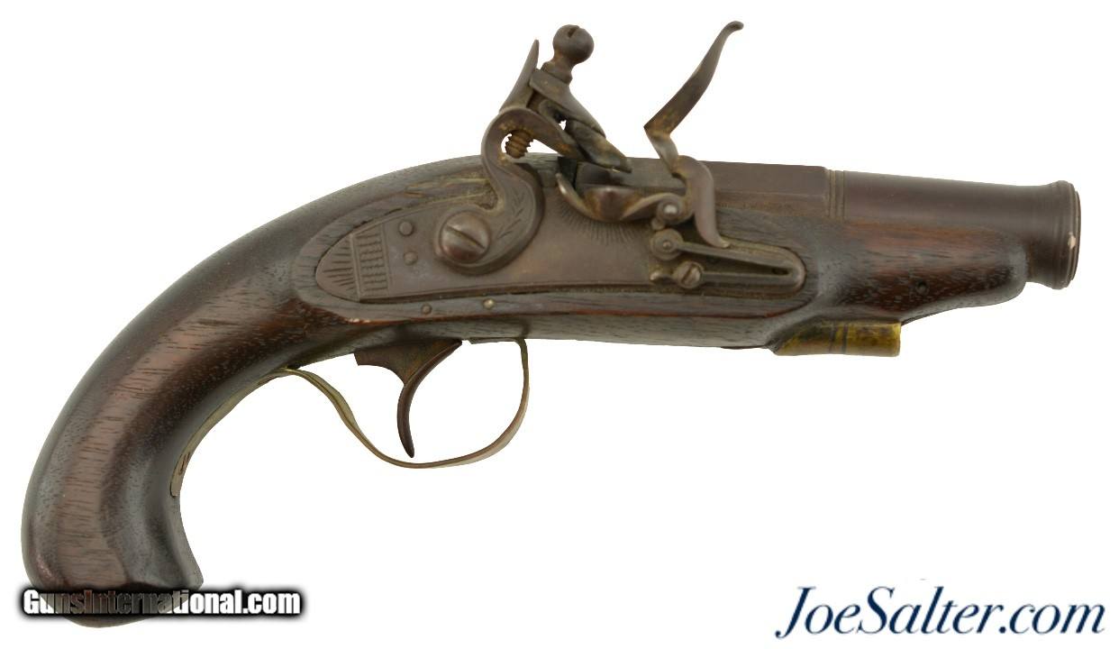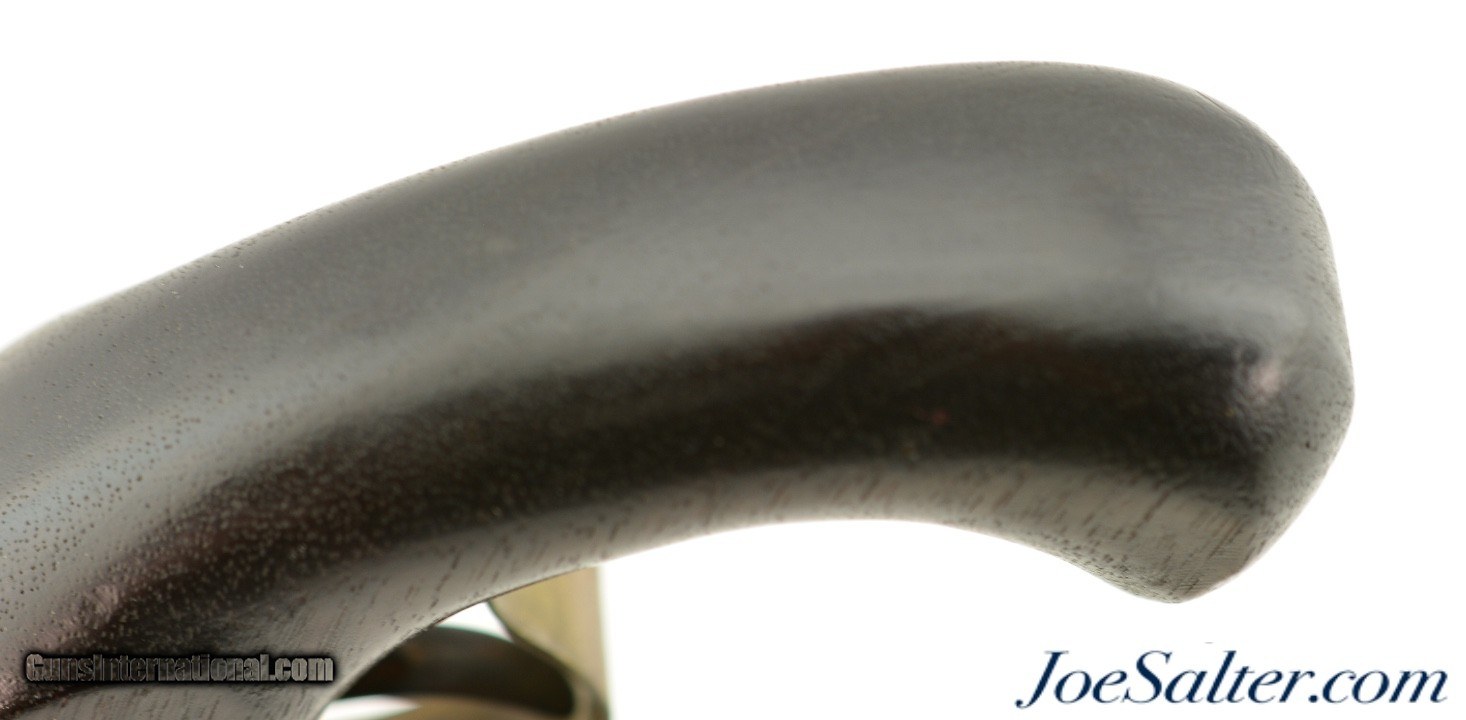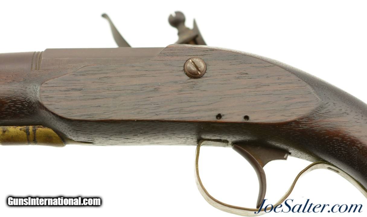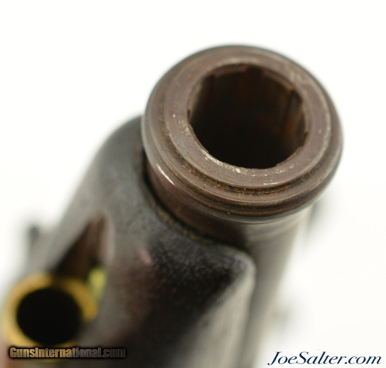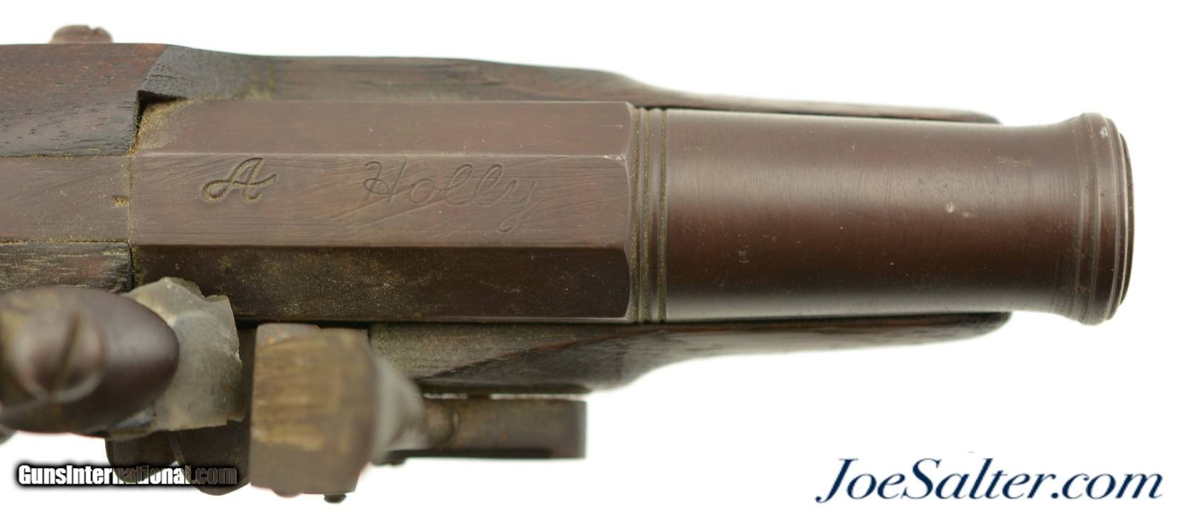 Description: Art Holly was an early 1960s builder of modern muzzle-loading guns in the traditional American style. His firearms are noted for their high quality, especially considering they were made by hand. He reportedly only made a total of 9 pistols, making any surviving example a rare find. This example is in very good to excellence, original flintlock condition and of small, early, Lancaster "Kentucky Pistol" form. Octagonal-to-round, rifled, pin-fastened, .45 caliber, 3 1/2" barrel with a wedding-band barrel-transition and a cannon-form muzzle. Retains almost all of the original brown finish with light oxidation in the barrel. The wooden stock is in fine condition with hardly a blemish and excellence patina. The lock plate is embellished as is the hammer and under the pan. Mechanically has a strong mainspring with a worn trigger sear and will not stay at full cock most of the time. The ramrod is missing. Over-all a nice small flintlock pistol from a famous maker.; Antique: Yes Price: $589.00 Contact Seller |