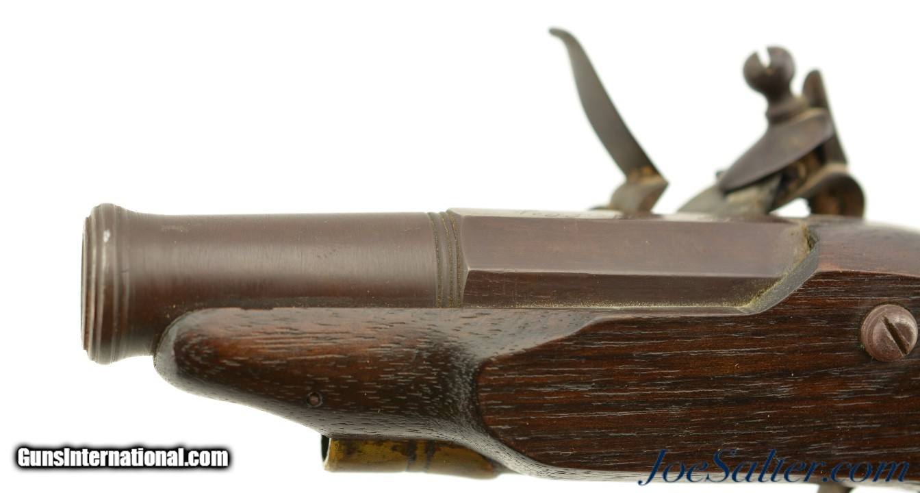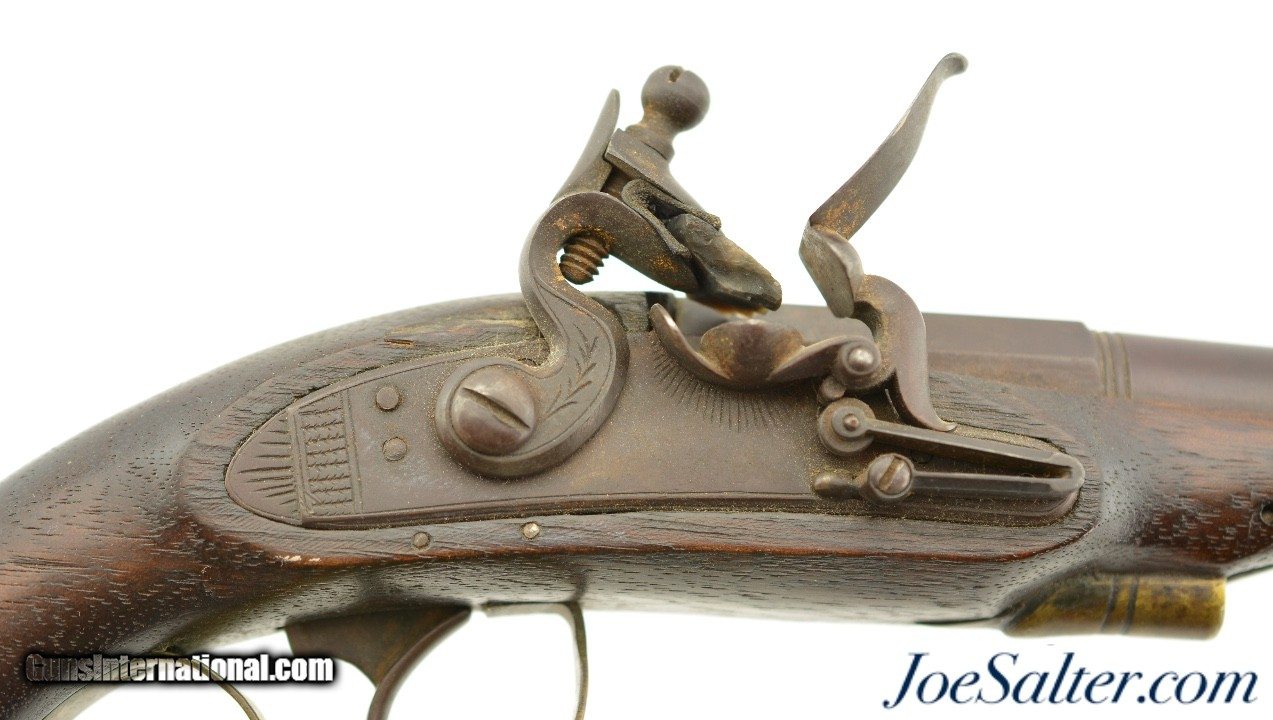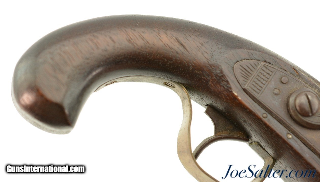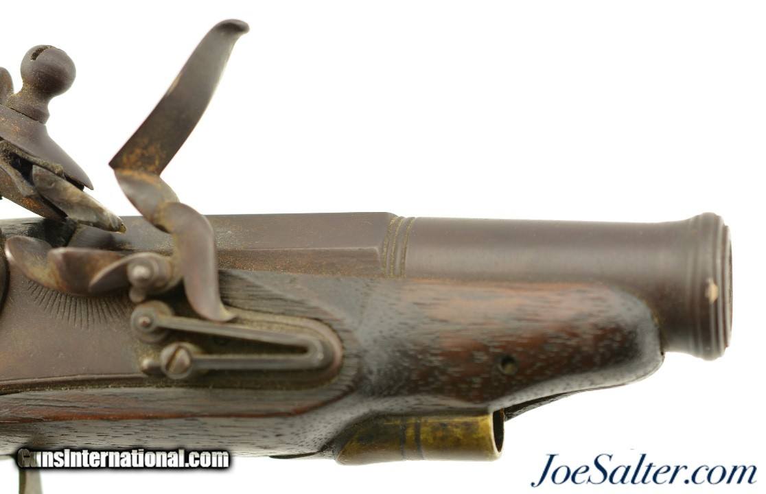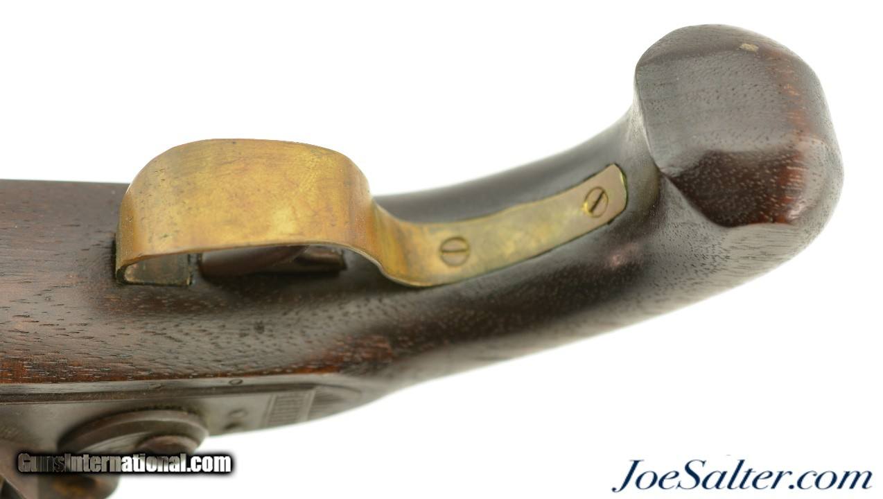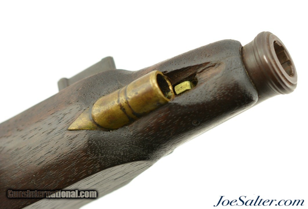Description: Art Holly was an early 1960s builder of modern muzzle-loading guns in the traditional American style. His firearms are noted for their high quality, especially considering they were made by hand. He reportedly only made a total of 9 pistols, making any surviving example a rare find. This example is in very good to excellence, original flintlock condition and of small, early, Lancaster "Kentucky Pistol" form. Octagonal-to-round, rifled, pin-fastened, .45 caliber, 3 1/2" barrel with a wedding-band barrel-transition and a cannon-form muzzle. Retains almost all of the original brown finish with light oxidation in the barrel. The wooden stock is in fine condition with hardly a blemish and excellence patina. The lock plate is embellished as is the hammer and under the pan. Mechanically has a strong mainspring with a worn trigger sear and will not stay at full cock most of the time. The ramrod is missing. Over-all a nice small flintlock pistol from a famous maker.; Antique: Yes Price: $589.00 Contact Seller |