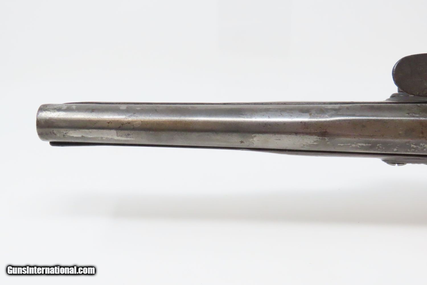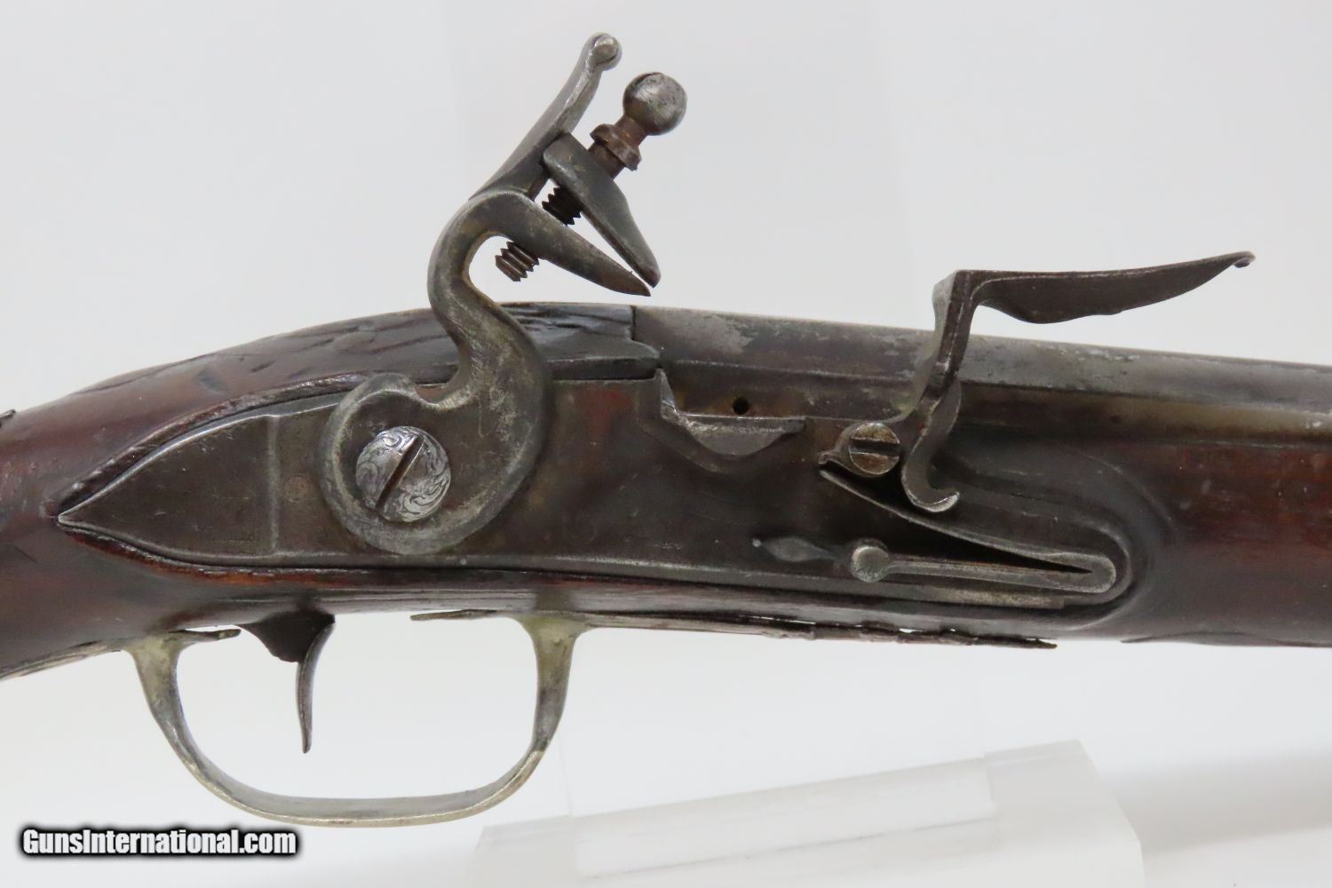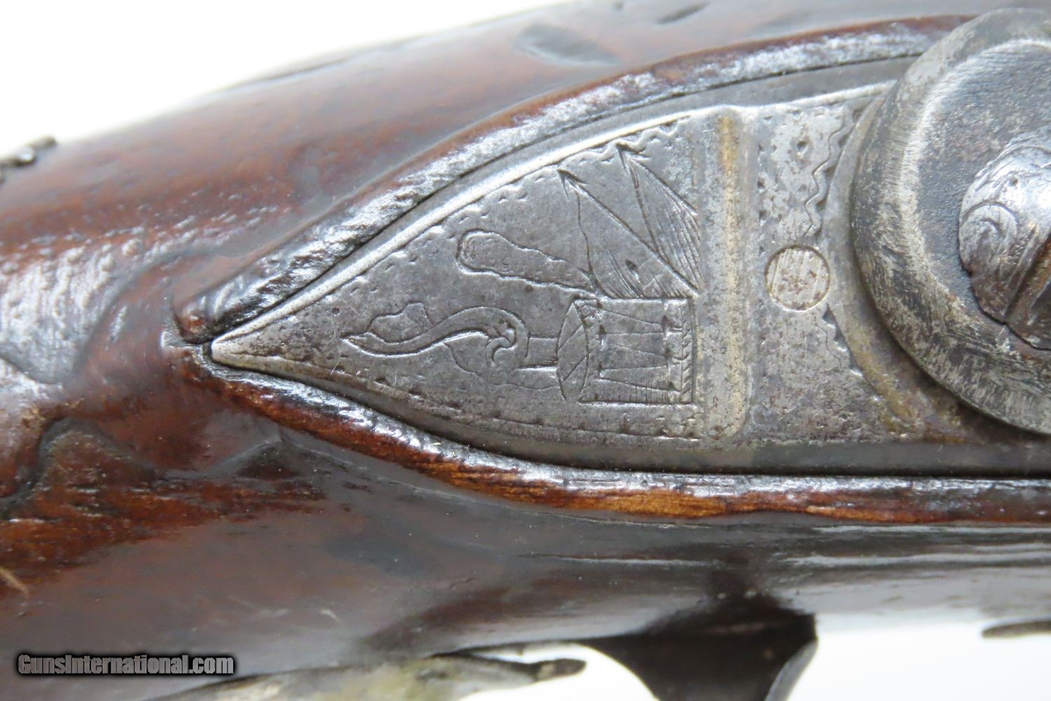 Description: BALOCHE of PARIS Antique SILVER Mounted FLINTLOCK Officer’s PISTOL 18th Century “1st French Colonial Empire” Flintlock Pistol Here we present a Baloche of Paris antique French Flintlock Officer’s Pistol, made circa the mid to late-1700s near the end of the 1st French Colonial Empire. The “1st French Colonial Empire” was made up of the overseas colonies and European territories that came under French rule from the 16th century onward through 1814, by which most of their empire had been lost. The “2nd Colonial Empire” began with the conquest of Algiers in 1830 and continued until later wars in Indochina (1954) and Algeria (1962) brought an end to the 2nd Empire. This is a large pistol with a massive .60 caliber bore. This handsome pistol would have been most at home in a saddle mounted pommel holster when not punching large holes in the enemy. This would have been the type of pistol an officer purchased on his own to bring to battle in case he were to come into contact with the enemy. It features a cast, silver plated initial placard on the top of the grip and a Greek style bust on the pommel cap. The overall condition is good. The action is strong and tight. The bore is in good shape, smooth and dark. The stock is lightly carved behind the breech. The lock is lightly hand engraved. The lock is engraved “BALOCHE”. Some letters appear to have faded, but “A PARIS” can still be read on the lock as well. This example would do just fine on display with a collection! Own the original! This is a legitimate antique and not a reproduction. Barrel is 9-1/4 inches. Caliber: .60 Overall condition as seen in photos. Very Fast. Very Safe. FREE SHIPPING WORLDWIDE. Delivered directly to your door by express mail! Guaranteed AUTHENTIC & Includes CERTIFICATE OF AUTHENTICITY. ancestryguns $1755 #20728 SOLD Antique: Yes |