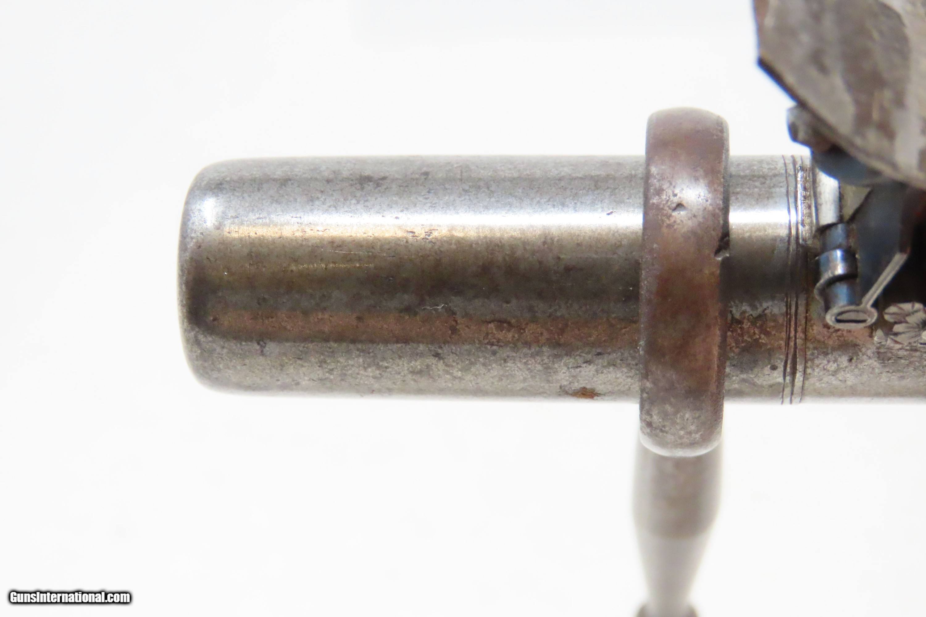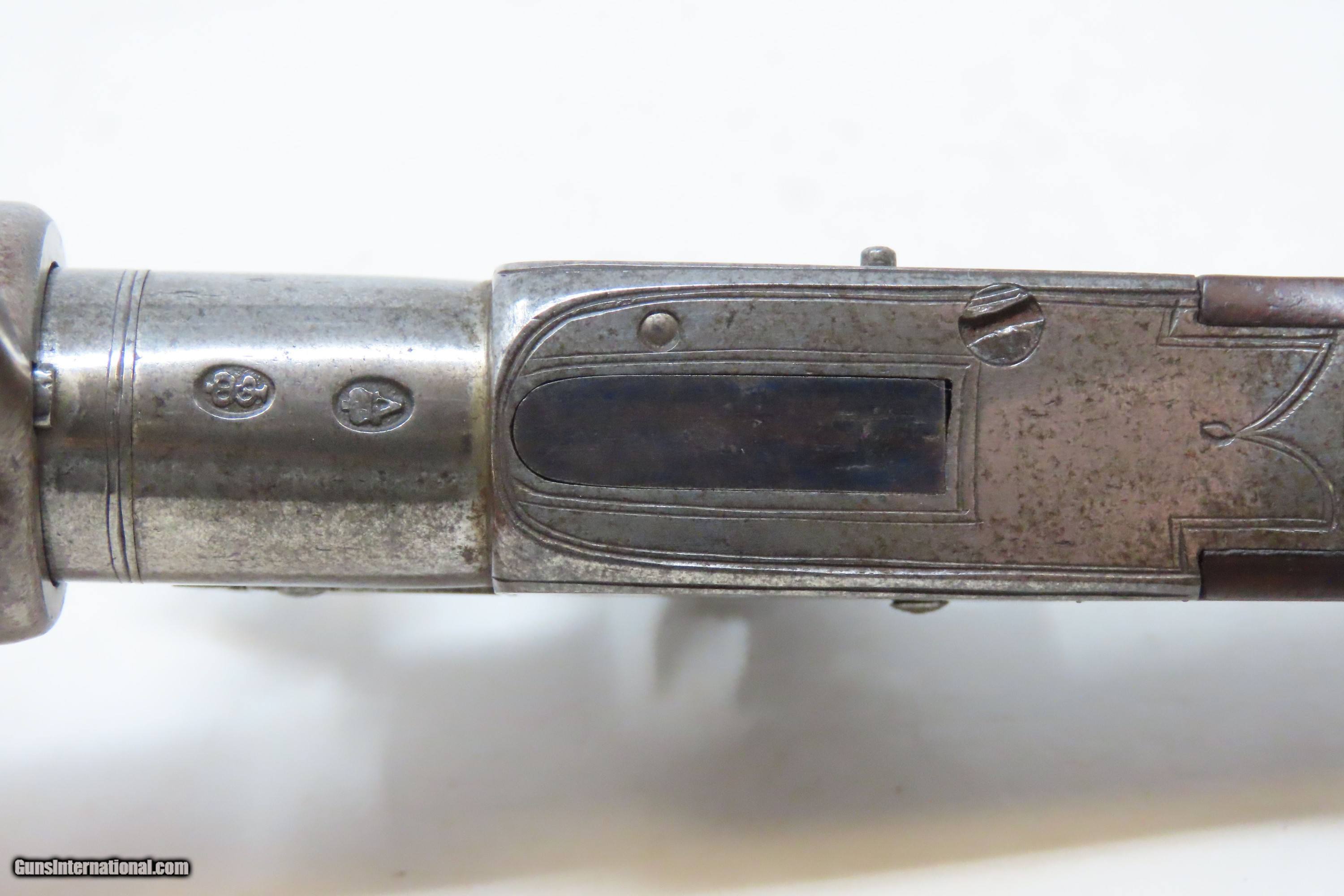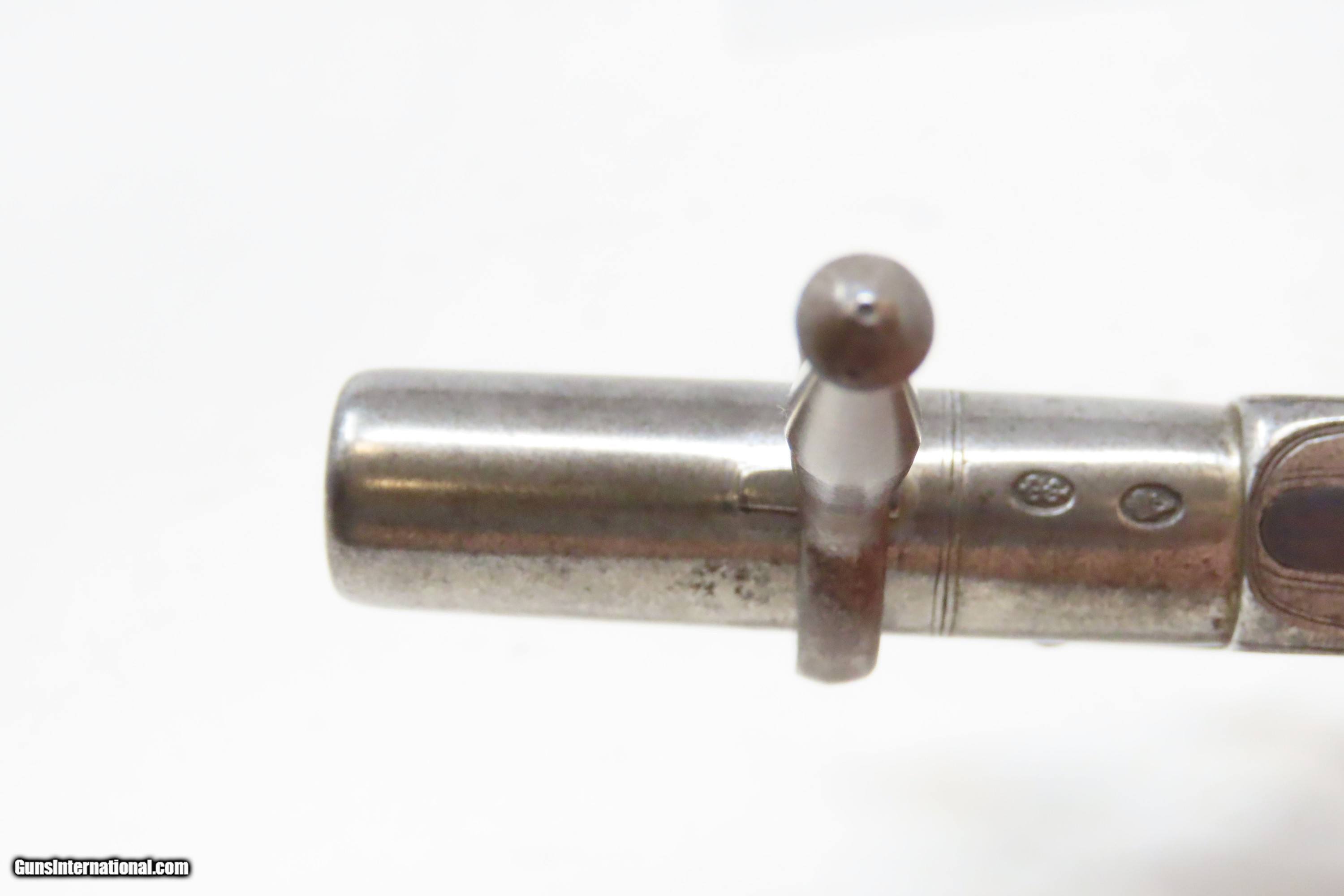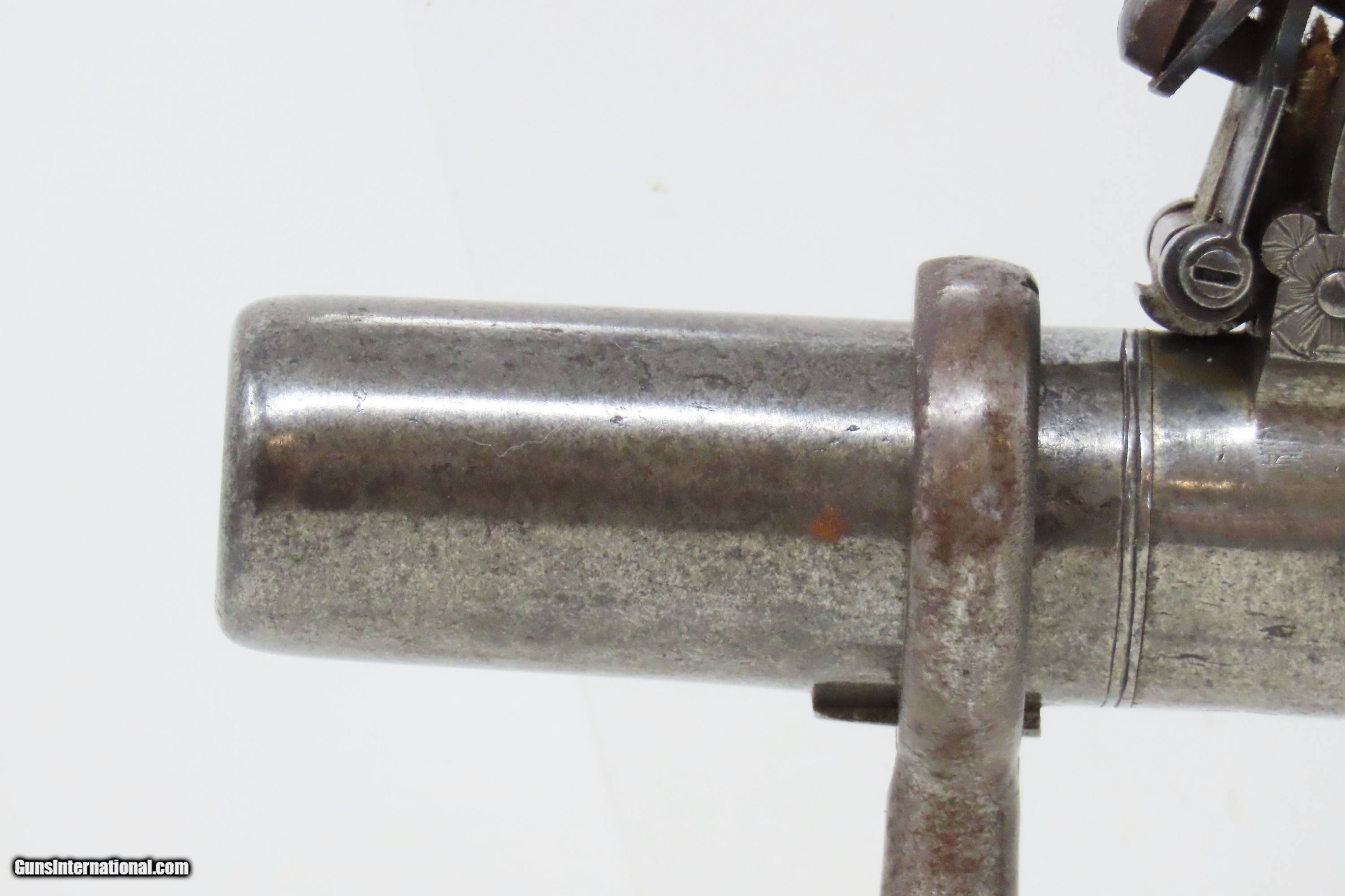Description: BARTON of LONDON Antique BOXLOCK British FLINTLOCK .44 Pocket/Muff Pistol SMALL Early 1800s Self Defense BELT/POCKET Pistol Here we present an antique Barton Marked Boxlock Flintlock Self Defense Pistol, made circa the early 1800s in London, England. This little self-defense pistol would have been most at home in the pocket of anyone in the busy cities of London, Paris and Liege during the very early 1800s. This pistol is small, light and simple. The “Pocket Pistol” name says it all. They were the "Saturday Night Specials" of the 18th-19th century. Before the Deringer, they were "Gentleman's" or "Muff Pistols", typically, a smaller pistol that was easily concealed. They were favored among the gentry and women because of these traits. Men would carry them concealed in a waistcoat pocket and women would hide them in a hand muff. The overall condition is very good. The trigger and part of the cock maintain the original fire blue finish. The action is excellent. The bore is bright and smooth. The grip is solid. Clear markings including London proofs. This one comes with a barrel wrench and the barrel does turn on and off very well. Own the original! This is a legitimate antique and not a reproduction. Barrel is 1-5/8 inches. Caliber: .44 Flintlock Overall Length is 5-3/8 inches. Overall condition as seen in photos. Very Fast. Very Safe. FREE SHIPPING WORLDWIDE. Delivered directly to your door by express mail! Guaranteed AUTHENTIC & Includes CERTIFICATE OF AUTHENTICITY. ancestryguns $1000 #240312 SOLD Antique: Yes |