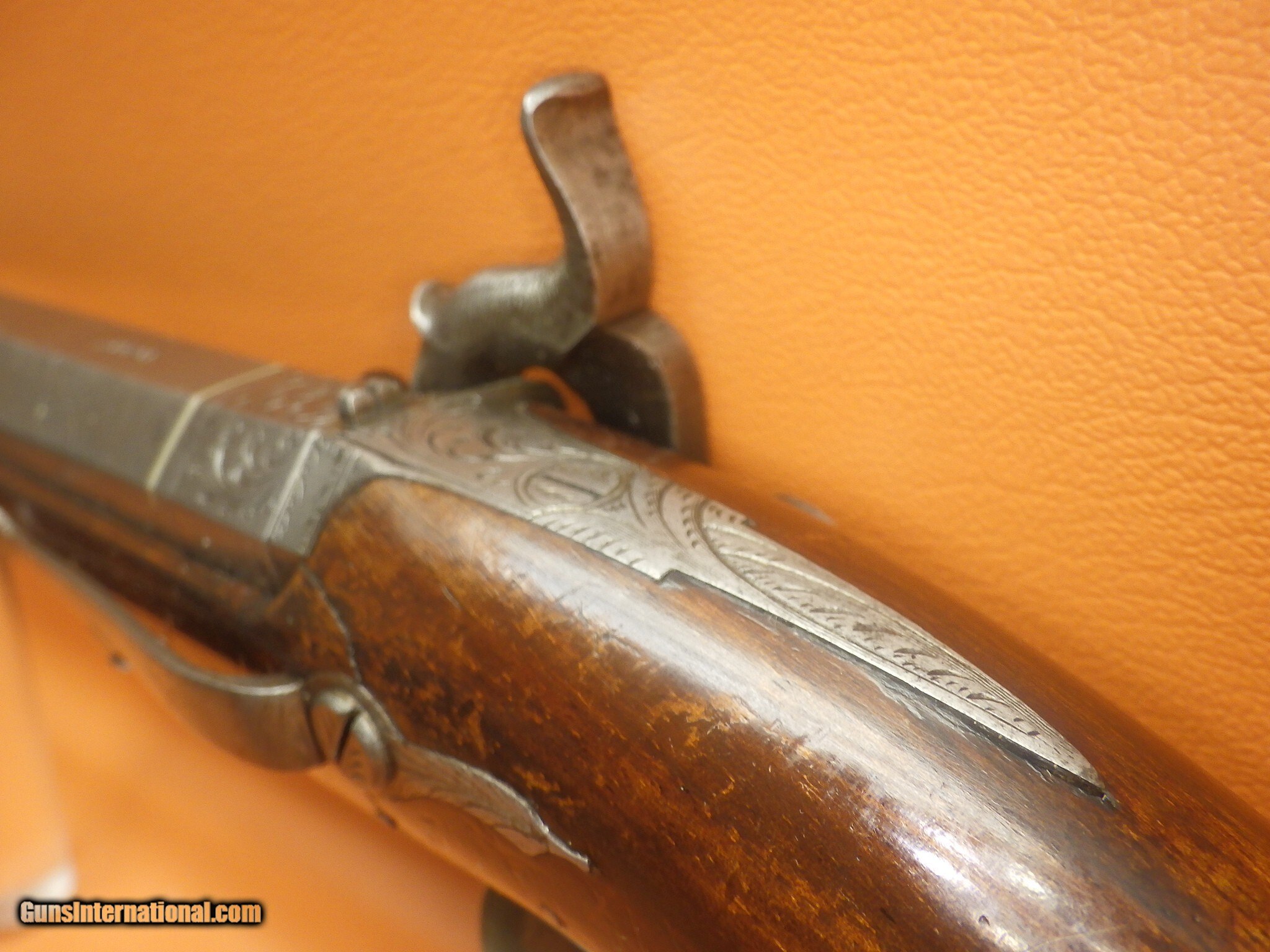 Description: Make: William Chance & Son (London) Model: Traveling Belt Pistol Finish: Bright engraved white steel with contrasting German Silver furniture; natural antique patina throughout Caliber: .50 Caliber Action: Single-shot percussion Barrel length: 5 inches Bore: Smoothbore, octagonal barrel Grips: Checkered walnut pistol stock with wrap-around checkering, German Silver furniture pieces, and hinged grip cap compartment. Sights: Original period-correct flattened front bead sight with small rounded rear notch sight MFG Date: Circa 1840–1850. No SN# or proofs Features: • London-made mid-19th century traveling belt pistol • Extensive scroll-style engraving on barrel, frame, side plates, hammer, screws, trigger guard, belt hook, and other metal components • White steel major components showing visible heat-treatment lines • German Silver (also called nickel silver) trigger guard, stock cap compartment, and hinged grip door with warm aged hue • Integral side belt hook • Original low-profile sights consistent with period English belt pistols • Percussion ignition system Condition: Very good antique condition. The pistol exhibits a desirable, even patina consistent with its age. Engraving remains crisp and well-defined. Metal surfaces show consistent minor finish wear with expected occasional corrosion- great for an almost 200 year old pistol. German Silver pieces are in excellent shape with light verdigris. Wood grip is well-preserved for its age, showing minor handling wear and light scuffs but no abuse. An honest, untouched example. Missing correct metal butt ram-rod. Shipping Cost: $100 Tech: SRD.123025.3999 This is a highly attractive and well-preserved English traveling belt pistol by W. Chance & Son of London, dating to approximately 1840–1850. Designed as a trade pistol for American pioneers and fur traders, these pistols were crafted with high quality features for maximum trading value to Indian Tribes. What truly sets this example apart is the extensive scroll engraving much of its steel surfaces, a hallmark of quality London gunmaking. The white engraved steel contrasts beautifully with the aged German Silver furniture, while the wrap-around checkered walnut stock adds both elegance and secure handling. Unlike many belt pistols that were made without sights, this example retains its original, period-correct front bead and small rounded rear notch sight, a practical but understated feature typical of English pistols intended for real-world use. Their low-profile design is consistent with the era and preserves the pistol’s clean lines. In very good condition for its age, this pistol shows only light, honest wear with an appealing and collectible patina. The engraving remains sharp, the wood is well cared for, and there is no evidence of modern alteration. A fine candidate for the advanced collector of British percussion arms or American history collectors, an excellent display piece, and a tangible example of early Victorian-era craftsmanship. Quality London belt pistols with engraving, originality, and this level of preservation are becoming increasingly difficult to find. Curio/Relic: Yes Antique: Yes Handgun Caliber: .50 Price: $3,999.00 Contact Seller |