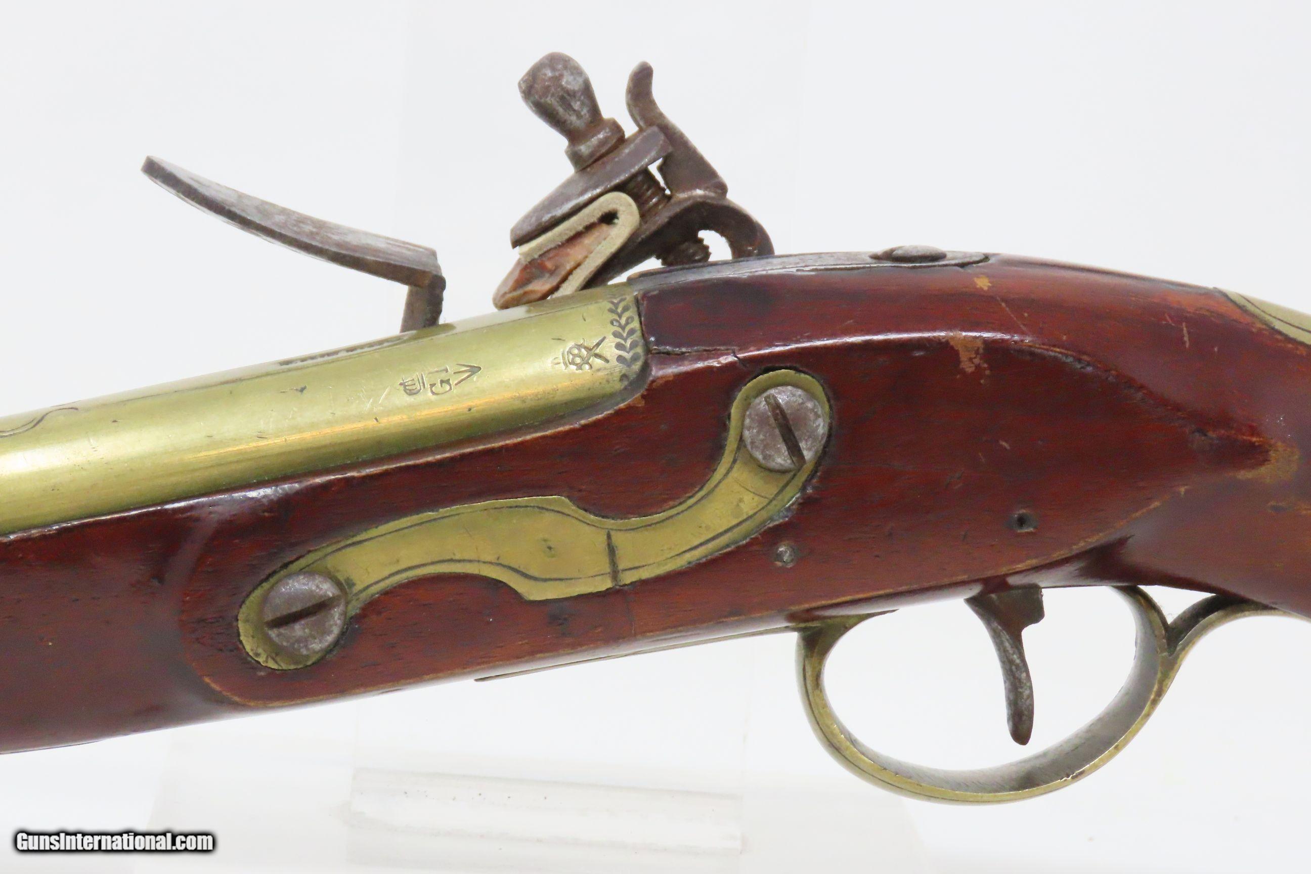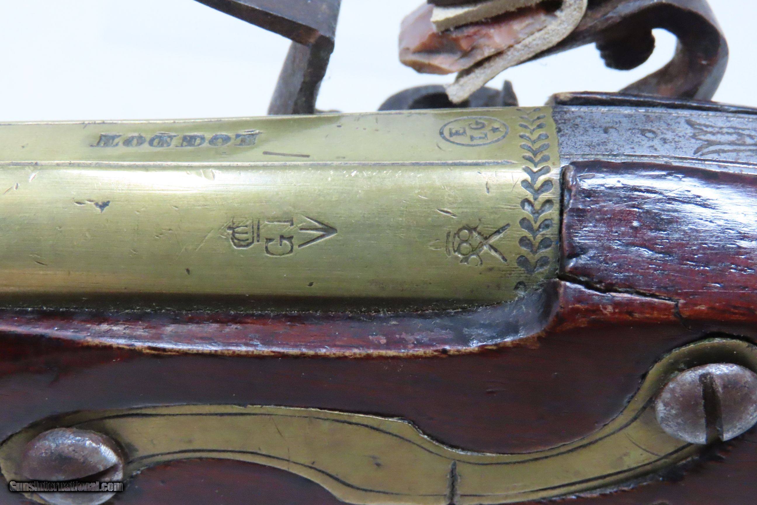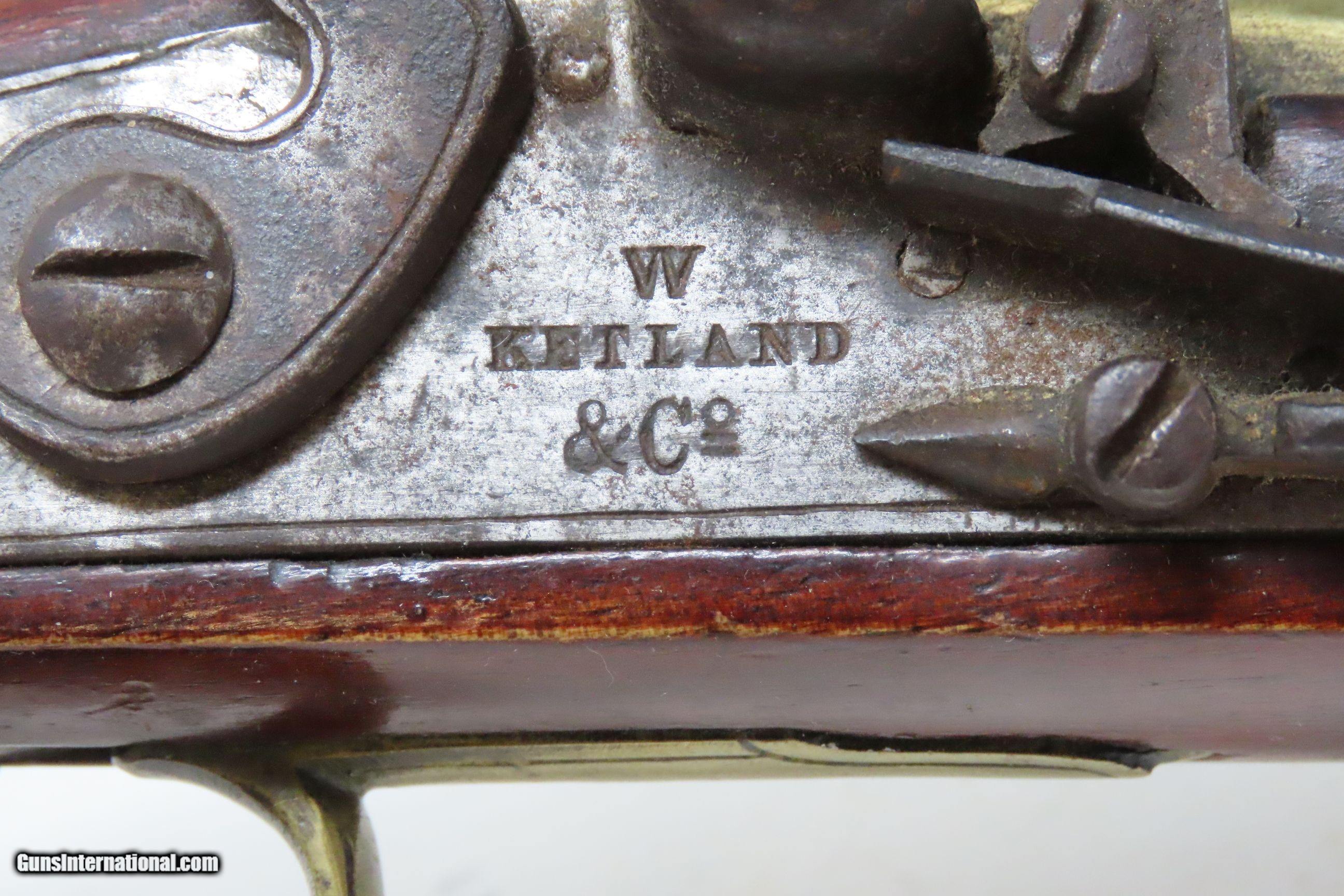 Description: BRASS BARREL Antique W. KETLAND & CO. Flintlock .54 FUR/INDIAN TRADE Pistol BRITISH ORDNANCE and LIEGE PROOFED Marked Here we present an antique Brass Barrel British Ordnance W. Ketland & Company Flintlock Trade Pistol, made circa 1780 in London, England. Ketland & Company was one of the most prominent and active British makers of the day. John and Thomas Ketland were the sons of Thomas Ketland and grandsons of William Ketland, who had been making locks and guns for the colonies since the early 18th Century. The lock plate on this pistol is marked "W./ Ketland/& Co" ahead of the hammer. William Ketland was Thomas Ketland Senior’s eldest son. Thomas Ketland Senior was a highly successful Birmingham gun maker who started his business around the mid-1700s and expanded into the export market around 1790 before he died in 1816. William Ketland was originally a partner alongside his father and William Walker. He petitioned to liquidate his part in the company in 1800. The partnership was dissolved in 1801. He died in 1804 but the business carried on as “Ketland & Co.” to at least 1831. Many gunmakers during this time were contracted with the Hudson Bay Company to supply these high-quality flintlock pistols. Most were traded to the Indigenous Indians in exchange for fur pelts that were eagerly desired in the European Fashion Trade. The Hudson Bay company was founded in May of 1670 primarily serving in the fur trading industry in its early years and has continued for 350 years to present day in London, England. The overall condition is good. Robust action. This example remains in its original flintlock. The bore is in good shape for its age. Sharp markings. “LONDON” has been over stamped atop the barrel. Liege proof and British Ordnance style proof markings are present on the barrel. The stock has been lightly refinished over the years. A stable, thin crack is present towards the muzzle on the right side of the forend. Own the original! This is a legitimate antique and not a reproduction. Barrel is 7-1/2 inches. Caliber: .54 Flintlock Overall condition as seen in photos. Very Fast. Very Safe. FREE SHIPPING WORLDWIDE. Delivered directly to your door by express mail! Guaranteed AUTHENTIC & Includes CERTIFICATE OF AUTHENTICITY. ancestryguns $1550 #230374 SOLD Antique: Yes |