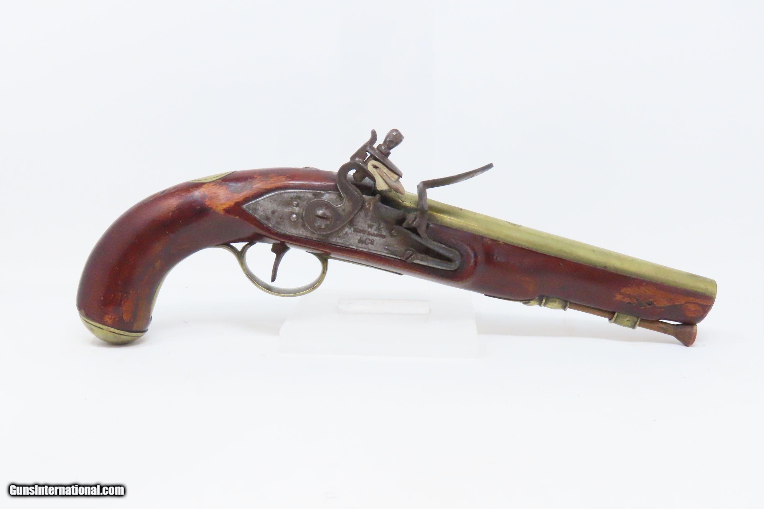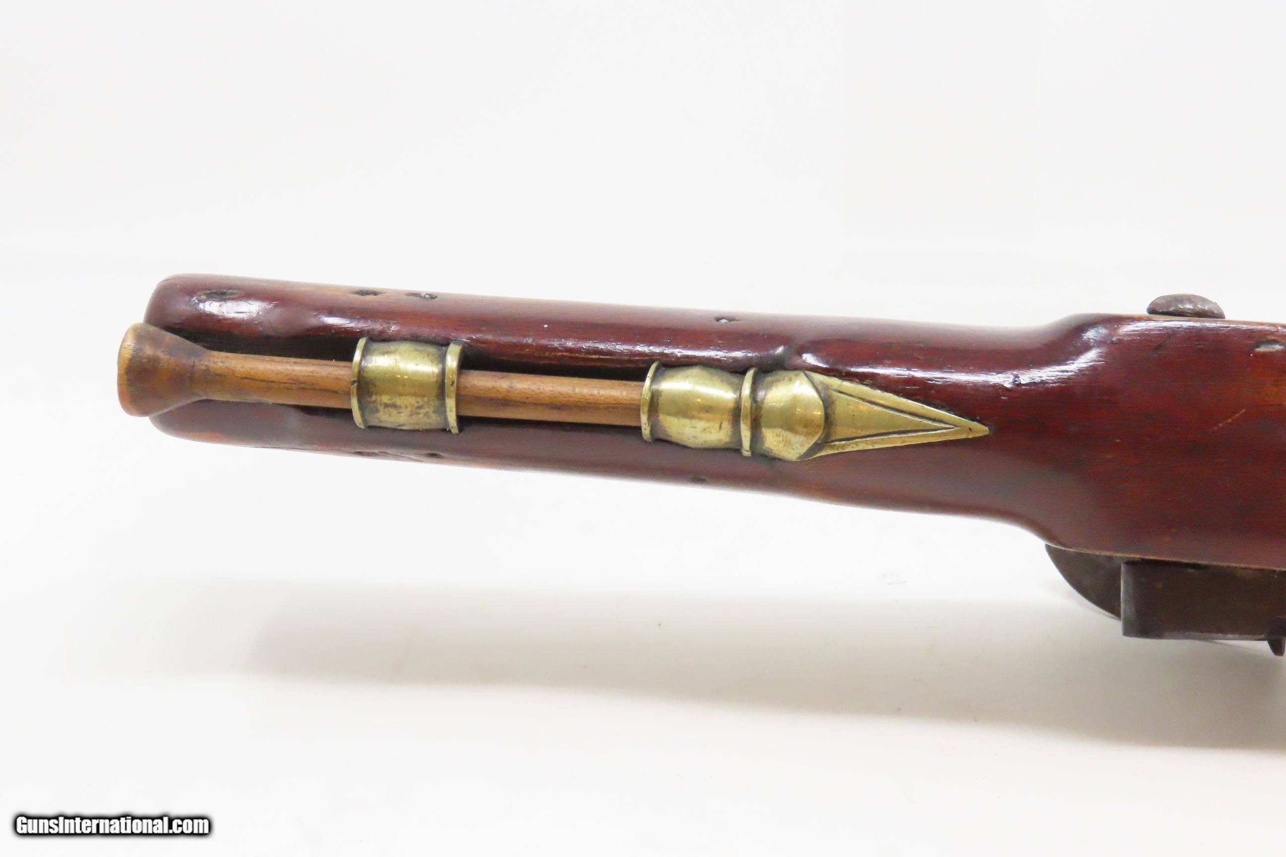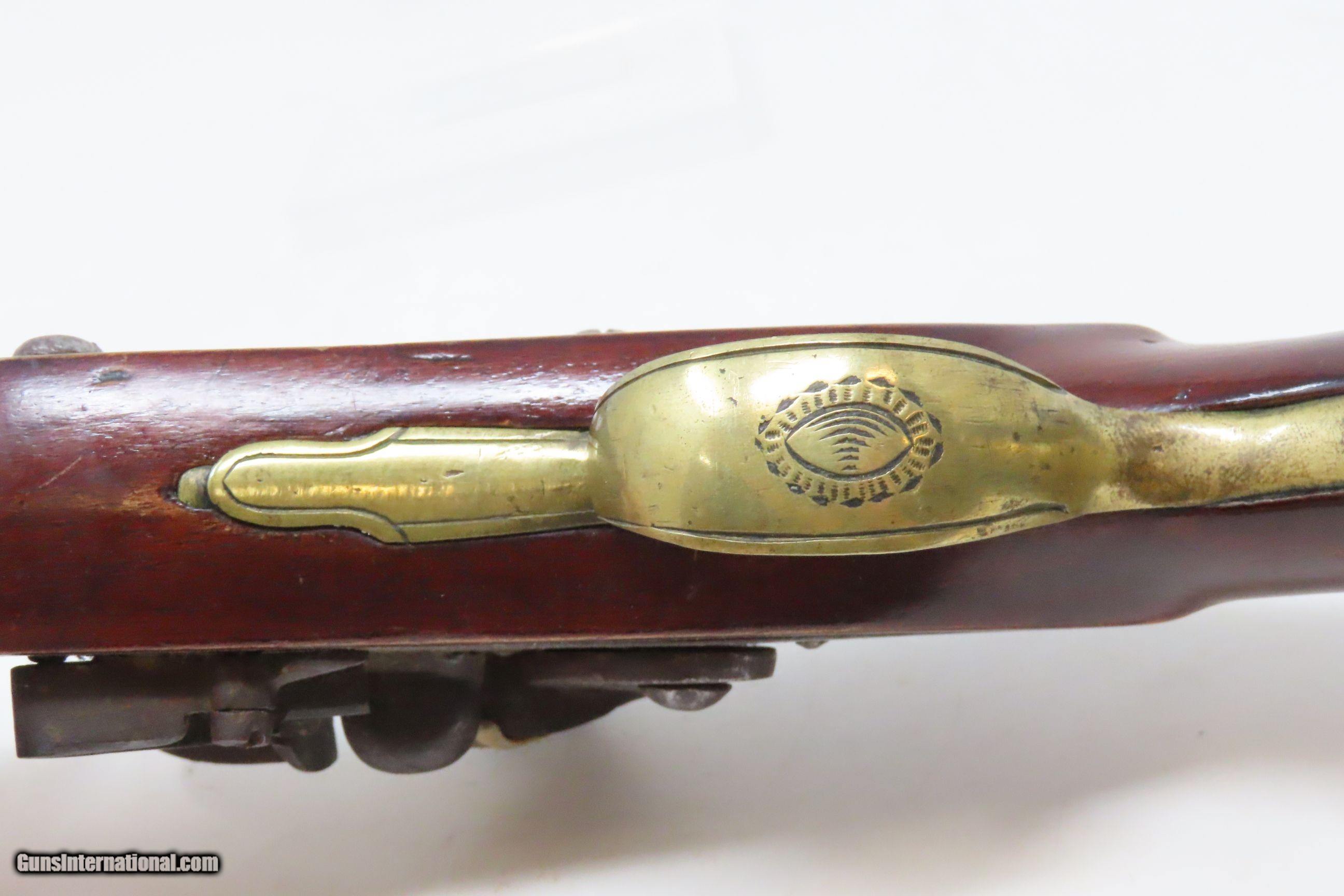 Description: BRASS BARREL Antique W. KETLAND & CO. Flintlock .54 FUR/INDIAN TRADE Pistol BRITISH ORDNANCE and LIEGE PROOFED Marked Here we present an antique Brass Barrel British Ordnance W. Ketland & Company Flintlock Trade Pistol, made circa 1780 in London, England. Ketland & Company was one of the most prominent and active British makers of the day. John and Thomas Ketland were the sons of Thomas Ketland and grandsons of William Ketland, who had been making locks and guns for the colonies since the early 18th Century. The lock plate on this pistol is marked "W./ Ketland/& Co" ahead of the hammer. William Ketland was Thomas Ketland Senior’s eldest son. Thomas Ketland Senior was a highly successful Birmingham gun maker who started his business around the mid-1700s and expanded into the export market around 1790 before he died in 1816. William Ketland was originally a partner alongside his father and William Walker. He petitioned to liquidate his part in the company in 1800. The partnership was dissolved in 1801. He died in 1804 but the business carried on as “Ketland & Co.” to at least 1831. Many gunmakers during this time were contracted with the Hudson Bay Company to supply these high-quality flintlock pistols. Most were traded to the Indigenous Indians in exchange for fur pelts that were eagerly desired in the European Fashion Trade. The Hudson Bay company was founded in May of 1670 primarily serving in the fur trading industry in its early years and has continued for 350 years to present day in London, England. The overall condition is good. Robust action. This example remains in its original flintlock. The bore is in good shape for its age. Sharp markings. “LONDON” has been over stamped atop the barrel. Liege proof and British Ordnance style proof markings are present on the barrel. The stock has been lightly refinished over the years. A stable, thin crack is present towards the muzzle on the right side of the forend. Own the original! This is a legitimate antique and not a reproduction. Barrel is 7-1/2 inches. Caliber: .54 Flintlock Overall condition as seen in photos. Very Fast. Very Safe. FREE SHIPPING WORLDWIDE. Delivered directly to your door by express mail! Guaranteed AUTHENTIC & Includes CERTIFICATE OF AUTHENTICITY. ancestryguns $1550 #230374 SOLD Antique: Yes |