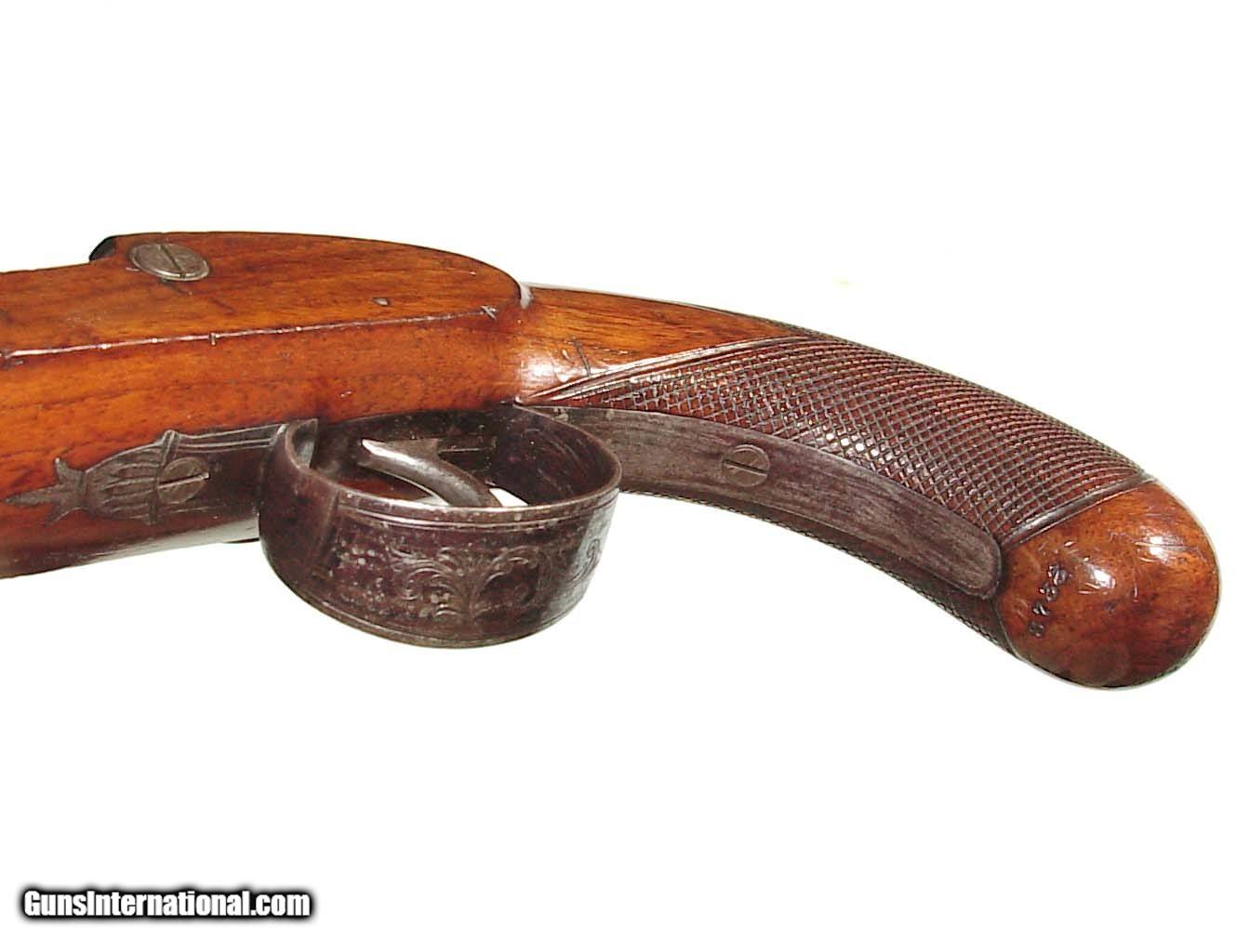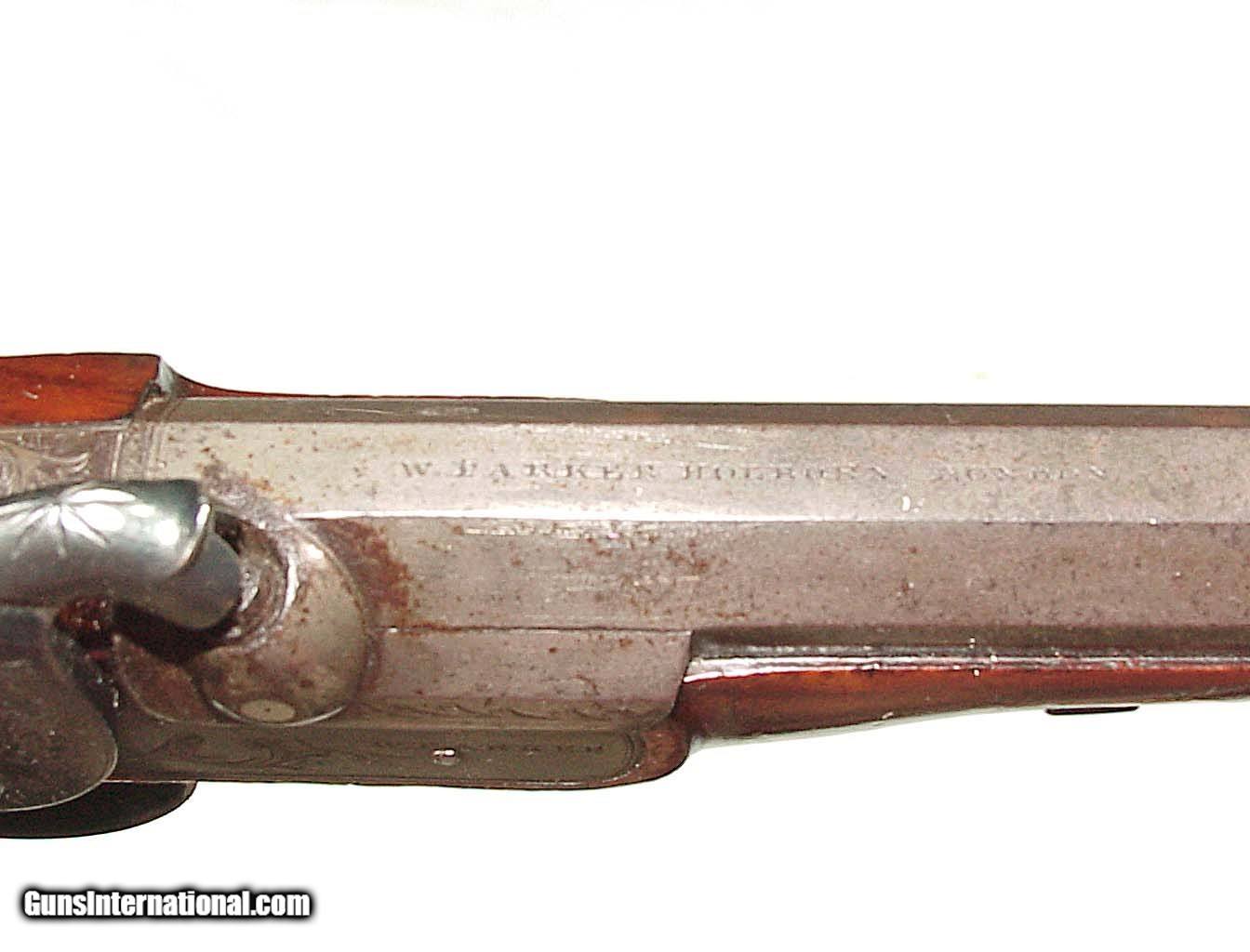 Description: .52 caliber (28 bore) 4" octagon barrel with the maker's name engraved on the top flat. Engraved bar action lock marked "W. PARKER". Full length stock with checkered bag grip. In beautiful original condition with the barrel showing it's fading casehardened finish. The lock and hammer have mottled case colors. Excellent wood and flat cut checkering. The trigger guard has much of the original charcoal blue remaining. Mechanically excellent. SOLD Antique: Yes |