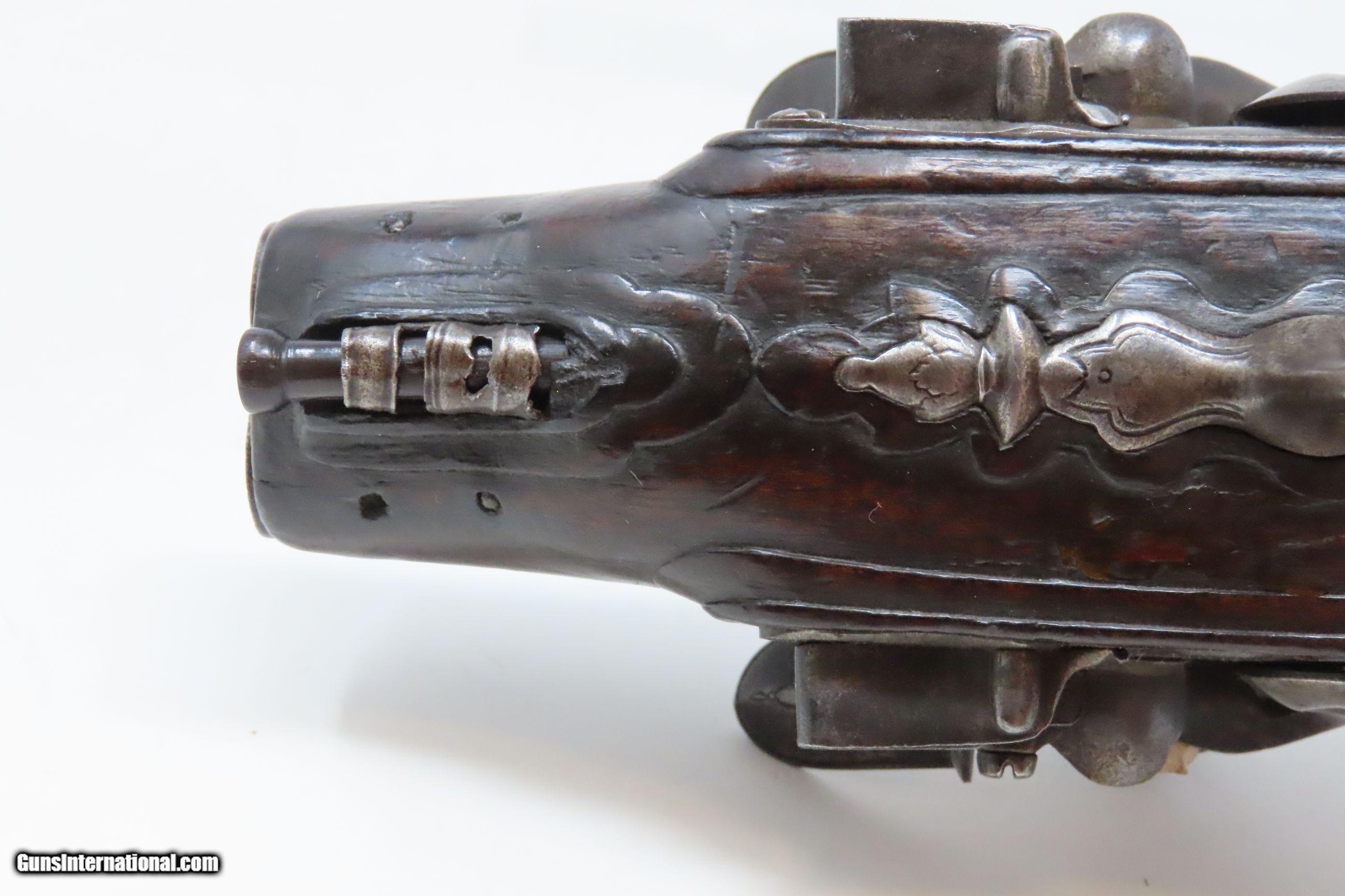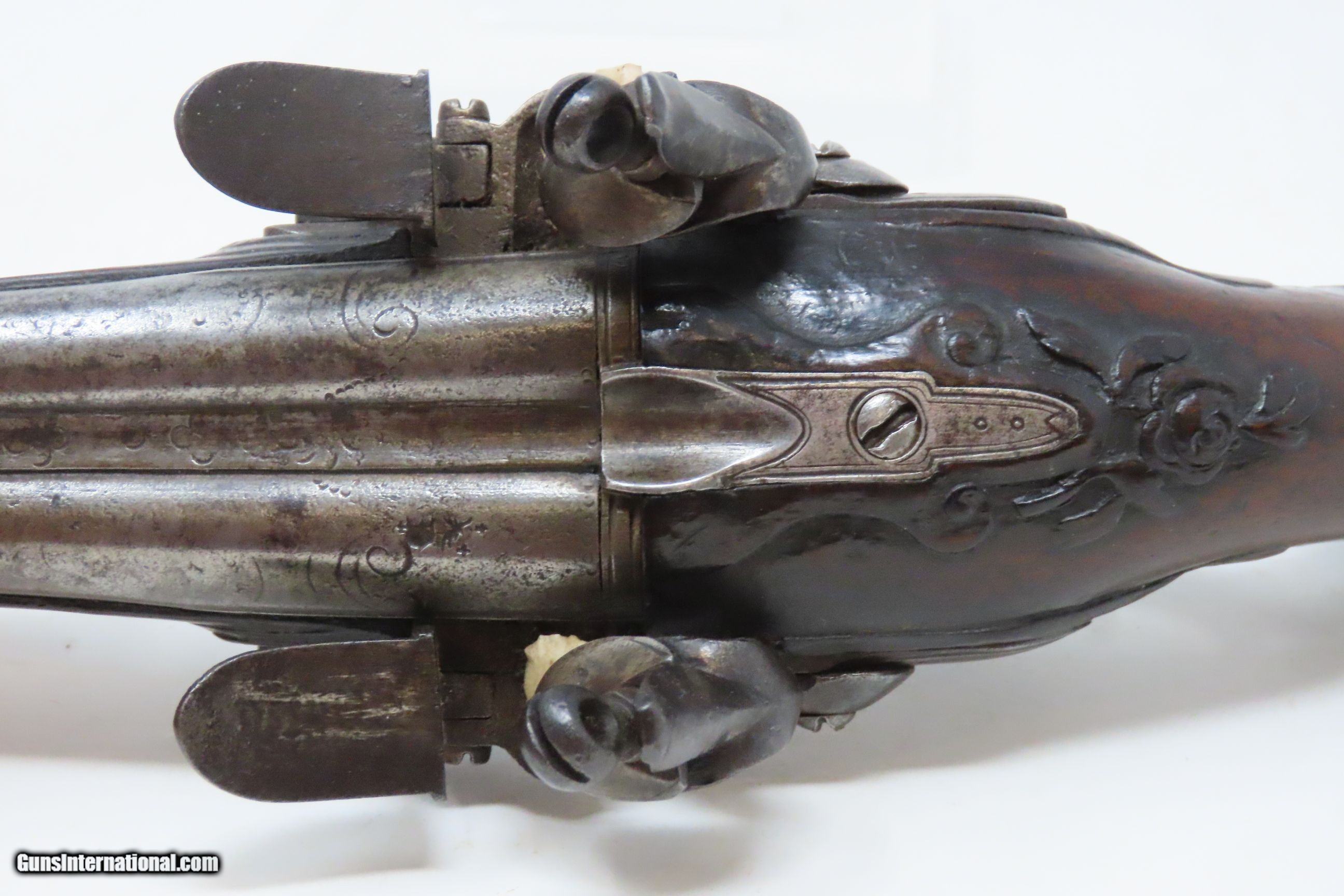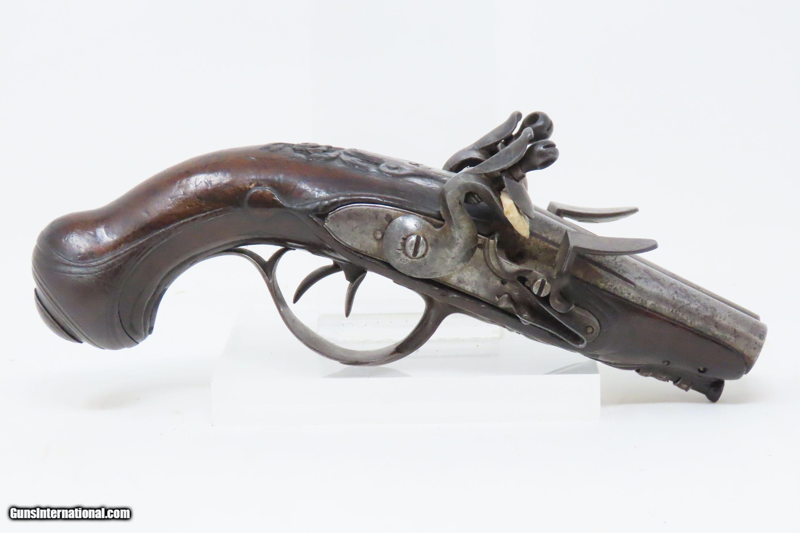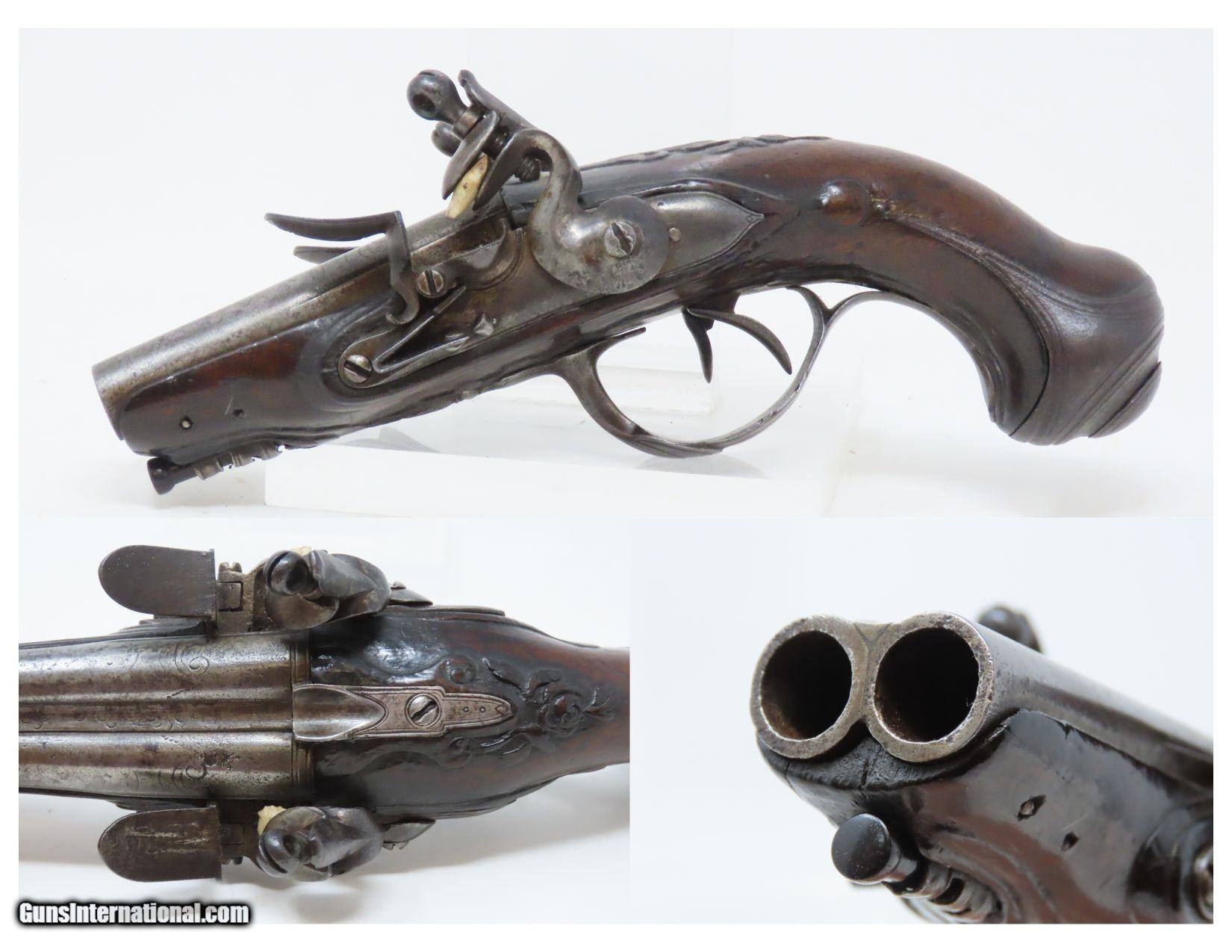 Description: Carved Stock FRENCH Antique FLINTLOCK DOUBLE BARREL .40 Caliber 3” Pistol c1800 “Life Preserver” Here we present an antique French Double Barrel Flintlock Pistol, made circa the early 1800s. In a day when firearms were universally muzzle-loaded and mostly single-shot this little twin-barreled flintlock would have had an advantage. It has a short overall length and quite wide to accommodate the .40 caliber barrels. The stock is nicely carved to meet the metalwork throughout and includes a floral detail at the top. The overall condition is very good. Original patina. The actions are excellent. The bores are smooth and patinated. The stock is solid and beautifully carved. Own the original! This is a legitimate antique and not a reproduction. Barrels are 3 inches. Caliber: .40 Flintlock Overall condition as seen in photos. Very Fast. Very Safe. FREE SHIPPING WORLDWIDE. Delivered directly to your door by express mail! Guaranteed AUTHENTIC & Includes CERTIFICATE OF AUTHENTICITY. ancestryguns $2000 #230089 SOLD Antique: Yes |