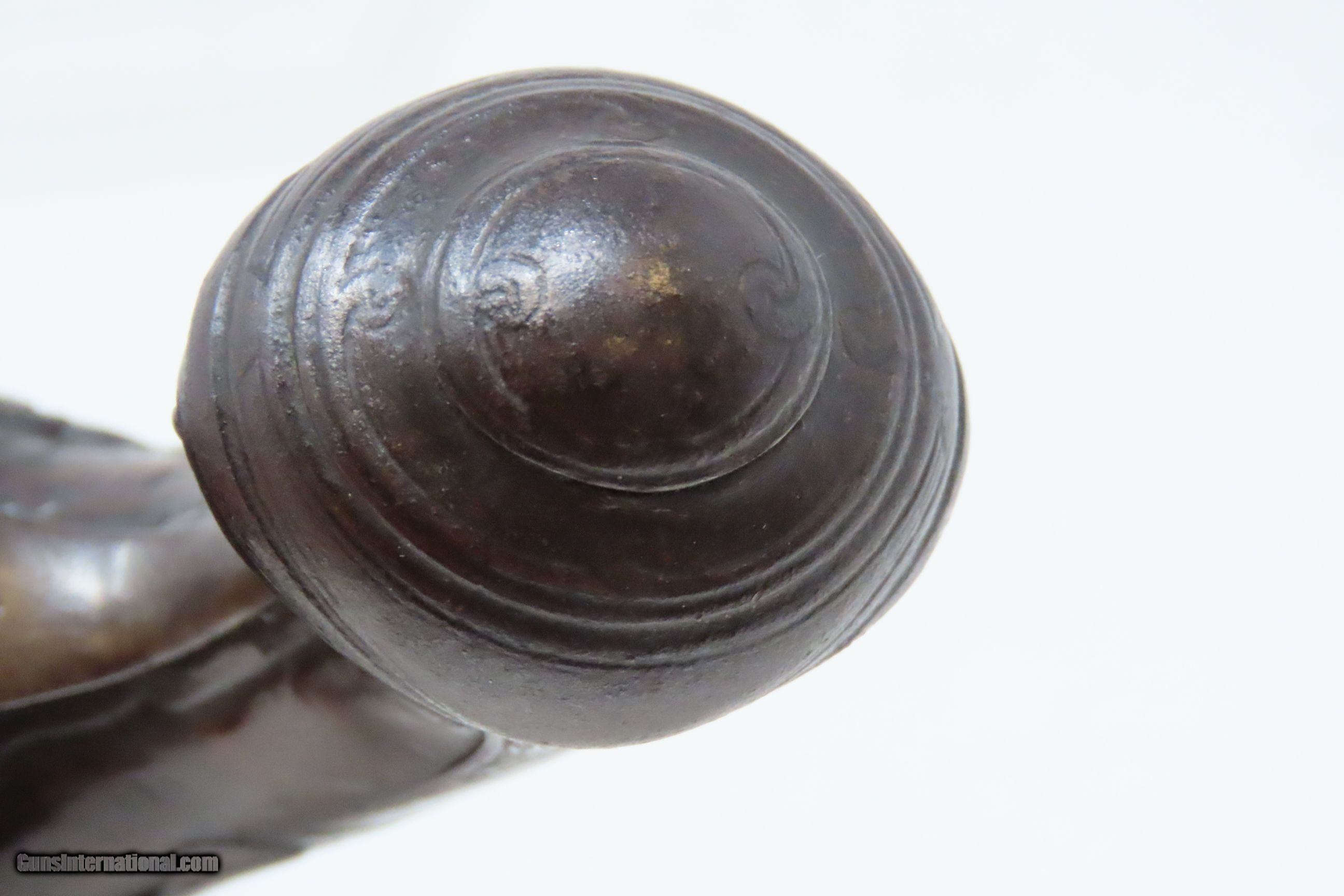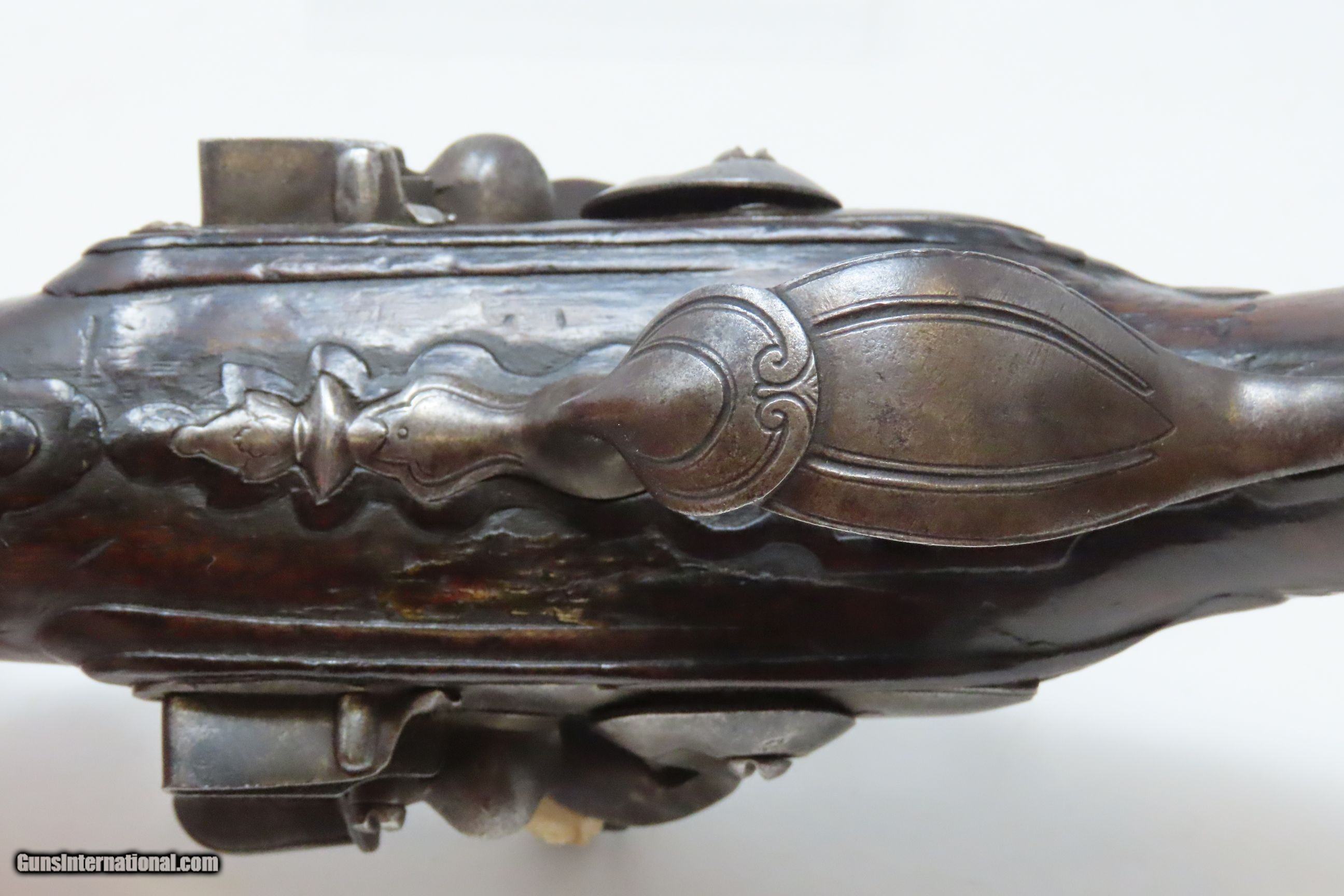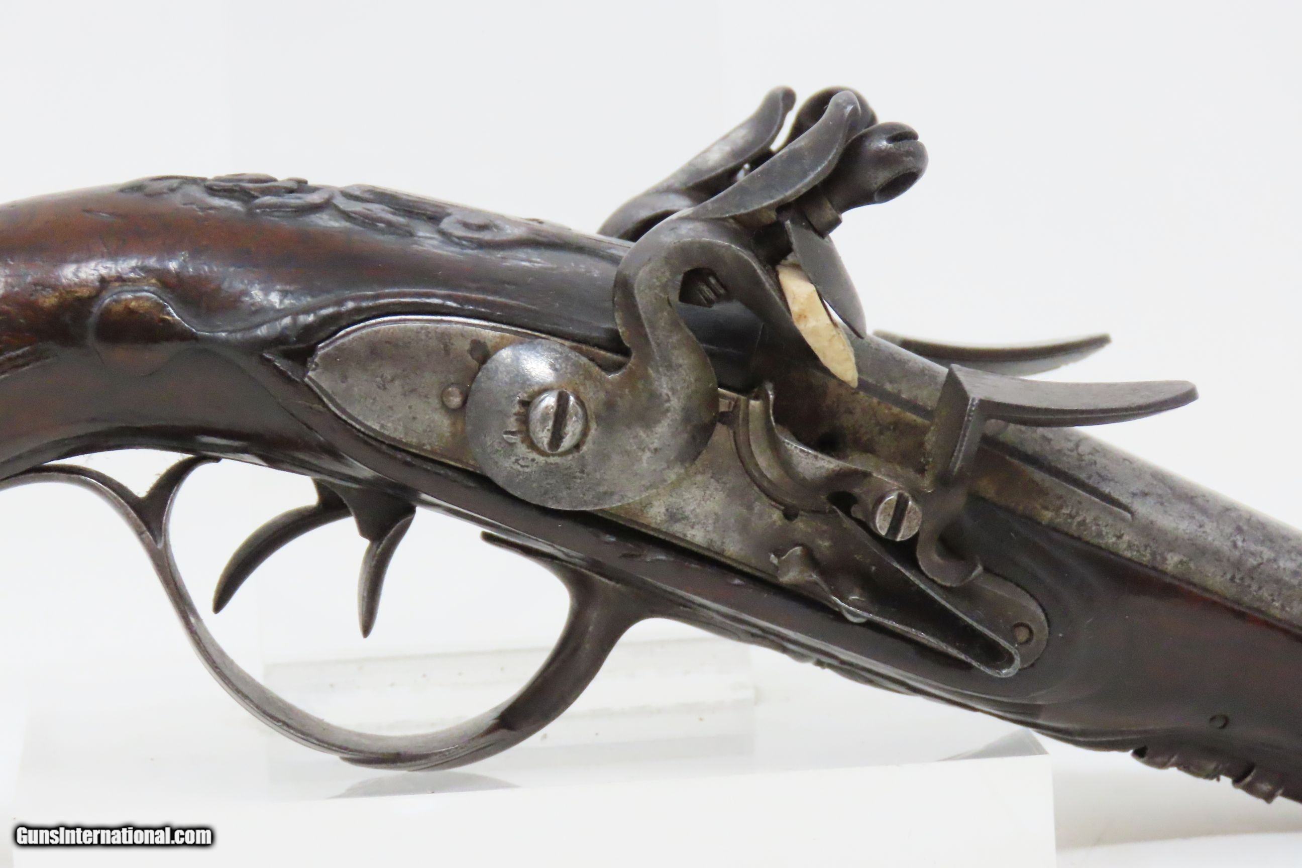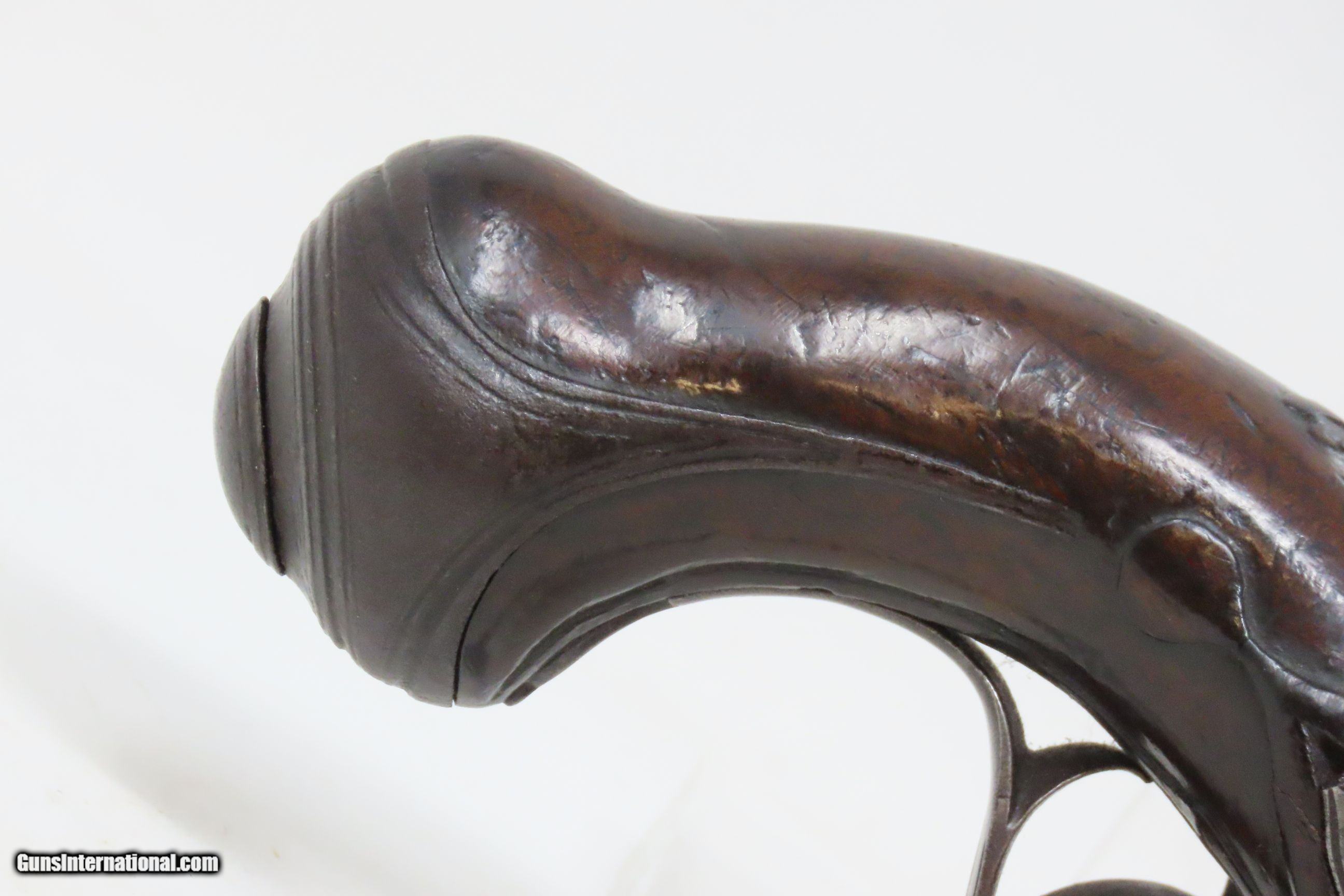 Description: Carved Stock FRENCH Antique FLINTLOCK DOUBLE BARREL .40 Caliber 3” Pistol c1800 “Life Preserver” Here we present an antique French Double Barrel Flintlock Pistol, made circa the early 1800s. In a day when firearms were universally muzzle-loaded and mostly single-shot this little twin-barreled flintlock would have had an advantage. It has a short overall length and quite wide to accommodate the .40 caliber barrels. The stock is nicely carved to meet the metalwork throughout and includes a floral detail at the top. The overall condition is very good. Original patina. The actions are excellent. The bores are smooth and patinated. The stock is solid and beautifully carved. Own the original! This is a legitimate antique and not a reproduction. Barrels are 3 inches. Caliber: .40 Flintlock Overall condition as seen in photos. Very Fast. Very Safe. FREE SHIPPING WORLDWIDE. Delivered directly to your door by express mail! Guaranteed AUTHENTIC & Includes CERTIFICATE OF AUTHENTICITY. ancestryguns $2000 #230089 SOLD Antique: Yes |