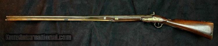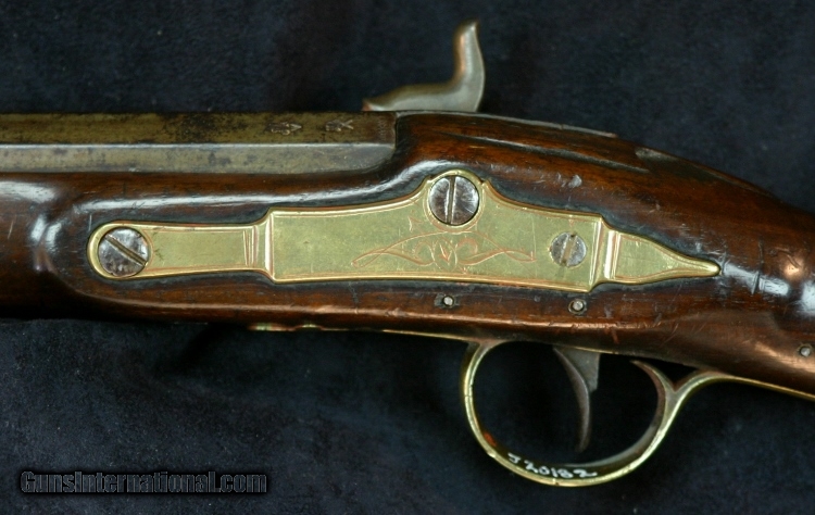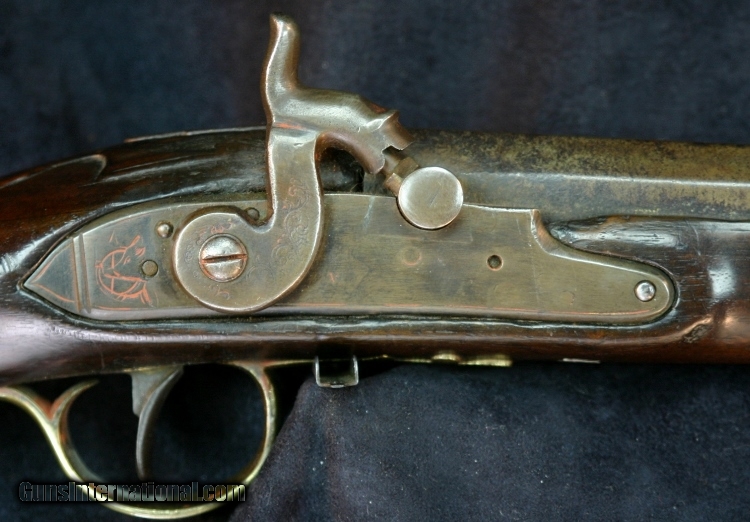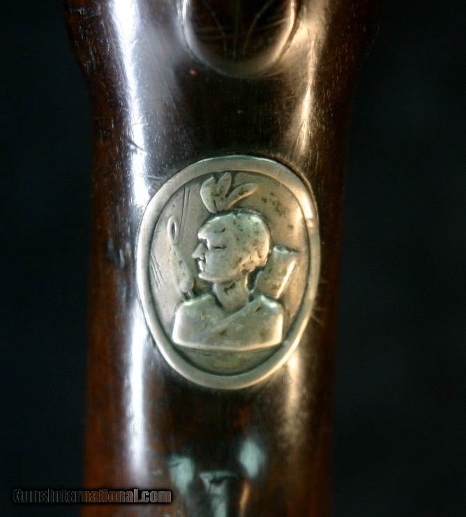 Description: .60 caliber, 30 inch part round barrel, converted from flint, Birmingham proofs, Chief's head medalion at wrist, brass furniture, hog's head and hunting horn on lock and butt plate, makers name unreadable after conversion process, bow and arrow on trigger guard and side plate, German silver fore end cap. Very seldom seen in half stock configuration, numbers on inside of trigger guard and on stock would suggest museum ownership (deaccession?), period of use-1790's thru ??? Smooth bore is dark with black powder oxidation, barrel is patina'd gray brown, stock fore arm has slivers missing worn smooth with use, righ side of stock has tack shanks, rectangle of wood replaced. SOLD Antique: Yes |