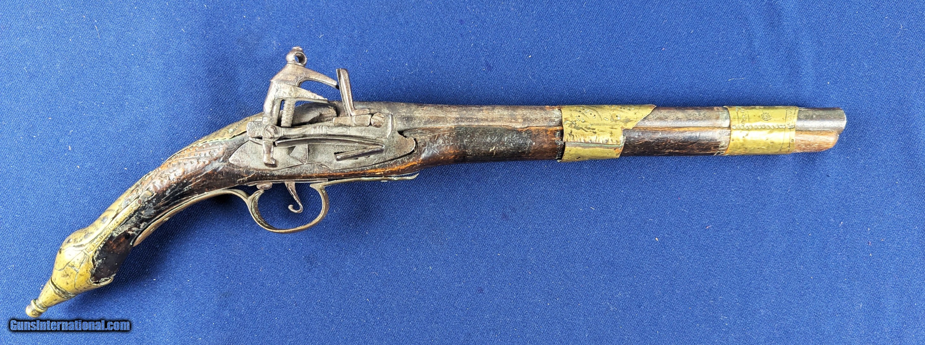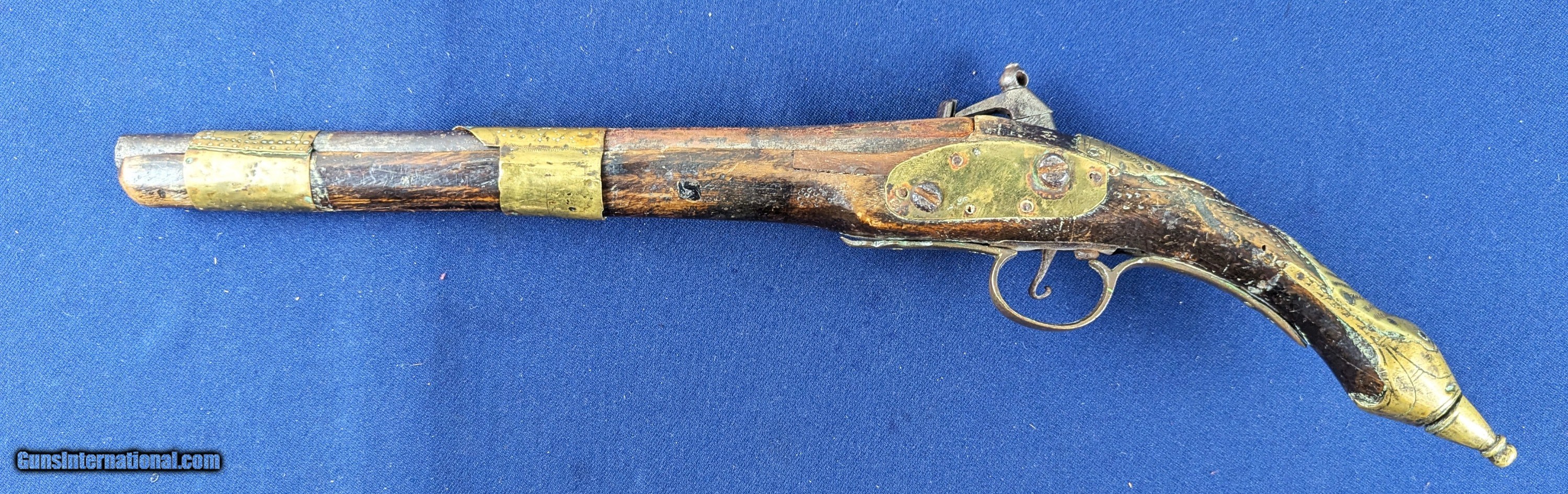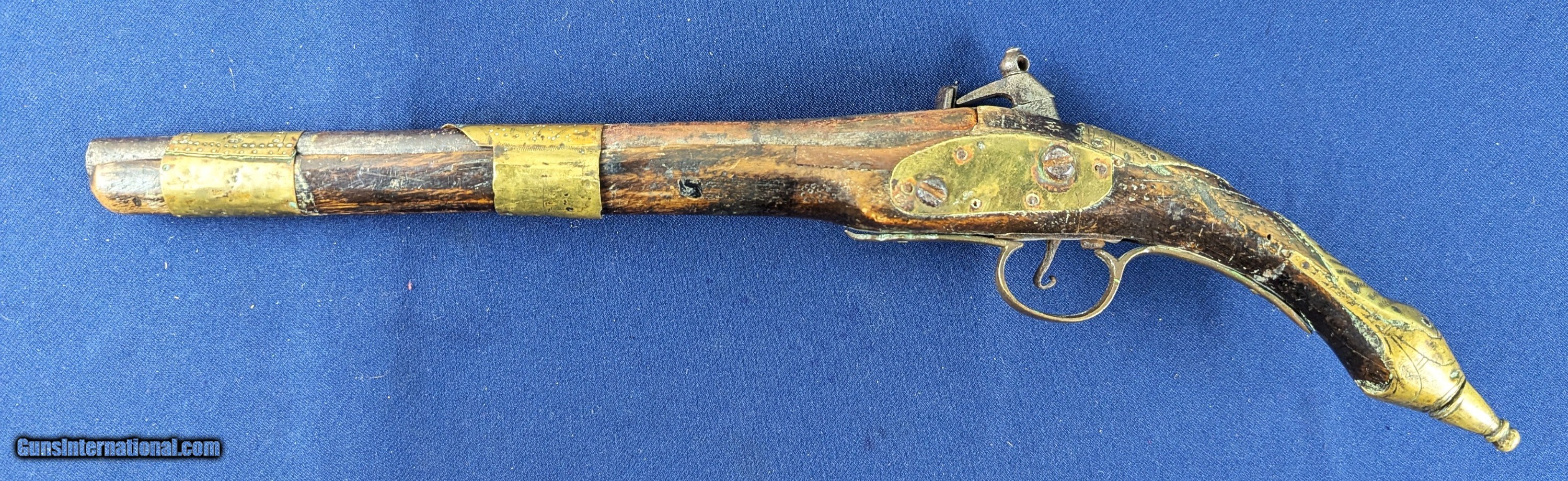 Description: Classic Early 19th Century Albanian “Rat Tail” Flintlock Pistol Offered here for sale and just acquired among a collection of Indo Persian firearms and edged weapons is this classic Albanian “rat-tail” flintlock (or more often “miquelet lock”) pistol. The “rat-tail” pistol is a type of muzzle-loading handgun often described as having a slender, tapered or “rat-tail” butt / stock. Its graceful, narrow outline made it easy to carry. Mechanically, many of these pistols used a Miquelet lock, a type of flint-against-steel ignition widely used in Mediterranean/Eastern-Europe firearms. Despite being a “Miquelet” (or flintlock) pistol, the term “rat-tail” emphasizes the distinctive shape more than the lock type; the slender, tapering butt / grip is the defining aesthetic feature. These are strongly associated with Albanian gunsmithing traditions within the broader context of Ottoman-Balkan firearms production. “Rat-tail” / miquelet pistols seem to have been manufactured from the 18th century through at least the first half of the 19th century. These pistols were typically carried as holster or side pistols, often worn in a sash or belt rather than a formal holster. They were common among Balkan irregular soldiers, militia, local fighters, or civilians. This pistol has seen a good deal of use and also sports a repaired/restored piece of wood top of comb. Still very complete and a fine early collectible antique pistol. Standard shipping is $42. however final shipping amount is based upon geographical area. Handling is $18.00 for longarms only. We gladly accept money orders, bank checks and personal checks. Credit card orders (VISA AND MASTER CARD ONLY) charged 3.95% additional for use. PLEASE CALL DALIA AT 203-257-5256 TO GIVE CREDIT CARD I NFORMATION. Also, please view our at hansenguns. Clicencounhterk on "Online Catalog" and see All OF OUR ITEMS LISTED CONSECUTIVELY on or search online on that site with the ID “lope”...... OFFERED ONLINE AND AVAILABLE IN OUR RETAIL GALLERY IN SOUTHPORT, CT. Visit us also on Facebook at ://facebook/hansenguns/?fref=ts. We also own and/or operate Hansen Cartridge Co. and the Ruger Collectors Assc.(RCA). Hansen & Hansen wishes to expedite each order received, however we ship 80-100 items weekly, therefore orders paid by money orders or bank checks are cleared for shipping 5-7 days after deposited funds show in our account. Shipping date is scheduled ONLY AFTER VERIFICATION TAKES PLACE AND FFL/C&R IS RECEIVED (IF APPLIES). This is 5-7 days after WE receive order by mail - NOT customer date mailed and postmarked and after credit card funds are posted. Credit card orders exceeding $500 must be cleared through customer’s bank before shipping. Personal checks are accepted but orders are held UP TO 3 WEEKS after deposit of funds before items released for shipping. IF you have special instructions or require overnight or expedited shipping please advise at time of ordering and we will gladly prioritize shipping FOR AN ADDITIONAL CHARGE. THIS IS OUR POLICY and we encourage buyers to PLEASE READ AND UNDERSTAND OUR POLICY BEFORE . We would be pleased to answer ANY questions by phone (our toll free number is 1-800-571-7337 or e-mail cwlopiaol. Antique: Yes Handgun Caliber: .60 Price: $675.00 Contact Seller |