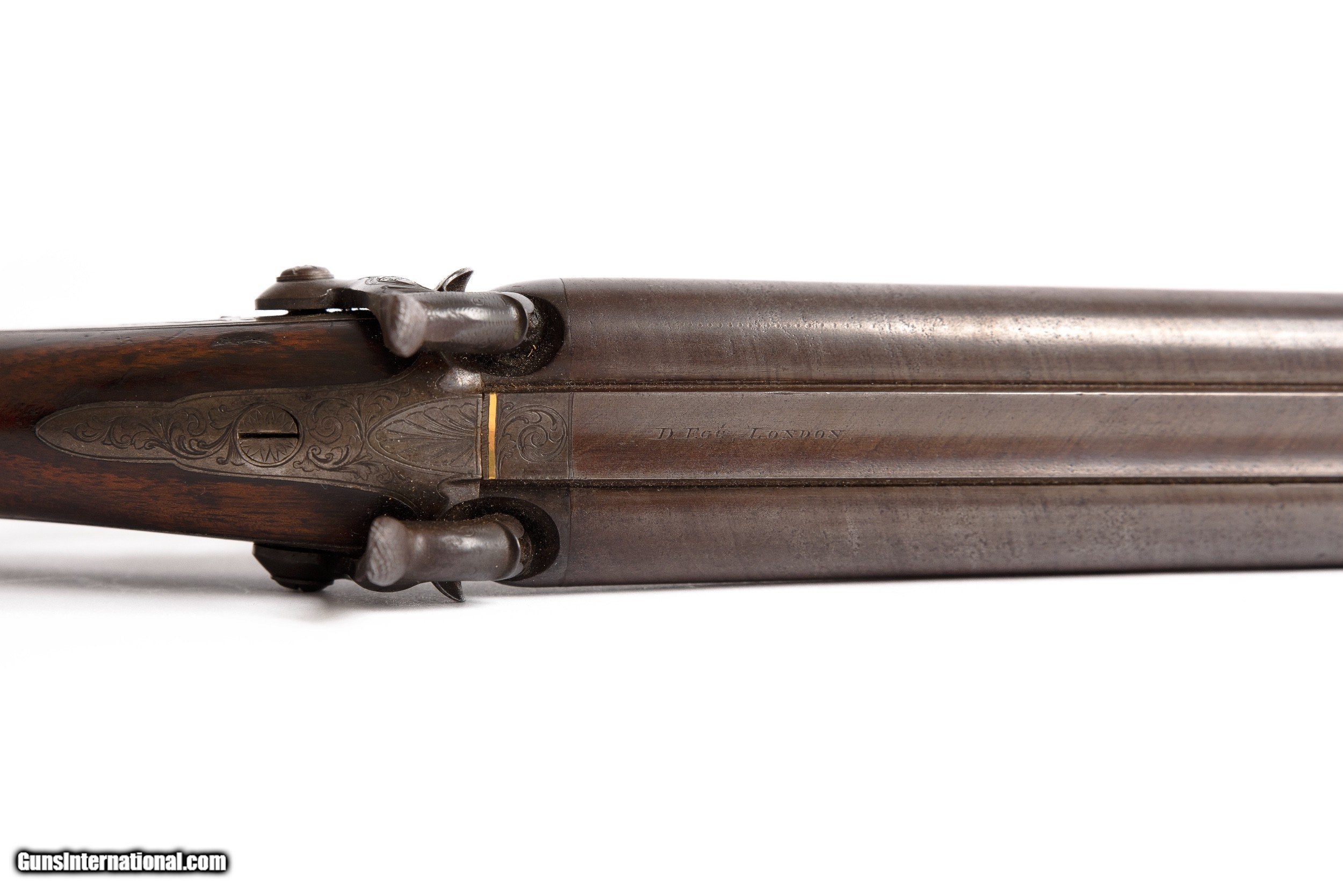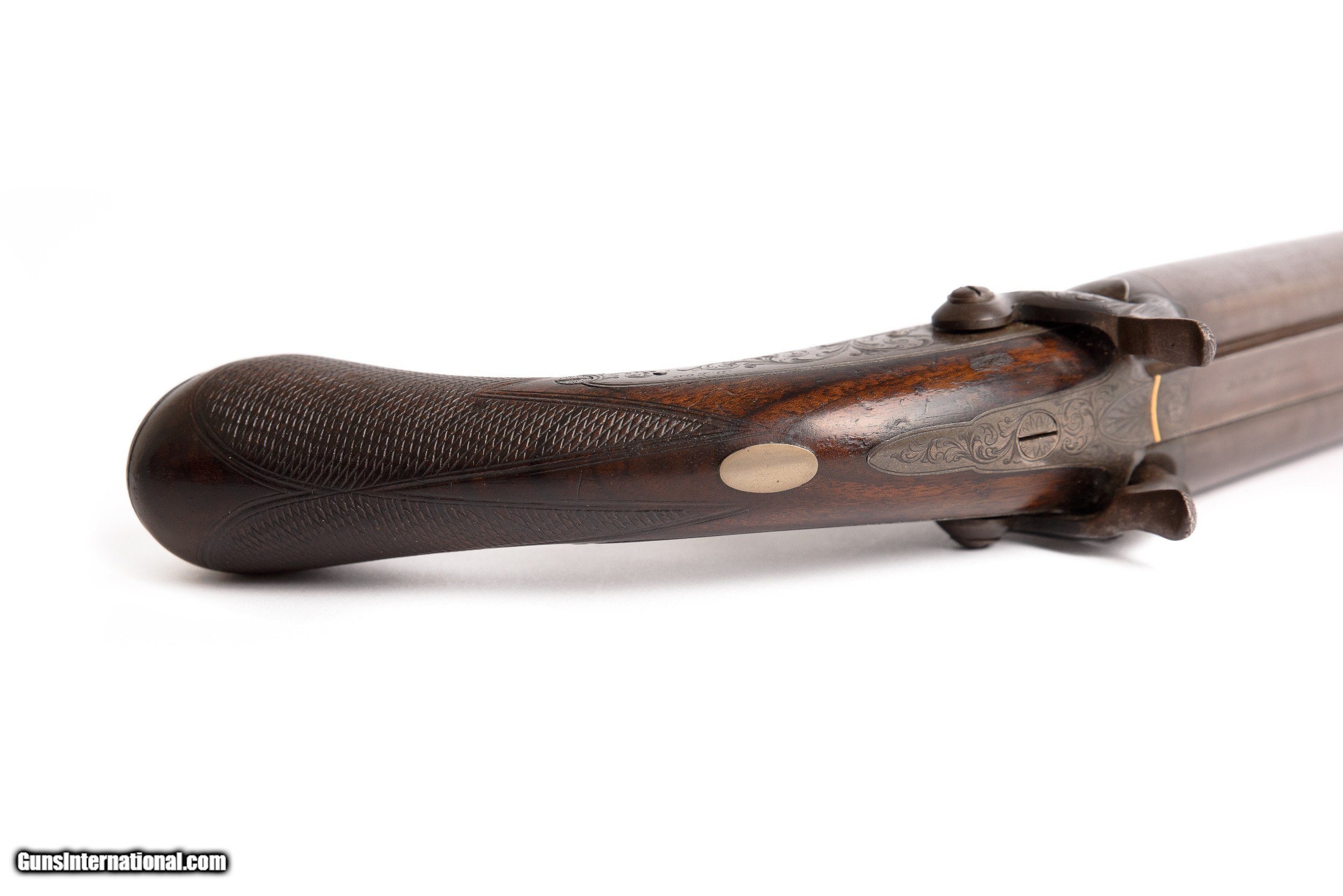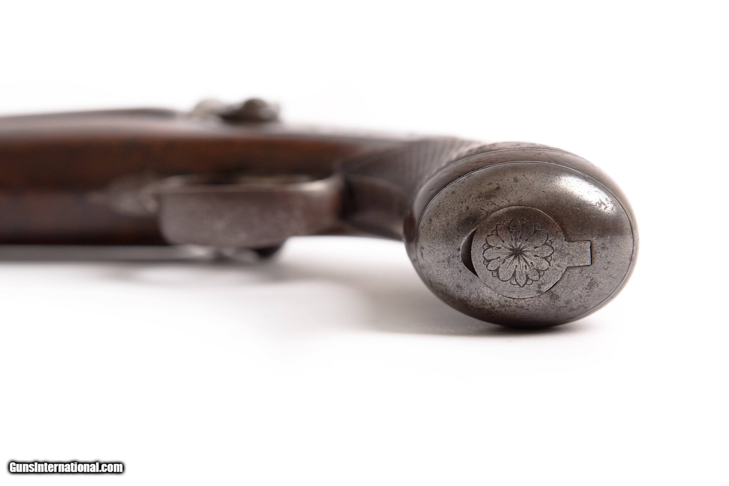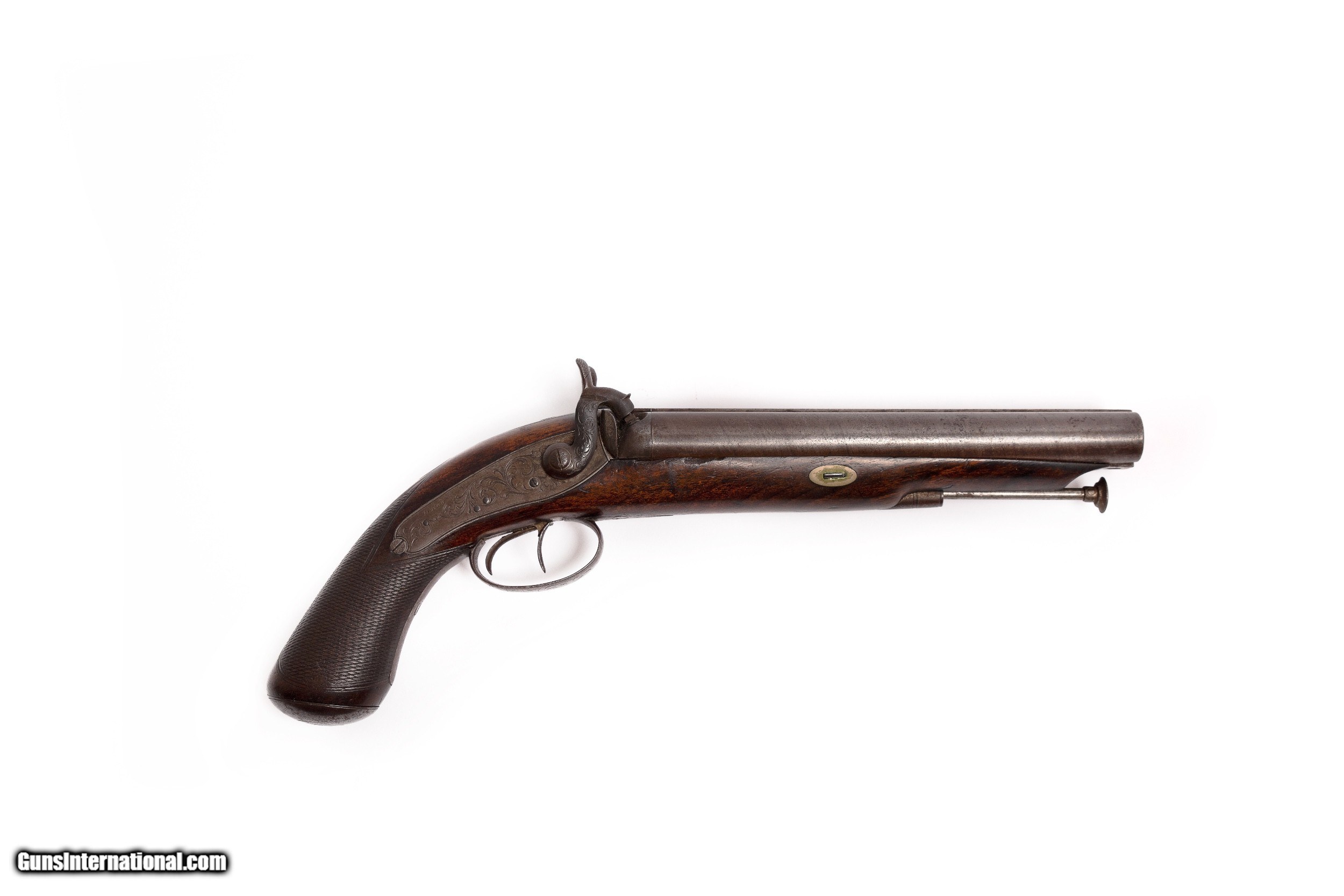 Description: A double barrel “Howdah” pistol, made by D. Egg of London. This large bore pistol was probably used in India or Africa, during the British Empire era, for defence against tigers and lions. It is scroll engraved with a gold inlay at the breech end of the barrel rib. “D. Egg” is inscribed on each of the pistol lock plates, and “D. Egg, London” on the top of the barrel rib. The barrels have a pleasant damascus finish, and silver bead sight. The checkered walnut stock has a small silver plaque in the back edge, two silver barrel key escutcheons and a percussion cap compartment with a hinged lid in the butt. The iron ramrod is intact. Caliber: .65 percussion Overall Length: 14.50 Barrel Lengths: 8.30 Condition: Iron parts are good with traces of original finish – Barrels retain approximately 40% of the original damascus twist pattern finish – Wood is very good with much of the original finish remaining, and only minor losses of wood at the barrel edges – Ramrod swivel mechanism is missing but the ramrod appears to be original. SOLD Antique: Yes Manufacturer: D. Egg Model: Howdah Barrel Length: 8.30 Caliber Info: .65 percussion Bore: smooth Engraving: yes |