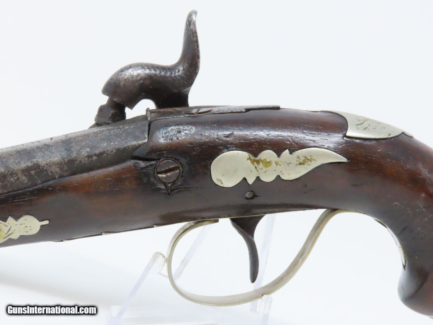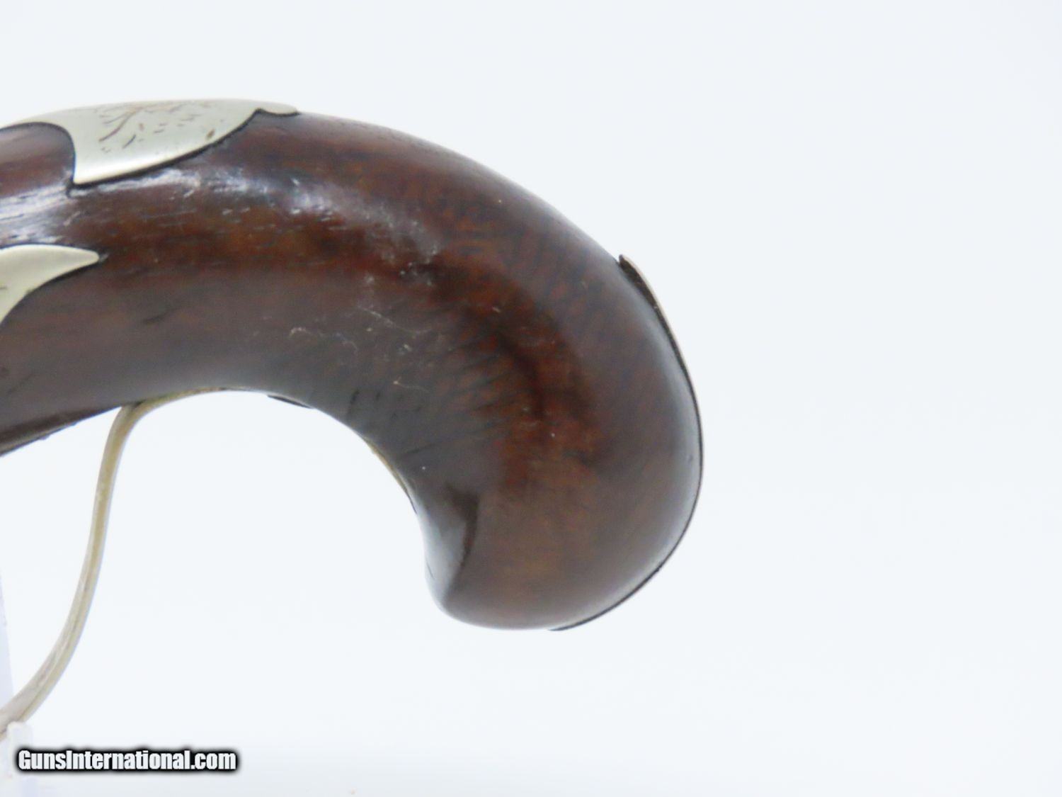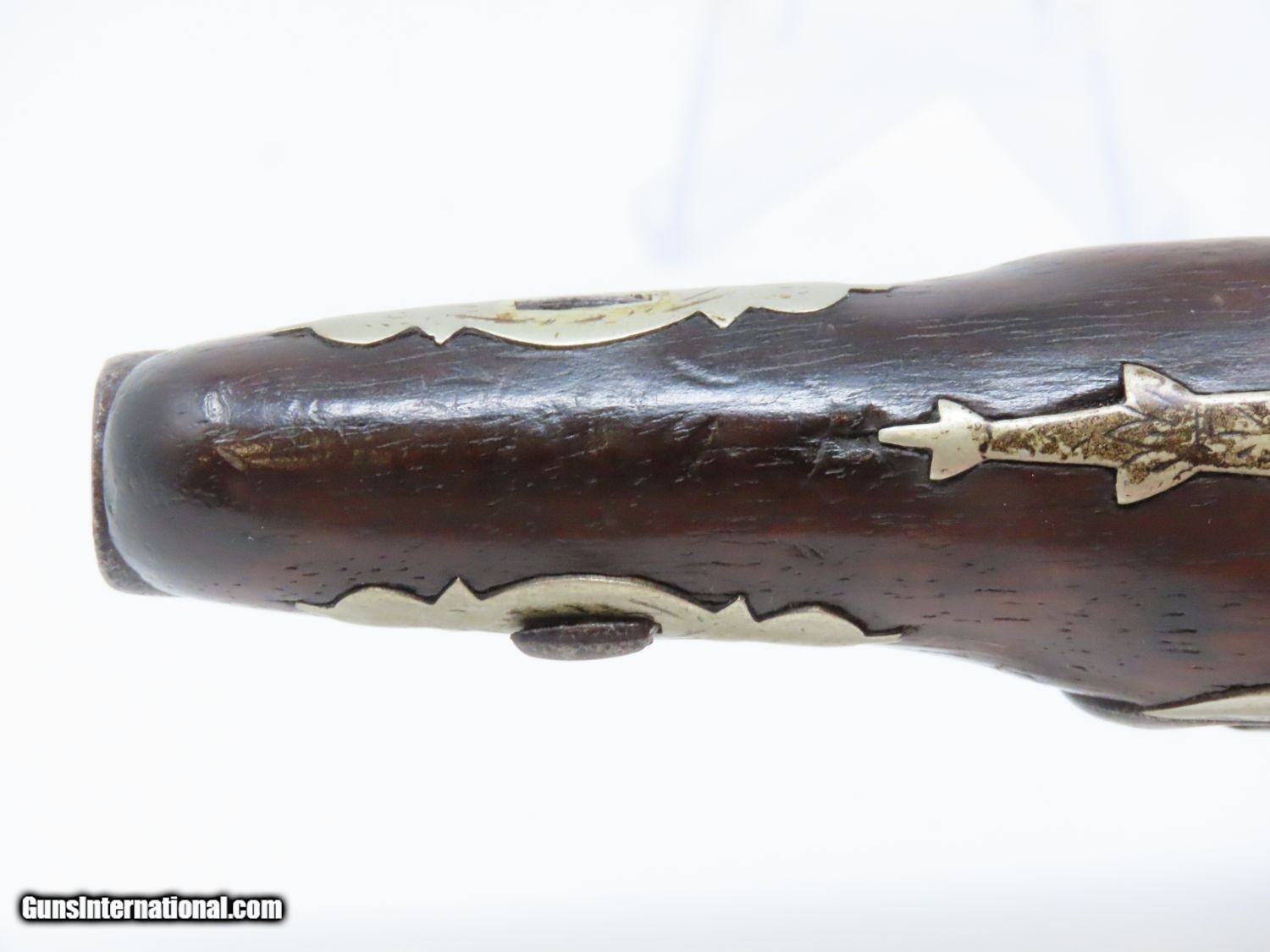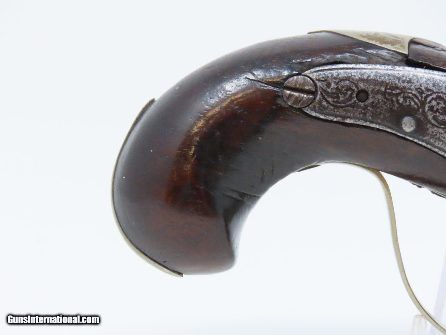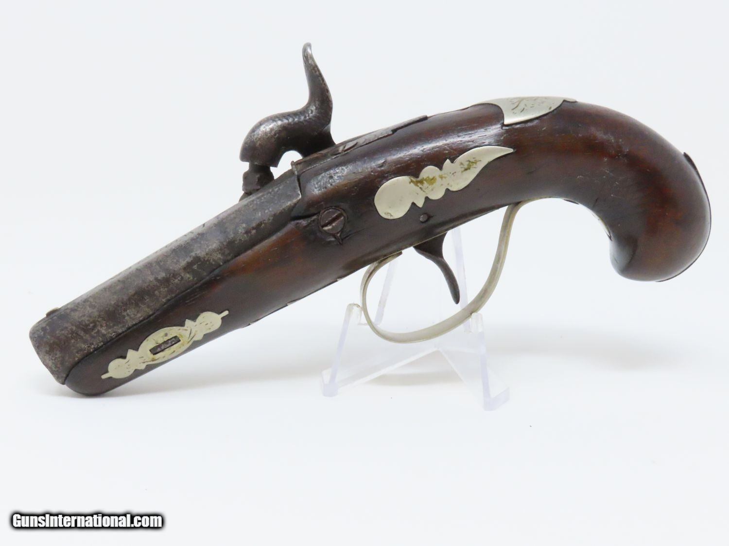 Description: ENGRAVED Antique JOHN WURFFLEIN PHILADELPHIA DERINGER Percussion Pistol Contemporary of Henry Deringer’s Here we present an antique Andrew Wurfflein Deringer Percussion Pistol, made circa the 1850s. Wurfflein arrived in New York from Germany in 1832 and settled in Philadelphia, Pennsylvania. By 1840, he was granted U.S. citizenship. In 1844, his brother John, also a gunsmith by trade, immigrated. They worked together for some time, and were two of the six that founded the Shuetzen Verein, a prominent German shooting club in Philadelphia. Their work included rifles and pistols, including close copies of their Philadelphia neighbor Henry Deringer’s hit pocket pistol. Henry Deringer was a very successful Pennsylvanian gunsmith who started his own company in his early twenties, circa 1809. It was not until the 1850s that his prototypical “Deringer” percussion pistol became extremely popular. Once it did become popular, the basic design was copied in dozens of different shops. Not only was it copied, but Deringer’s good name was stamped on guns made by others, some of them not up to the quality standards of Deringer himself. The inventor was apparently very worried about protecting his good name, so he pursued and sued any of the counterfeiters that he could find and warned the buying public to beware of his spurious imitators. The name “Deringer” often invokes certain historical event, characters or moments in film. Deringer’s name has become both a noun and a catch-all term. President Abraham Lincoln was shot and killed with one of Henry Deringer’s pocket sized percussion pistols, the night John Wilkes Booth revenged the South at the Ford Theater. They conjure images of the California Gold Rush, as well as riverboat gamblers. These pistols were very practical for the time, being small and concealable and of large bore size. Here is what Charles Edwin Chapel had to say about the Deringer pistol: “For a man in a tight spot, with an armed enemy only a few feet away, a pair of single-shot Deringer pistols was more effective than the multishot pepperbox. You either got your man at the first or second shot—if, indeed, you were given the chance to fire twice—or you got a fast funeral. That heavy-calibered little gun was a man-stopper at short range, an effective surprise weapon, an “equalizer” with which many a gold-camp David permanently tamed the muscle-bulging, belligerent Goliaths of the frontier. Included in a man’s personal arsenal, the pistol was carried either as a principal weapon or as a reserve to be used when revolver, pepperbox or Bowie knife failed.” The overall condition is good. The action is strong. The bore is dark. There have been a few repairs to the stock over the years, but it remains stable. “J. WURFFLEIN” can be read atop the barrel. A great example that looks like it has been there and done that! Own the original! This is a legitimate antique and not a reproduction. Barrel is 2-1/2 inches. Caliber: .44 Percussion Overall condition as seen in photos. Very Fast. Very Safe. FREE SHIPPING WORLDWIDE. Delivered directly to your door by express mail! Guaranteed AUTHENTIC & Includes CERTIFICATE OF AUTHENTICITY. ancestryguns $1745 #20698 SOLD Antique: Yes |