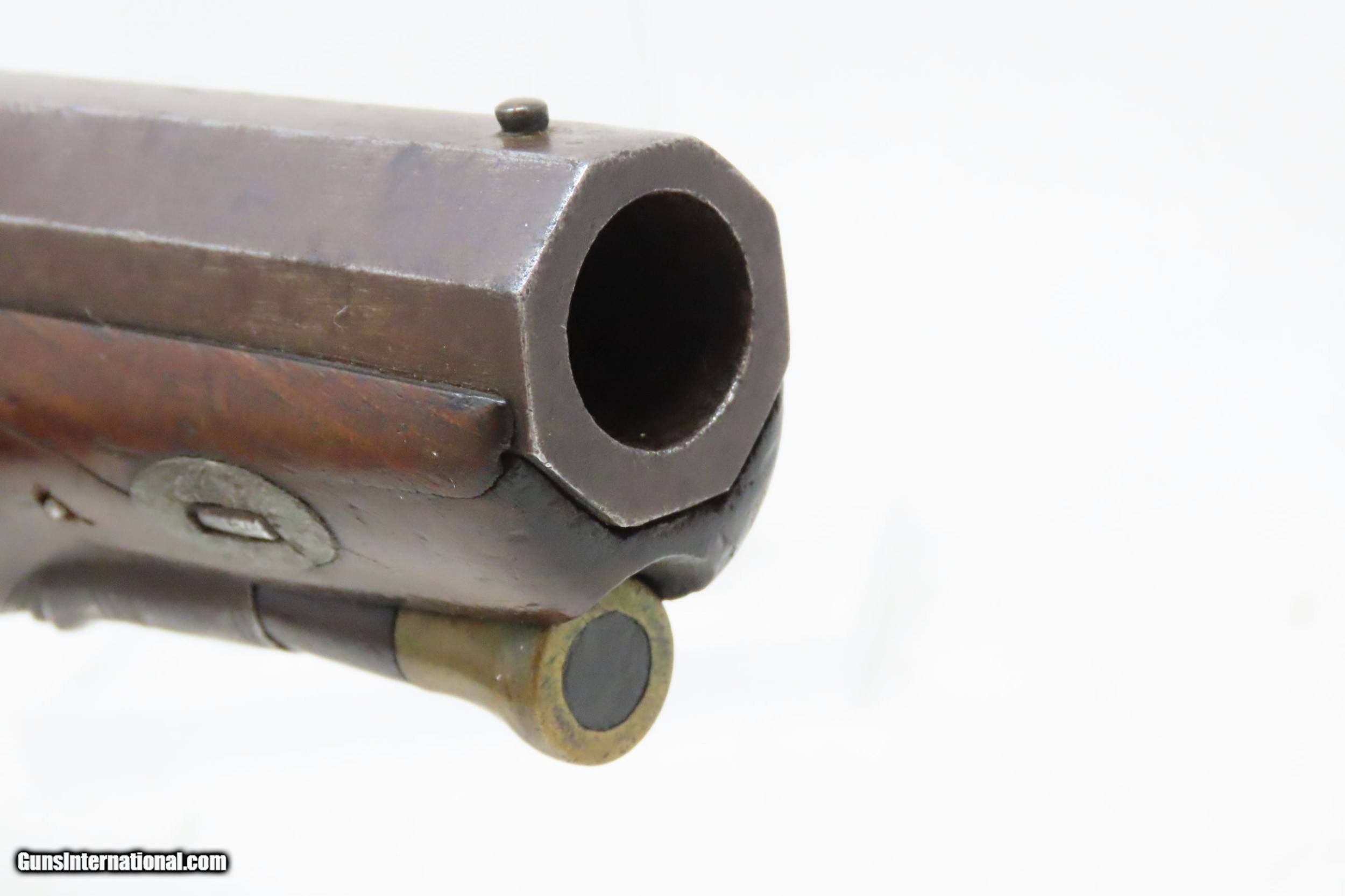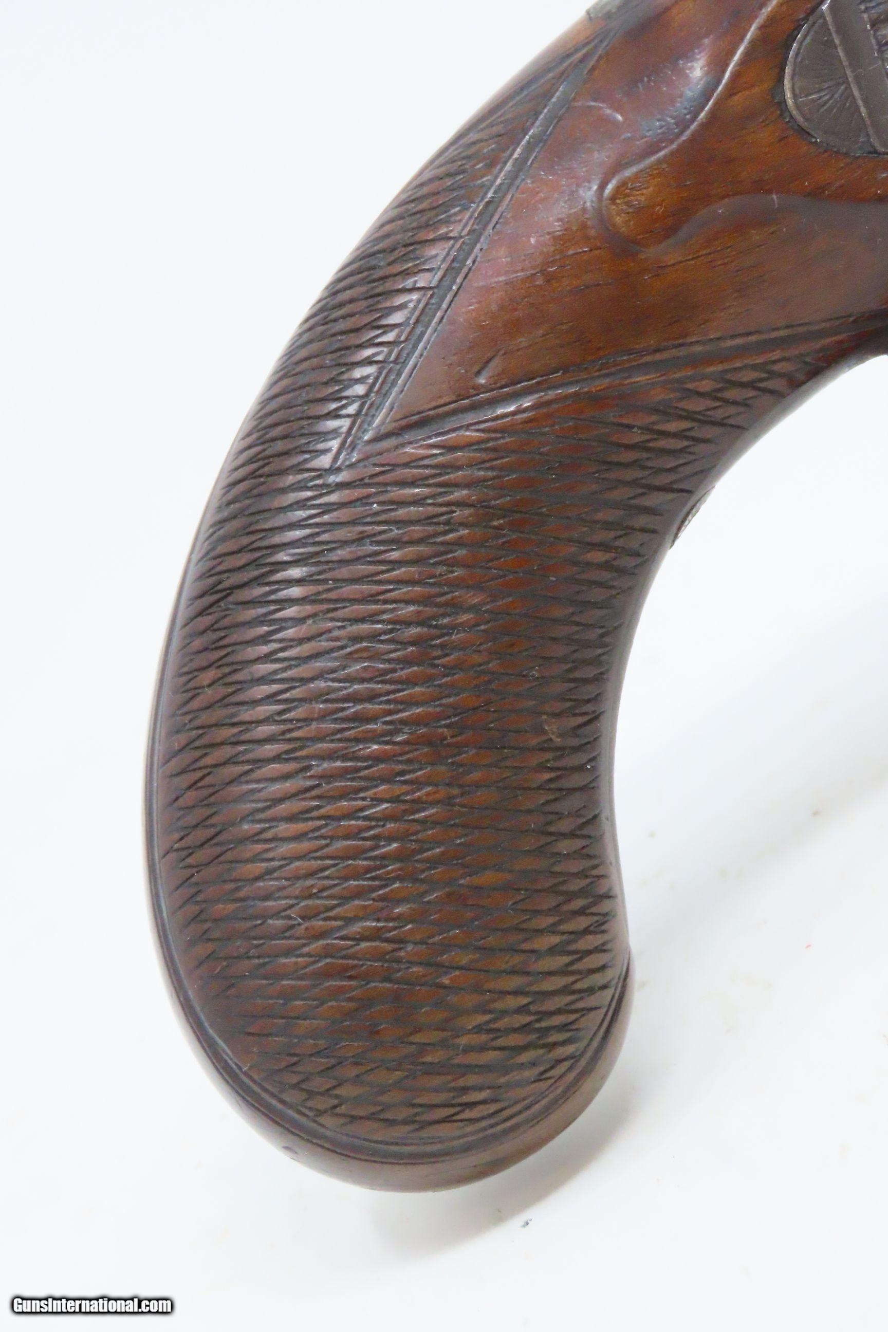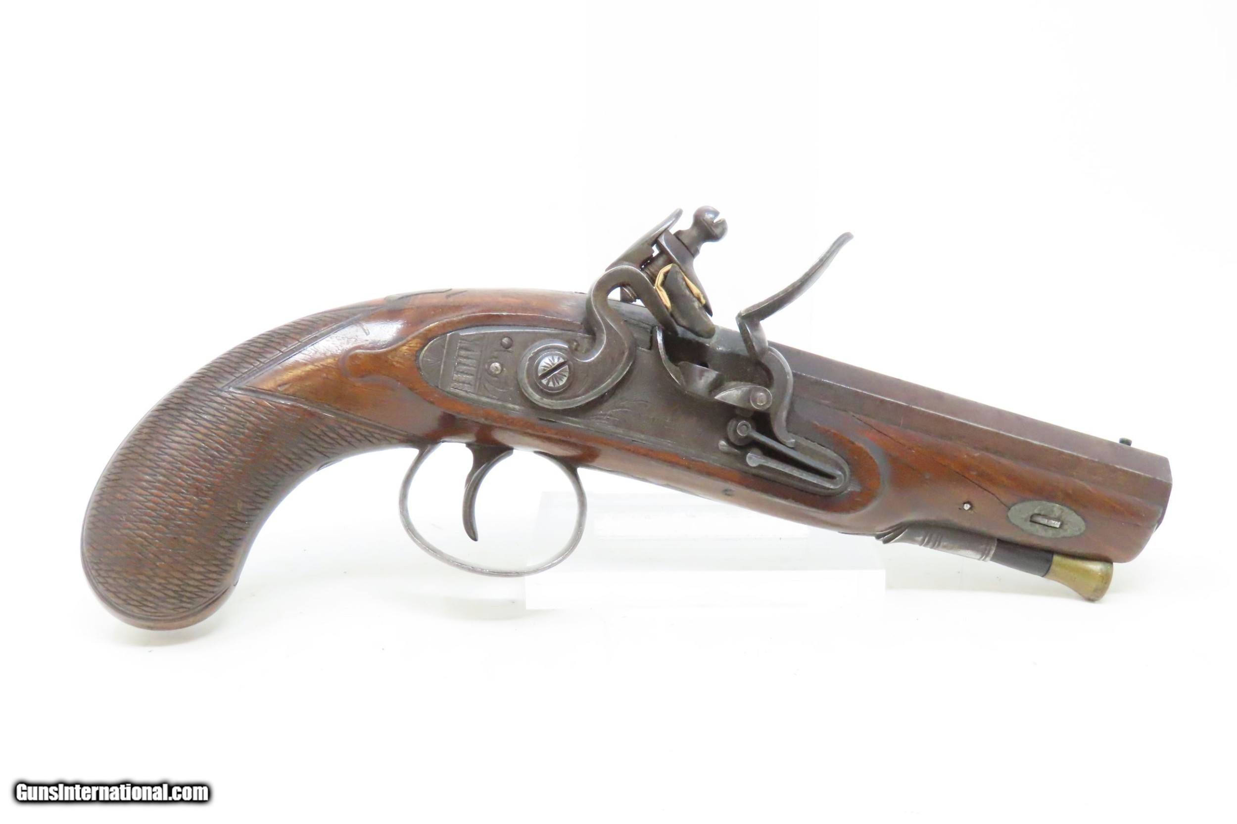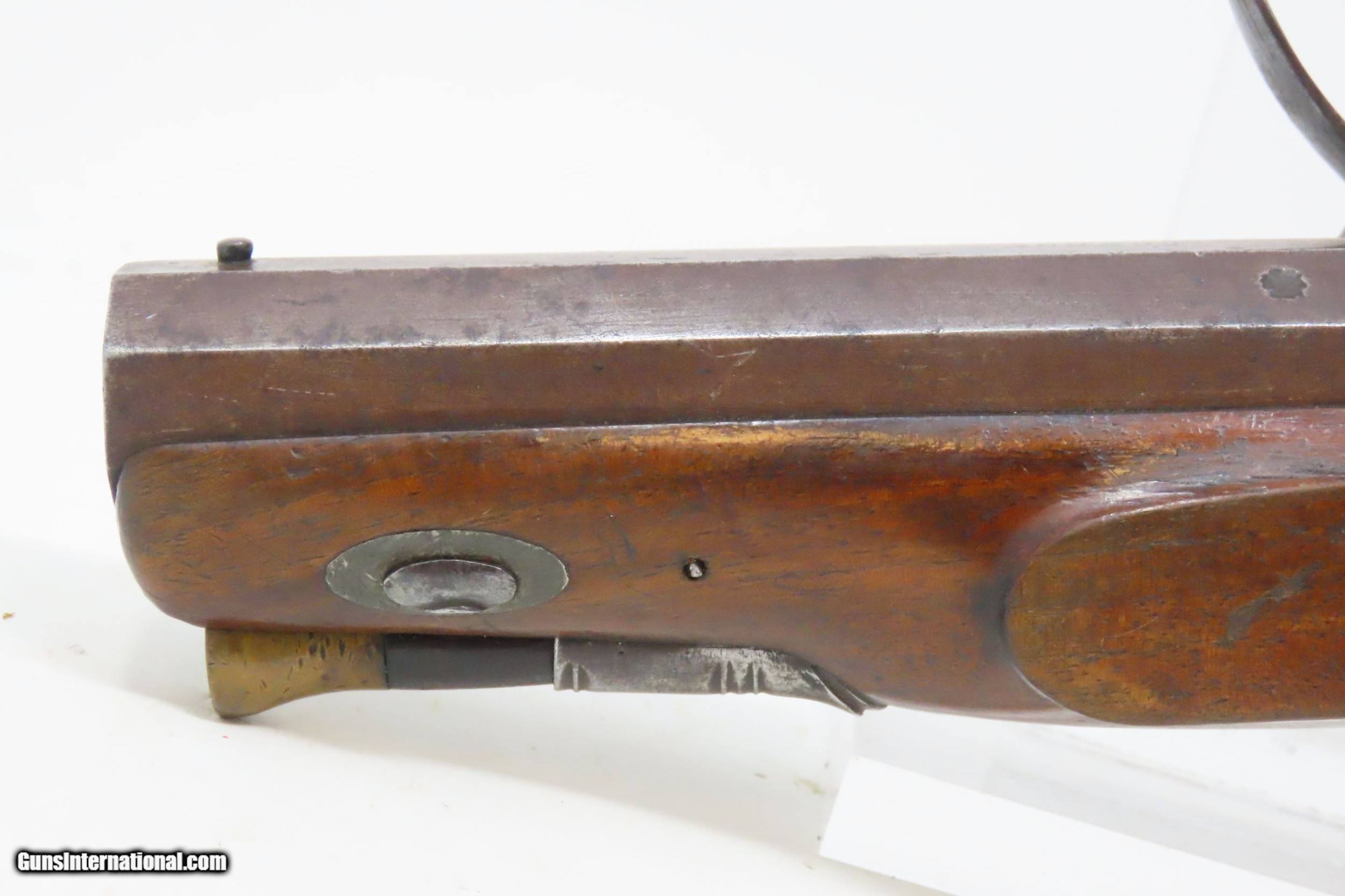 Description: ENGRAVED Antique SMITH Marked British .60 Cal. FLINTLOCK COAT/BELT Pistol Early 19th Century Self Defense Weapon Here we present an antique Smith Marked British Flintlock Coat/Belt Pistol, made circa the early-19th Century in London, England. This pistol has a fairly large frame and a heavy barrel. Then as now, rifles and muskets were the primary arm of the day, useful for everything from hunting to combat. Pistols were certainly not as numerous but still very useful for combat since most firearms at this time were limited to a single shot. Imagine if one discharged their single shot firearm only to miss or have another enemy close the distance. A man expecting trouble might carry as many pistols on his person as he could. According to some estimates, European rifles were made at a ratio of 250:1 over pistols, making these rare and highly coveted. This pistol features a large .59 caliber “manstopping” bore that would have been slipped into a gentleman’s coat pocket on neatly tucked into his belt. This is a neat old pistol and one can easily imagine the sight of its gaping bore would certainly be a deterrent to would be scoundrels while strolling in the busy streets of London or Paris in the early 1800s. The overall condition is very good. Original finish. The action is excellent. The bore is patinated and smooth. The stock is solid with the exception of the repaired sliver on the right side of the forestock. Own the original! This is a legitimate antique and not a reproduction. Barrel is 4-3/4 inches. Caliber: .60 Flintlock Overall condition as seen in photos. Very Fast. Very Safe. FREE SHIPPING WORLDWIDE. Delivered directly to your door by express mail! Guaranteed AUTHENTIC & Includes CERTIFICATE OF AUTHENTICITY. ancestryguns $1800 #226489 SOLD Antique: Yes |