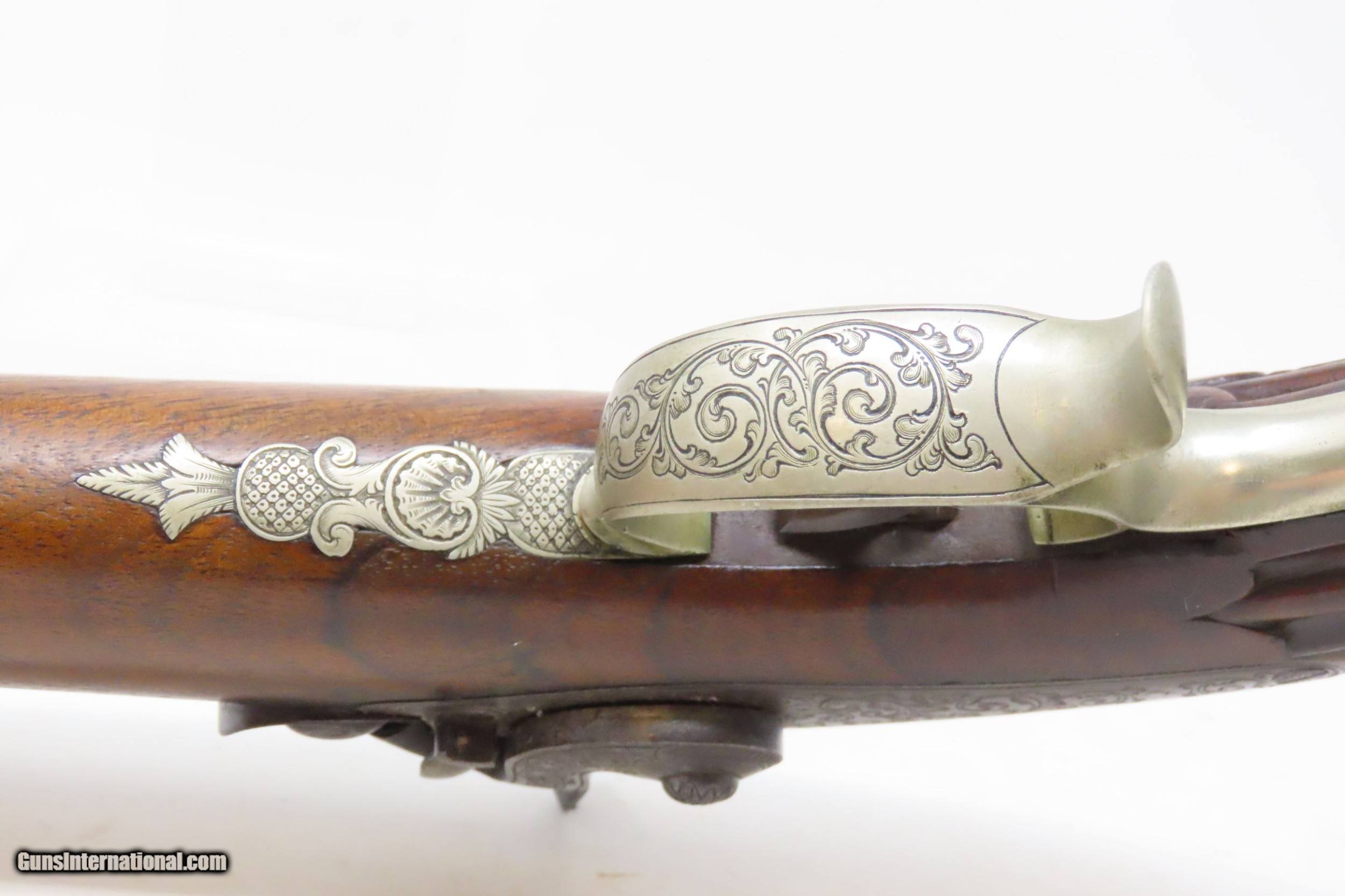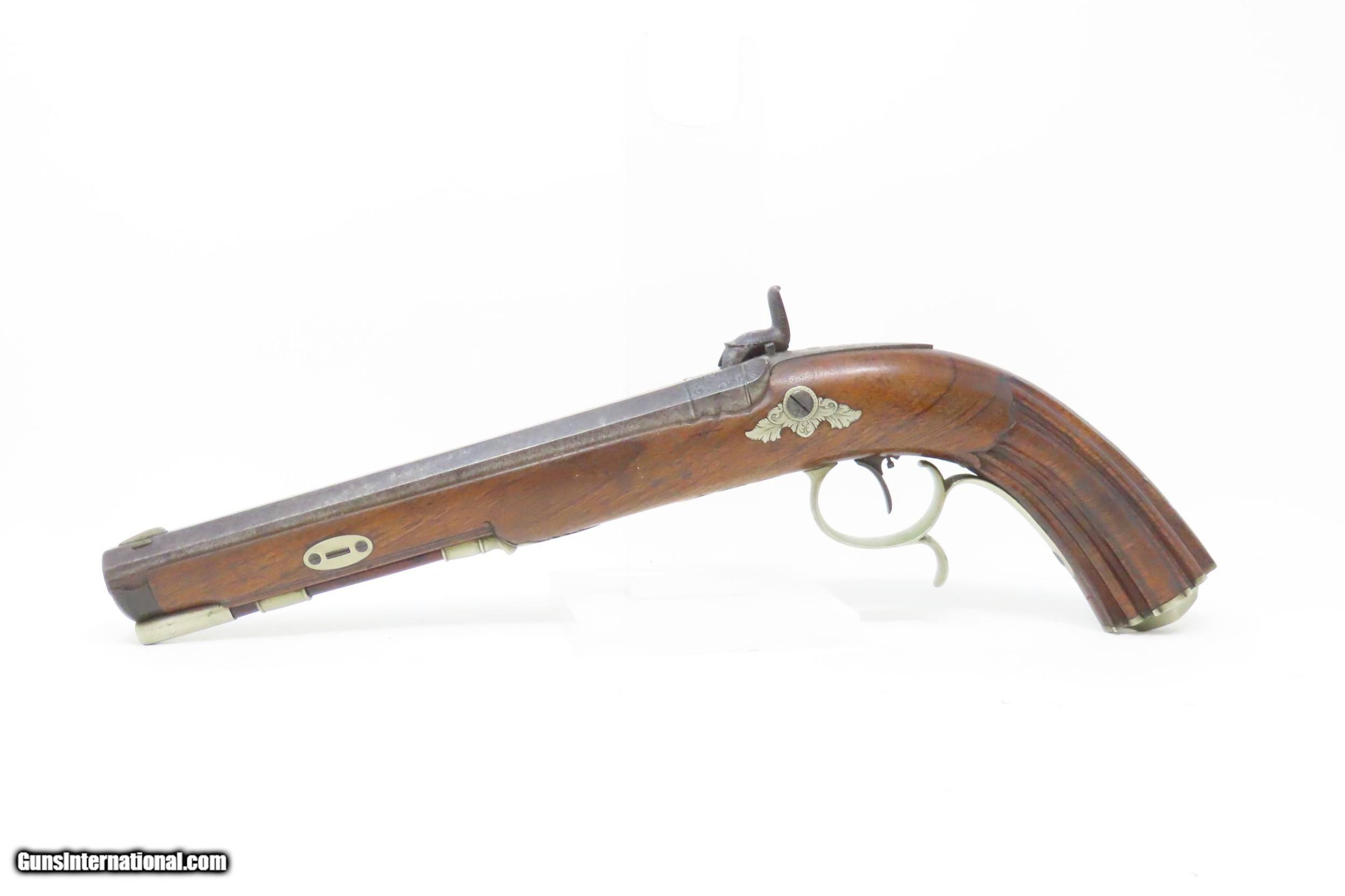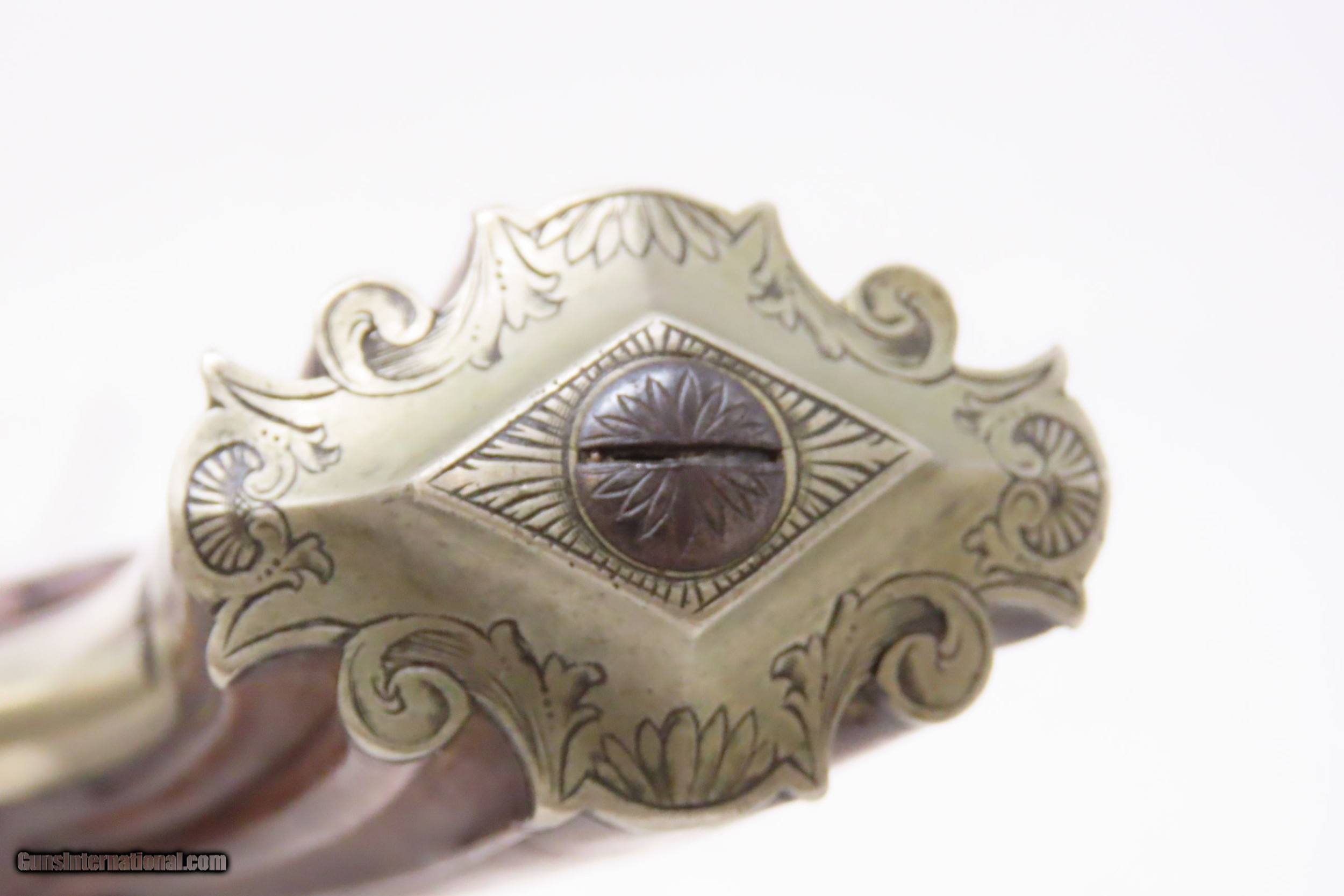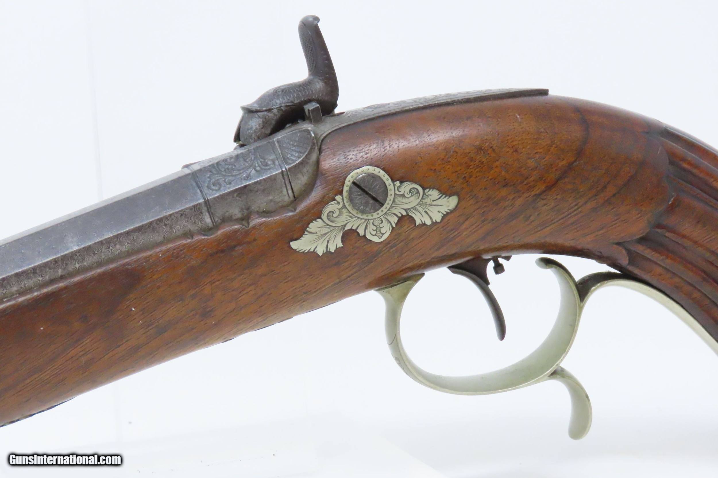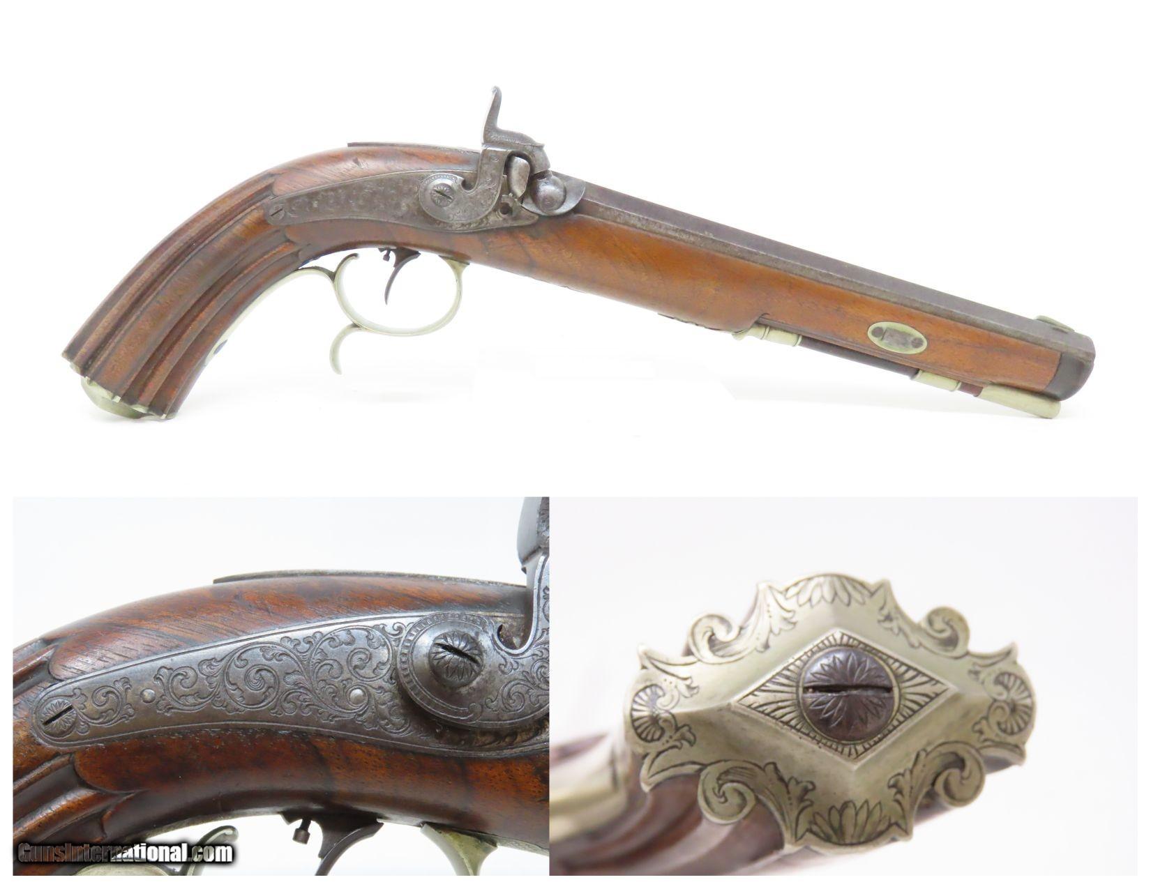 Description: ENGRAVED & SILVER INLAID Antique J.D. MORITZ .42 Caliber Percussion PISTOL Made Mid-19th Century in LIEPZIG, GERMANY! Here we present an antique Engraved and Silver Inlaid J.D. Moritz Percussion Pistol, made circa the 1840s in Liepzig, Germany. The Moritz family has a long history of gunmaking dating back to the 17th Century. The earliest gunmaking Moritz was Heinrich of Kassel in Hesse, Germany. He lived from 1615 to 1668 and was the great, great, great grandfather of Johann Daniel (J.D.) Moritz who was born on January 17, 1776 in Zella St. Blasii and died on December 19, 1855. J.D. Moritz was a Journeyman Gunmaker in 1805 and founded his own business in 1813. His second son, Friedrich Wilhelm Moritz carried on his father’s business after he passed away in 1855. This pistol features a 9-inch octagonal, Damascus barrel in .42 caliber. The stock has a fluted grip and is full-length, tipped in horn. Gorgeous Germanic scrollwork on the German silver hardware as well as the lock. Single set trigger. Target sights. The top of the barrel, inlaid in silver reads, “MADE EXPRESSLY FOR C.Y.E. BARTHOLD BY J.D. MORITZ, SON LEIPSICK”. The overall condition is near fine. Original patina. Excellent action (set trigger). The bore shows good rifling with a patina. This example sports a solid stock/grip with less than expected handling/storage wear. Both the lock and hammer are sharply engraved. Damascus barrel. Own the original! This is a legitimate antique and not a reproduction. Barrel is 9 inches. Caliber: .42 percussion Overall condition as seen in photos. Very Fast. Very Safe. FREE SHIPPING WORLDWIDE. Delivered directly to your door by express mail! Guaranteed AUTHENTIC & Includes CERTIFICATE OF AUTHENTICITY. ancestryguns $2715 #220120 SOLD Antique: Yes |