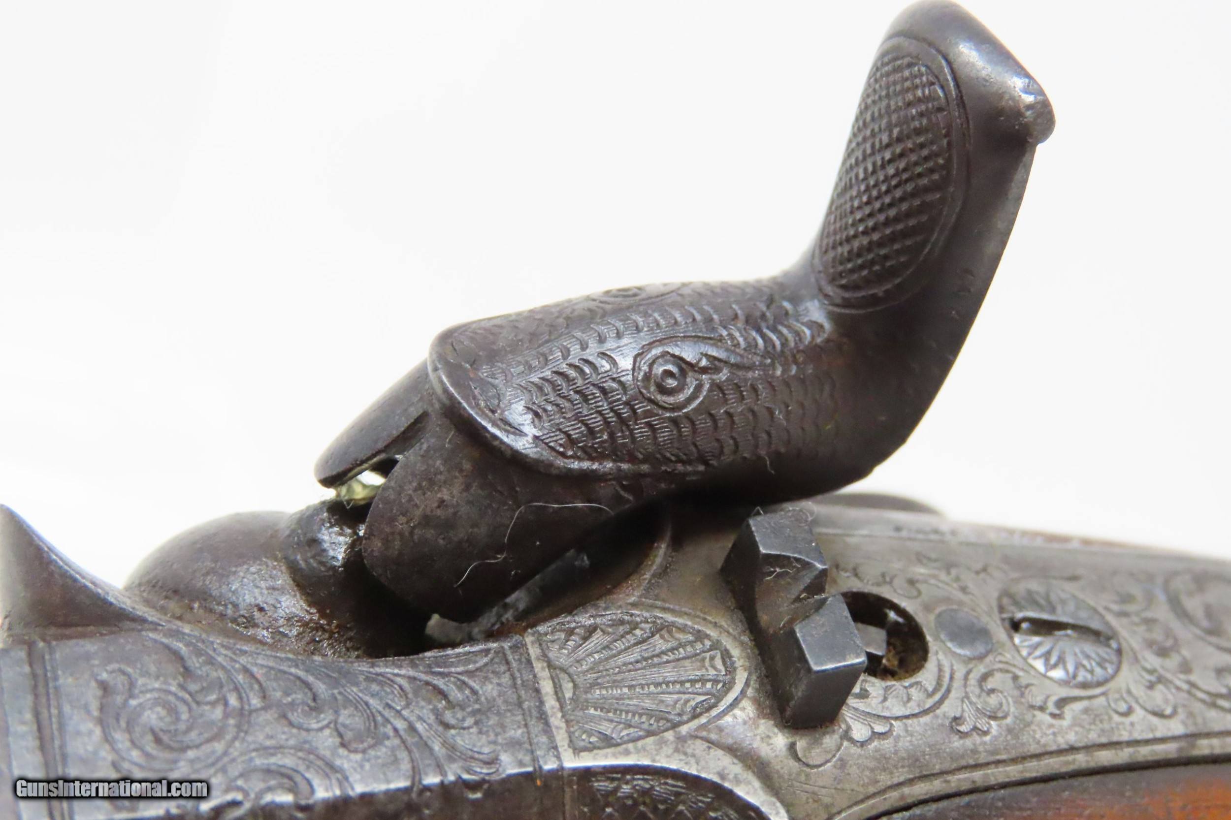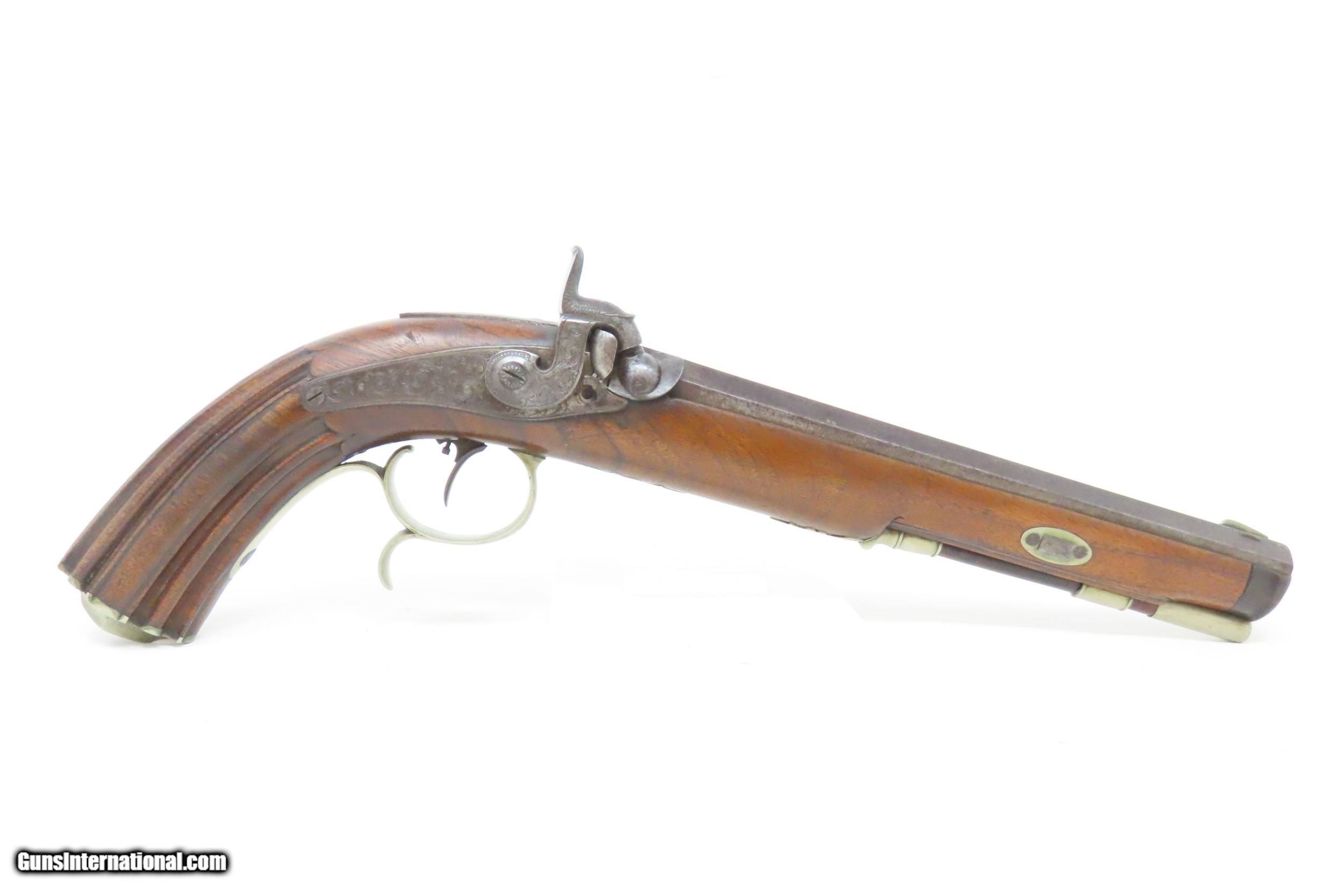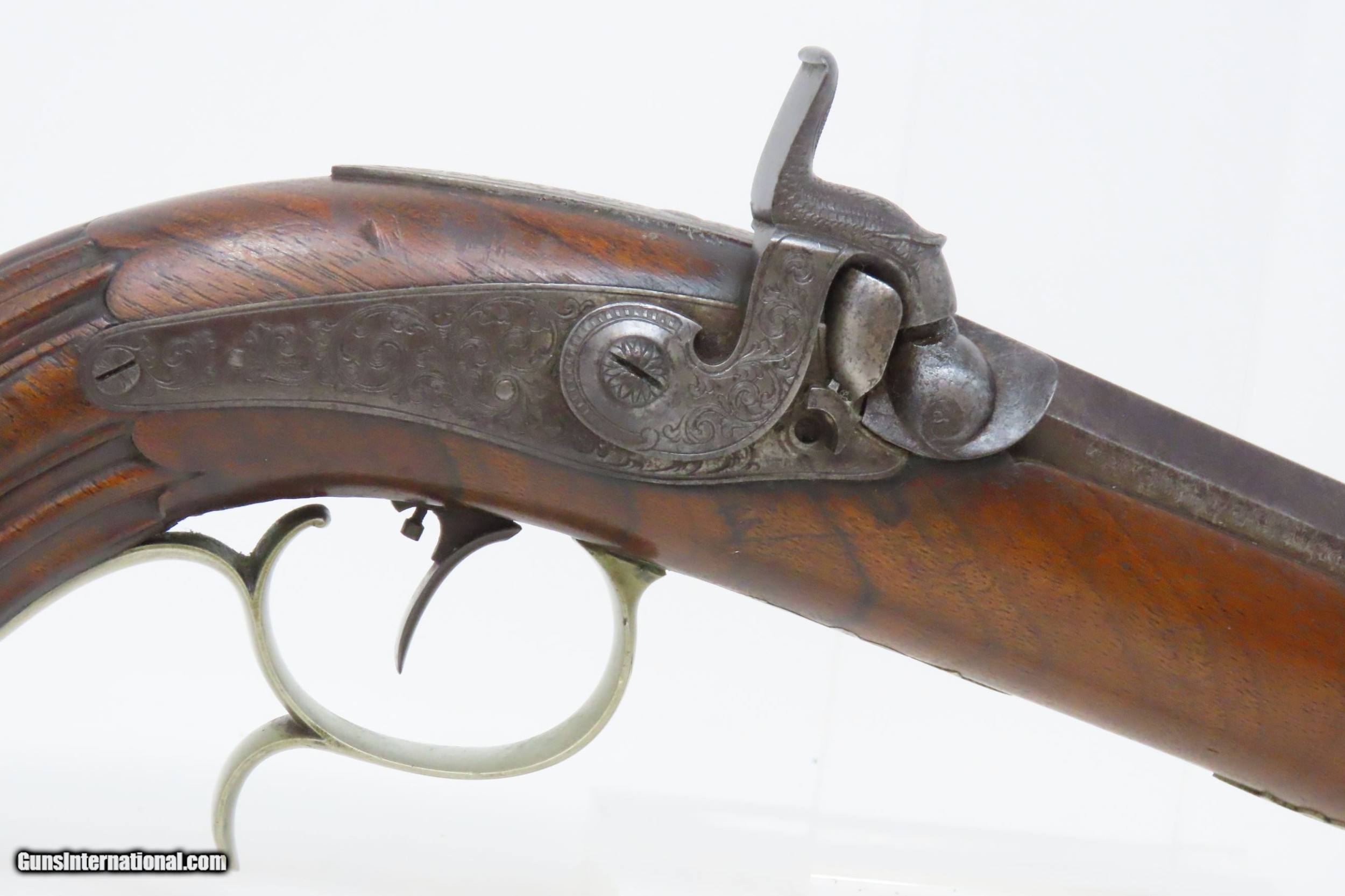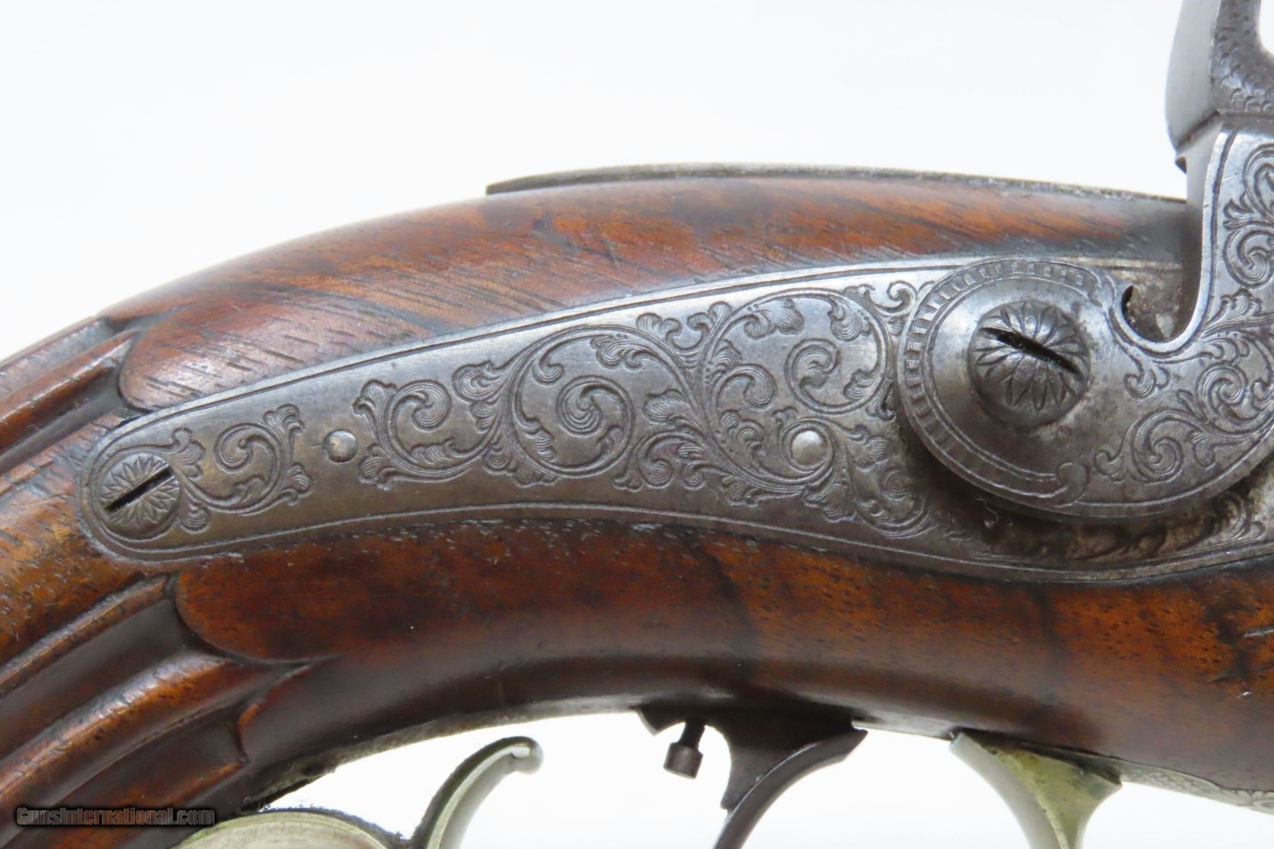 Description: ENGRAVED & SILVER INLAID Antique J.D. MORITZ .42 Caliber Percussion PISTOL Made Mid-19th Century in LIEPZIG, GERMANY! Here we present an antique Engraved and Silver Inlaid J.D. Moritz Percussion Pistol, made circa the 1840s in Liepzig, Germany. The Moritz family has a long history of gunmaking dating back to the 17th Century. The earliest gunmaking Moritz was Heinrich of Kassel in Hesse, Germany. He lived from 1615 to 1668 and was the great, great, great grandfather of Johann Daniel (J.D.) Moritz who was born on January 17, 1776 in Zella St. Blasii and died on December 19, 1855. J.D. Moritz was a Journeyman Gunmaker in 1805 and founded his own business in 1813. His second son, Friedrich Wilhelm Moritz carried on his father’s business after he passed away in 1855. This pistol features a 9-inch octagonal, Damascus barrel in .42 caliber. The stock has a fluted grip and is full-length, tipped in horn. Gorgeous Germanic scrollwork on the German silver hardware as well as the lock. Single set trigger. Target sights. The top of the barrel, inlaid in silver reads, “MADE EXPRESSLY FOR C.Y.E. BARTHOLD BY J.D. MORITZ, SON LEIPSICK”. The overall condition is near fine. Original patina. Excellent action (set trigger). The bore shows good rifling with a patina. This example sports a solid stock/grip with less than expected handling/storage wear. Both the lock and hammer are sharply engraved. Damascus barrel. Own the original! This is a legitimate antique and not a reproduction. Barrel is 9 inches. Caliber: .42 percussion Overall condition as seen in photos. Very Fast. Very Safe. FREE SHIPPING WORLDWIDE. Delivered directly to your door by express mail! Guaranteed AUTHENTIC & Includes CERTIFICATE OF AUTHENTICITY. ancestryguns $2715 #220120 SOLD Antique: Yes |