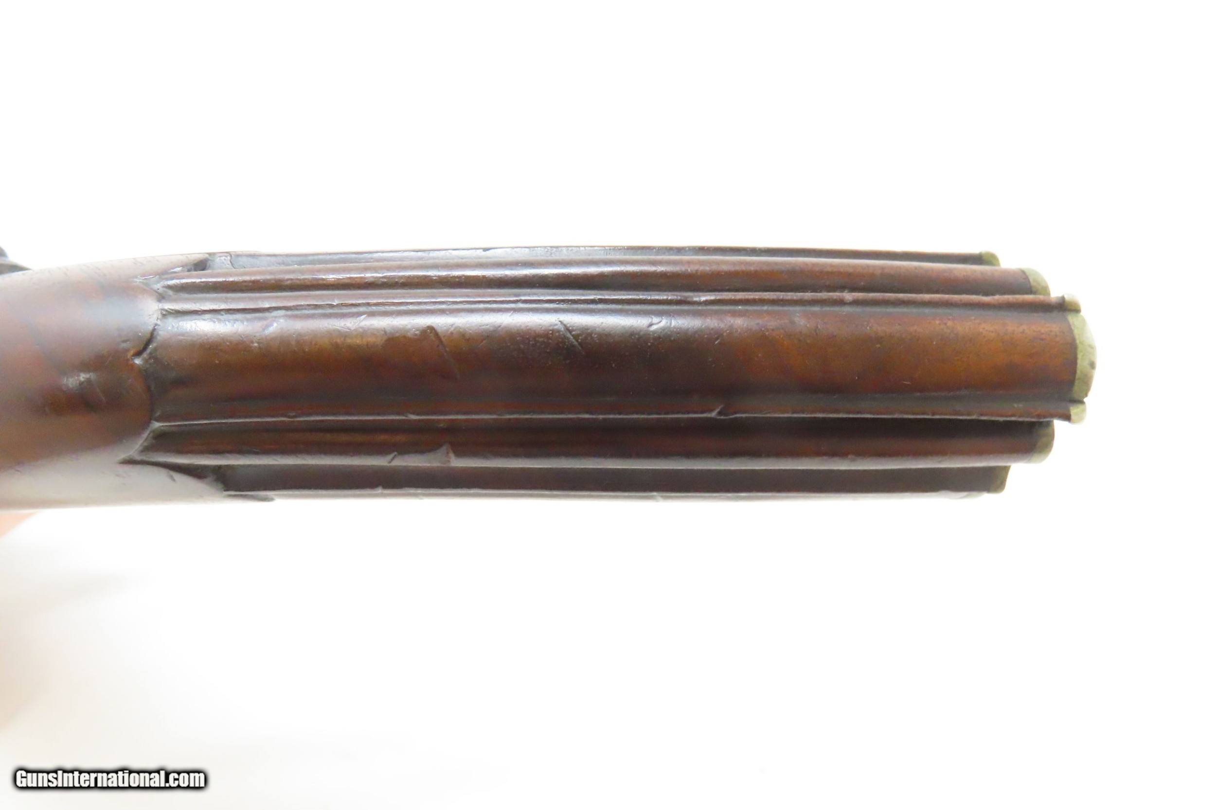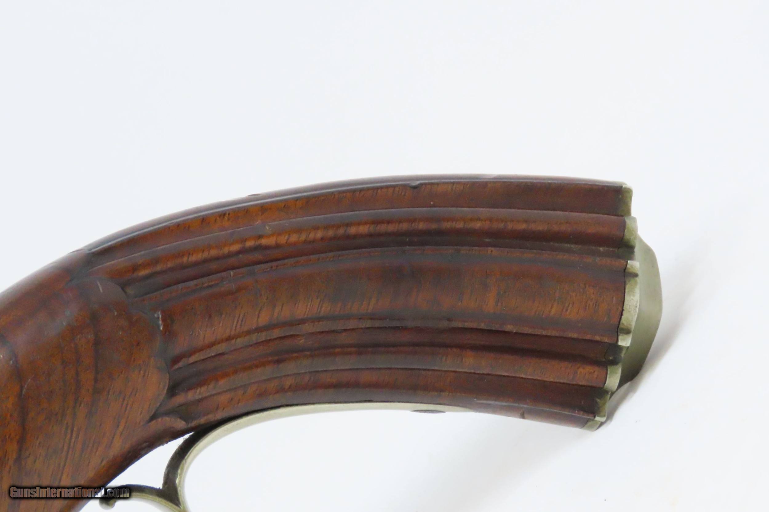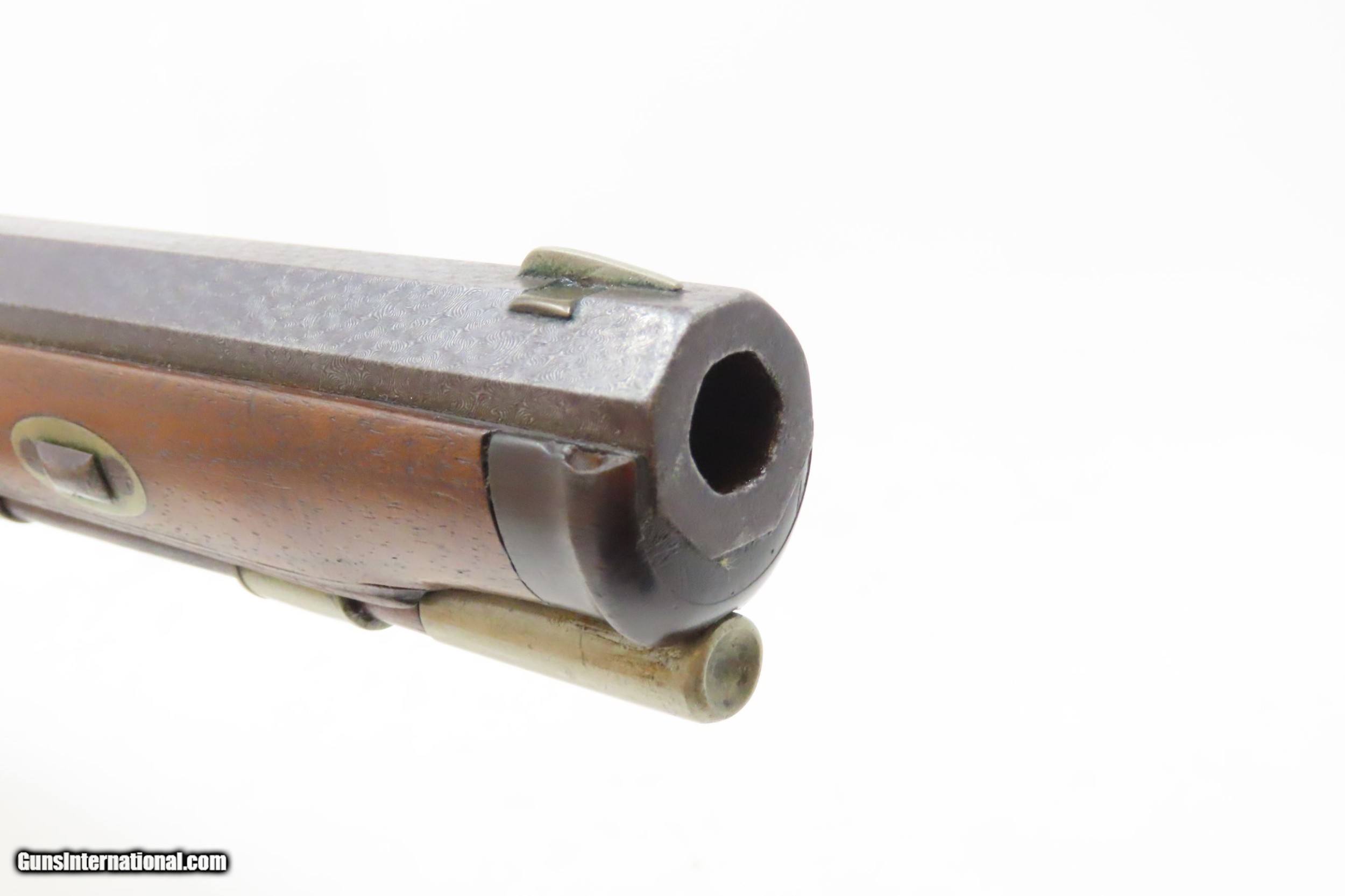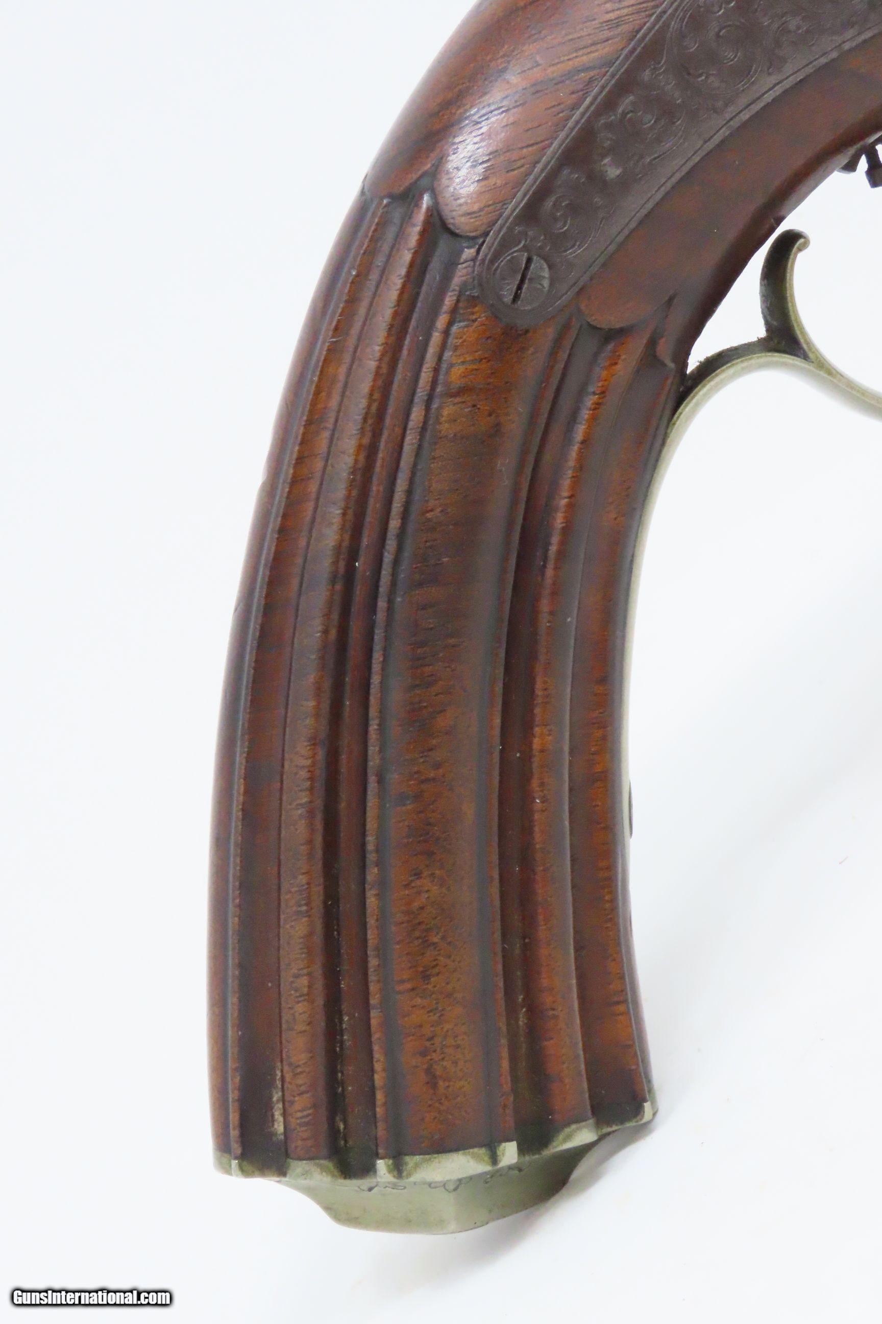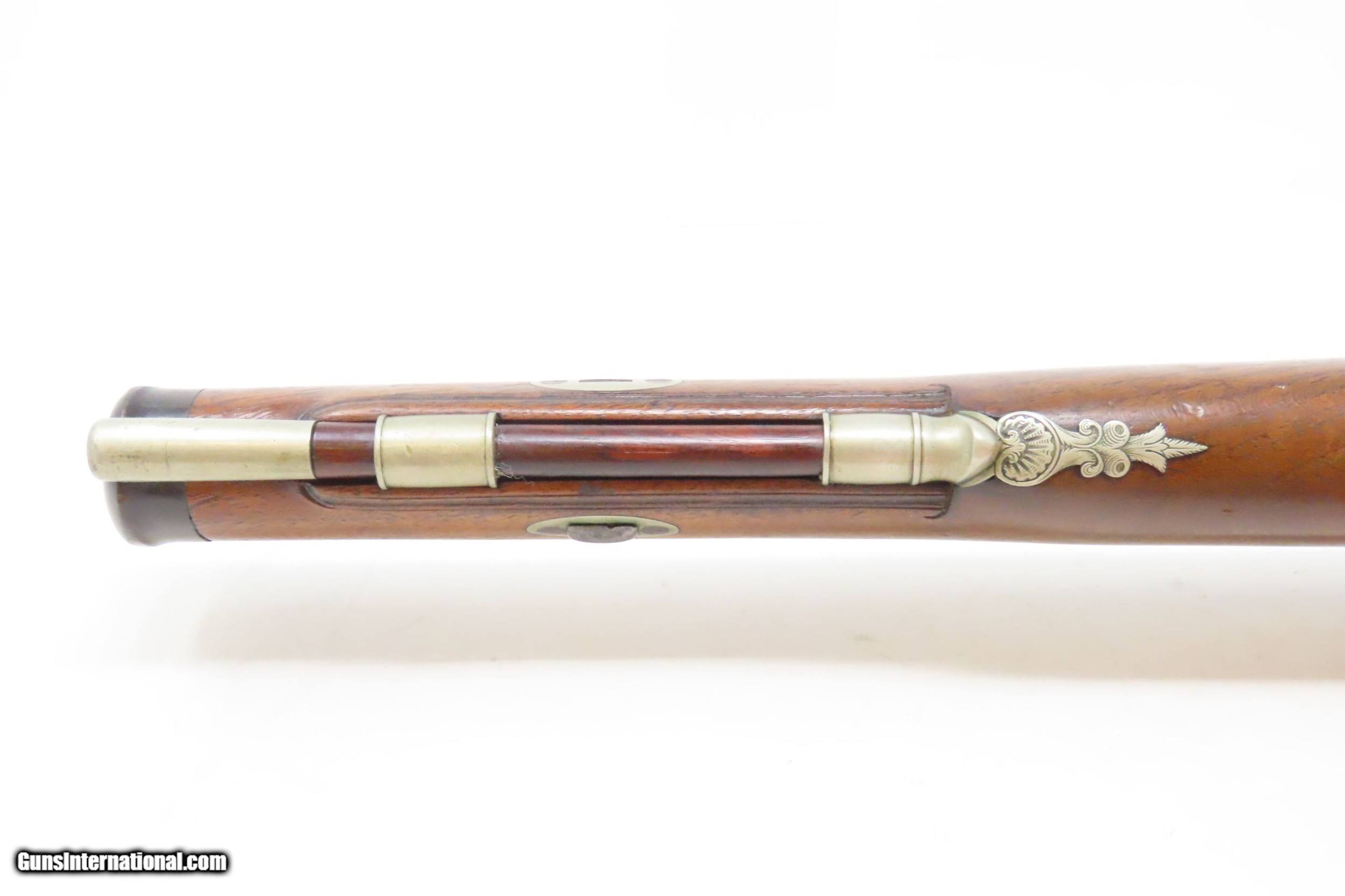 Description: ENGRAVED & SILVER INLAID Antique J.D. MORITZ .42 Caliber Percussion PISTOL Made Mid-19th Century in LIEPZIG, GERMANY! Here we present an antique Engraved and Silver Inlaid J.D. Moritz Percussion Pistol, made circa the 1840s in Liepzig, Germany. The Moritz family has a long history of gunmaking dating back to the 17th Century. The earliest gunmaking Moritz was Heinrich of Kassel in Hesse, Germany. He lived from 1615 to 1668 and was the great, great, great grandfather of Johann Daniel (J.D.) Moritz who was born on January 17, 1776 in Zella St. Blasii and died on December 19, 1855. J.D. Moritz was a Journeyman Gunmaker in 1805 and founded his own business in 1813. His second son, Friedrich Wilhelm Moritz carried on his father’s business after he passed away in 1855. This pistol features a 9-inch octagonal, Damascus barrel in .42 caliber. The stock has a fluted grip and is full-length, tipped in horn. Gorgeous Germanic scrollwork on the German silver hardware as well as the lock. Single set trigger. Target sights. The top of the barrel, inlaid in silver reads, “MADE EXPRESSLY FOR C.Y.E. BARTHOLD BY J.D. MORITZ, SON LEIPSICK”. The overall condition is near fine. Original patina. Excellent action (set trigger). The bore shows good rifling with a patina. This example sports a solid stock/grip with less than expected handling/storage wear. Both the lock and hammer are sharply engraved. Damascus barrel. Own the original! This is a legitimate antique and not a reproduction. Barrel is 9 inches. Caliber: .42 percussion Overall condition as seen in photos. Very Fast. Very Safe. FREE SHIPPING WORLDWIDE. Delivered directly to your door by express mail! Guaranteed AUTHENTIC & Includes CERTIFICATE OF AUTHENTICITY. ancestryguns $2715 #220120 SOLD Antique: Yes |