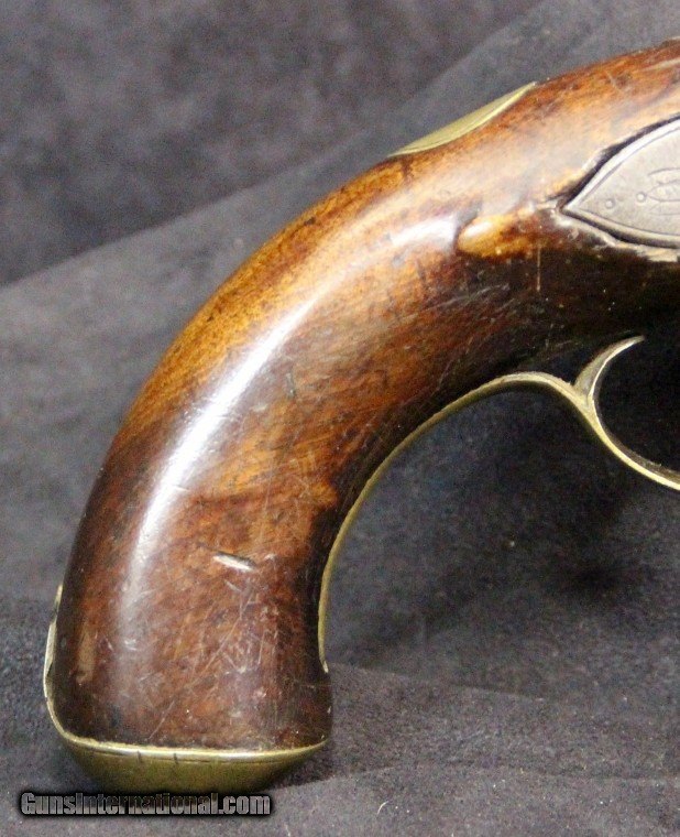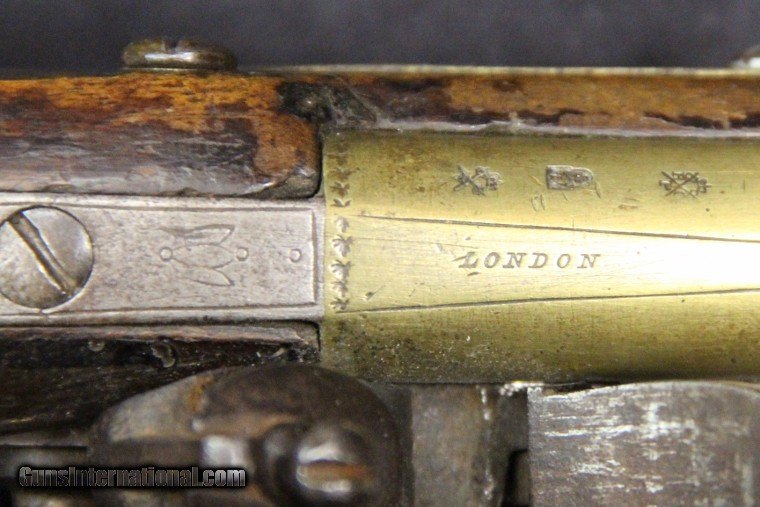 Description: .54 cal smooth bore, NVSN, 8 inch brass barrel with Birmingham proofs, "LONDON" on top of barrel, iron lock marked "ALLPORT/late with/KETLAND & Co", brass furniture, walnut stock, early 1800's. James Allport was partners with Willian Ketland as Ketland & Co from 1800 to 1931. With Birmingham proofs probably after 1813. Condition: black powder oxidation the length of the barrel, brass is smooth mustard color, stock is excellent with a few chips and minor cracks, hammer stands at full cock, can feel as it passes half cock. SOLD Antique: Yes |