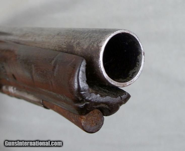 Condition: metal is clean with almost no rust. Wood has few dings and dents and a splinter missing at left of muzzle and a chip behind triggerguard. Works fine and locks up at both half cock and full cock. Over all a very nice early piece in very good condition.