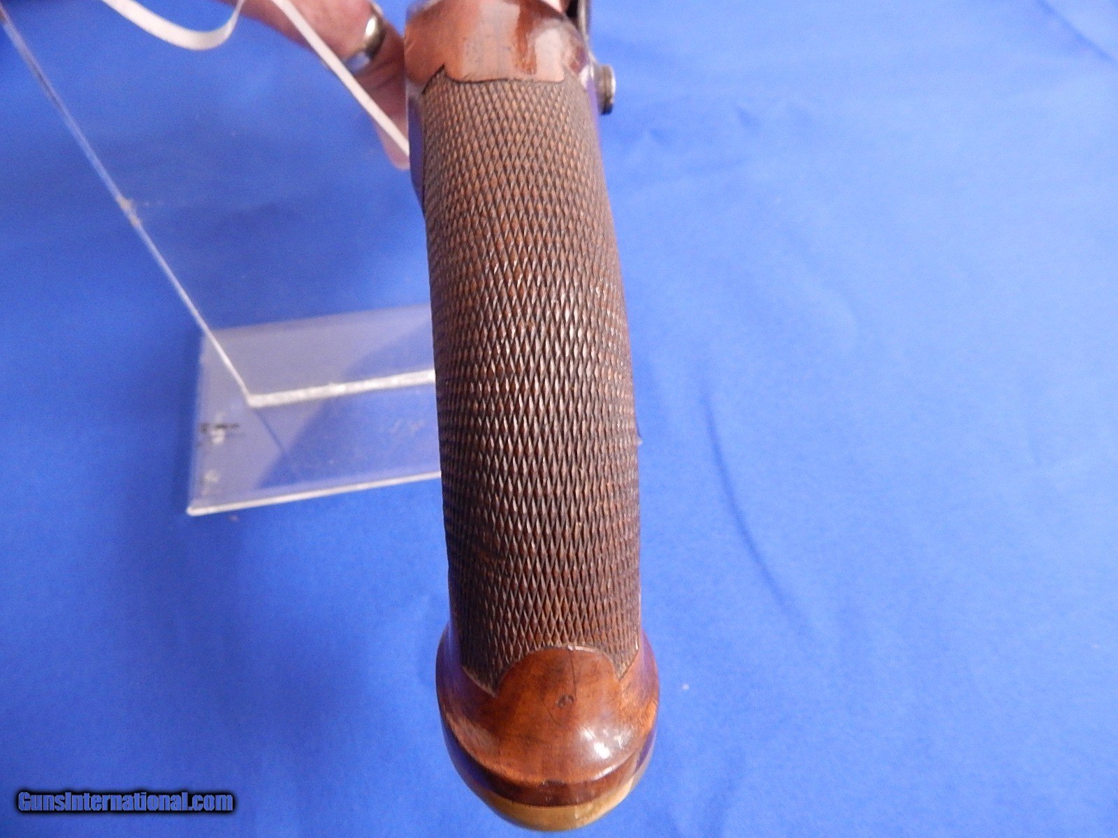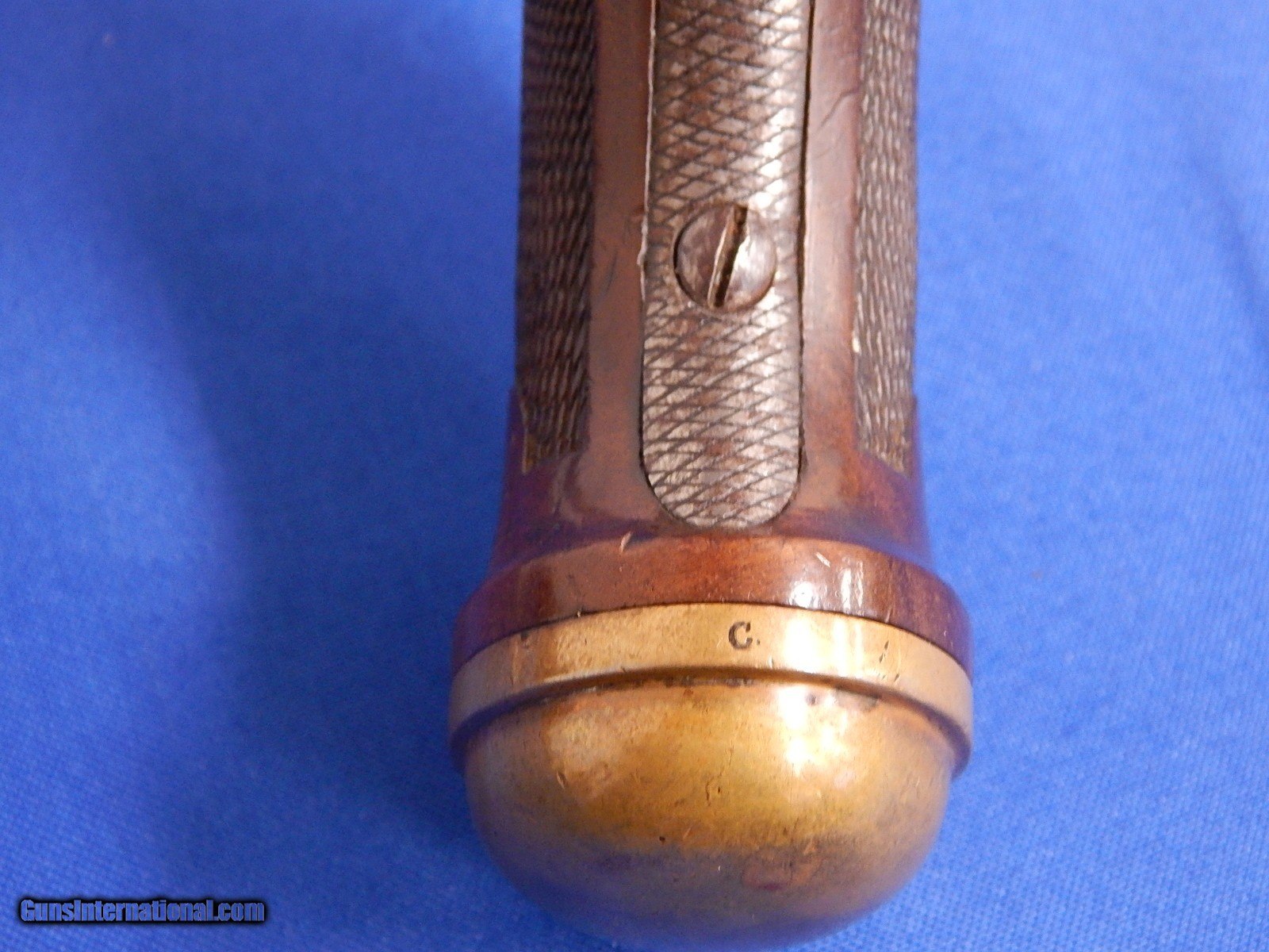 Description: This French M-1816 Officers Pistol remains in very fine condition. Lock retains much of its origianl case color and is marked St Etienne. The barrel tang is marked Mle 1816 and retains much of its case color. Barrel is marked CROWN over M and CROWN TL. Bore is very fine and actions are crisp and tight. The checkered stock is very fine with nice sharp edges. The stock opposite the lock is stamped 12 C. The pistol shows small proofs or inspections throughout. Brass furniture has a nice even appearance. Pistol measures 14 1/2" overall with a 8" barrel. SOLD Antique: Yes Manufacturer: St.Etienne Model: 1816 Barrel Length: 8 Caliber Info: 69 Condition: Very Fine Metal Condition: Very Fine Wood Condition: Very Fine Bore Condition: Very Fine |