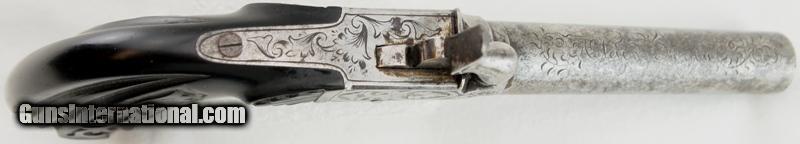 Description: French Muff Ebony Stock Pistol .45 cal. (ca. 1850), 3 1/8" round engraved rifled steel barrel, gray surface and some discoloration, finely scrolled engraved central hammer boxlock mechanism with original hammer and nipple, mechanically functional with working pop-out trigger, leaf and vine scroll pattern with gray background on frame surfaces, molded ebony grip is deeply fluted and curved with engraved vine pattern on both sides of grip (chip on left side of grip near frame), sculpted and faceted iron pommel cap. Collectable Antique No FFL Required. Add 3% for Credit Card Shipping $25.00 SOLD Antique: Yes |