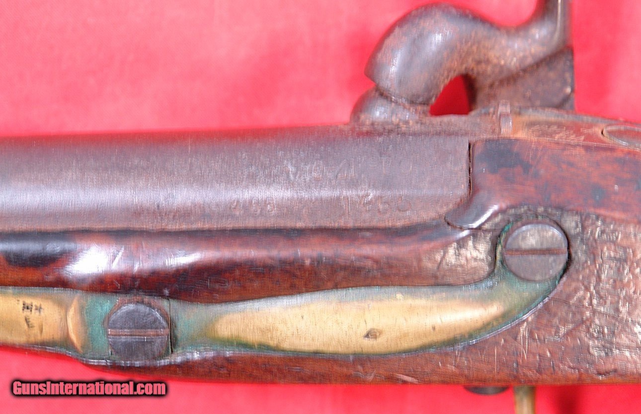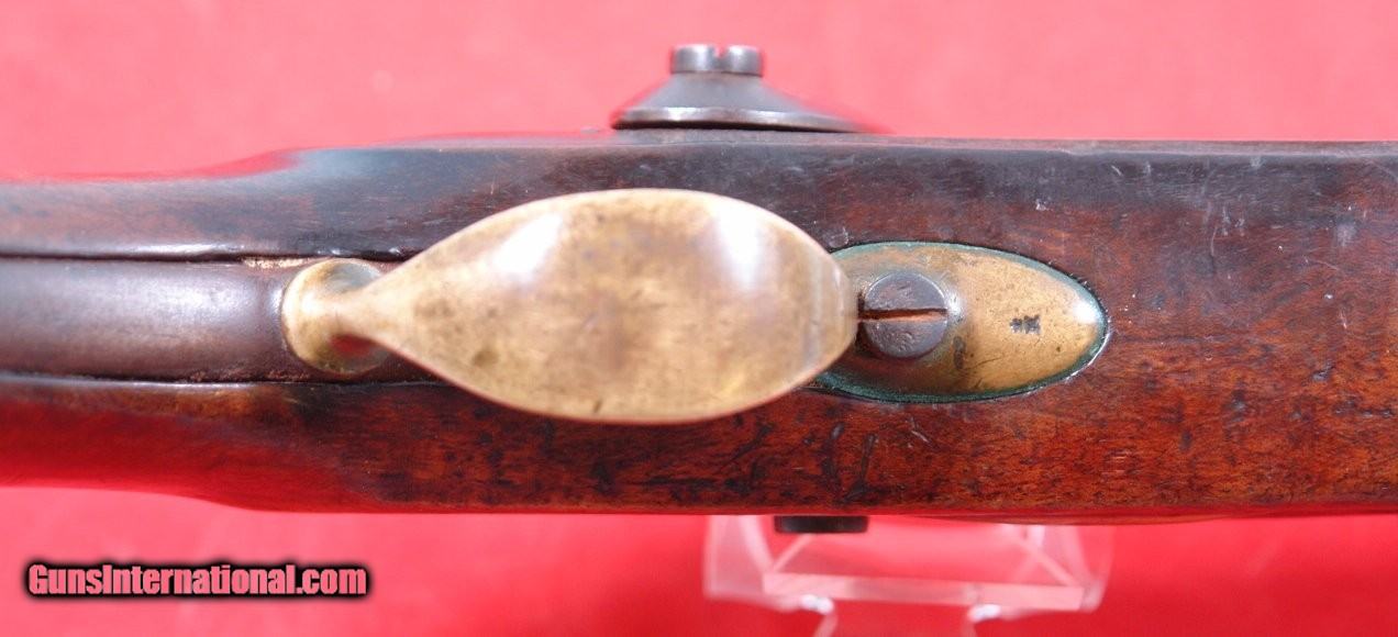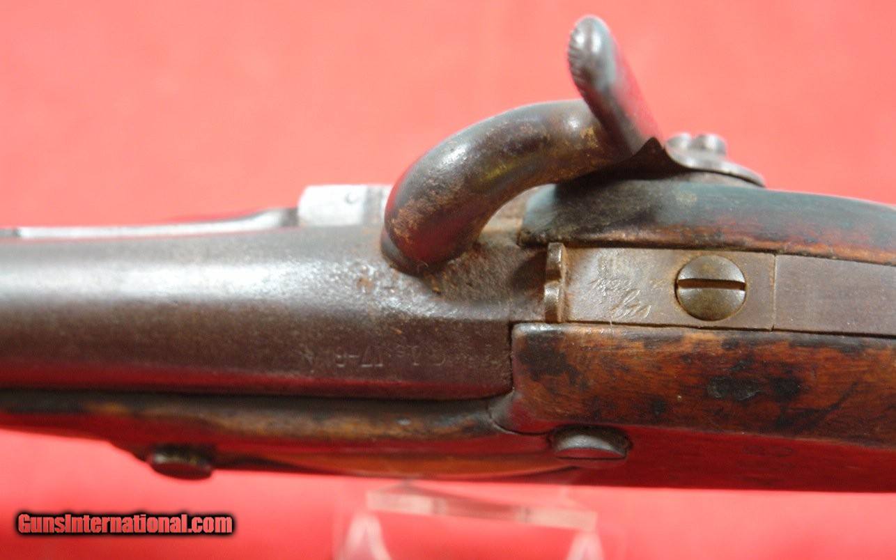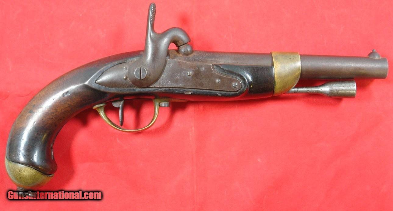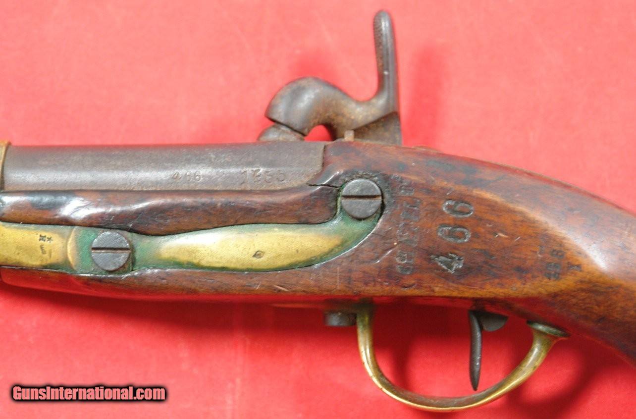 Description: 33118- FRENCH ST. ETIENNE MODEL 1822 T BIS PERCUSSION CONVERSION SINGLE SHOT CAVALRY PISTOL CIRCA 1850. 14” o/a with 8” round .70 cal. barrel with dome shaped front sight and notched fixed rear sights. Tulip tipped steel ramrod. Lock stamped “MRE RLE / ST. ETIENNE”. Stock with inspection stamps. All original and complete in nice condition. Working order. $750. Antique: Yes Price: $750.00 Contact Seller |