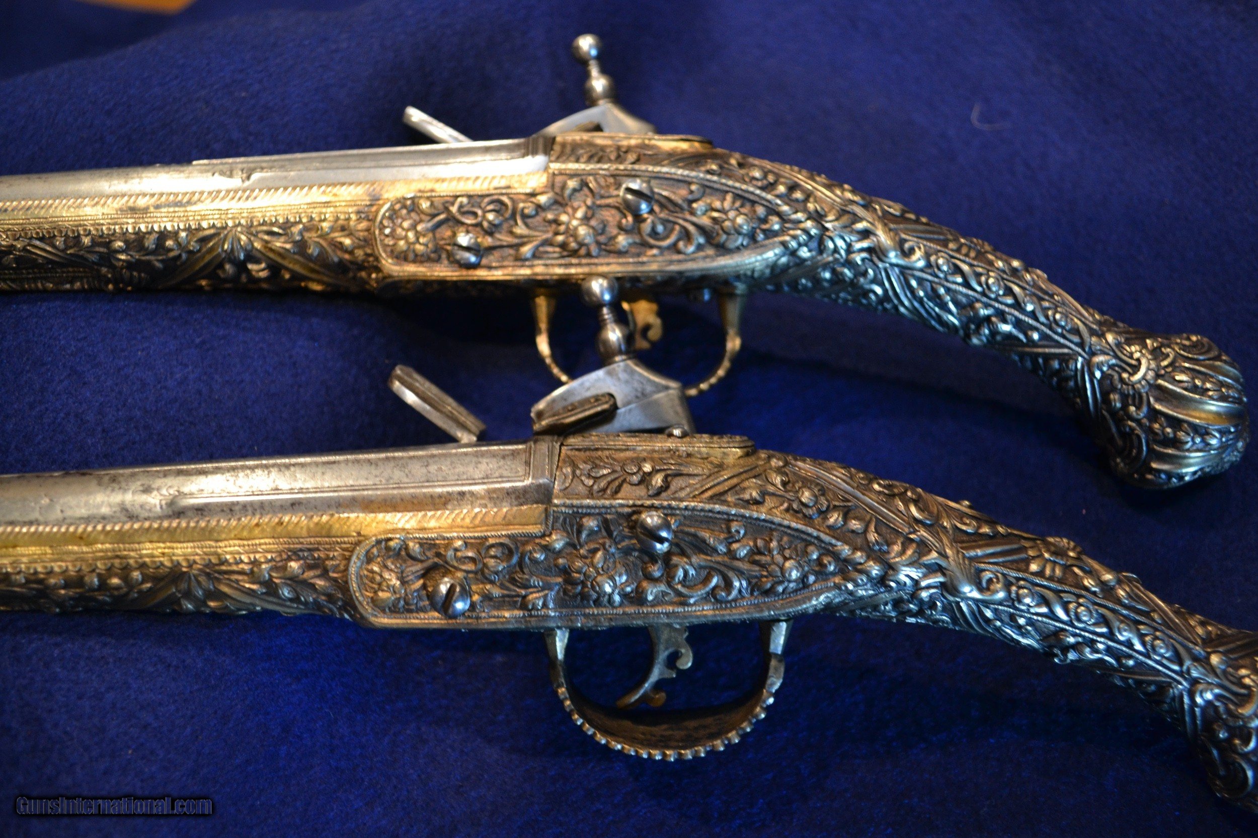 Description: Late 18th / ear;ly 19th Century paur of 18-bore Ottoman pistols most likely made in Boka Kattorska. 17 inches overall with 10 inch steel barrels. Very heavy gold gilt silver stocks overlaid on Italian pistols, with false rammers. Barrels are maked "Recalosi Franzini E Febrari." Steel locks with Miquelet ignition signed in Arabic. The stocls are deeply engraved with scrollwork, temndrils and swirls throughout. High relief grotesque masks. Near mint original condition. Rare pair of Sultan - grade pistols. SOLD Curio/Relic: Yes Antique: Yes |