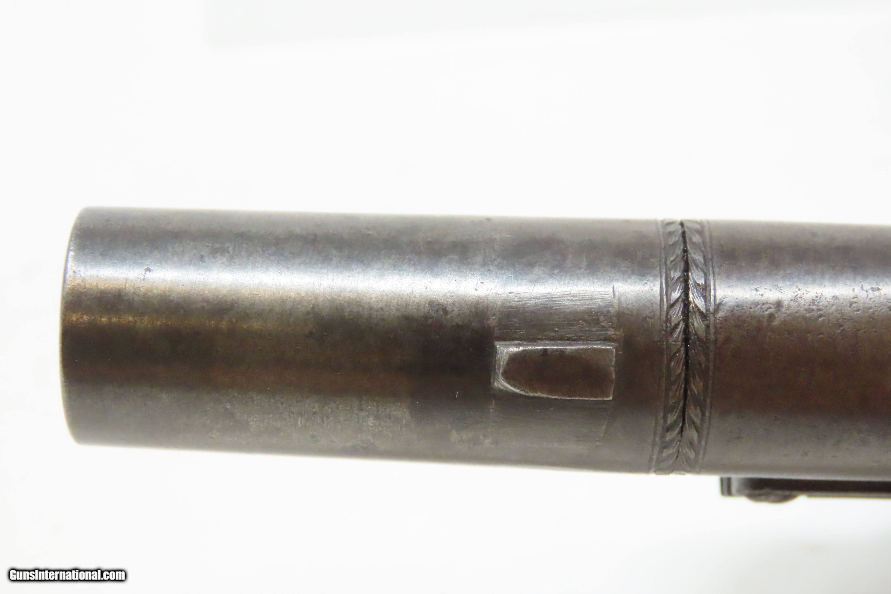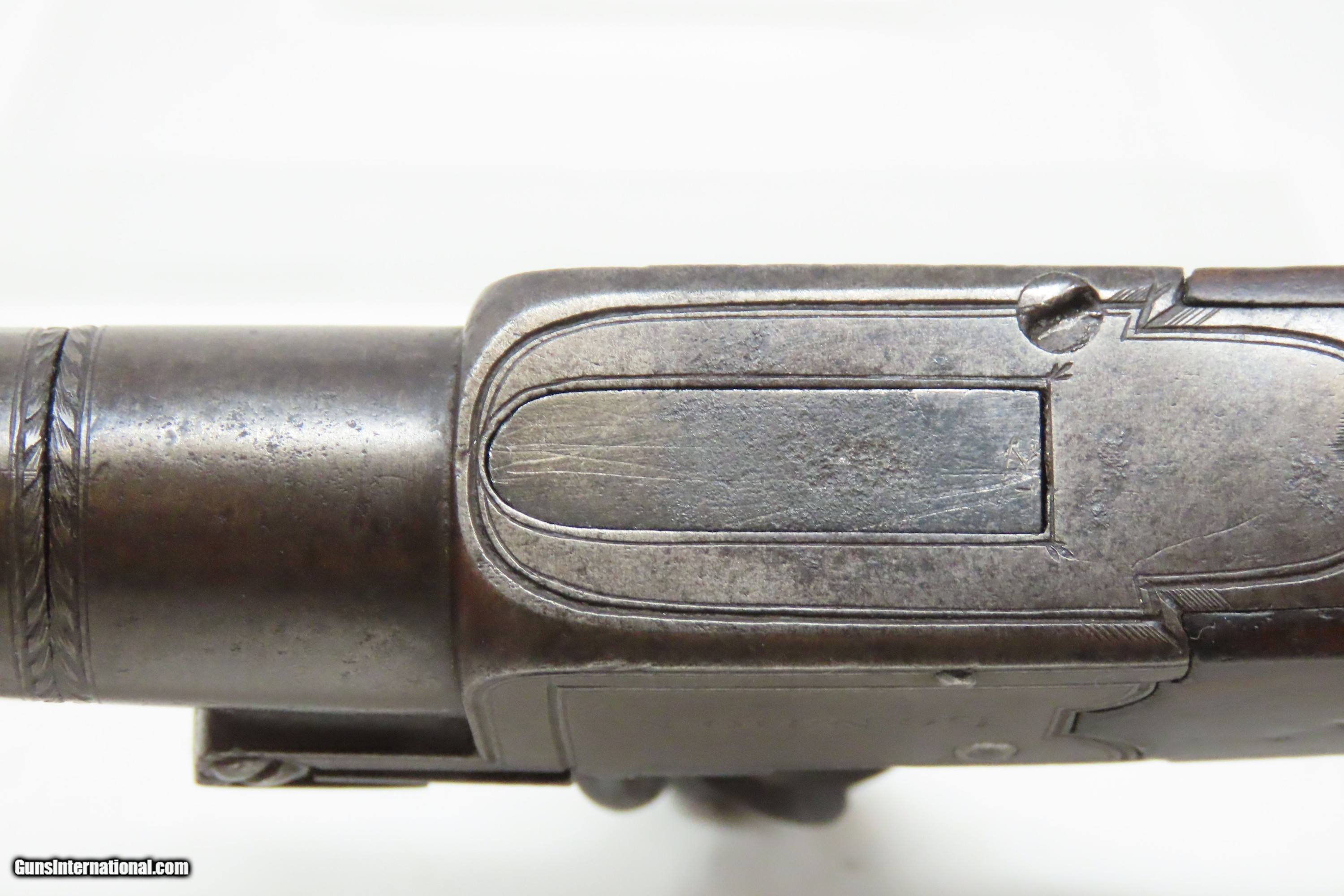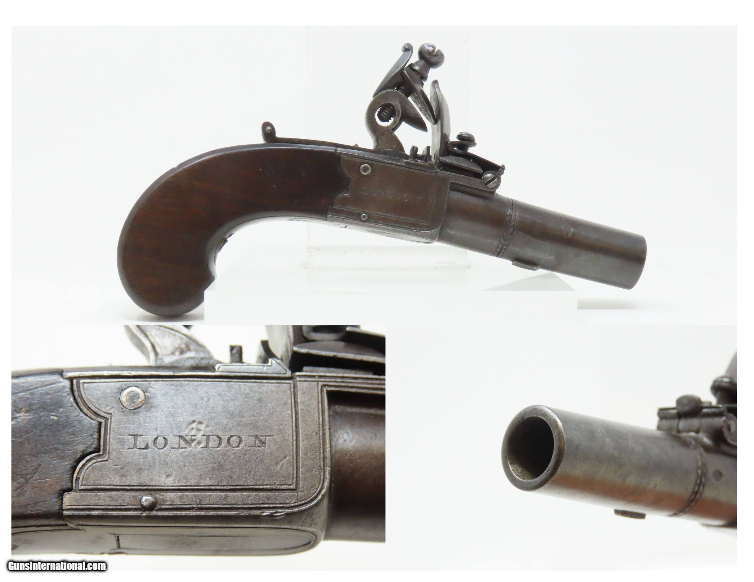 Description: IRISH County WICKLOW Marked Antique H. NOCK Boxlock FLINTLOCK Pocket Pistol With the IRISH REGISTRATION MARK on Barrel & Grip Here we present an antique H. Nock Boxlock Flintlock Pocket Pistol with Irish County Wicklow Markings, made circa 1800 in London, England. This pistol was manufactured by famed innovative gunmaker Henry Nock. Henry Nock was a British inventor and engineer of the early Napoleonic period, best known as a gunmaker. Nock produced many innovative weapons including the screwless lock and the seven-barreled volley gun, although he did not invent the latter despite it commonly being known as the Nock gun. He was a major supplier to the military during the early Napoleonic wars. His high quality dueling pistols and double-barreled shotguns were much sought after, and it is largely through Nock that the latter became the weapon of choice for hunters. As well as supplying the military and civilian markets, Nock made expensive pieces for the aristocracy and royalty and was an appointed gunmaker to the king. Nock's business eventually became Wilkinson Sword, a company which today makes razor blades and other shaving equipment and, until 2005, made officer's swords for the British Army. This little self-defense pistol would have been most at home in the pocket of anyone in the busy cities of London, Paris and Liege during the early 1800s. These style pistols are small, light and simple. The “Pocket Pistol” name says it all. They were the “Saturday Night Specials” of the 18th-19th century. Before the Deringer, they were “Gentleman's” or “Muff Pistols”, typically, a smaller pistol that was easily concealed. They were favored among the gentry and women because of these traits. Men would carry them concealed in a waistcoat pocket and women would hide them in a hand muff. The overall condition is very good. Patina throughout. This one has a registry number on top of the barrel. The action is excellent. The bore is smooth and in good condition. The barrel does turn off, as intended. The grip is solid. London proofed. Own the original! This is a legitimate antique and not a reproduction. Barrel is 1-3/4 inches. Caliber: .50 Flintlock Overall condition as seen in photos. Very Fast. Very Safe. FREE SHIPPING WORLDWIDE. Delivered directly to your door by express mail! Guaranteed AUTHENTIC & Includes CERTIFICATE OF AUTHENTICITY. ancestryguns $1600 #244140 SOLD Antique: Yes |