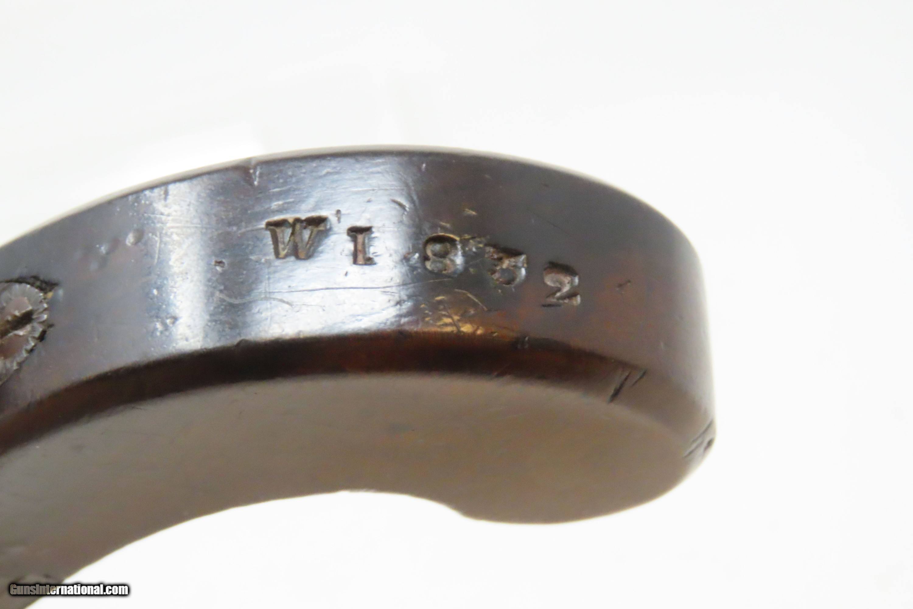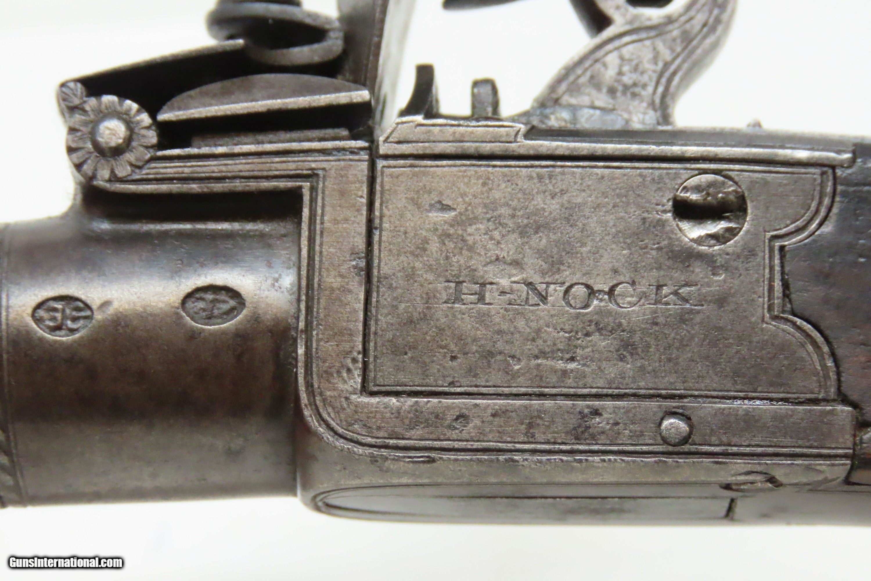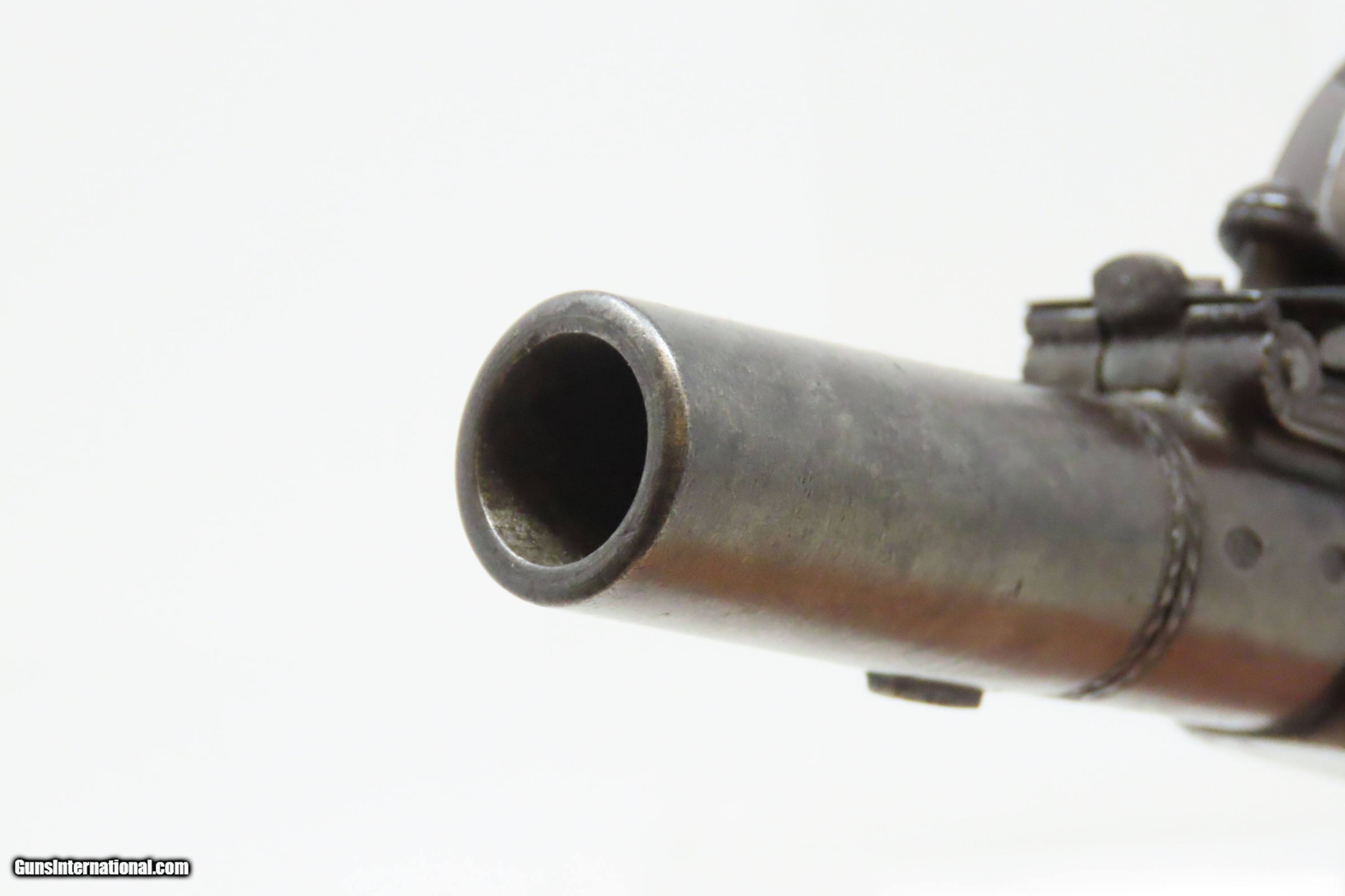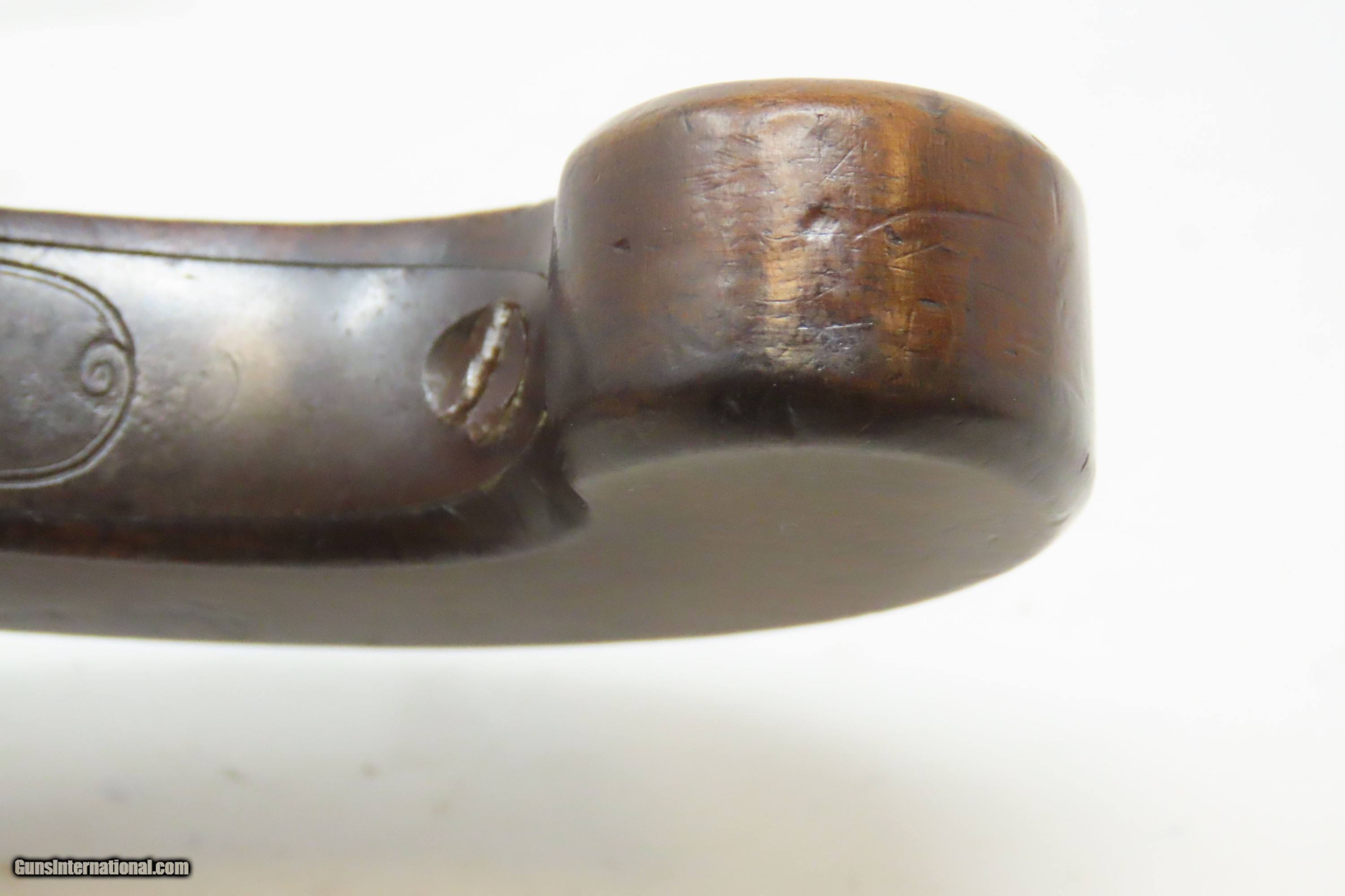 Description: IRISH County WICKLOW Marked Antique H. NOCK Boxlock FLINTLOCK Pocket Pistol With the IRISH REGISTRATION MARK on Barrel & Grip Here we present an antique H. Nock Boxlock Flintlock Pocket Pistol with Irish County Wicklow Markings, made circa 1800 in London, England. This pistol was manufactured by famed innovative gunmaker Henry Nock. Henry Nock was a British inventor and engineer of the early Napoleonic period, best known as a gunmaker. Nock produced many innovative weapons including the screwless lock and the seven-barreled volley gun, although he did not invent the latter despite it commonly being known as the Nock gun. He was a major supplier to the military during the early Napoleonic wars. His high quality dueling pistols and double-barreled shotguns were much sought after, and it is largely through Nock that the latter became the weapon of choice for hunters. As well as supplying the military and civilian markets, Nock made expensive pieces for the aristocracy and royalty and was an appointed gunmaker to the king. Nock's business eventually became Wilkinson Sword, a company which today makes razor blades and other shaving equipment and, until 2005, made officer's swords for the British Army. This little self-defense pistol would have been most at home in the pocket of anyone in the busy cities of London, Paris and Liege during the early 1800s. These style pistols are small, light and simple. The “Pocket Pistol” name says it all. They were the “Saturday Night Specials” of the 18th-19th century. Before the Deringer, they were “Gentleman's” or “Muff Pistols”, typically, a smaller pistol that was easily concealed. They were favored among the gentry and women because of these traits. Men would carry them concealed in a waistcoat pocket and women would hide them in a hand muff. The overall condition is very good. Patina throughout. This one has a registry number on top of the barrel. The action is excellent. The bore is smooth and in good condition. The barrel does turn off, as intended. The grip is solid. London proofed. Own the original! This is a legitimate antique and not a reproduction. Barrel is 1-3/4 inches. Caliber: .50 Flintlock Overall condition as seen in photos. Very Fast. Very Safe. FREE SHIPPING WORLDWIDE. Delivered directly to your door by express mail! Guaranteed AUTHENTIC & Includes CERTIFICATE OF AUTHENTICITY. ancestryguns $1600 #244140 SOLD Antique: Yes |