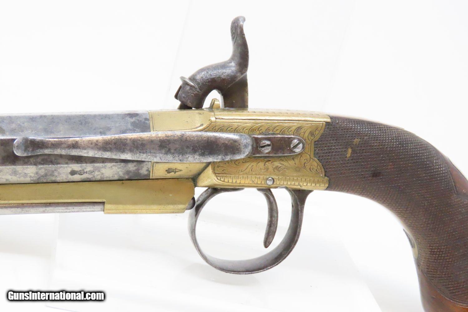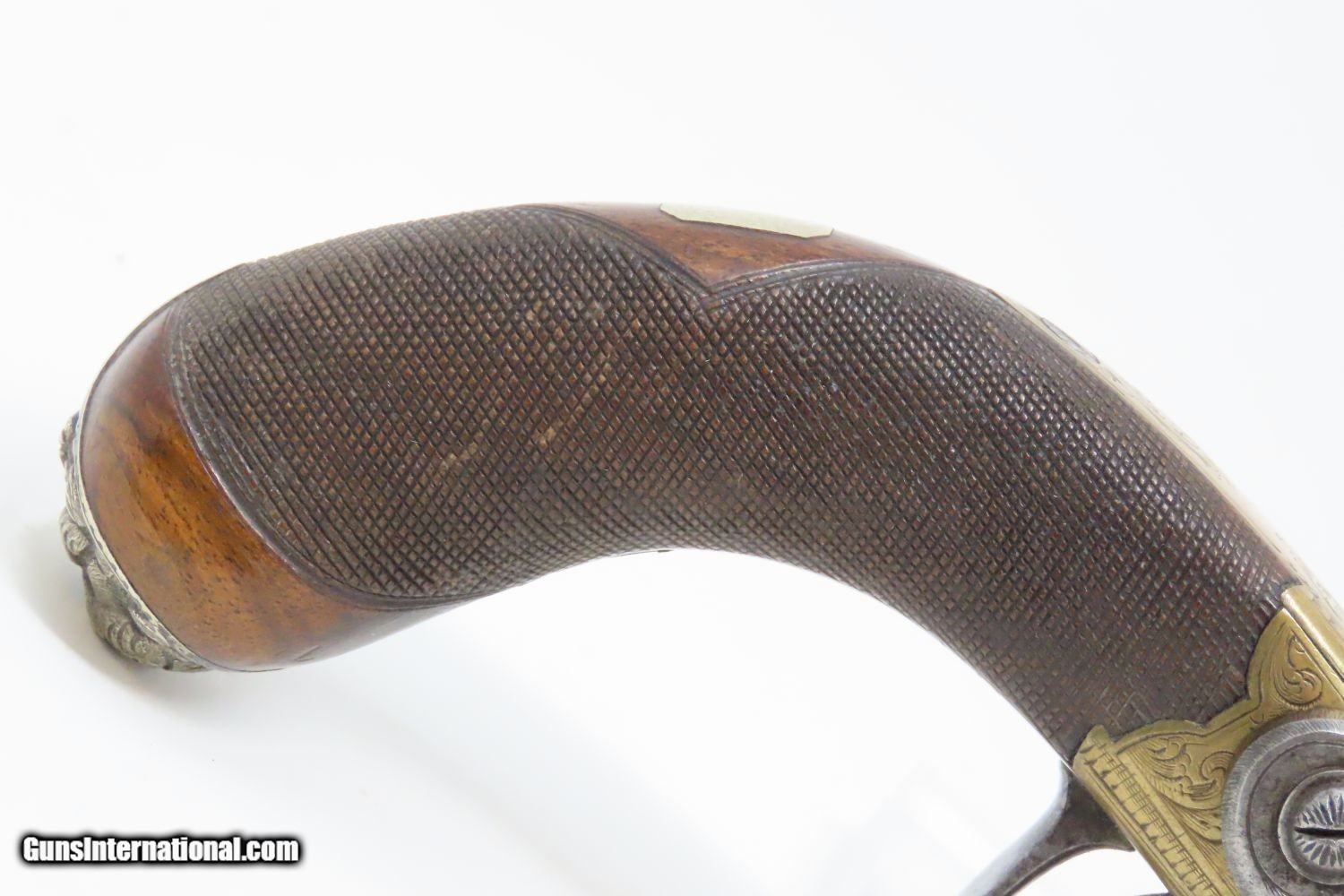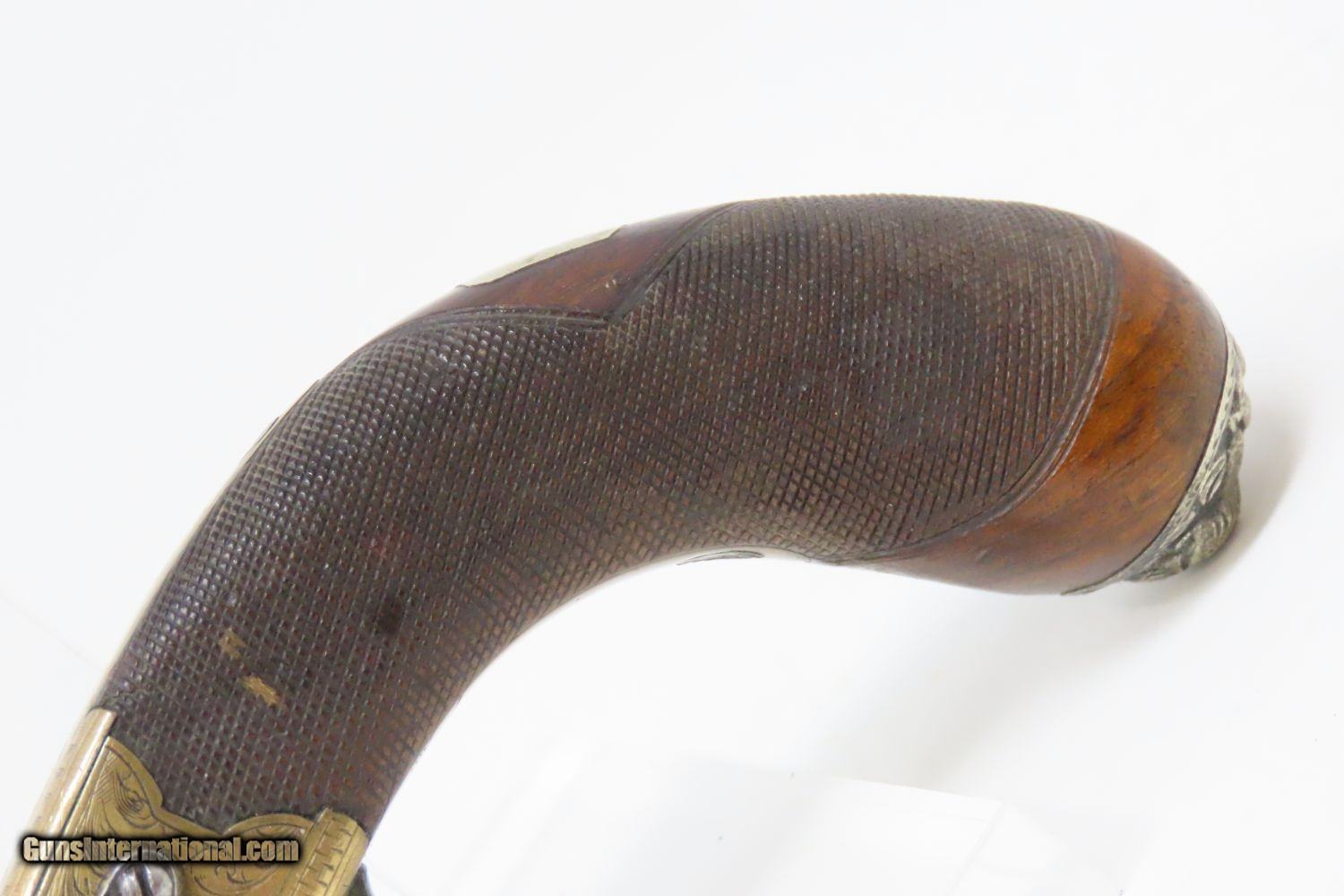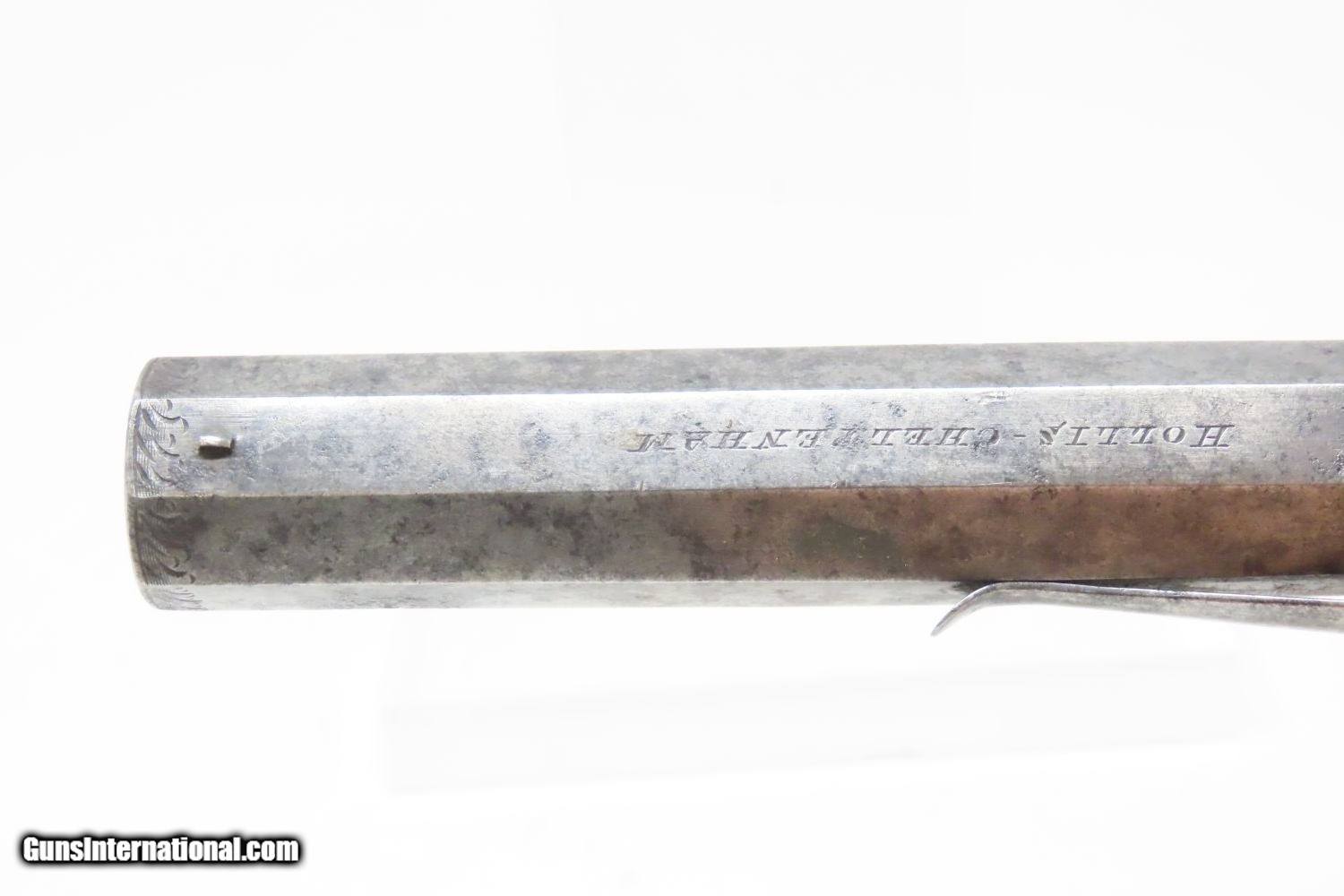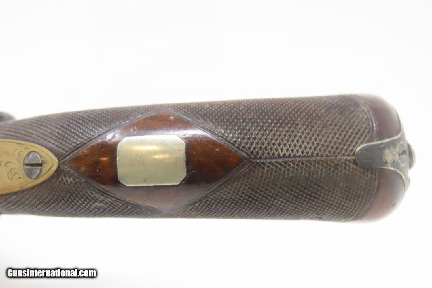 Description: LION POMMEL Belt Pistol by WILLIAM HOLLIS of CHELTENHAM England .54 Caliber c1840s ENGLISH Sidearm Antique Here we present an antique William Hollis Sidehammer Percussion Pistol, made circa the 1840s-50s in Cheltenham, England. William Hollis had a gun shop on the High Street in Cheltenham between 1829 and 1856. This little self-defense pistol would have been most at home in the waistband or pocket of anyone in the busy cities of London or Paris during the tumultuous 1800s. This pistol is small, light and simple in function. It is certainly a large step up regarding aesthetic. It features a distinctive lion’s face cast & engraved pommel, fine engraving on the brass frame and the hammer, and a captive ramrod—always a nice feature to prevent loss of a vital component. There is a belt hook mounted to the left side. The barrel is octagonal and .54 caliber. Hints of silver finish remain on the pommel cap. The barrel is London proofed and marked “HOLLIS-CHELTENHAM” on the top flat. There is a small silver thumb plate atop the hand-checkered grip. The overall condition is very good. Excellent action. The smooth bore is in very good shape. Sharp checkered grip. Here is a handsome pistol that would have gotten the job done with some panache! Own the original! This is a legitimate antique and not a reproduction. Barrel is 4 inches. Caliber: .54 Percussion Overall condition as seen in photos. Very Fast. Very Safe. FREE SHIPPING WORLDWIDE. Delivered directly to your door by express mail! Guaranteed AUTHENTIC & Includes CERTIFICATE OF AUTHENTICITY. ancestryguns $1425 #210180 SOLD Antique: Yes |