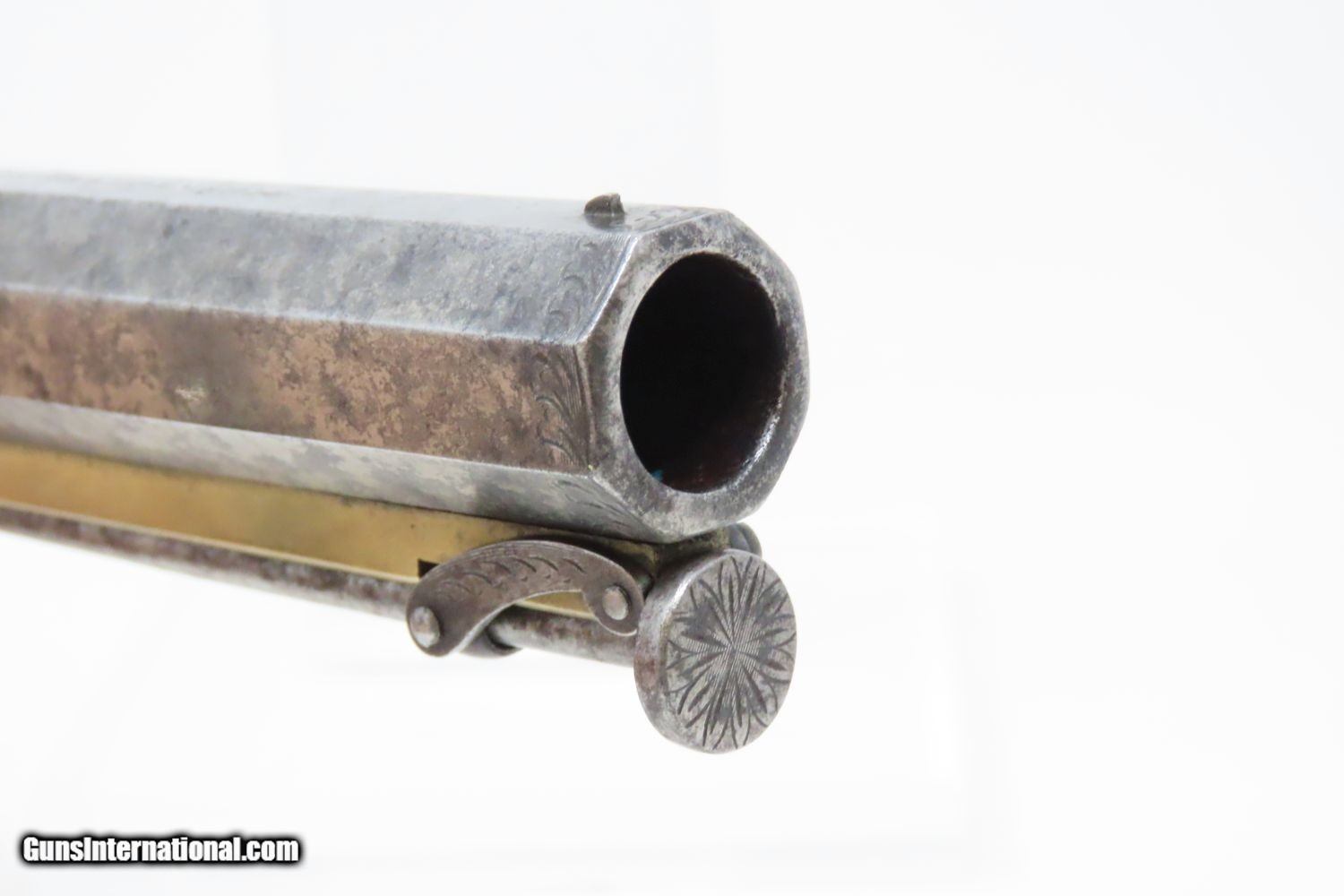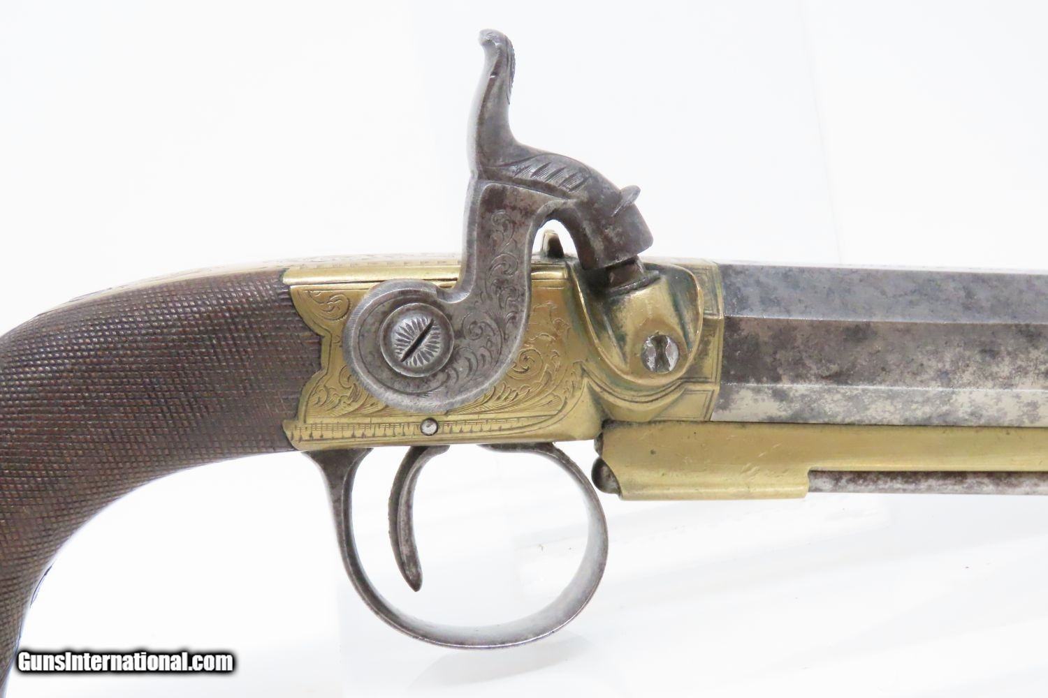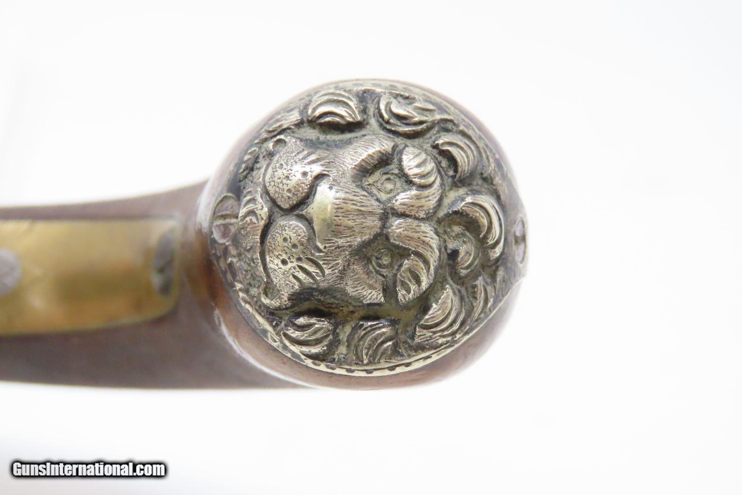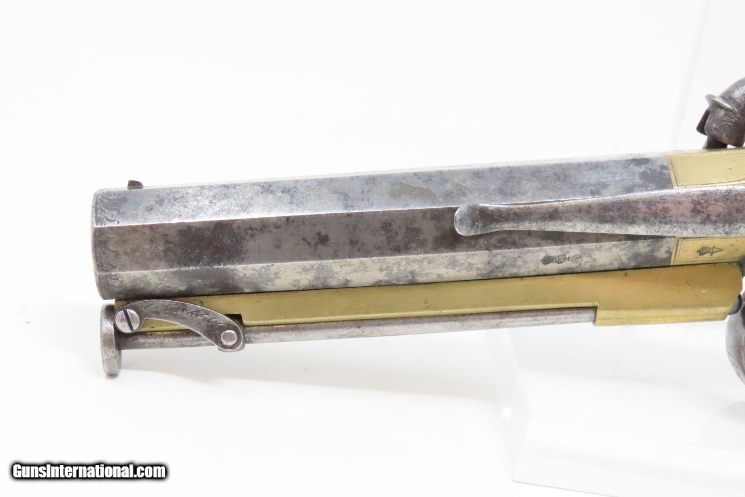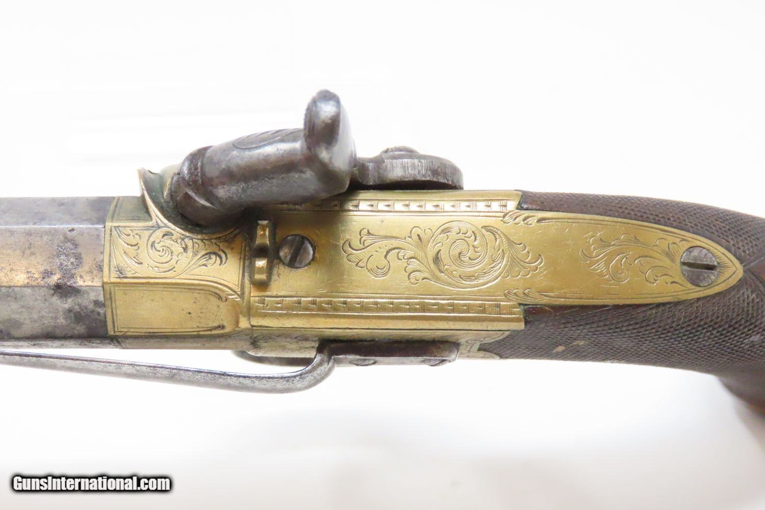Description: LION POMMEL Belt Pistol by WILLIAM HOLLIS of CHELTENHAM England .54 Caliber c1840s ENGLISH Sidearm Antique Here we present an antique William Hollis Sidehammer Percussion Pistol, made circa the 1840s-50s in Cheltenham, England. William Hollis had a gun shop on the High Street in Cheltenham between 1829 and 1856. This little self-defense pistol would have been most at home in the waistband or pocket of anyone in the busy cities of London or Paris during the tumultuous 1800s. This pistol is small, light and simple in function. It is certainly a large step up regarding aesthetic. It features a distinctive lion’s face cast & engraved pommel, fine engraving on the brass frame and the hammer, and a captive ramrod—always a nice feature to prevent loss of a vital component. There is a belt hook mounted to the left side. The barrel is octagonal and .54 caliber. Hints of silver finish remain on the pommel cap. The barrel is London proofed and marked “HOLLIS-CHELTENHAM” on the top flat. There is a small silver thumb plate atop the hand-checkered grip. The overall condition is very good. Excellent action. The smooth bore is in very good shape. Sharp checkered grip. Here is a handsome pistol that would have gotten the job done with some panache! Own the original! This is a legitimate antique and not a reproduction. Barrel is 4 inches. Caliber: .54 Percussion Overall condition as seen in photos. Very Fast. Very Safe. FREE SHIPPING WORLDWIDE. Delivered directly to your door by express mail! Guaranteed AUTHENTIC & Includes CERTIFICATE OF AUTHENTICITY. ancestryguns $1425 #210180 SOLD Antique: Yes |