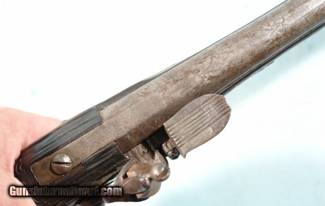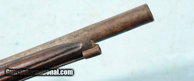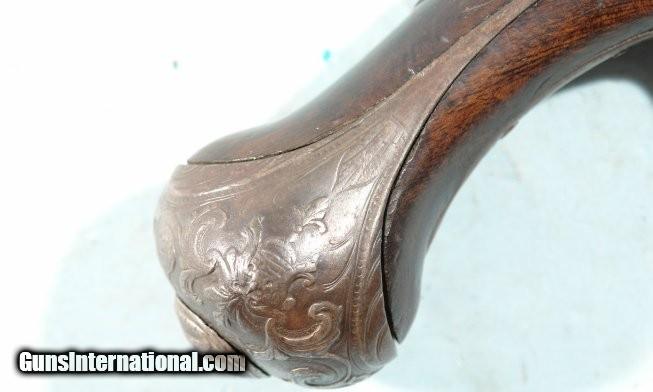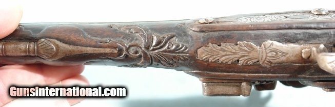 Description: OTTOMAN EMPIRE KABUR FLINTLOCK CHIEFTAN’S PISTOL CIRCA LATE 1700’S. 21” o/a with 14” round .65 cal. smoothbore barrel with relief floral engraving at breech. Relief floral engraved steel mounts and lock. Relief floral carved walnut stock. Nice all original good quality Kabur needing the forend restored. Otherwise untouched with nice original dark patina. Nice large size example. Lock missing main spring. SOLD Antique: Yes |