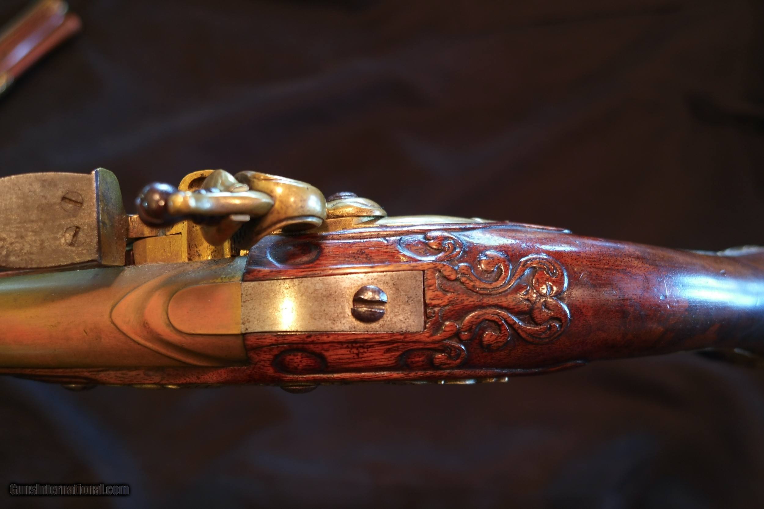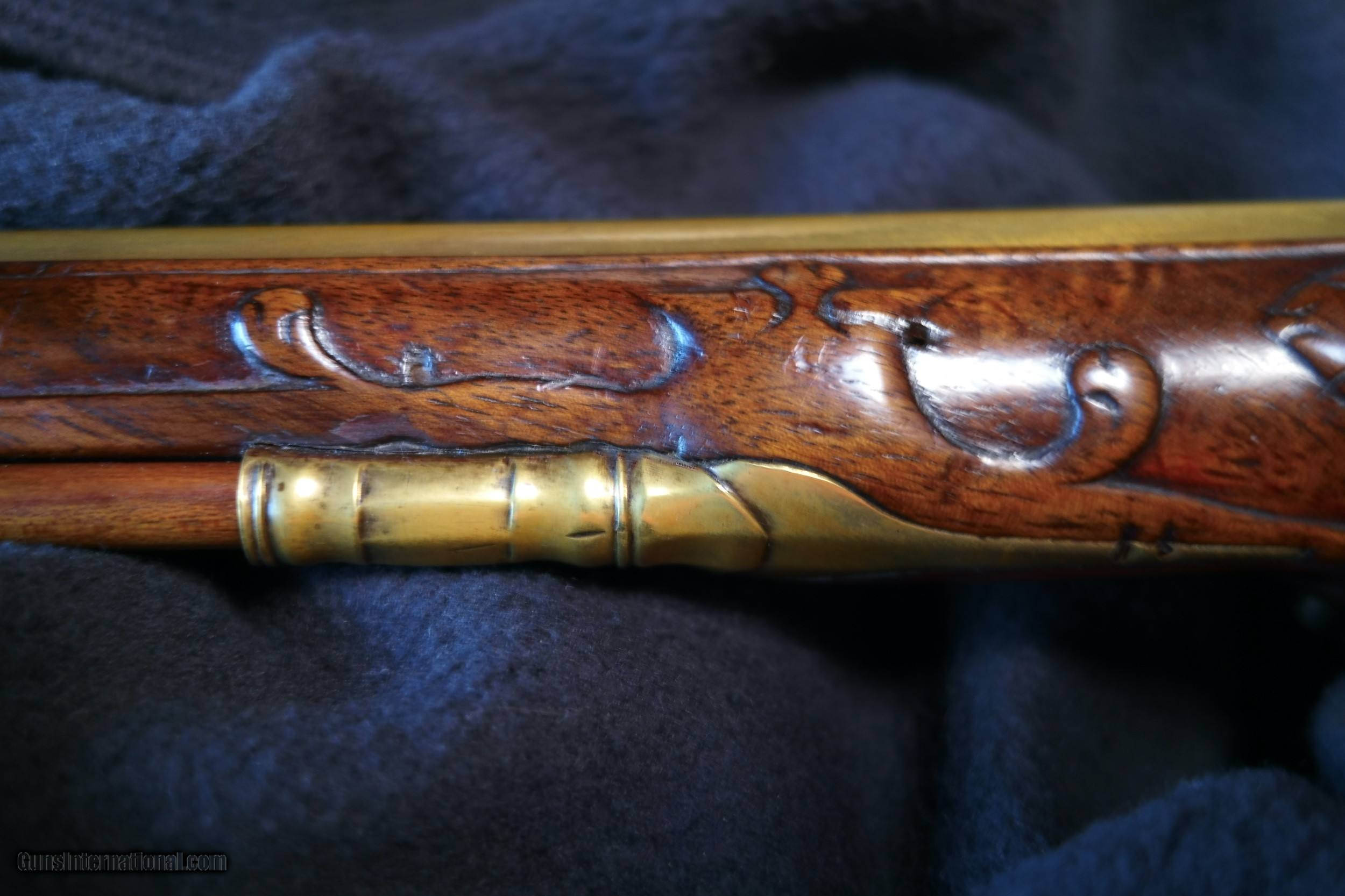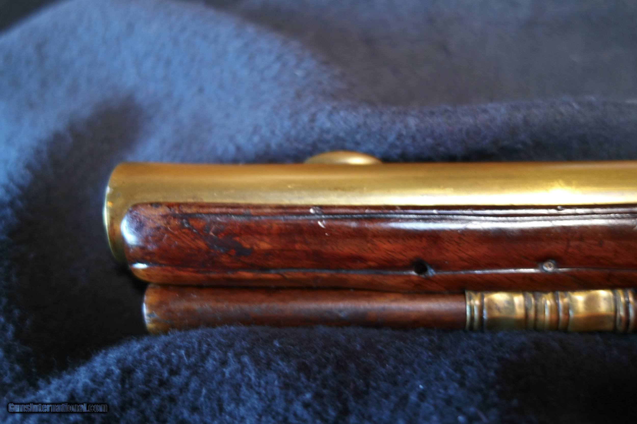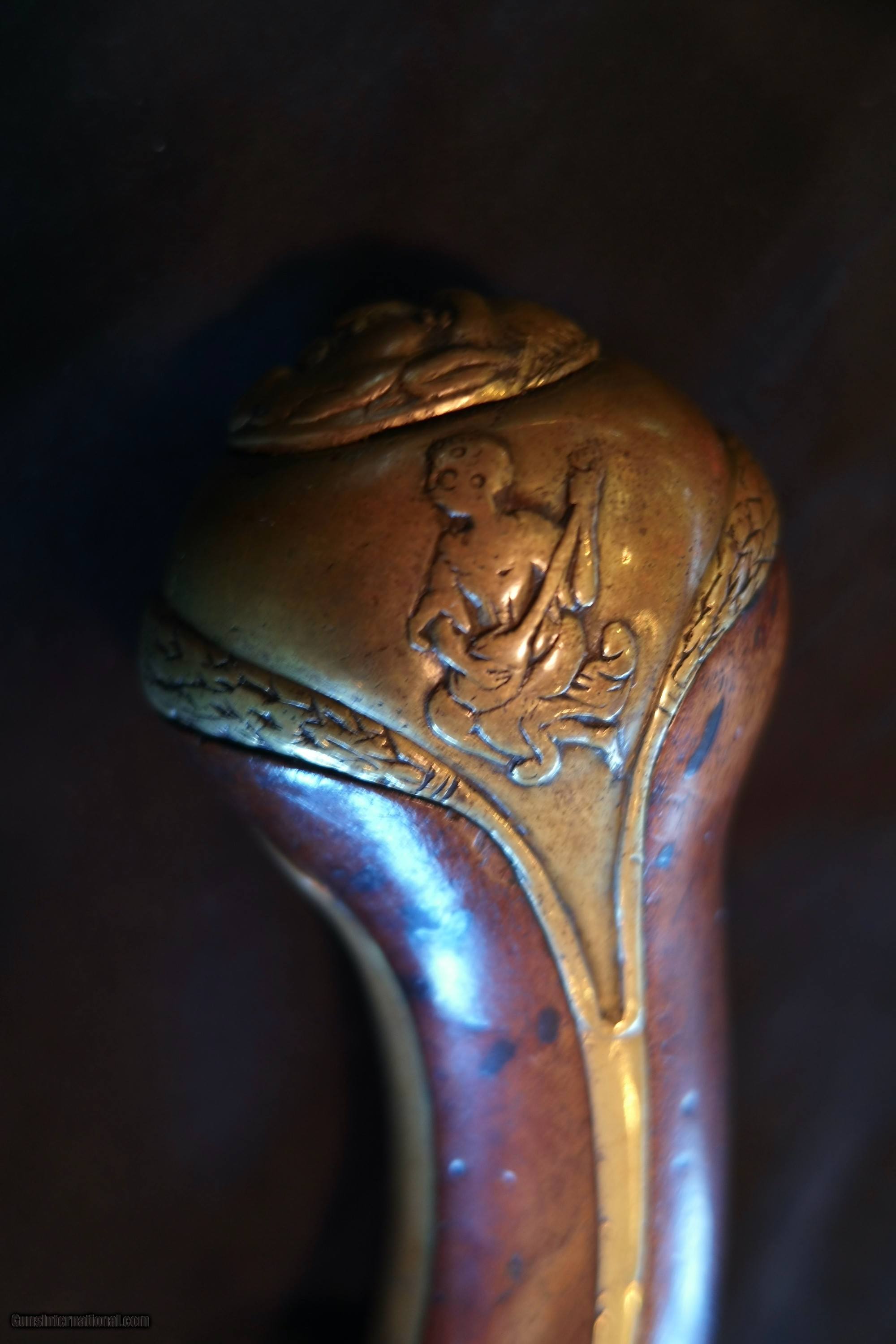 Description: Circa late 17th / early 18th Century pair of exceptionally large and well made smooth-bore holster pistols. Unmarked - most likely Dutch. 21 inches overall with 13 1/2" barrels. All brass locks with very unusual brass frizzens - with steel stike plates. Decorative brass furniture includes fine long-eared butt caps with grotesque masks and very large brass trigger guards. Intricate opend-worked brass side plates, Original? wood ramrods secured with decorated brass throat piece and pipes. SOLD Curio/Relic: Yes Antique: Yes Handgun Caliber: .61 Wood Condition: Excellent - original Bore Condition: clean Barrels: Brass |