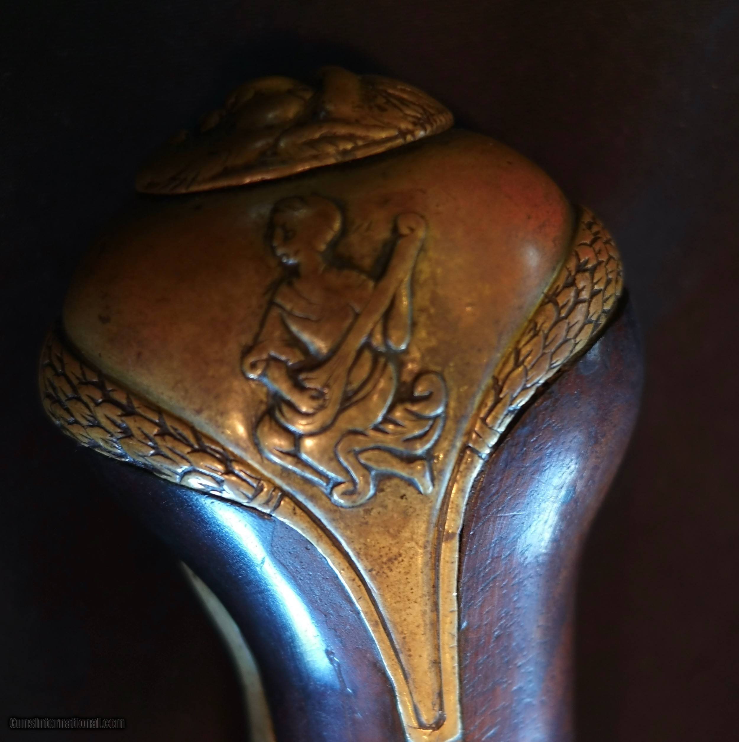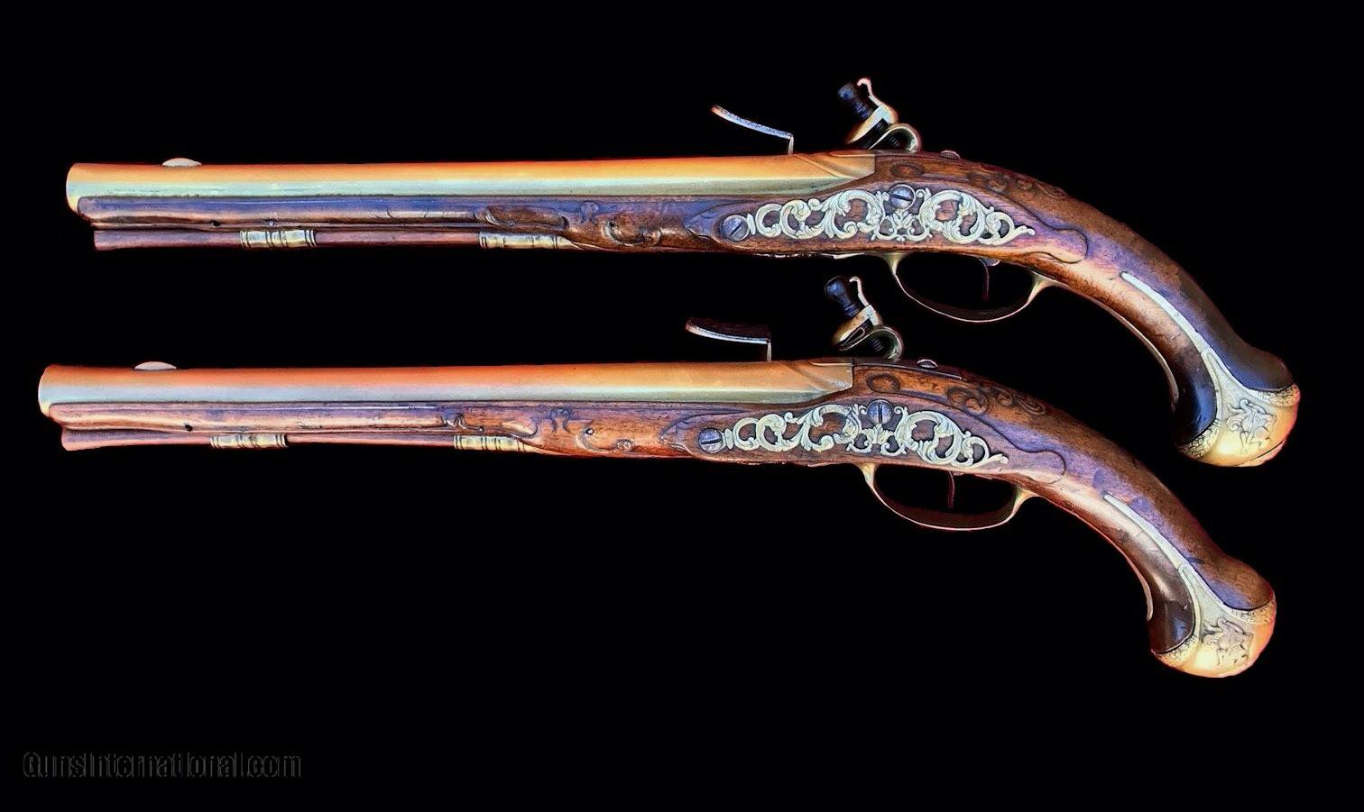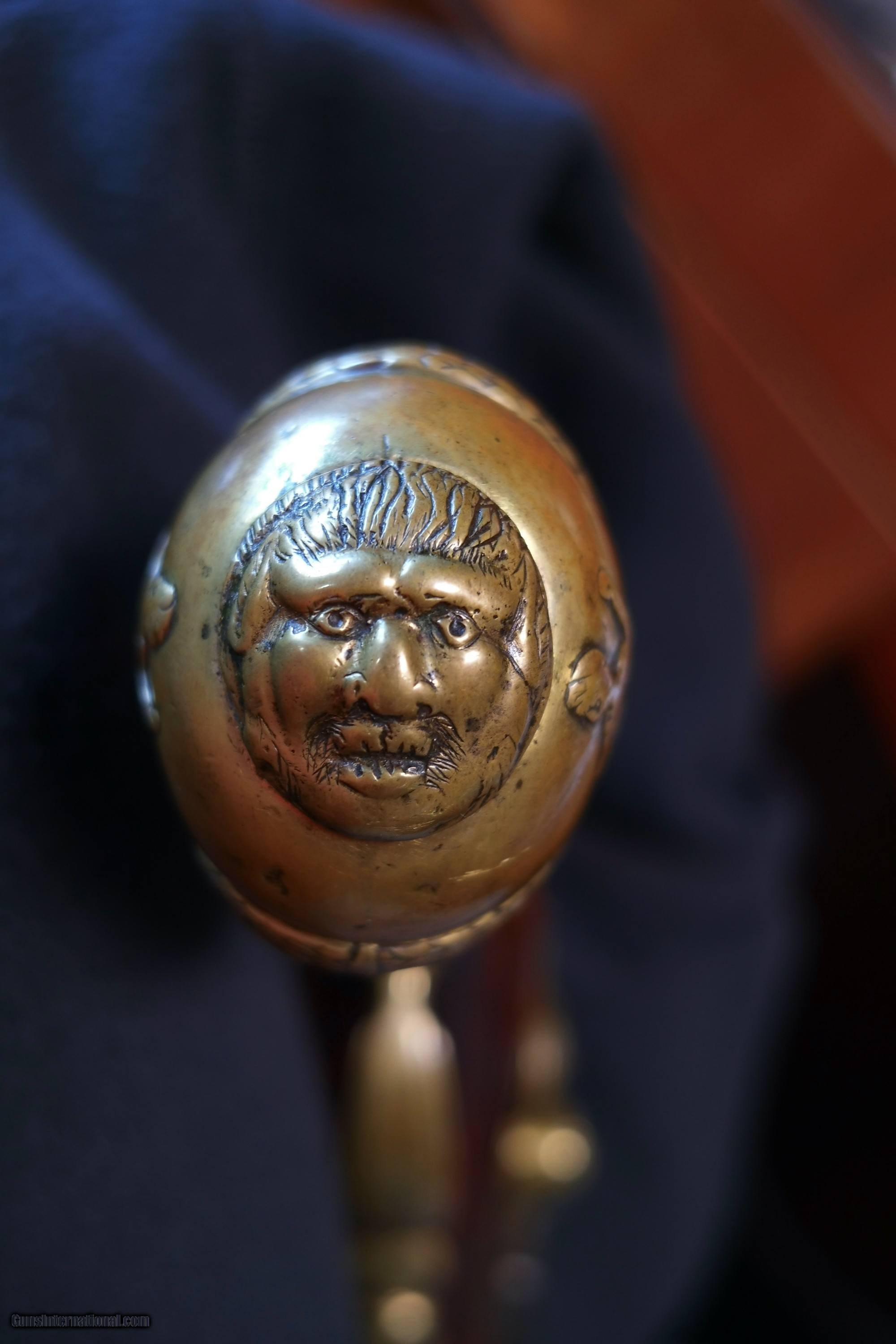 Description: Circa late 17th / early 18th Century pair of exceptionally large and well made smooth-bore holster pistols. Unmarked - most likely Dutch. 21 inches overall with 13 1/2" barrels. All brass locks with very unusual brass frizzens - with steel stike plates. Decorative brass furniture includes fine long-eared butt caps with grotesque masks and very large brass trigger guards. Intricate opend-worked brass side plates, Original? wood ramrods secured with decorated brass throat piece and pipes. SOLD Curio/Relic: Yes Antique: Yes Handgun Caliber: .61 Wood Condition: Excellent - original Bore Condition: clean Barrels: Brass |