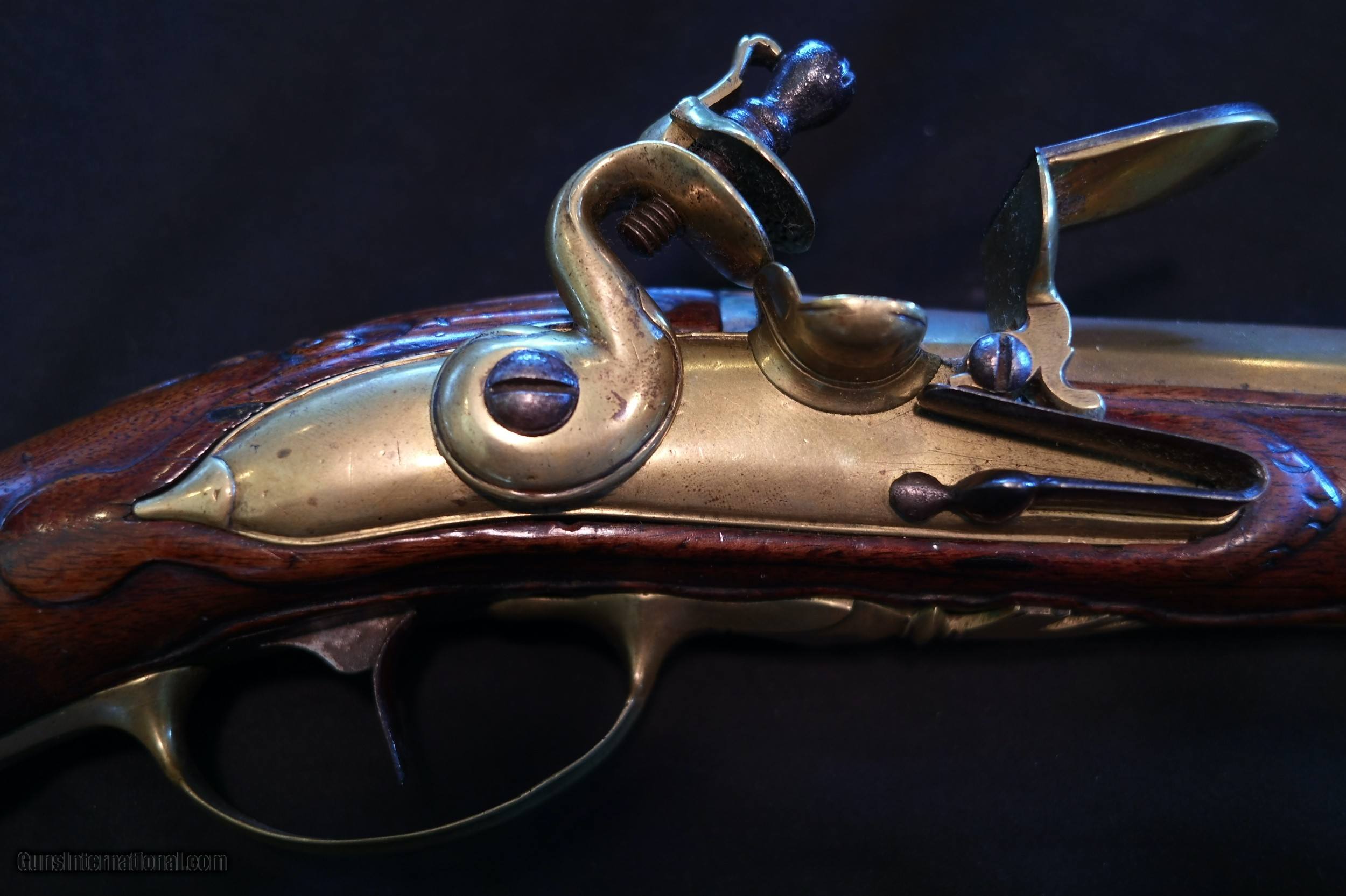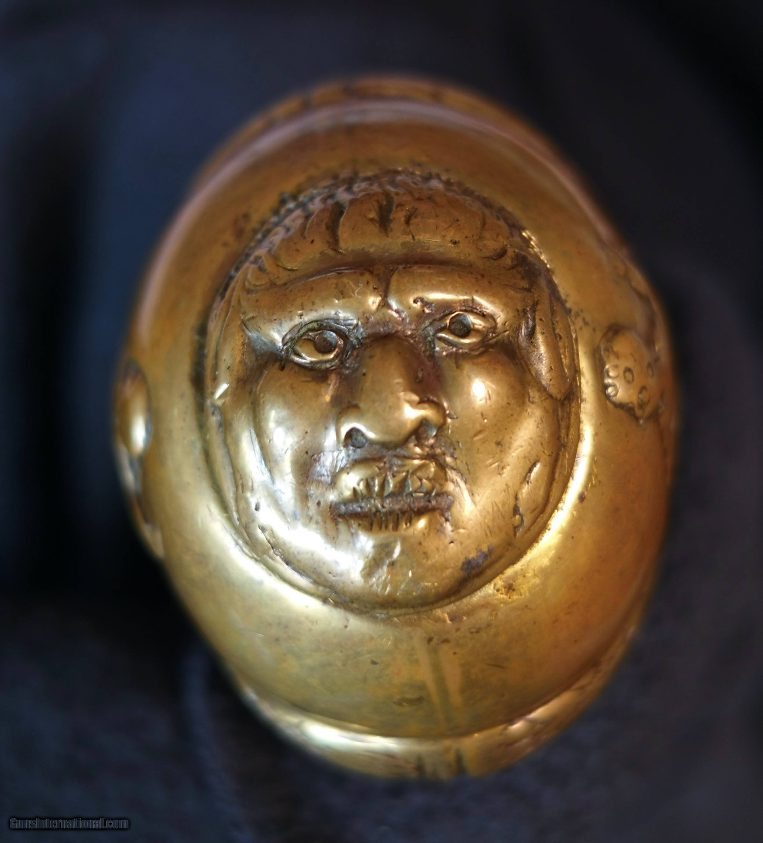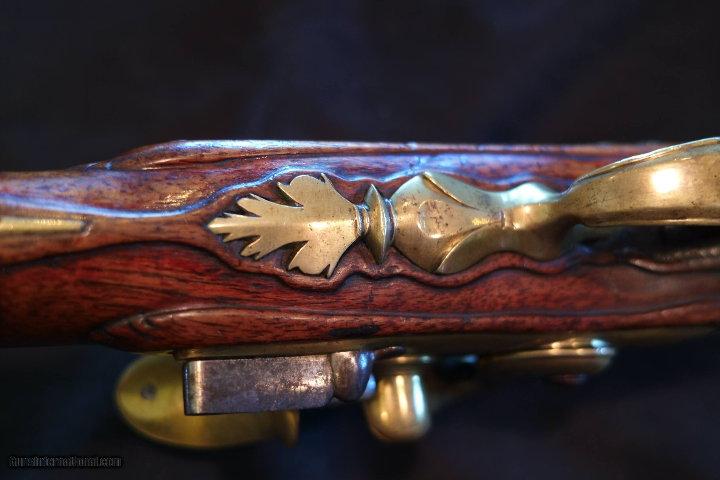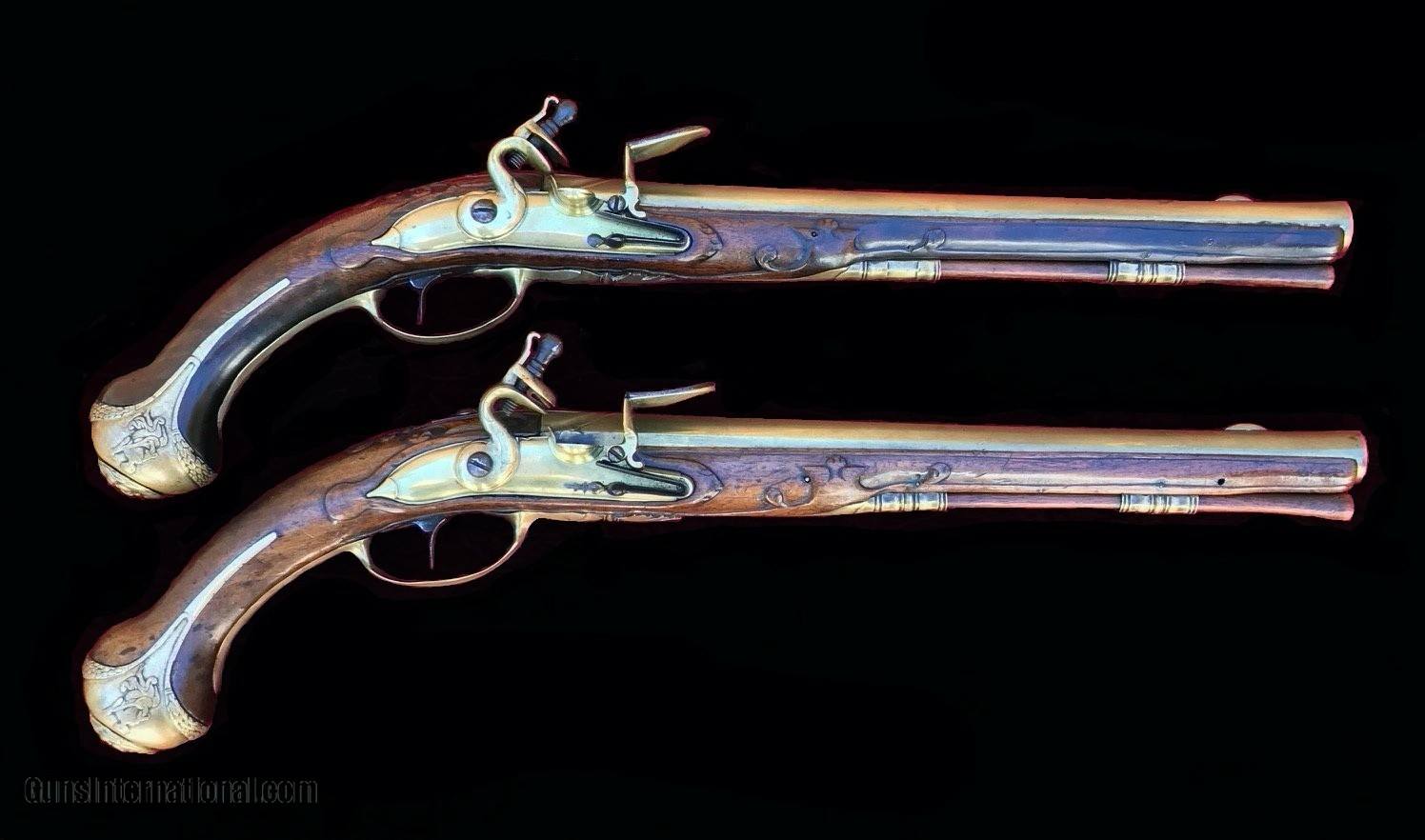 Description: Circa late 17th / early 18th Century pair of exceptionally large and well made smooth-bore holster pistols. Unmarked - most likely Dutch. 21 inches overall with 13 1/2" barrels. All brass locks with very unusual brass frizzens - with steel stike plates. Decorative brass furniture includes fine long-eared butt caps with grotesque masks and very large brass trigger guards. Intricate opend-worked brass side plates, Original? wood ramrods secured with decorated brass throat piece and pipes. SOLD Curio/Relic: Yes Antique: Yes Handgun Caliber: .61 Wood Condition: Excellent - original Bore Condition: clean Barrels: Brass |