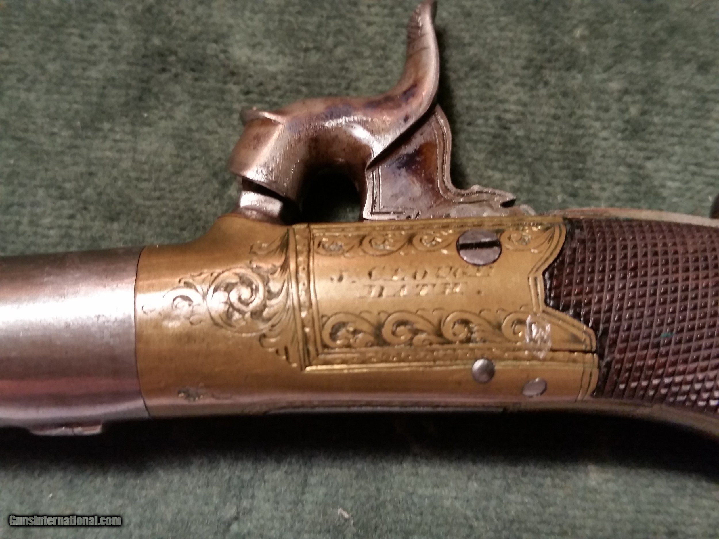 Description: PRICE DROP...This is a beautiful pair of pistols in a newer case, nicely engraved in excellent condition. These were made prior to 1846 in Bath. Here is a portion of the John Clough History. THOMAS CLOUGH, Practical Gun-maker, Fishing Rod, and Tackle Manufacturer. In succeeding the above old-established business, desires to ensure the country gentlemen and sportsmen of West Norfolk and district that all orders with which he may be favored will receive his personal attention and be executed with the utmost care and promptitude, and he trusts that by supplying goods of the best quality and workmanship he will secure a continuance of the support so long enjoyed by the late Mr. Potter. A well-assorted stock of Fishing Rods, Tackle, Cricket and Tennis Goods will be kept, and special attention is given to repairs in this department. The experienced Foreman for many years in the employ of the late Mr. Potter will remain with Mr. Clough.’ Born in about 1830 in Bath, Thomas was the eldest son of John and Martha Clough. John had been born in Liverpool in about 1799 and Martha (b. c1802) came from Bath. They had four children, all born in Bath:- 1) Catherine Martha (b. c1826 – m. Samuel Hayward in 1849 – d.1899/1900 aged 73). 2) Thomas – see below (b. c1830 m. Helen Dyer in 1864 – d.1895, aged 66). 3) George (b. c1832 – d. 1869/70, aged 38). 4) John Robert (b. c1834 – d. 1880, aged 46). John Clough Senior. had a gun-making business in Southgate Street in Bath, which was listed under just his name in 1846 and as ‘Clough & Son’ in 1852, which would be about when Thomas had finished his apprenticeship and joined his father in the business. Meanwhile, John Robert was also learning the trade, and when their father died in 1860, the two siblings came together as ‘Clough Brothers’ with premises at 9, Bond Street, Bath. The partnership lasted until John Robert died in 1880, aged 46. SOLD Antique: Yes Manufacturer: John Clough Condition: 99% Metal Condition: Excellent Wood Condition: Excellent Bore Condition: bright and shiny |