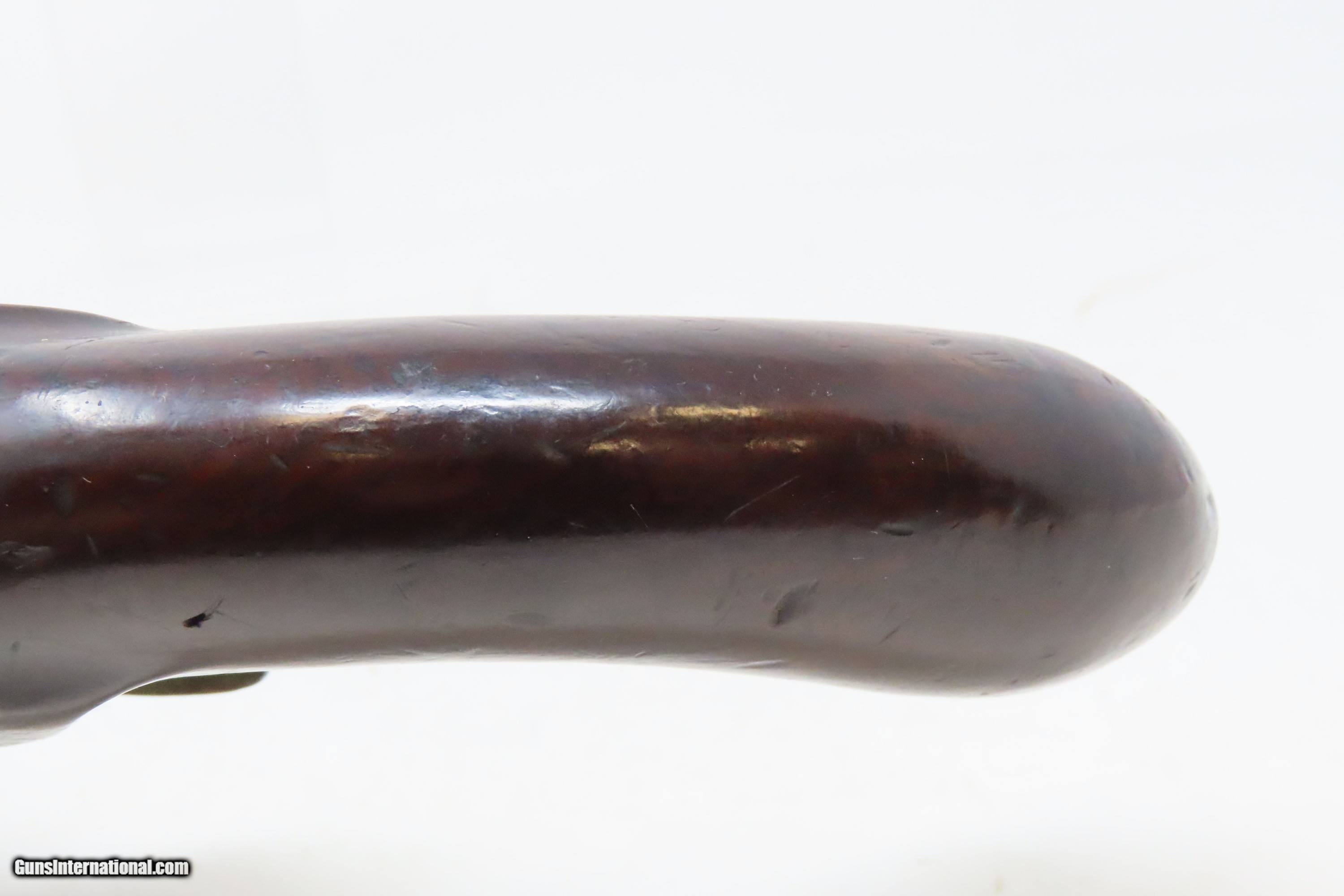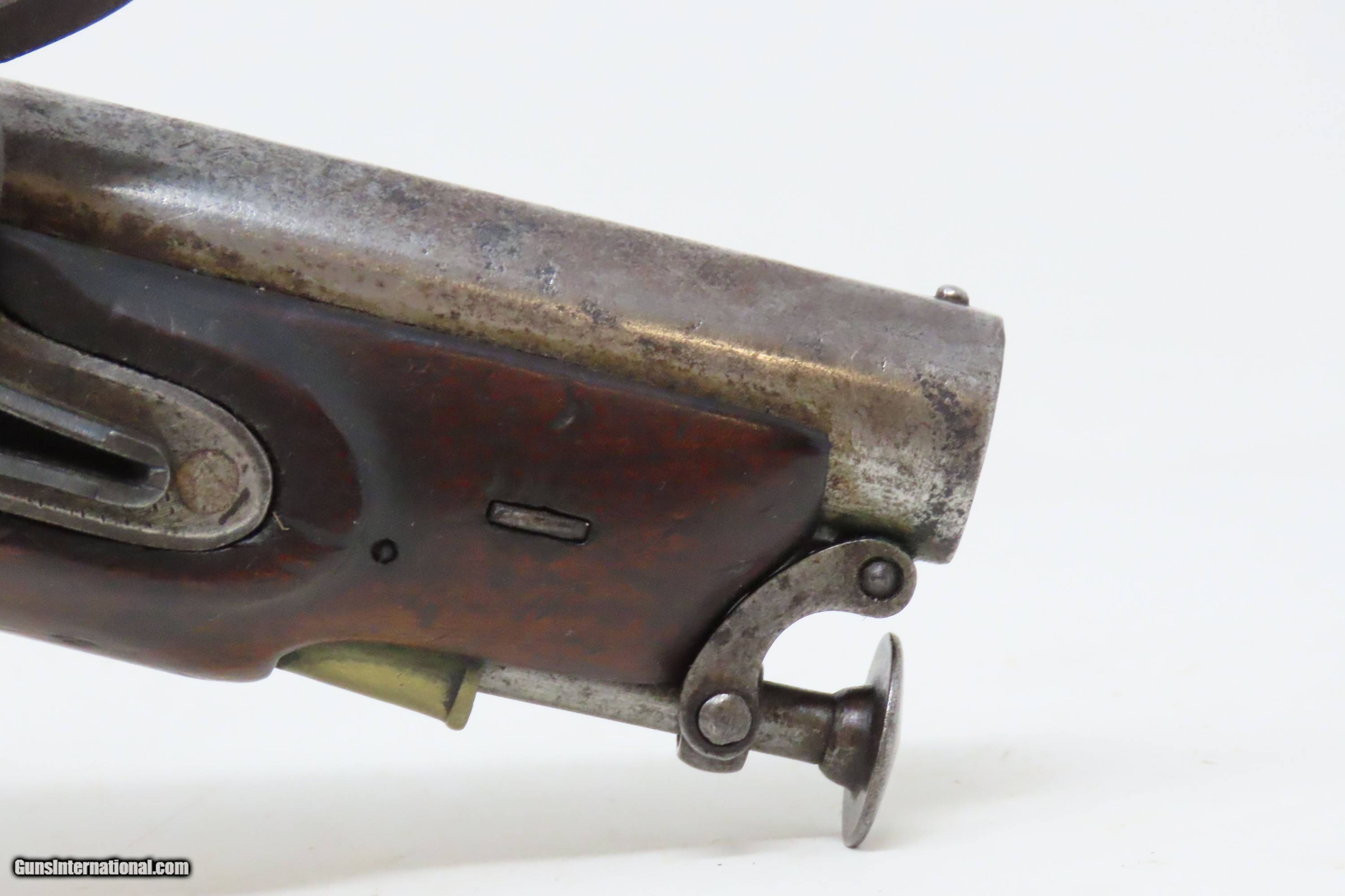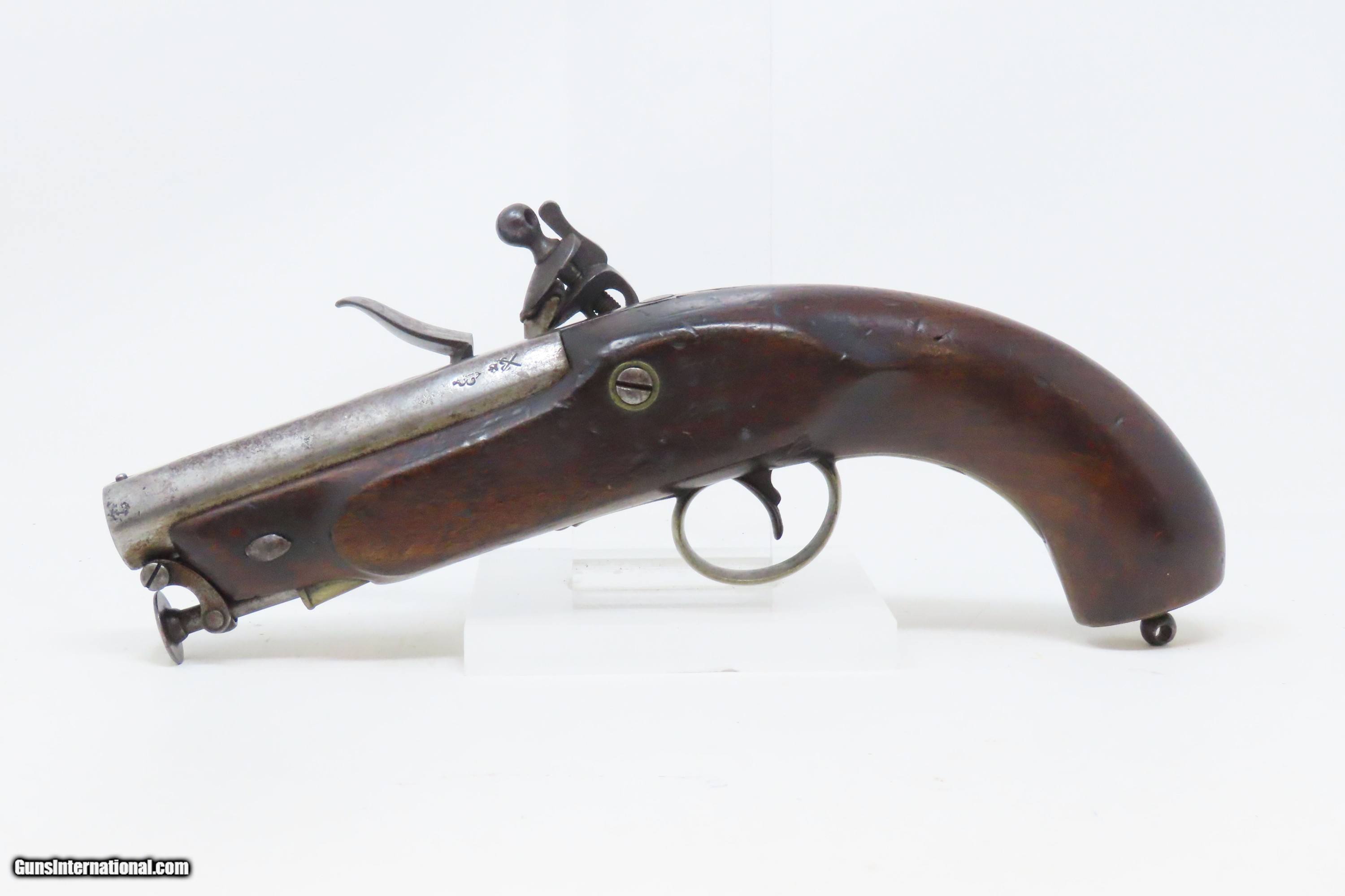 Description: Rare Antique BRITISH TOWER P1831 CUSTOMS/COAST GUARD FLINTLOCK Pistol “GR” Used by the British Coast Guard/Customs Service Here we present a rare antique British Pattern 1831 Tower Marked Flintlock Pistol. This pistol dates to the mid-1830s and was used by the British Coast Guard and Custom’s Services along with much of the Royal Navy. Her Majesty’s Coast Guard was established in 1822 and had the primary responsibility of saving the sailors and property when a shipwreck occurred. The Coast Guard also patrolled the entire UK coastline to prevent smuggling. By the 1850s, smuggling was on the wane, and so the responsibility of protecting the coastline from smugglers was transferred to the Royal Navy, putting the Coast Guard’s primary duty once again to assisting with wrecks and rescue operations. This model saw service during the Crimean War (1853-1856). The rise of the revolver made pistols such as this somewhat outdated, and by the late 1850s, it started to fall out of favor due to the increasing popularity of percussion revolvers, although examples continued to be produced into the early 1870s and were used side by side. The lock bears the royal cipher of (“GR” for Georgius Rex or King George). The overall condition is very good. Patina throughout. The action is excellent. The bore is smooth and in good condition. Stock shows use and remains solid throughout with Board of Ordnance markings. Own the original! This is a legitimate antique and not a reproduction. Barrel is 4-1/2 inches. Caliber: .68 Flintlock Overall condition as seen in photos. Very Fast. Very Safe. FREE SHIPPING WORLDWIDE. Delivered directly to your door by express mail! Guaranteed AUTHENTIC & Includes CERTIFICATE OF AUTHENTICITY. ancestryguns $1800 #234029 SOLD Antique: Yes |