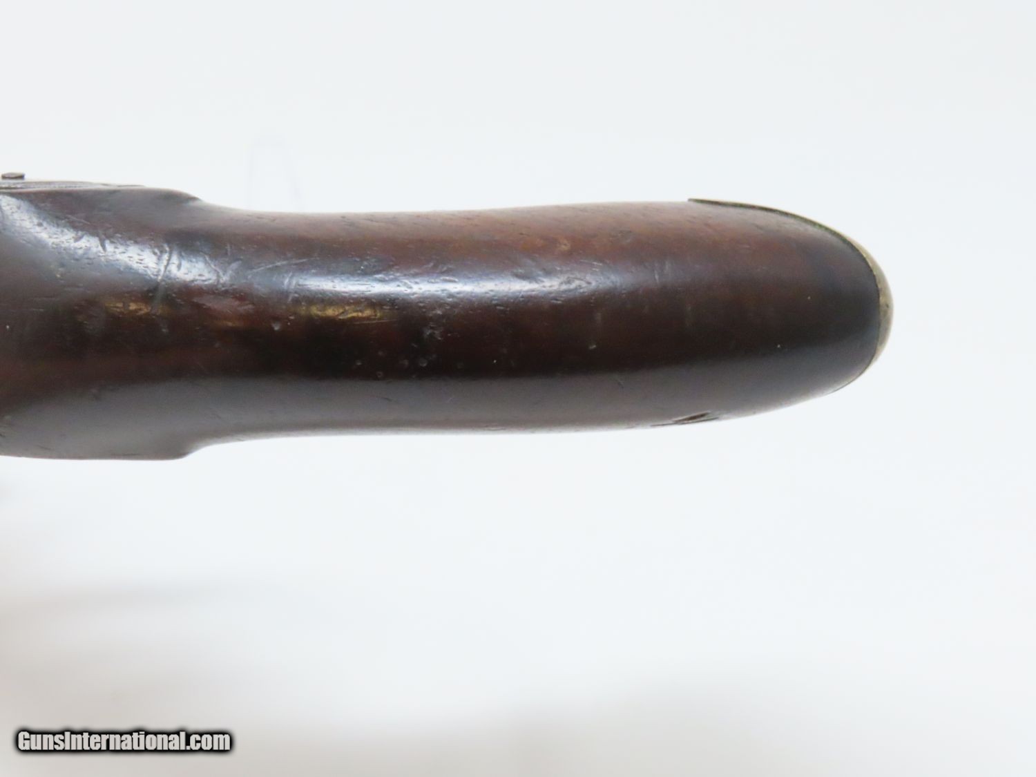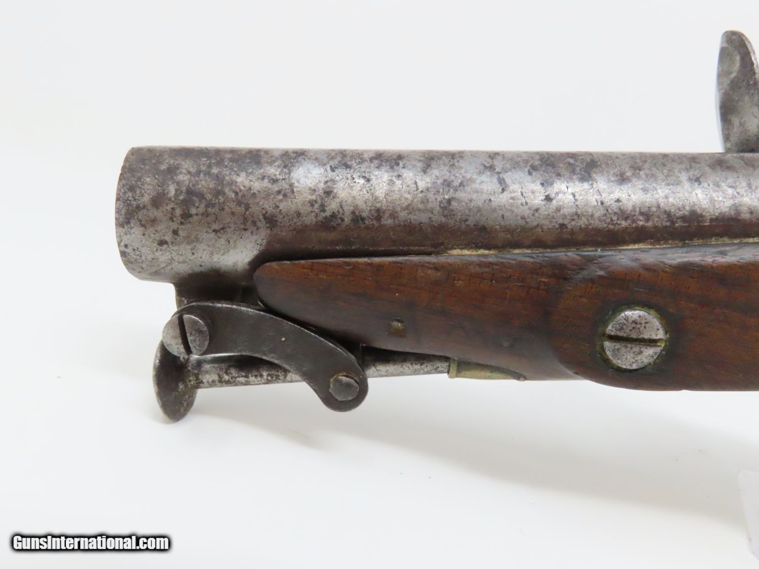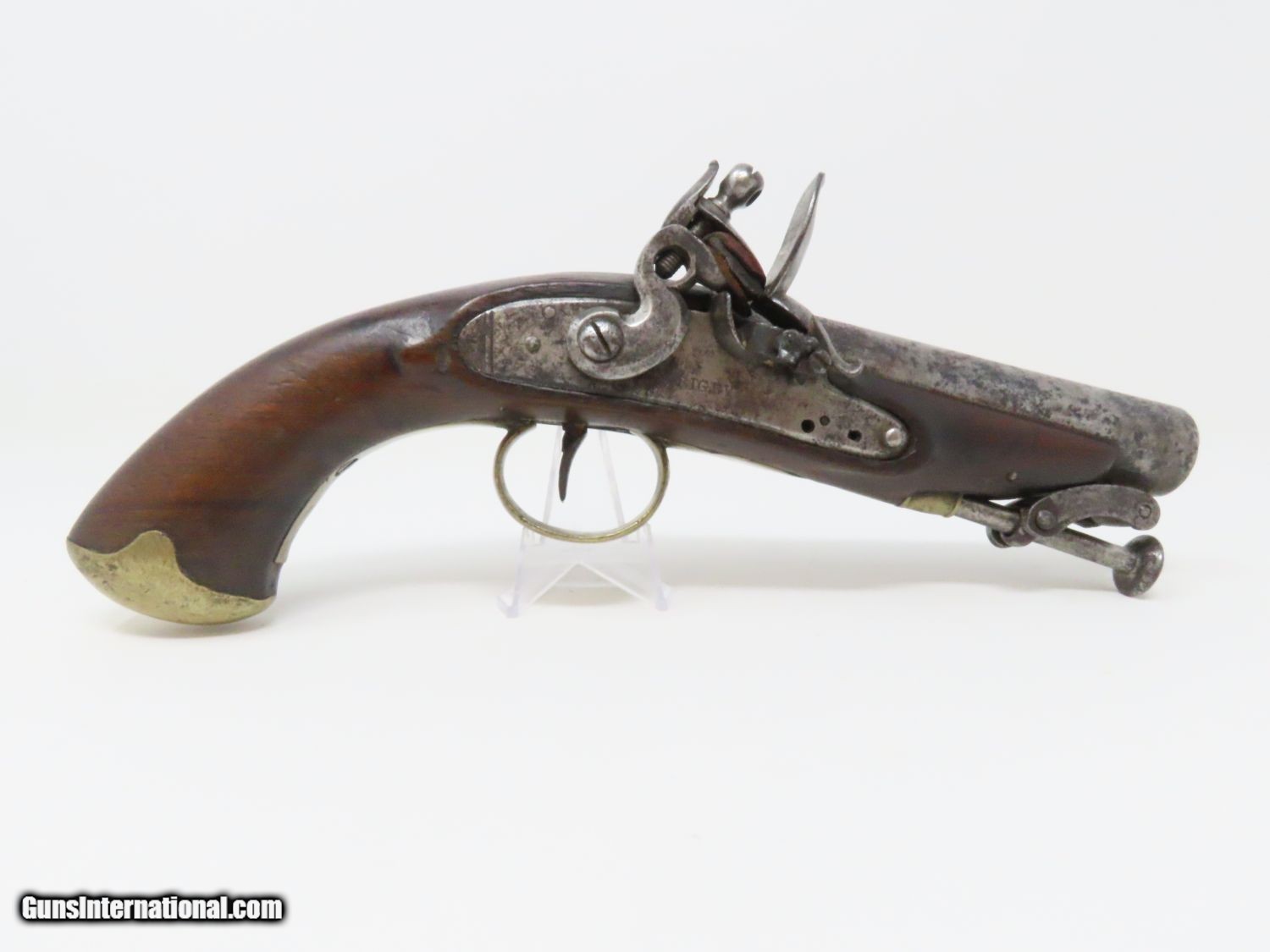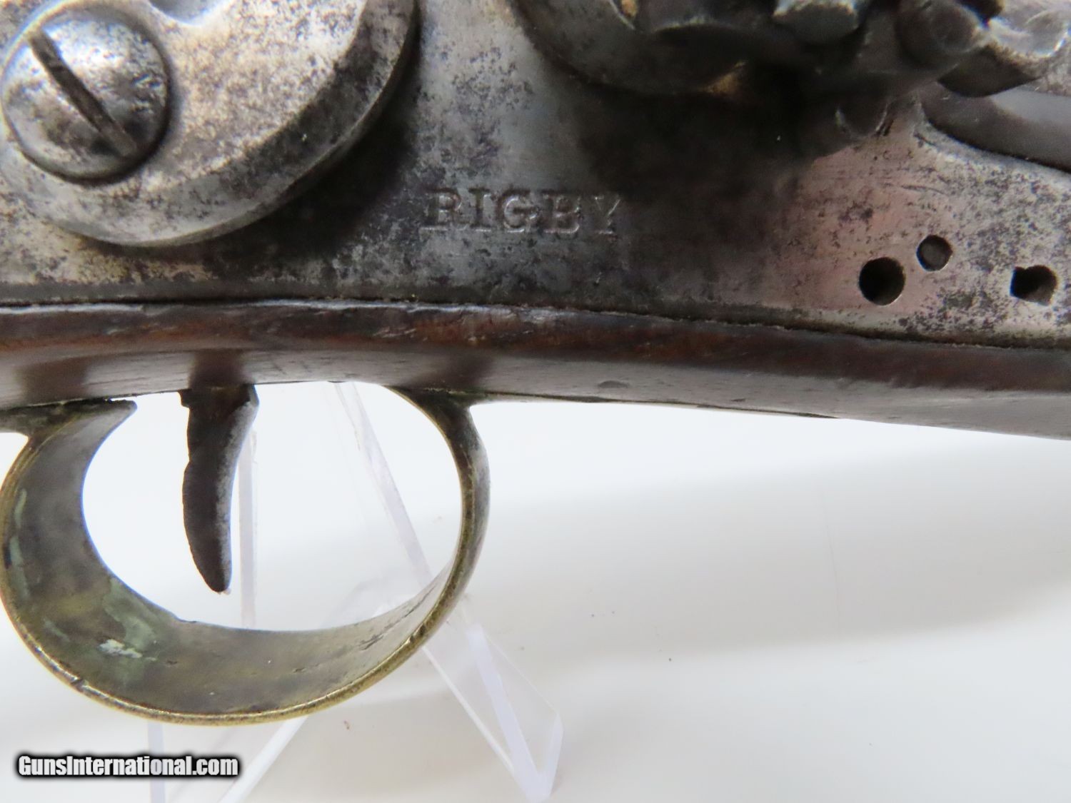 Description: RARE Early 1800s IRISH W. & J. RIGBY Antique “MAN-STOPPER” Flintlock Pistol DUBLIN, IRELAND Made Antique Flintlock Pistol Here we present an antique William and John Rigby Flintlock Pistol, made circa the early-1800s in Dublin, Ireland. This Irish flintlock is a rare example of a pre-serial numbered Rigby pistol of which very few have survived. Serial numbering began in 1821, starting with serial number 5337, making this an early product of the brothers William and John partnership. This example is the constabulary model with a tapering twist 5-inch barrel with a full-length sighting flat. This large bored pistol would have been intended for use as a self-defense firearm. It is a small to medium sized flintlock, being able to fit into a large pocket or more likely in a belt. This pistol has a .67 caliber bore and would have been most at home tucked into a gentleman’s belt when not punching large holes. This also would have been the type of pistol an officer would have purchased on his own to bring to battle in case he was to come into contact with the enemy. The overall condition is good. The action is strong. The frizzen spring is absent and the frizzen hinge is cracked. The bore is smooth and dark. The walnut stock is in good shape and remains solid! “RIGBY” is engraved on the lock. Here is a big bore “Man-Stopper” pistol that will fit into an early 19th century collection quite well! Own the original! This is a legitimate antique and not a reproduction. Barrel is 5 inches. Caliber: .67 Overall condition as seen in photos. Very Fast. Very Safe. FREE SHIPPING WORLDWIDE. Delivered directly to your door by express mail! Guaranteed AUTHENTIC & Includes CERTIFICATE OF AUTHENTICITY. ancestryguns $1395 #20678 SOLD Antique: Yes |