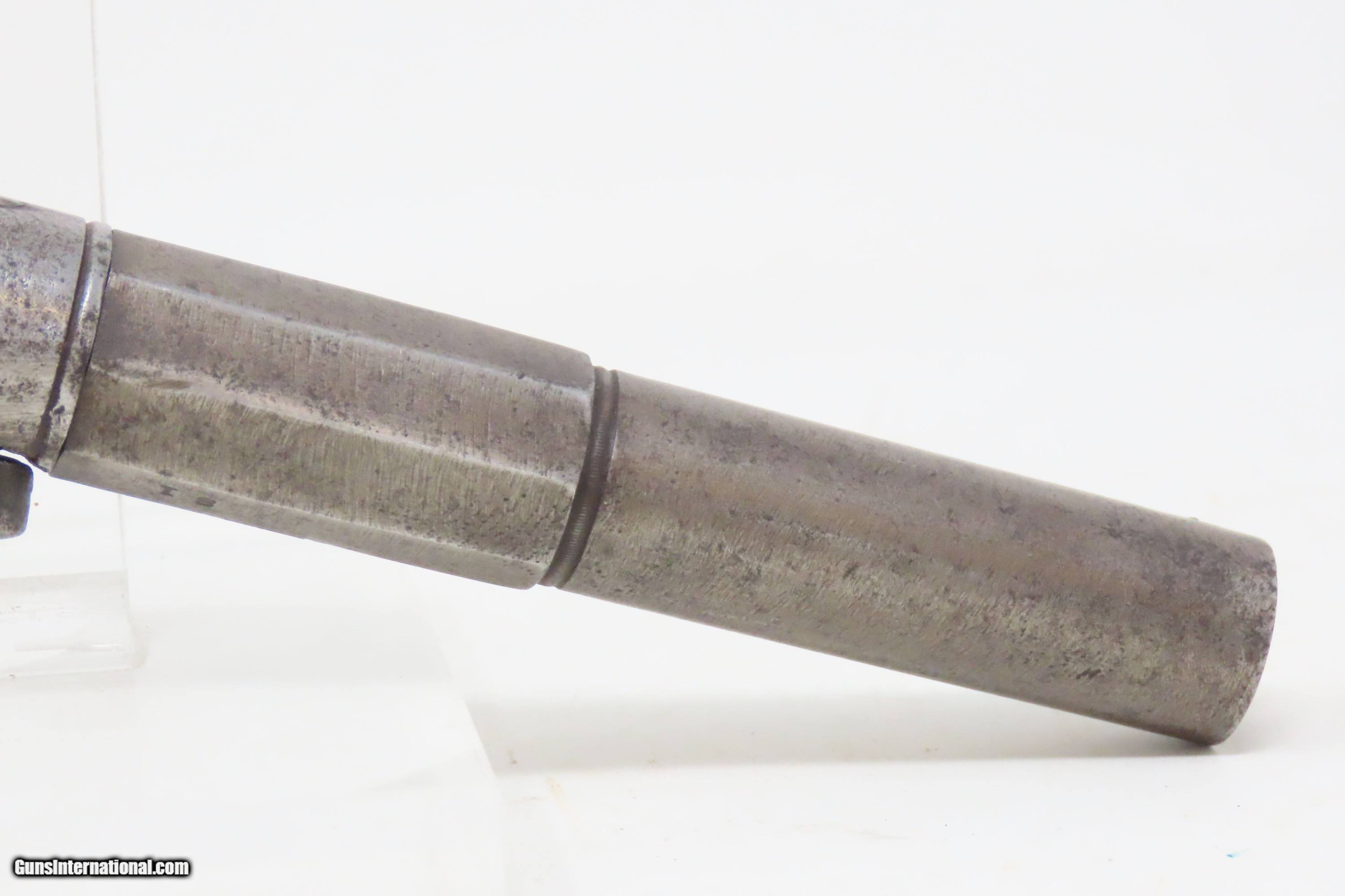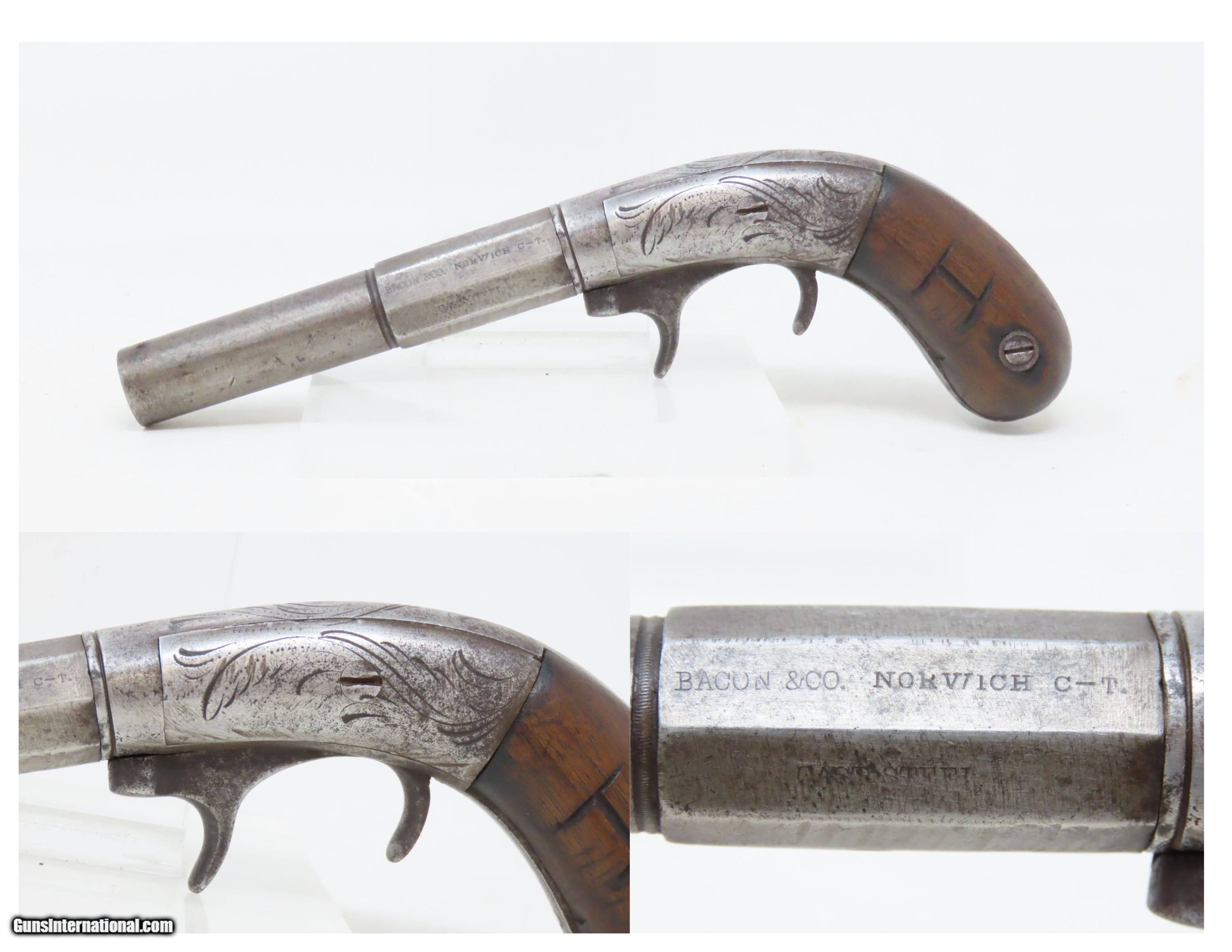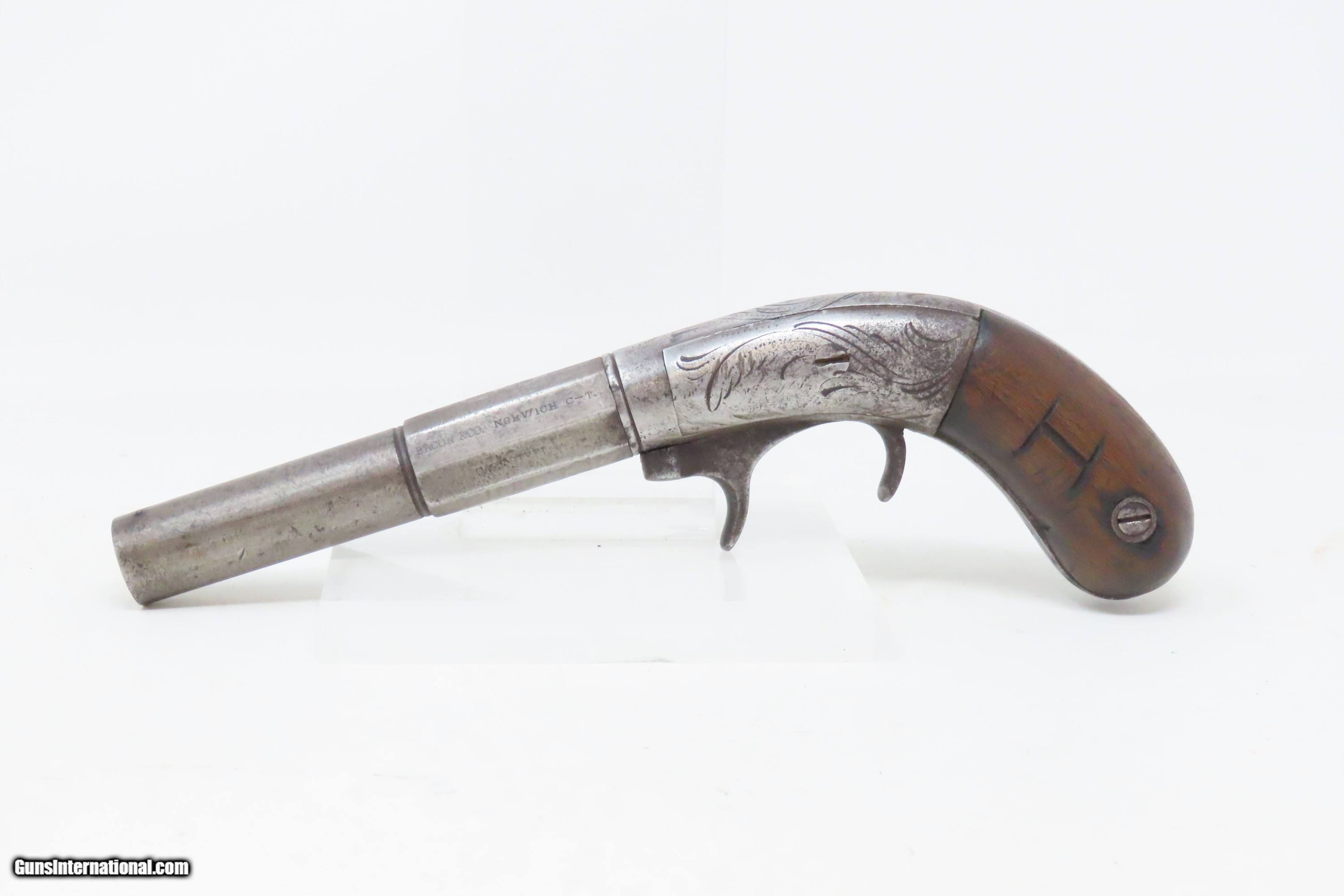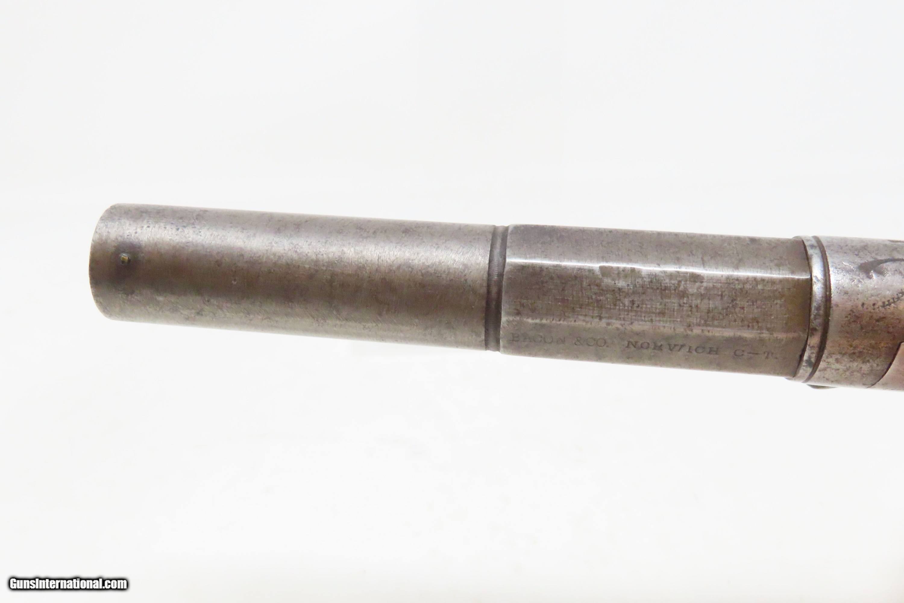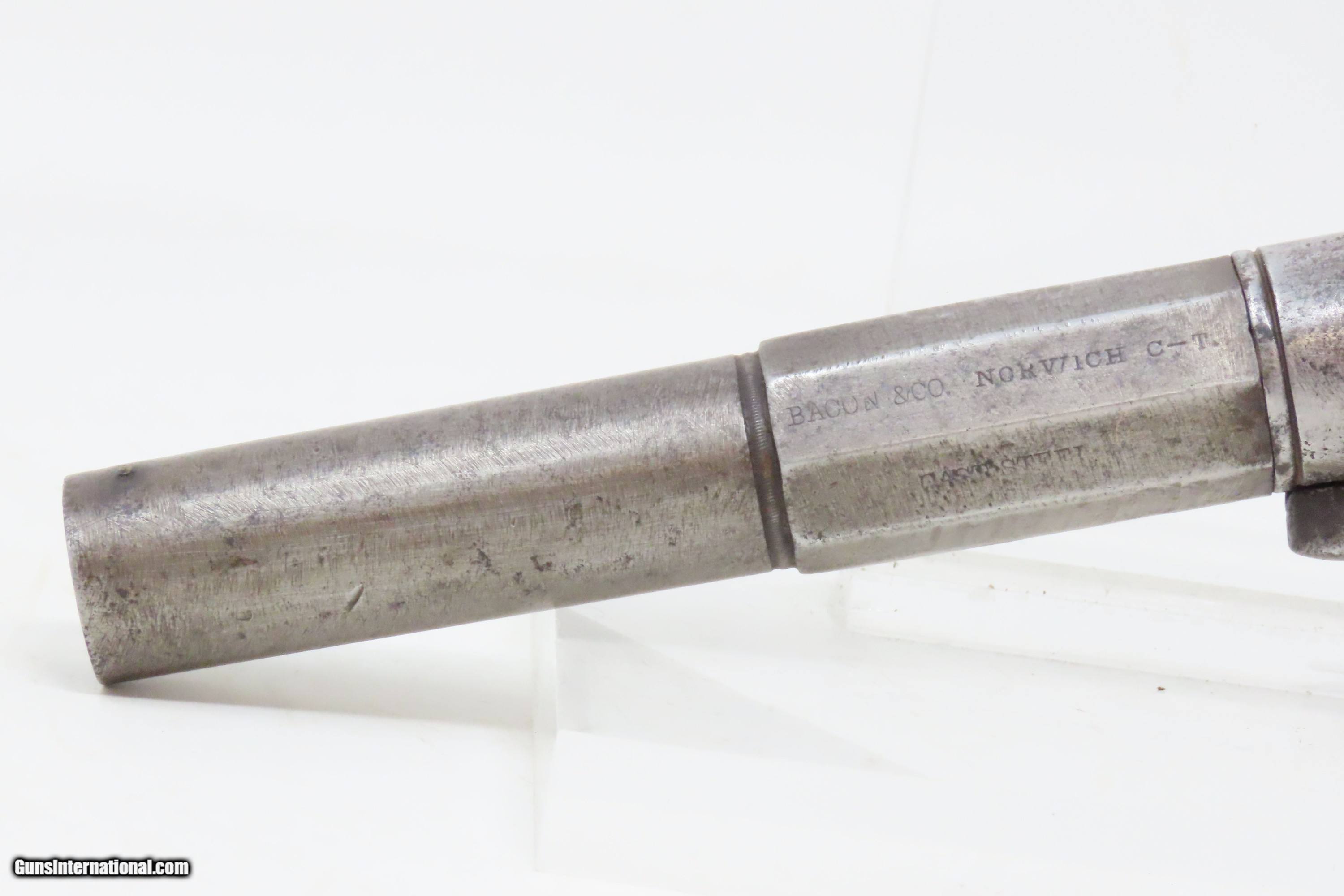Description: RARE No. 81 of 500 Antique BACON & CO. UNDERHAMMER Percussion BOOT Pistol ANTEBELLUM Early Production Underhammer Handgun Here we present an antique Bacon & Company Percussion Underhammer Boot Pistol, manufactured circa 1847-1857 in Norwich, Connecticut. This is one of the estimated 500 underhammer boot pistols manufactured in the years leading up to the American Civil War, during the Bacon & Company’s existence. History appears to show that Bacon went into the firearms production business on his own, forming Bacon & Company in Norwich somewhere around 1847, which he ran until 1857. The 4-inch barrel is marked "BACON & CO. NORWICH C-T". The history that these pistols enjoyed over the years is astounding: the Seminole Wars, Gold Rush, Mexican War and American Civil War. The boot pistol was considered one of the ultimate personal defense weapons of the day as it could be inserted and concealed in a man's boot for easy quick access. These guns are true relics of American history. The boot pistol was considered one of the ultimate personal defense weapons of the day as it could be inserted and concealed in a man's boot for easy quick access. The overall condition is good. Gray patina throughout. The action is excellent. The bore is dim with strong rifling. The left grip bears the initial “H”. The bottom of the right grip has a short crack. Own the original! This is a legitimate antique and not a reproduction. Barrel is 4 inches. Caliber: .34 Underhammer Percussion Overall condition as seen in photos. Very Fast. Very Safe. FREE SHIPPING WORLDWIDE. Delivered directly to your door by express mail! Guaranteed AUTHENTIC & Includes CERTIFICATE OF AUTHENTICITY. ancestryguns $1050 #240310 SOLD Antique: Yes |