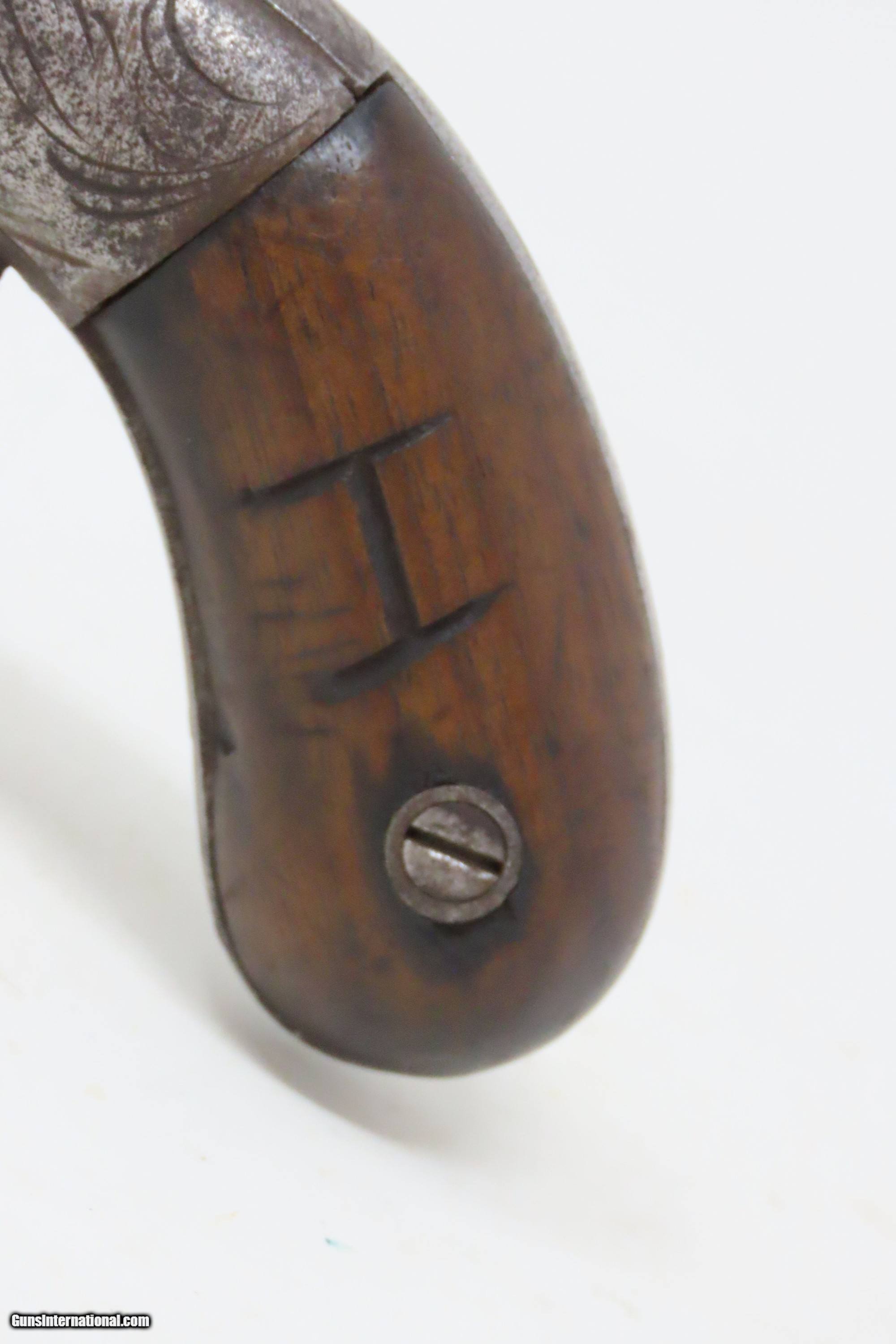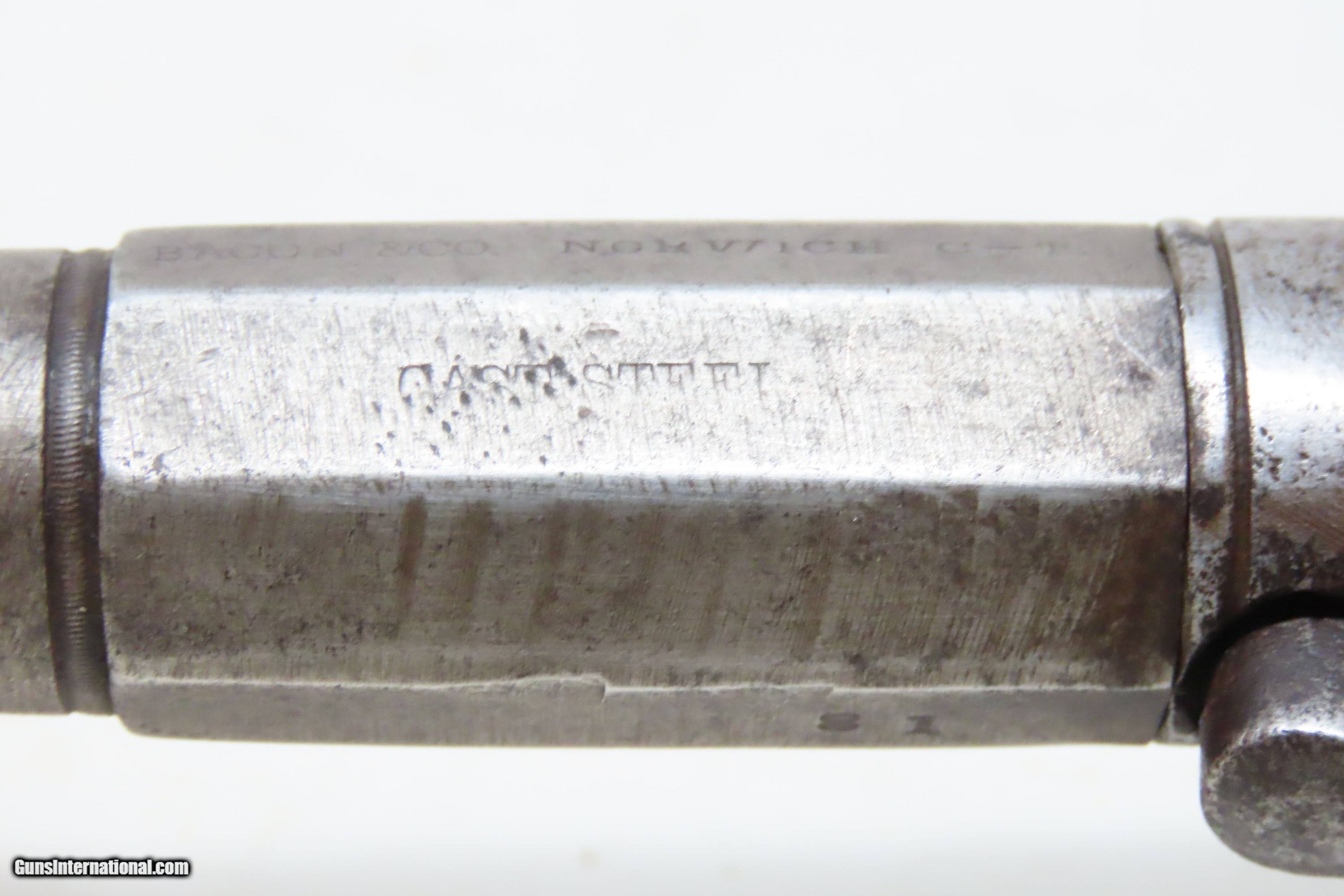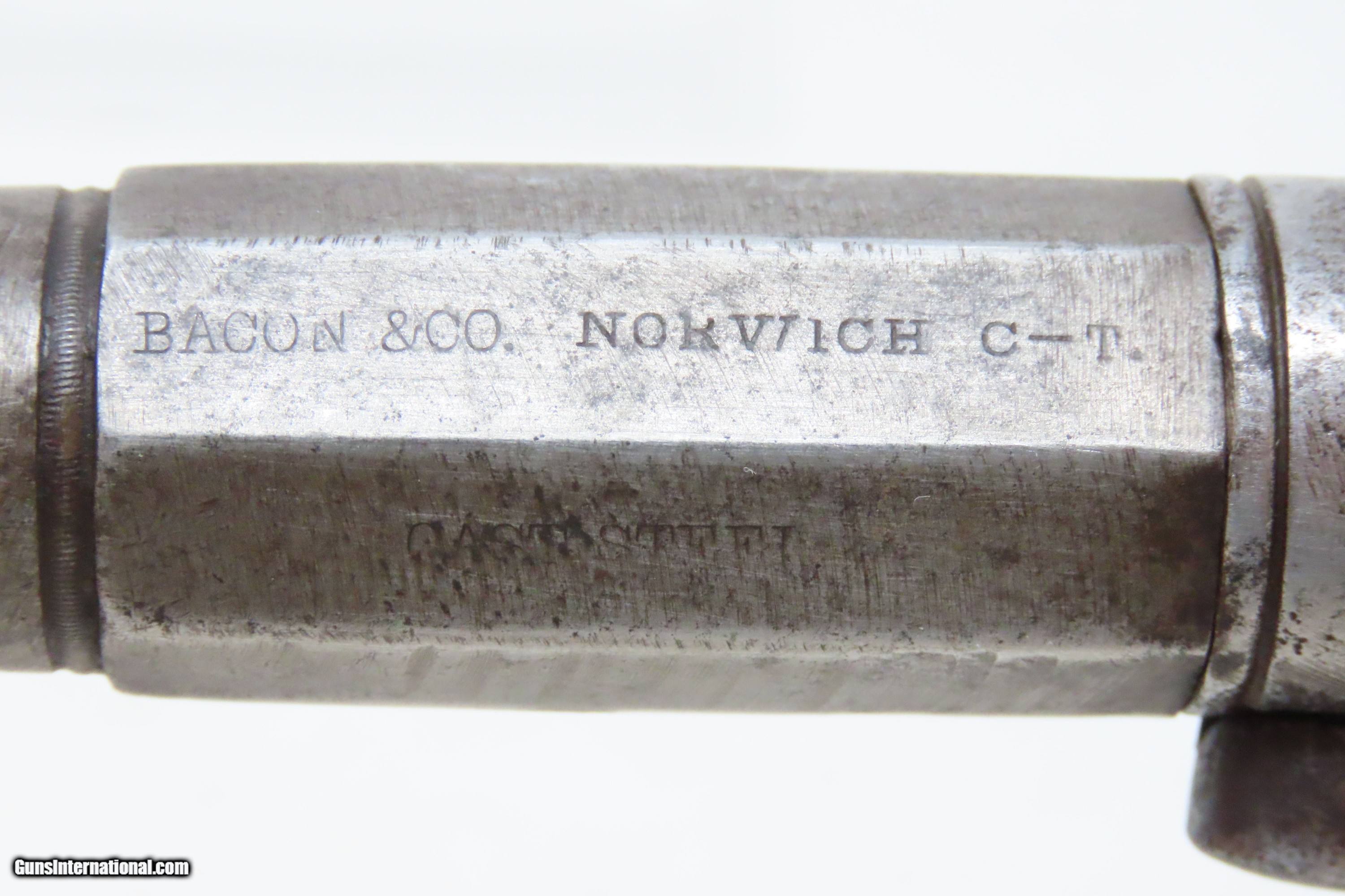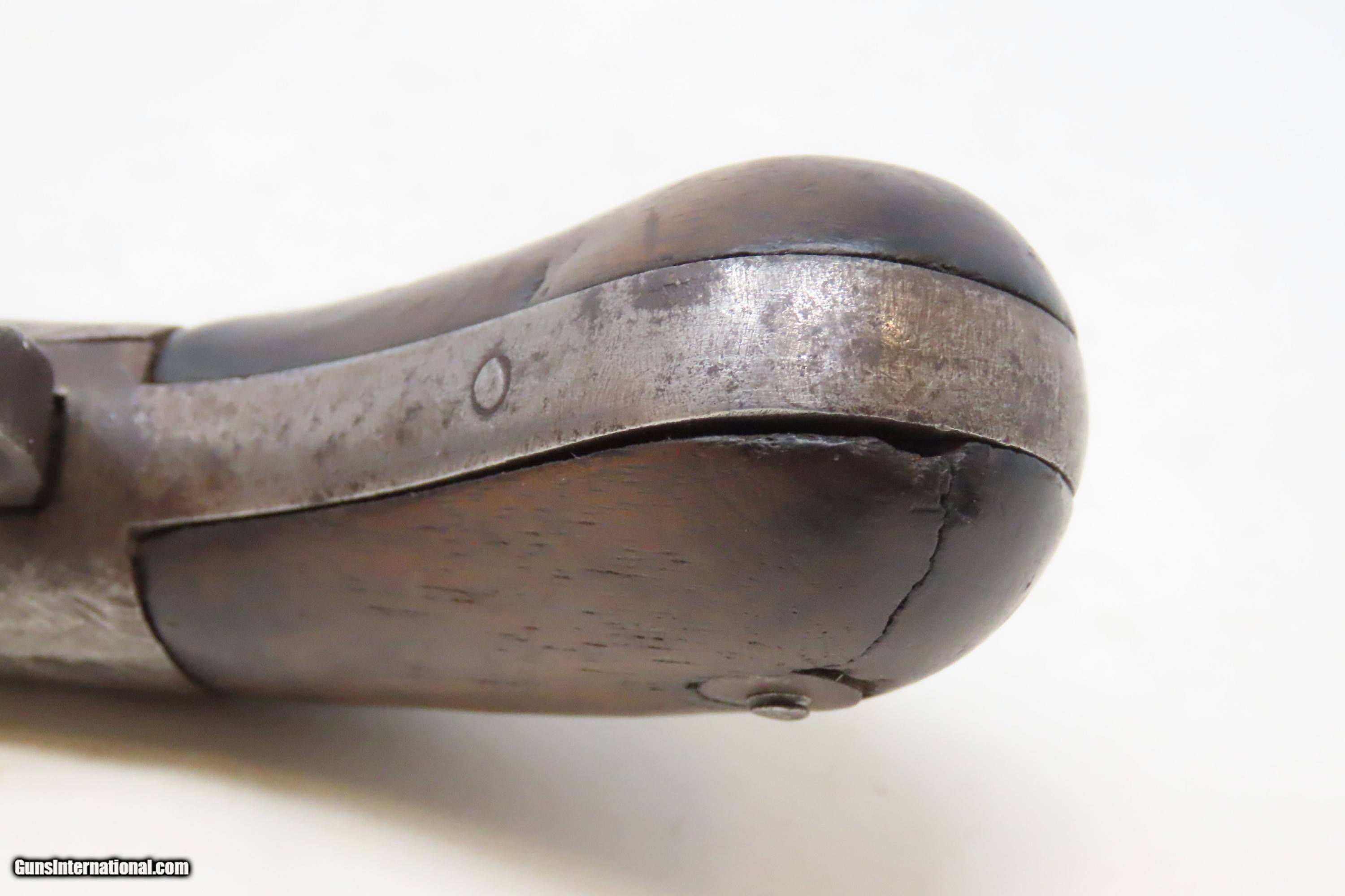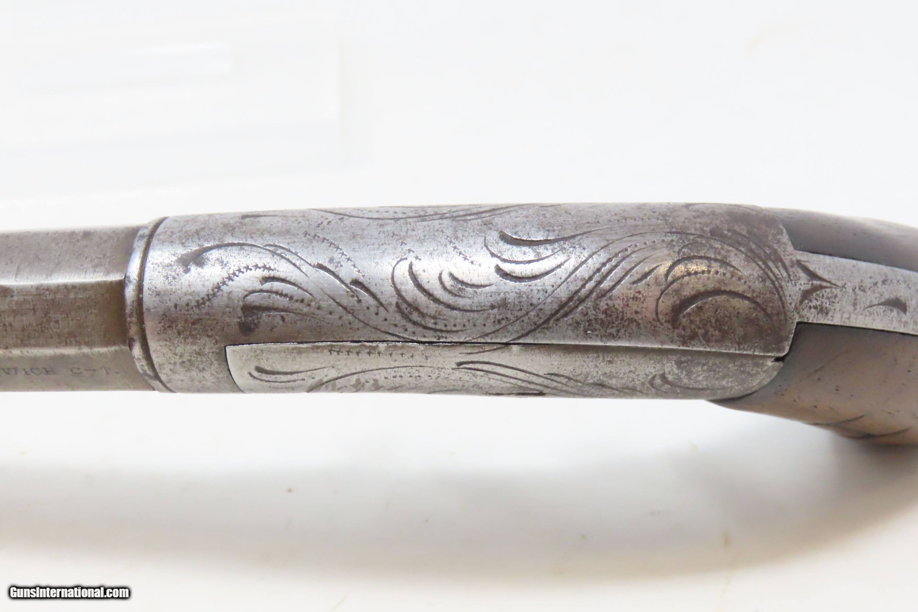 Description: RARE No. 81 of 500 Antique BACON & CO. UNDERHAMMER Percussion BOOT Pistol ANTEBELLUM Early Production Underhammer Handgun Here we present an antique Bacon & Company Percussion Underhammer Boot Pistol, manufactured circa 1847-1857 in Norwich, Connecticut. This is one of the estimated 500 underhammer boot pistols manufactured in the years leading up to the American Civil War, during the Bacon & Company’s existence. History appears to show that Bacon went into the firearms production business on his own, forming Bacon & Company in Norwich somewhere around 1847, which he ran until 1857. The 4-inch barrel is marked "BACON & CO. NORWICH C-T". The history that these pistols enjoyed over the years is astounding: the Seminole Wars, Gold Rush, Mexican War and American Civil War. The boot pistol was considered one of the ultimate personal defense weapons of the day as it could be inserted and concealed in a man's boot for easy quick access. These guns are true relics of American history. The boot pistol was considered one of the ultimate personal defense weapons of the day as it could be inserted and concealed in a man's boot for easy quick access. The overall condition is good. Gray patina throughout. The action is excellent. The bore is dim with strong rifling. The left grip bears the initial “H”. The bottom of the right grip has a short crack. Own the original! This is a legitimate antique and not a reproduction. Barrel is 4 inches. Caliber: .34 Underhammer Percussion Overall condition as seen in photos. Very Fast. Very Safe. FREE SHIPPING WORLDWIDE. Delivered directly to your door by express mail! Guaranteed AUTHENTIC & Includes CERTIFICATE OF AUTHENTICITY. ancestryguns $1050 #240310 SOLD Antique: Yes |