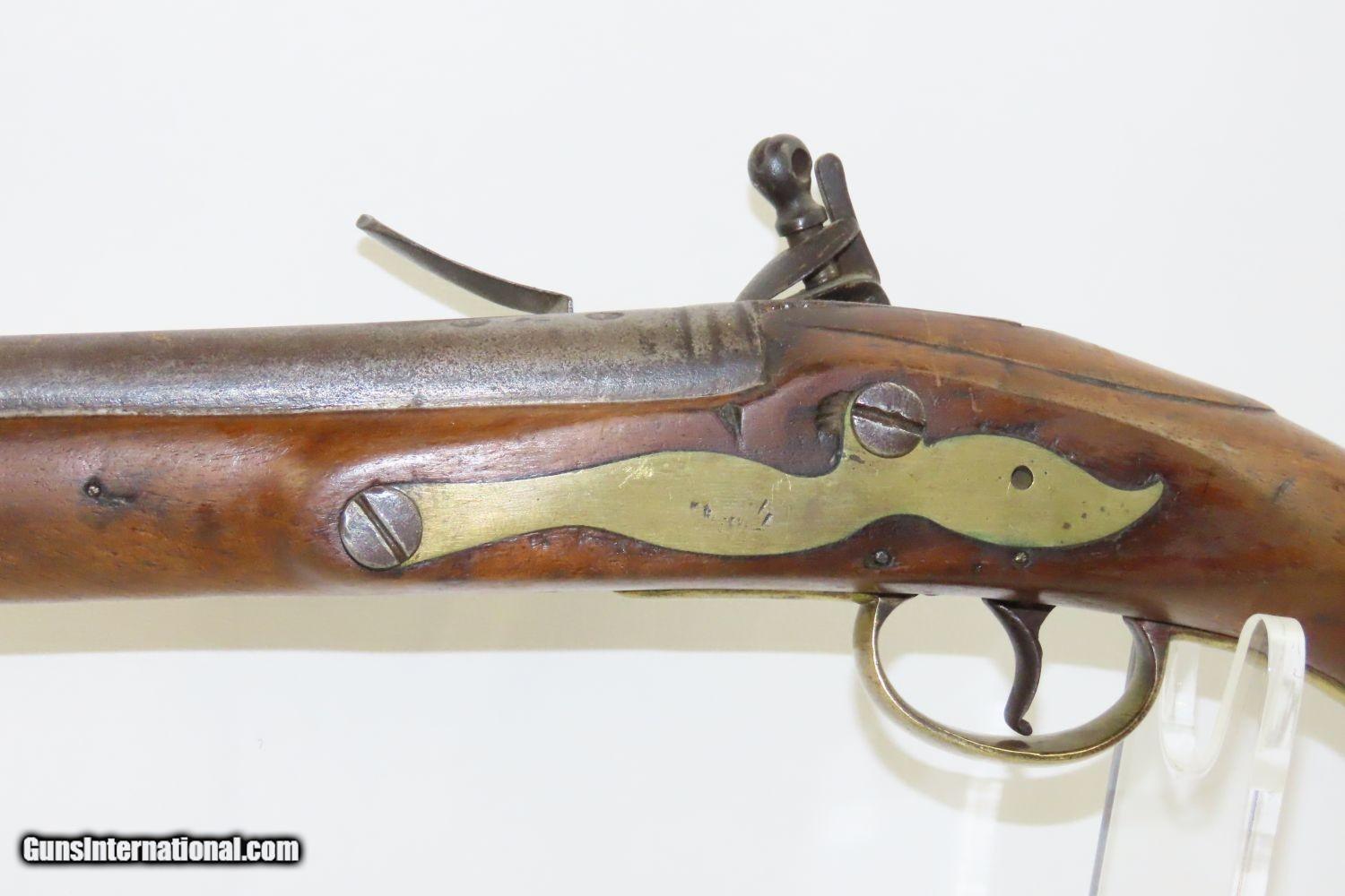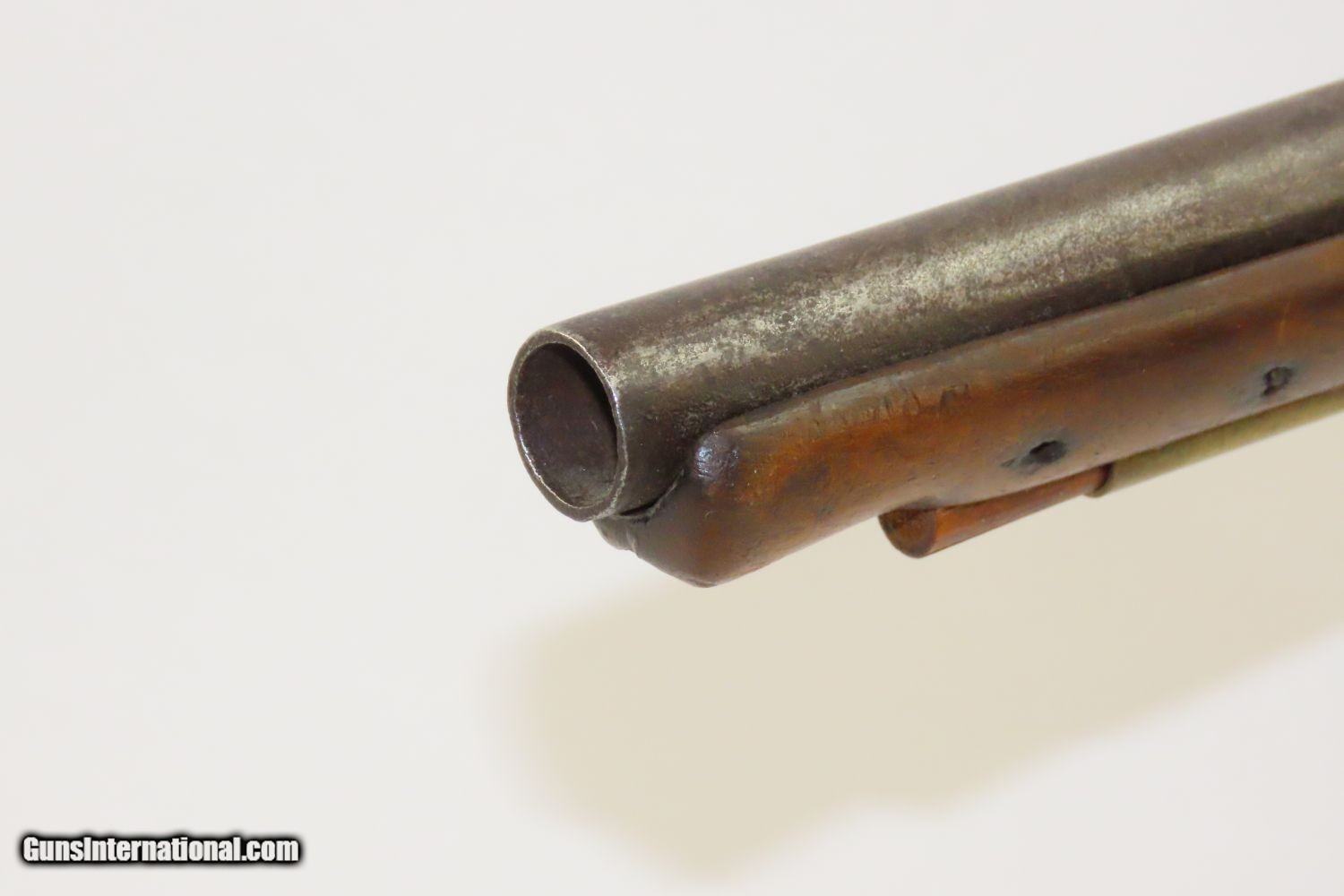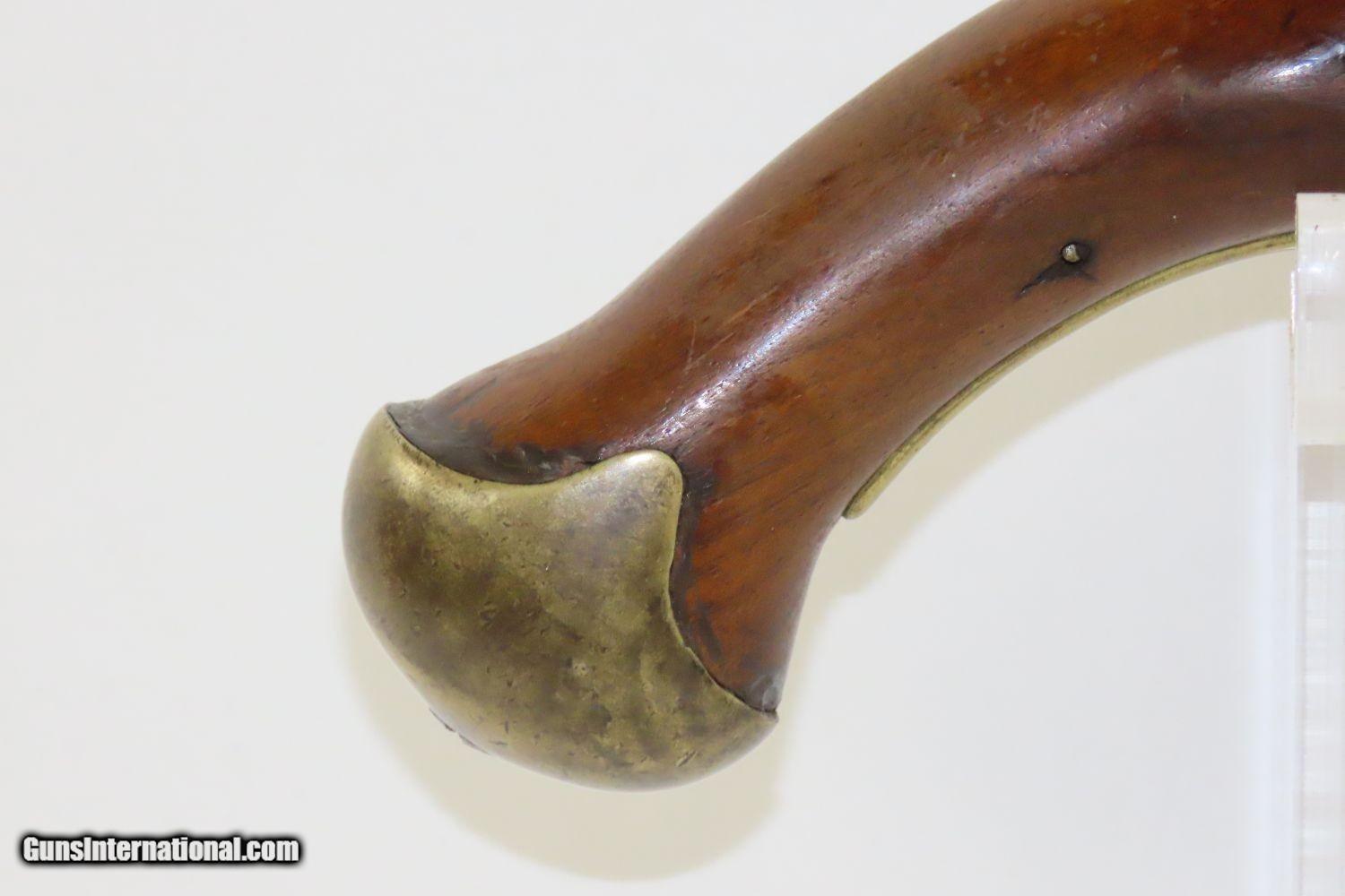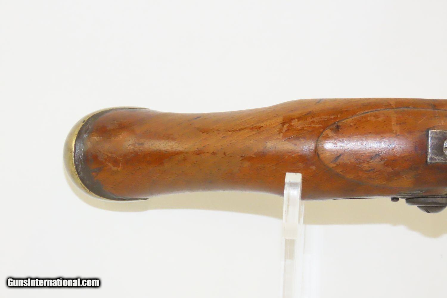 Description: REVOLUTIONARY WAR Period JOHN REA Long Sea Service Pattern FLINTLOCK Pistol Used by the British Royal Naval Service! Here we present an antique British John Rea Long Sea Service Pattern Flintlock Pistol, made circa 1770 in London, England. This is a very scarce example of an American Revolutionary War Period English Pattern 1756 Naval/Sea Service Pistol with English Board of Ordnance Markings, indicating “Royal (Naval) Service”. The lock is Regulation Pattern 1756 “Flat” Sea Service design with its original flat reinforced hammer, a faceted bridle-less powder-pan and an arrowhead finial frizzen-spring. Marked with a Board of Ordnance Crown marking, under the powder-pan and engraved with a “I. REA" maker’s mark, for John Rea I of London, England, who worked at several locations on Minories, including at 122 Minories. This pistol has full brass, Pattern 1756 Sea Service type hardware. The heavy butt-cap is screw fastened with short side terminals. The trigger guard has a pointed forward finial and a plain bow. London proof marks are located over the breech of the barrel with Ordnance acceptance marks. The overall condition is very good. The action is strong. The bore is smooth and dark. “VH” is hand engraved on the bottom of the stock just in from of the trigger guard. There is a small repair from the bottom of the lock to the trigger plate that is stable. Here we have a prime example of an amazing British flintlock sea service pistol from the late-18th Century! Own the original! This is a legitimate antique and not a reproduction. Barrel is 11-1/2 inches. Caliber: .58 Overall condition as seen in photos. Very Fast. Very Safe. FREE SHIPPING WORLDWIDE. Delivered directly to your door by express mail! Guaranteed AUTHENTIC & Includes CERTIFICATE OF AUTHENTICITY. ancestryguns $4850 #20753 SOLD Antique: Yes Handgun Caliber: .58 |
