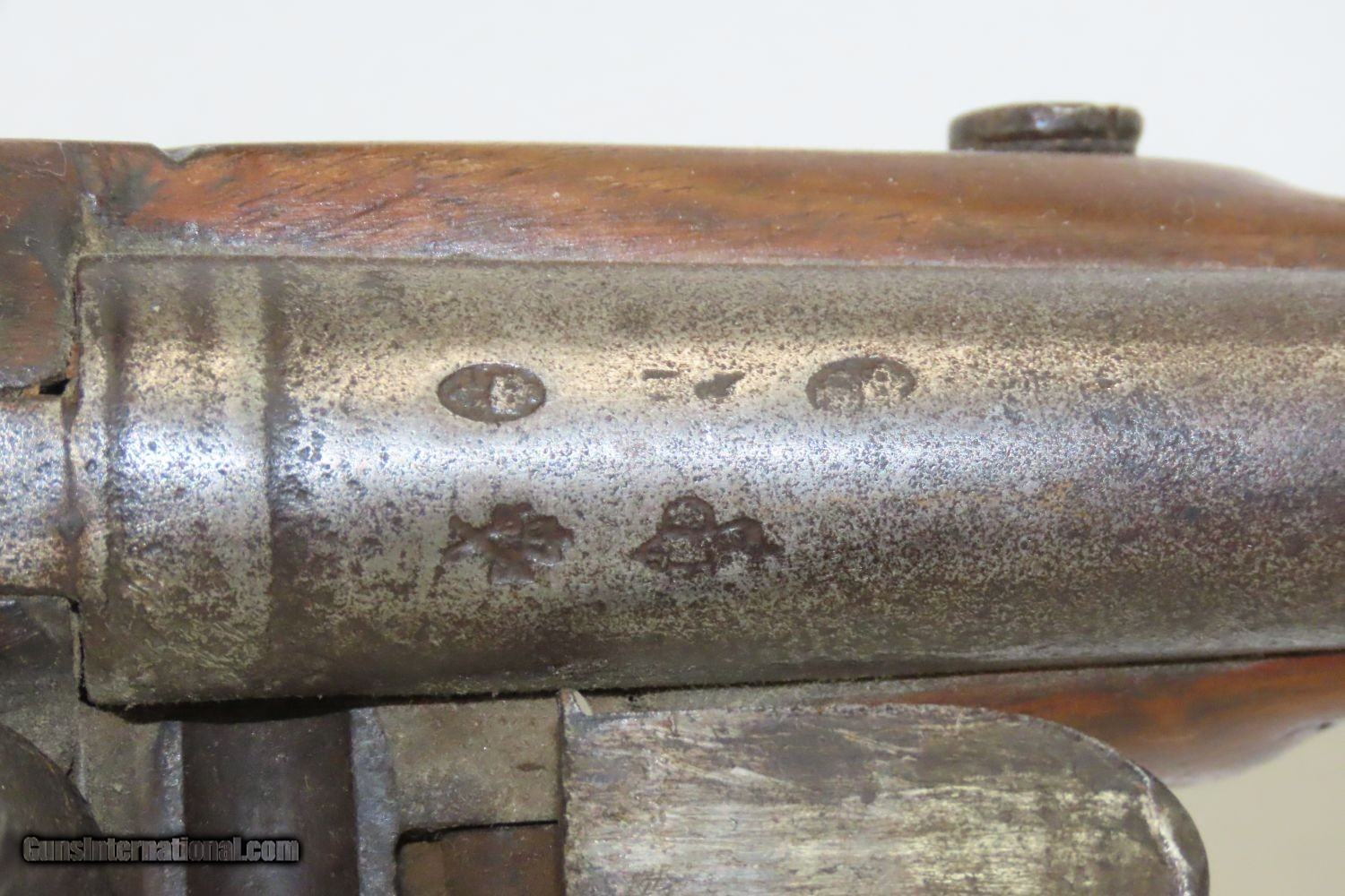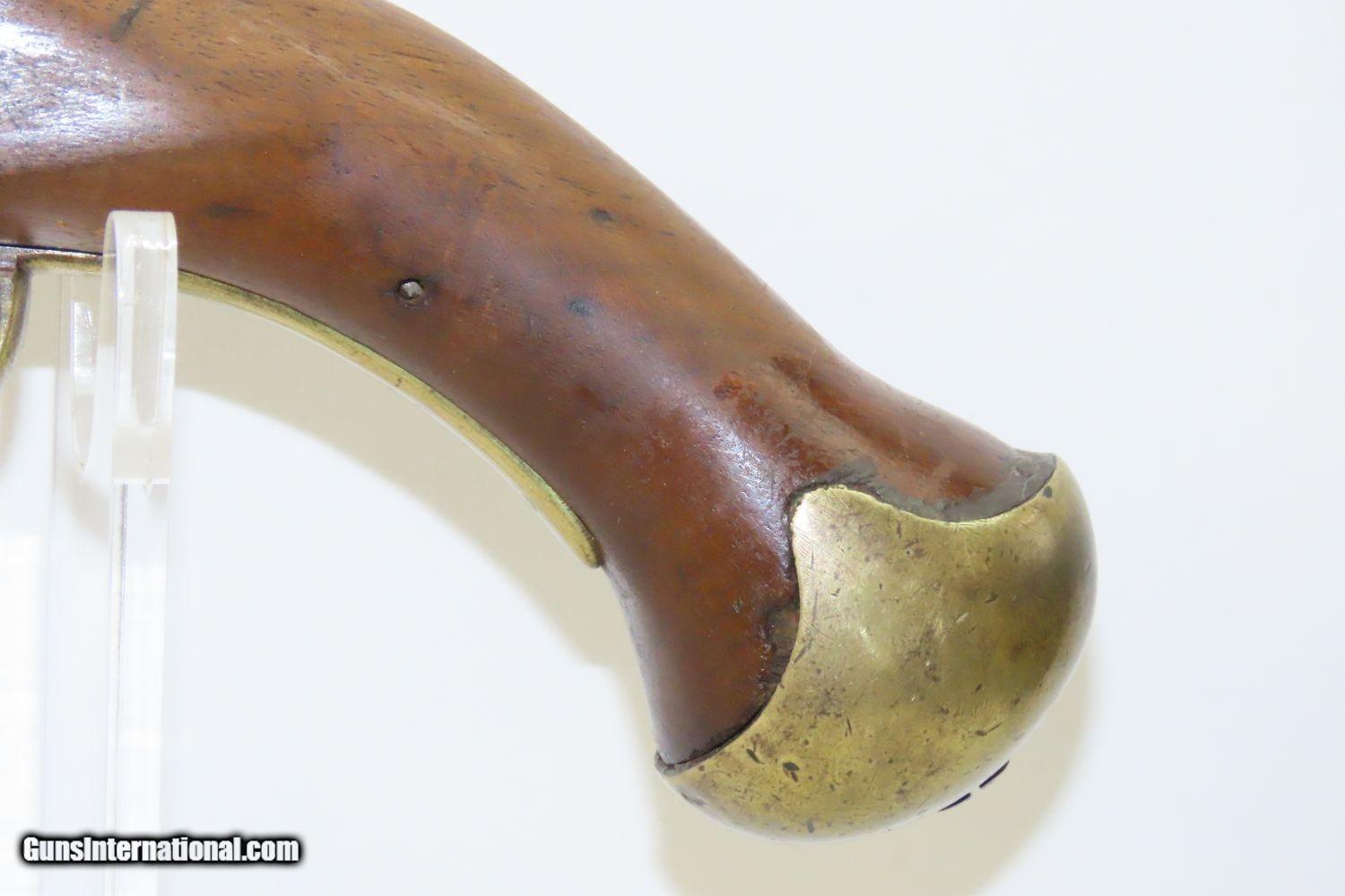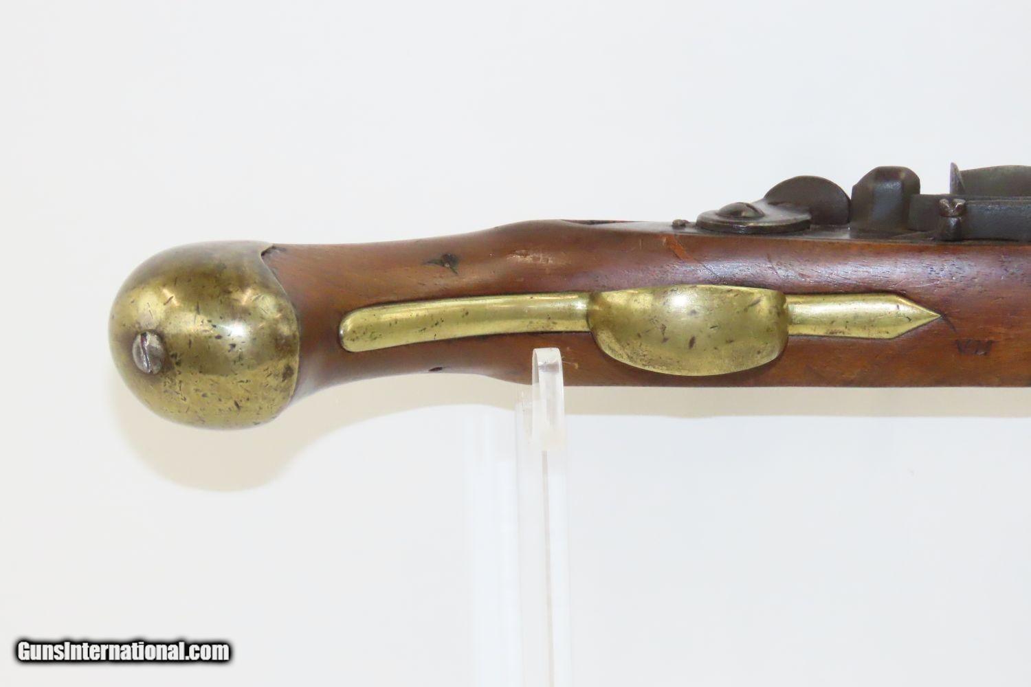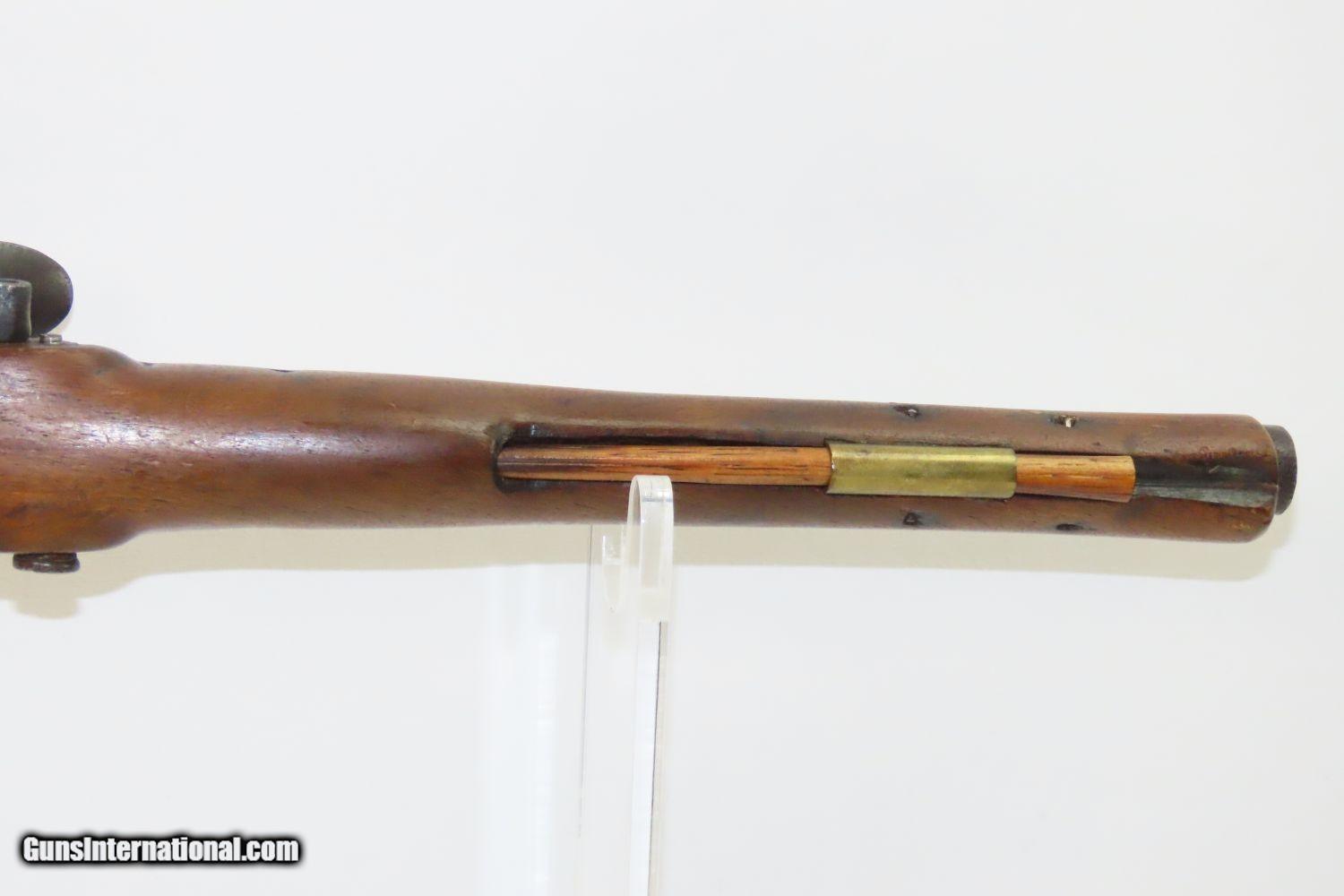Description: REVOLUTIONARY WAR Period JOHN REA Long Sea Service Pattern FLINTLOCK Pistol Used by the British Royal Naval Service! Here we present an antique British John Rea Long Sea Service Pattern Flintlock Pistol, made circa 1770 in London, England. This is a very scarce example of an American Revolutionary War Period English Pattern 1756 Naval/Sea Service Pistol with English Board of Ordnance Markings, indicating “Royal (Naval) Service”. The lock is Regulation Pattern 1756 “Flat” Sea Service design with its original flat reinforced hammer, a faceted bridle-less powder-pan and an arrowhead finial frizzen-spring. Marked with a Board of Ordnance Crown marking, under the powder-pan and engraved with a “I. REA" maker’s mark, for John Rea I of London, England, who worked at several locations on Minories, including at 122 Minories. This pistol has full brass, Pattern 1756 Sea Service type hardware. The heavy butt-cap is screw fastened with short side terminals. The trigger guard has a pointed forward finial and a plain bow. London proof marks are located over the breech of the barrel with Ordnance acceptance marks. The overall condition is very good. The action is strong. The bore is smooth and dark. “VH” is hand engraved on the bottom of the stock just in from of the trigger guard. There is a small repair from the bottom of the lock to the trigger plate that is stable. Here we have a prime example of an amazing British flintlock sea service pistol from the late-18th Century! Own the original! This is a legitimate antique and not a reproduction. Barrel is 11-1/2 inches. Caliber: .58 Overall condition as seen in photos. Very Fast. Very Safe. FREE SHIPPING WORLDWIDE. Delivered directly to your door by express mail! Guaranteed AUTHENTIC & Includes CERTIFICATE OF AUTHENTICITY. ancestryguns $4850 #20753 SOLD Antique: Yes Handgun Caliber: .58 |