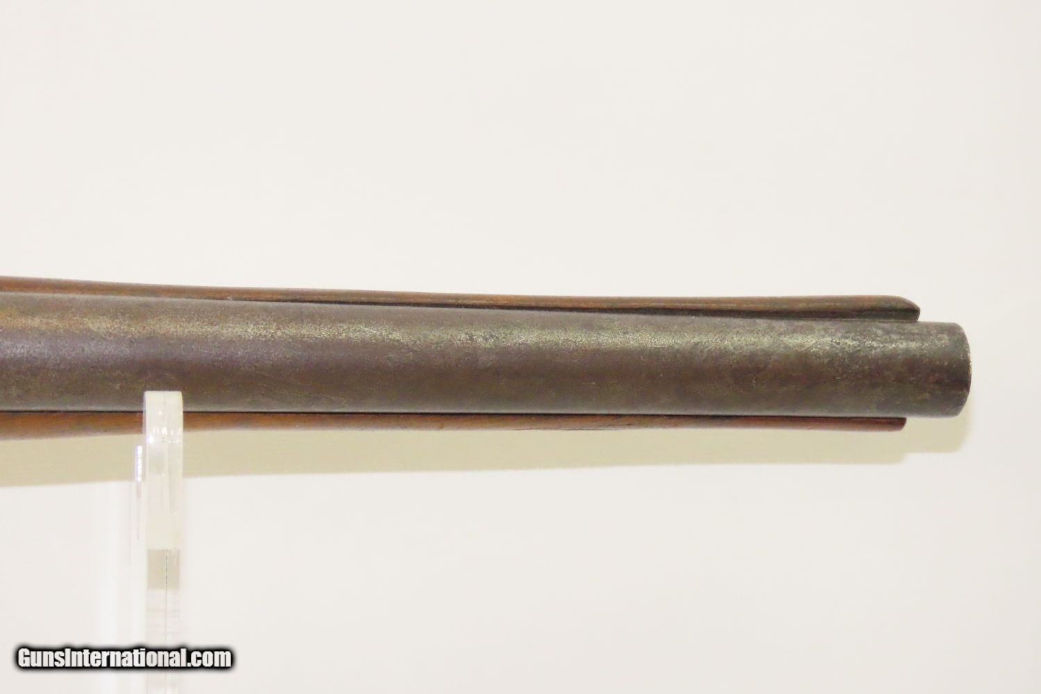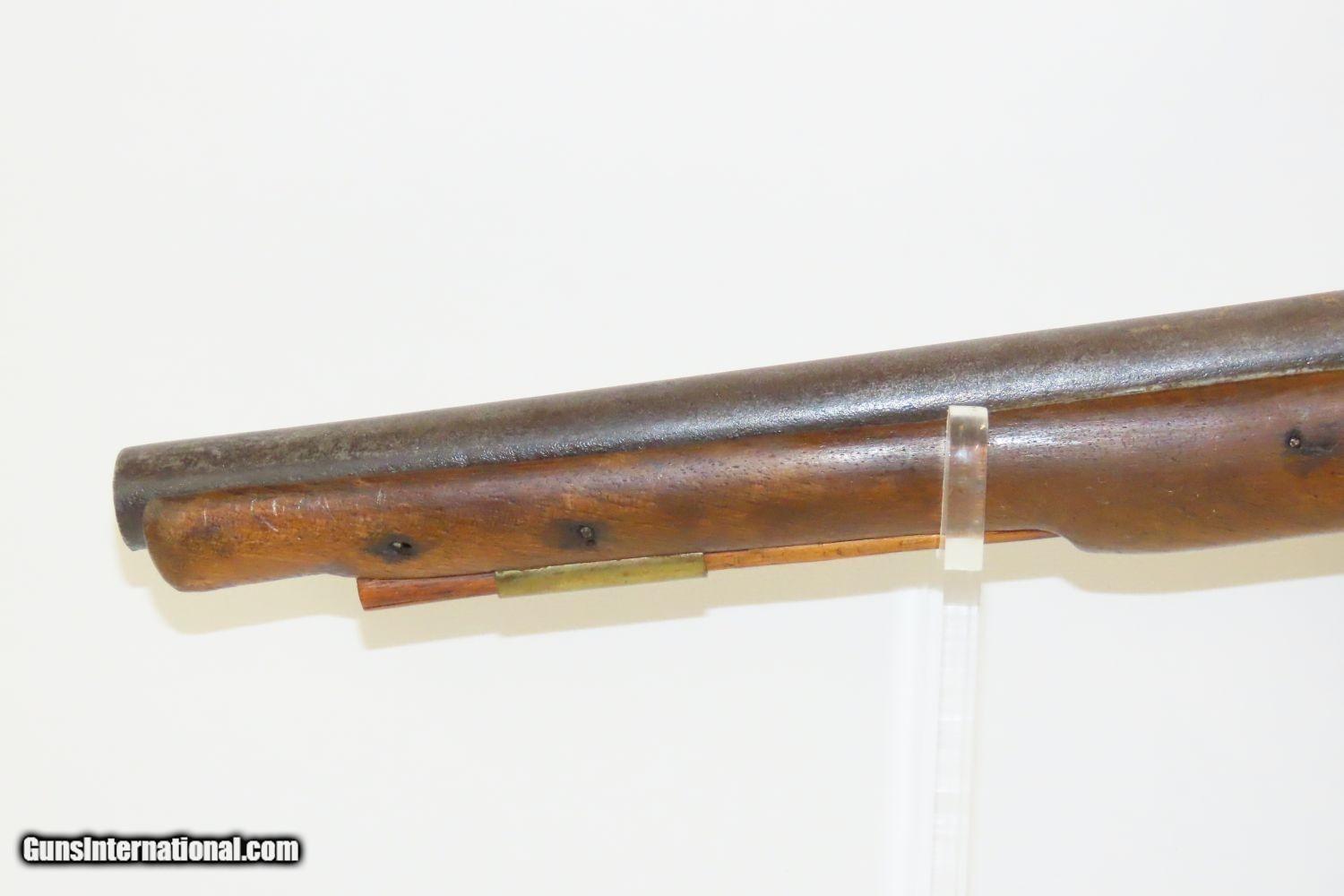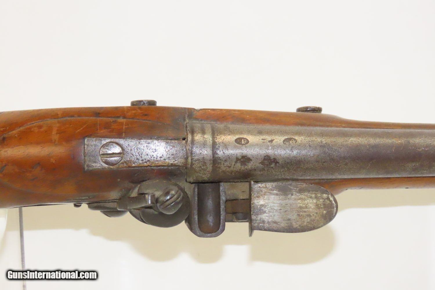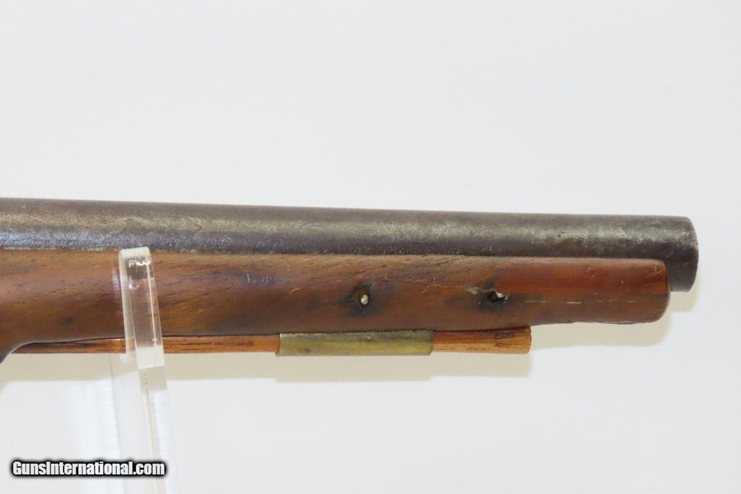 Description: REVOLUTIONARY WAR Period JOHN REA Long Sea Service Pattern FLINTLOCK Pistol Used by the British Royal Naval Service! Here we present an antique British John Rea Long Sea Service Pattern Flintlock Pistol, made circa 1770 in London, England. This is a very scarce example of an American Revolutionary War Period English Pattern 1756 Naval/Sea Service Pistol with English Board of Ordnance Markings, indicating “Royal (Naval) Service”. The lock is Regulation Pattern 1756 “Flat” Sea Service design with its original flat reinforced hammer, a faceted bridle-less powder-pan and an arrowhead finial frizzen-spring. Marked with a Board of Ordnance Crown marking, under the powder-pan and engraved with a “I. REA" maker’s mark, for John Rea I of London, England, who worked at several locations on Minories, including at 122 Minories. This pistol has full brass, Pattern 1756 Sea Service type hardware. The heavy butt-cap is screw fastened with short side terminals. The trigger guard has a pointed forward finial and a plain bow. London proof marks are located over the breech of the barrel with Ordnance acceptance marks. The overall condition is very good. The action is strong. The bore is smooth and dark. “VH” is hand engraved on the bottom of the stock just in from of the trigger guard. There is a small repair from the bottom of the lock to the trigger plate that is stable. Here we have a prime example of an amazing British flintlock sea service pistol from the late-18th Century! Own the original! This is a legitimate antique and not a reproduction. Barrel is 11-1/2 inches. Caliber: .58 Overall condition as seen in photos. Very Fast. Very Safe. FREE SHIPPING WORLDWIDE. Delivered directly to your door by express mail! Guaranteed AUTHENTIC & Includes CERTIFICATE OF AUTHENTICITY. ancestryguns $4850 #20753 SOLD Antique: Yes Handgun Caliber: .58 |