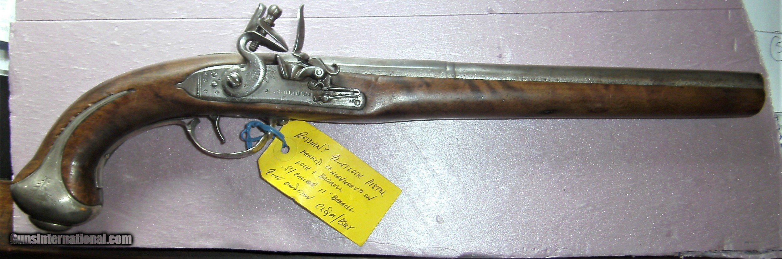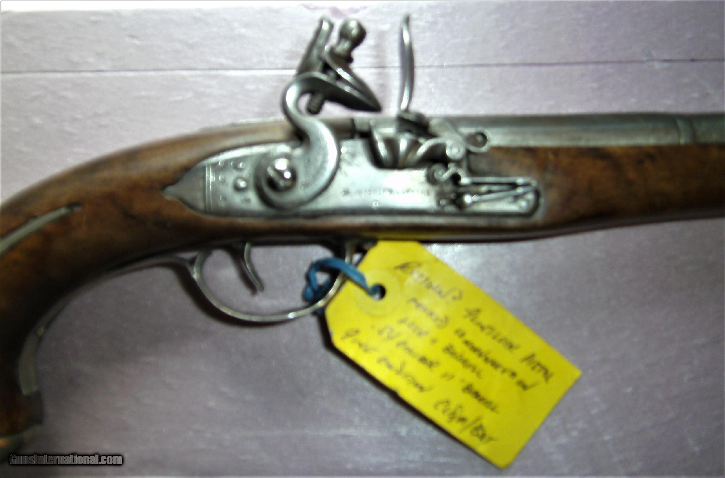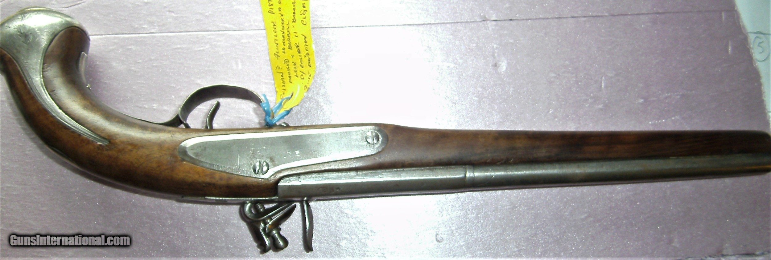 Description: Beautiful Russian Flintlock pistol. Marked clearly "Norvnorv" on reciever, top of barrel 11" octagon to round .54 caliber smooth bore Silver deatailing with very clear engravings throughout. Action and trigger mechanisim performs as it should Fine condition SOLD Antique: Yes |