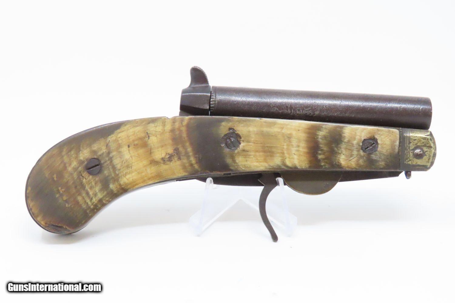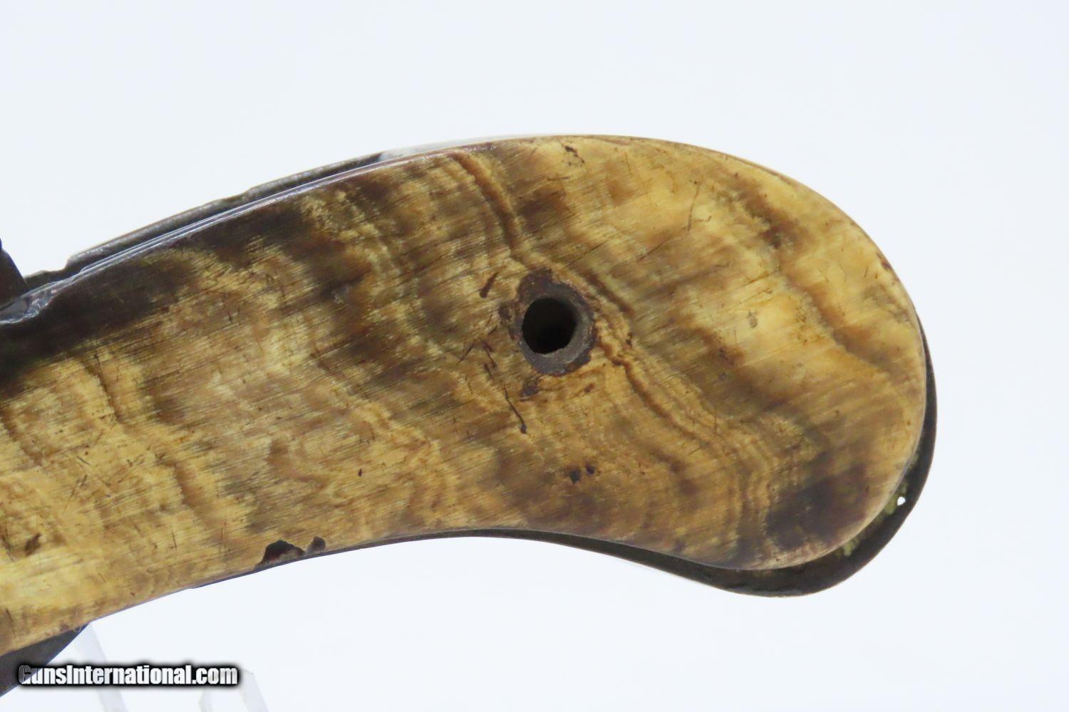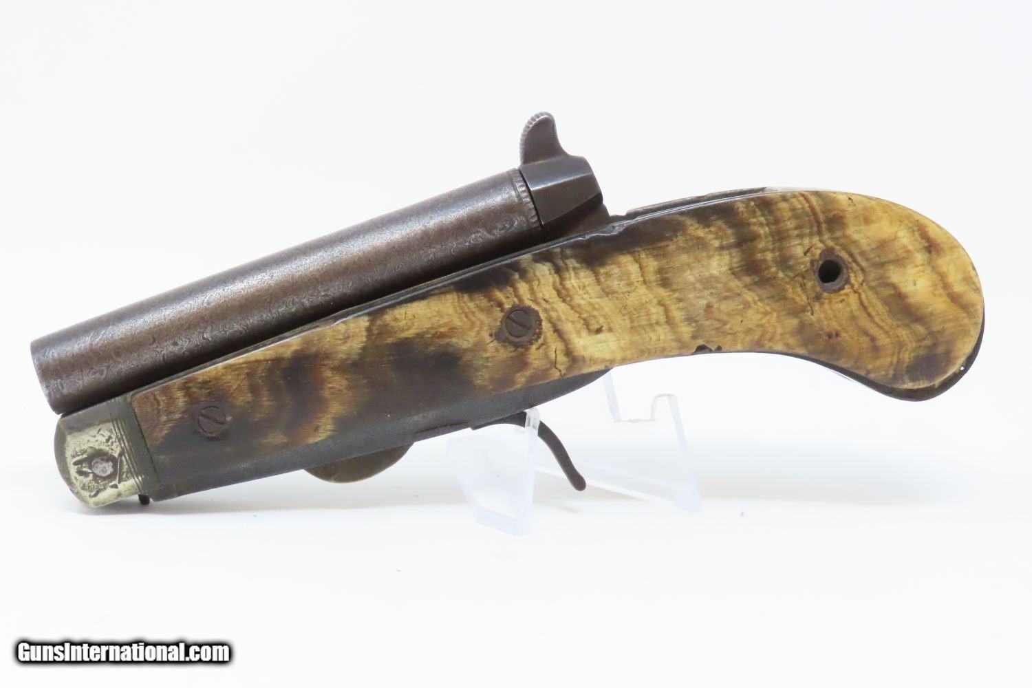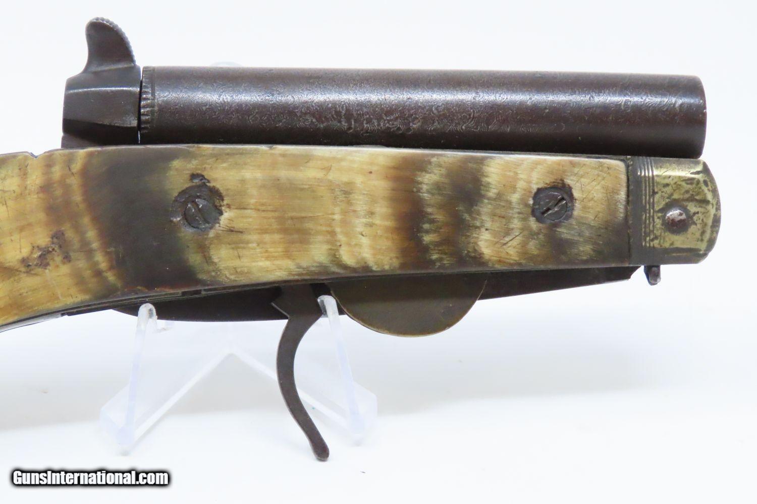 Description: Scarce 1800s HORSEMAN’S POCKET KNIFE/PISTOL .36 Caliber Percussion Antique MULTI-TOOL w DAMASCUS BARREL & HORN GRIPS Here we present an antique Belgian Percussion Horseman’s Pocket Knife Pistol made circa the 1840s in Liege. This unique knife gun features a 3-1/2 inch folding blade and chambered in .36 caliber percussion with a Damascus barrel and horn scales. There is an ELG proof mark on the Damascus barrel. This is a rare collector’s piece and is described by Gordon Frost in his book Blades and Barrels. Single and double-barrel knife/pistol combinations like this are fairly uncommon. Most date to the 1840s and 1850s, when a lot of people still didn’t trust the newfangled revolvers or even pepperboxes. With the exception of some made in England, most carried no makers’ markings at all. Belgium and Germany were the main source of these types on the European Continent. The overall condition is very good. The action is strong. Bore is in good shape. The knifes functions properly as well. Here is a truly scarce and unique example of an early multi-tool! Own the original! This is a legitimate antique and not a reproduction. Barrel is 3-1/2 inches. Caliber: .36 Percussion Blade: 3-1/2 inches. Overall condition as seen in photos. Very Fast. Very Safe. FREE SHIPPING WORLDWIDE. Delivered directly to your door by express mail! Guaranteed AUTHENTIC & Includes CERTIFICATE OF AUTHENTICITY. ancestryguns $1965 #210674 SOLD Antique: Yes |