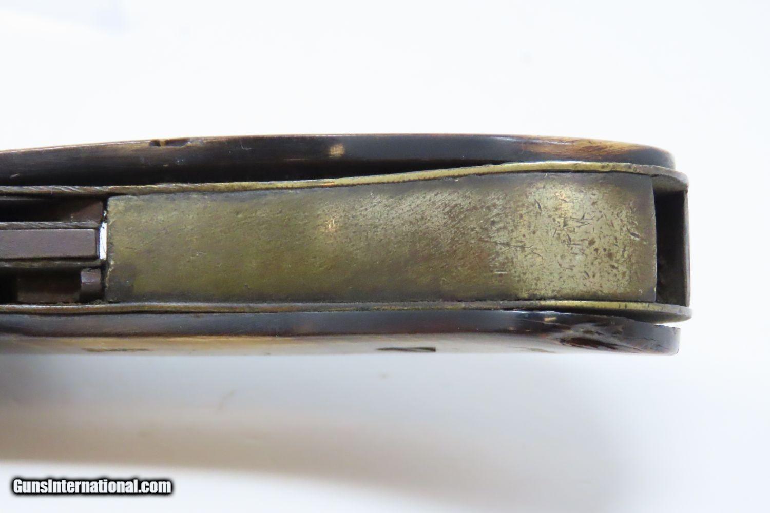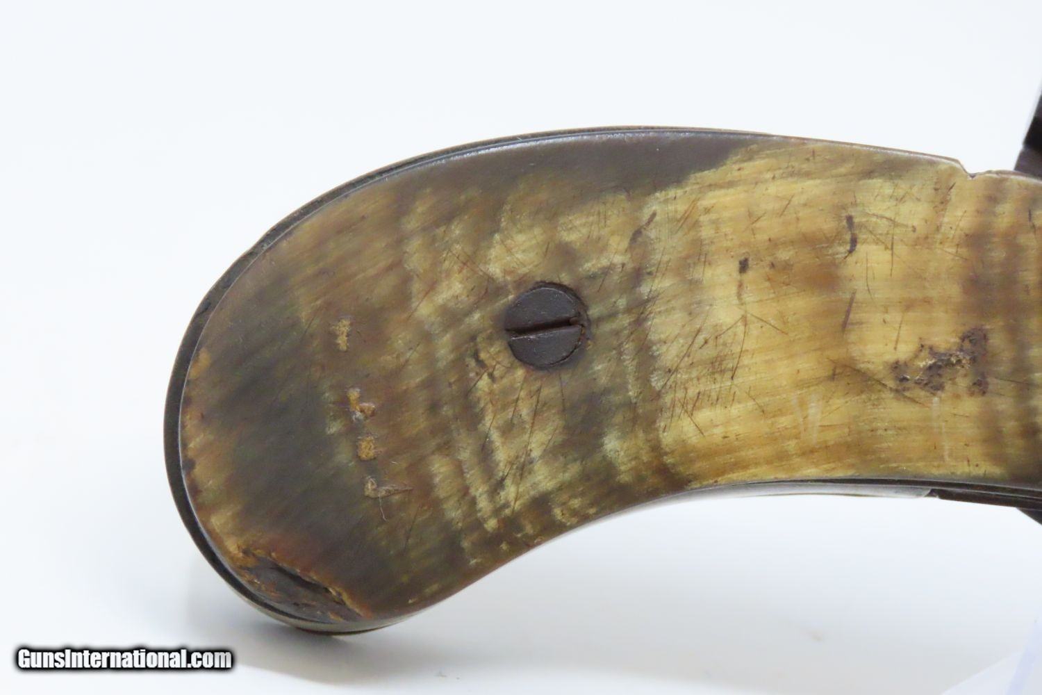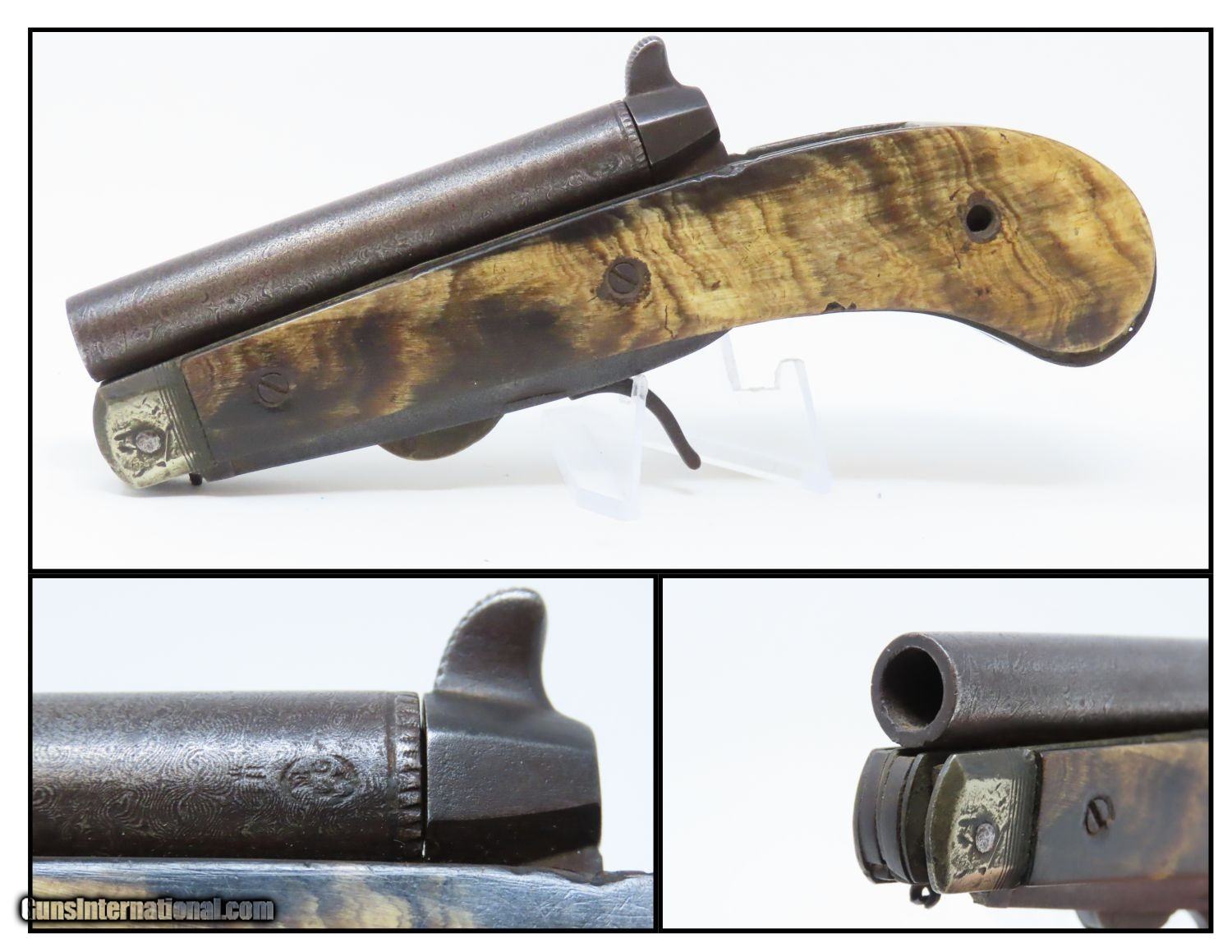 Description: Scarce 1800s HORSEMAN’S POCKET KNIFE/PISTOL .36 Caliber Percussion Antique MULTI-TOOL w DAMASCUS BARREL & HORN GRIPS Here we present an antique Belgian Percussion Horseman’s Pocket Knife Pistol made circa the 1840s in Liege. This unique knife gun features a 3-1/2 inch folding blade and chambered in .36 caliber percussion with a Damascus barrel and horn scales. There is an ELG proof mark on the Damascus barrel. This is a rare collector’s piece and is described by Gordon Frost in his book Blades and Barrels. Single and double-barrel knife/pistol combinations like this are fairly uncommon. Most date to the 1840s and 1850s, when a lot of people still didn’t trust the newfangled revolvers or even pepperboxes. With the exception of some made in England, most carried no makers’ markings at all. Belgium and Germany were the main source of these types on the European Continent. The overall condition is very good. The action is strong. Bore is in good shape. The knifes functions properly as well. Here is a truly scarce and unique example of an early multi-tool! Own the original! This is a legitimate antique and not a reproduction. Barrel is 3-1/2 inches. Caliber: .36 Percussion Blade: 3-1/2 inches. Overall condition as seen in photos. Very Fast. Very Safe. FREE SHIPPING WORLDWIDE. Delivered directly to your door by express mail! Guaranteed AUTHENTIC & Includes CERTIFICATE OF AUTHENTICITY. ancestryguns $1965 #210674 SOLD Antique: Yes |
