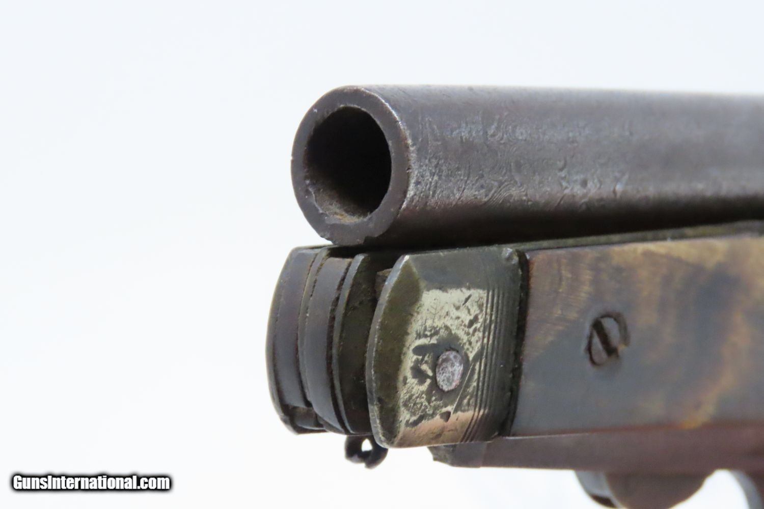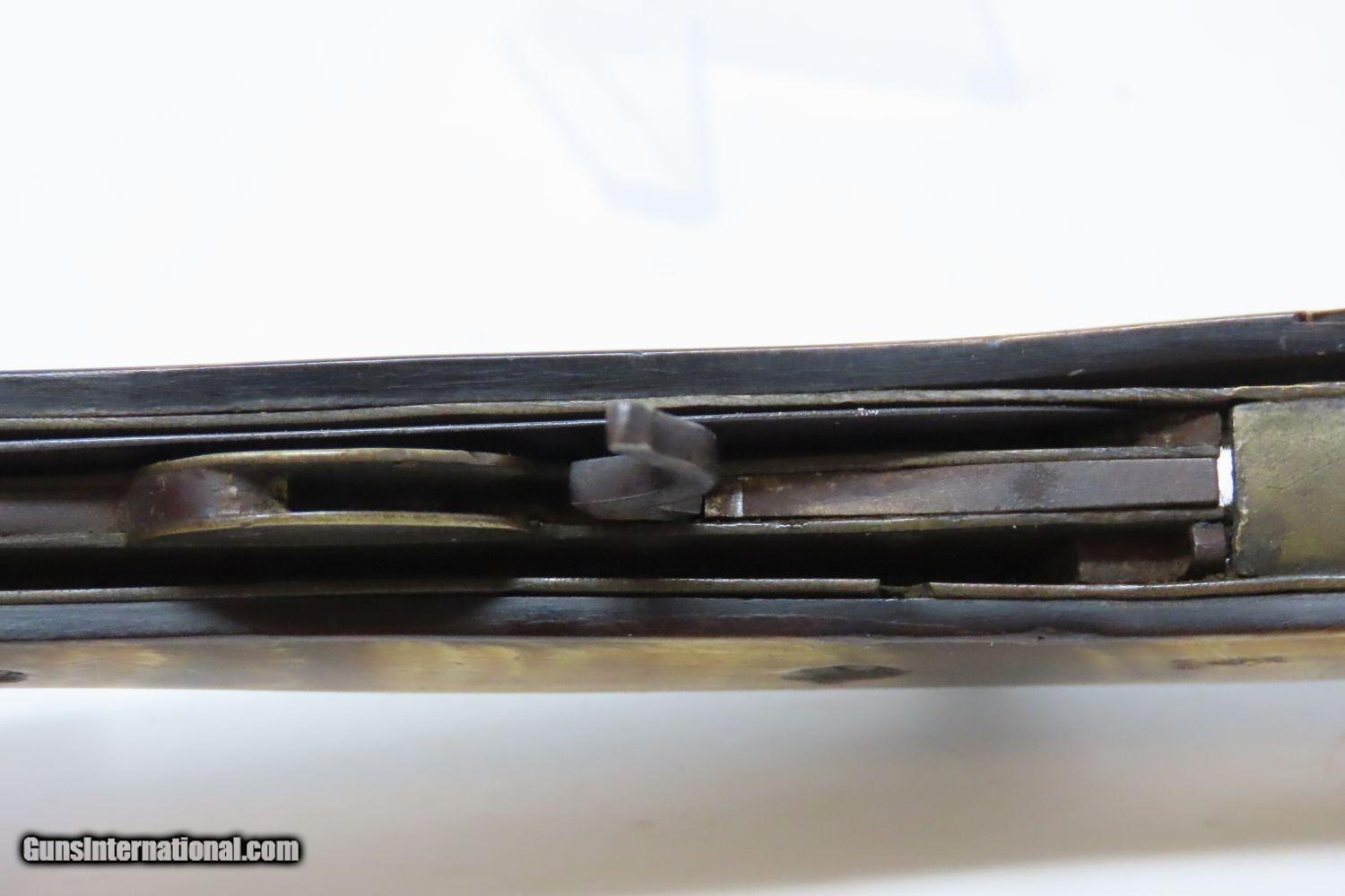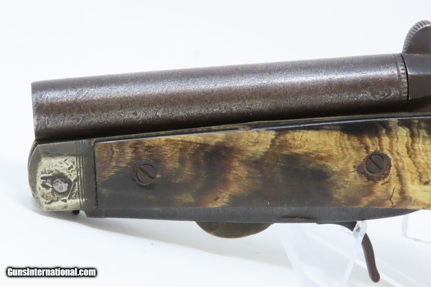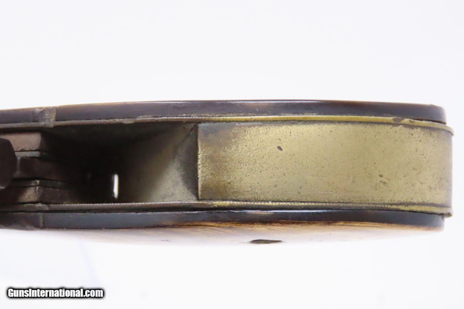 Description: Scarce 1800s HORSEMAN’S POCKET KNIFE/PISTOL .36 Caliber Percussion Antique MULTI-TOOL w DAMASCUS BARREL & HORN GRIPS Here we present an antique Belgian Percussion Horseman’s Pocket Knife Pistol made circa the 1840s in Liege. This unique knife gun features a 3-1/2 inch folding blade and chambered in .36 caliber percussion with a Damascus barrel and horn scales. There is an ELG proof mark on the Damascus barrel. This is a rare collector’s piece and is described by Gordon Frost in his book Blades and Barrels. Single and double-barrel knife/pistol combinations like this are fairly uncommon. Most date to the 1840s and 1850s, when a lot of people still didn’t trust the newfangled revolvers or even pepperboxes. With the exception of some made in England, most carried no makers’ markings at all. Belgium and Germany were the main source of these types on the European Continent. The overall condition is very good. The action is strong. Bore is in good shape. The knifes functions properly as well. Here is a truly scarce and unique example of an early multi-tool! Own the original! This is a legitimate antique and not a reproduction. Barrel is 3-1/2 inches. Caliber: .36 Percussion Blade: 3-1/2 inches. Overall condition as seen in photos. Very Fast. Very Safe. FREE SHIPPING WORLDWIDE. Delivered directly to your door by express mail! Guaranteed AUTHENTIC & Includes CERTIFICATE OF AUTHENTICITY. ancestryguns $1965 #210674 SOLD Antique: Yes |