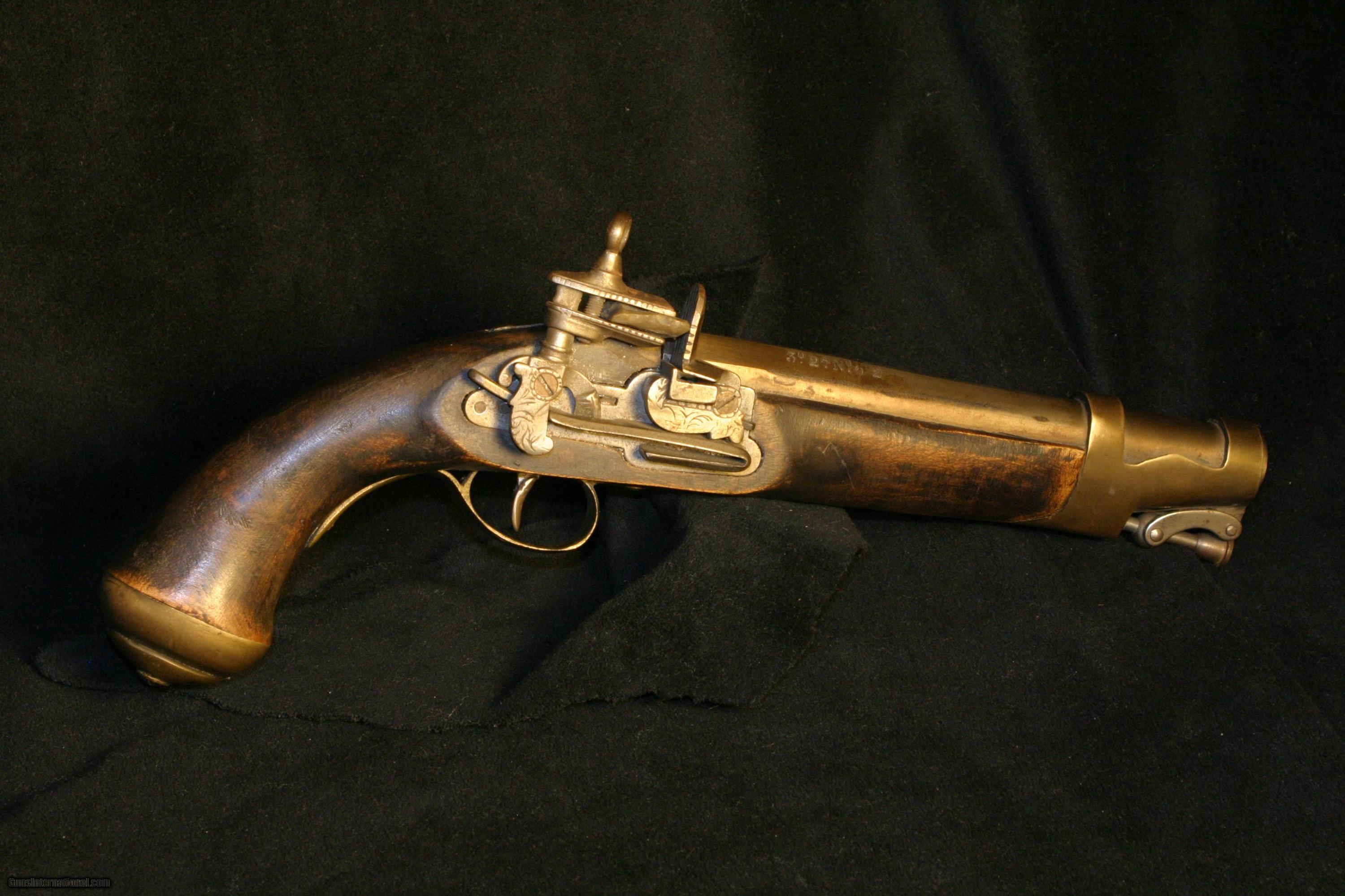 Description: Appears to be a Spanish belt flintlock in .62 blackpowder. SPANISH ROYAL GUARD FLINTLOCK PISTOL: Flintlock Pistol Engraved on Top "R! Cuerpo de Guard, de la Perona del Rey 30 2A No 69." With Spanish Royal Crest. Interesting Mechanical Safety and Ramrod Keeper for Mounted Rider. SOLD |