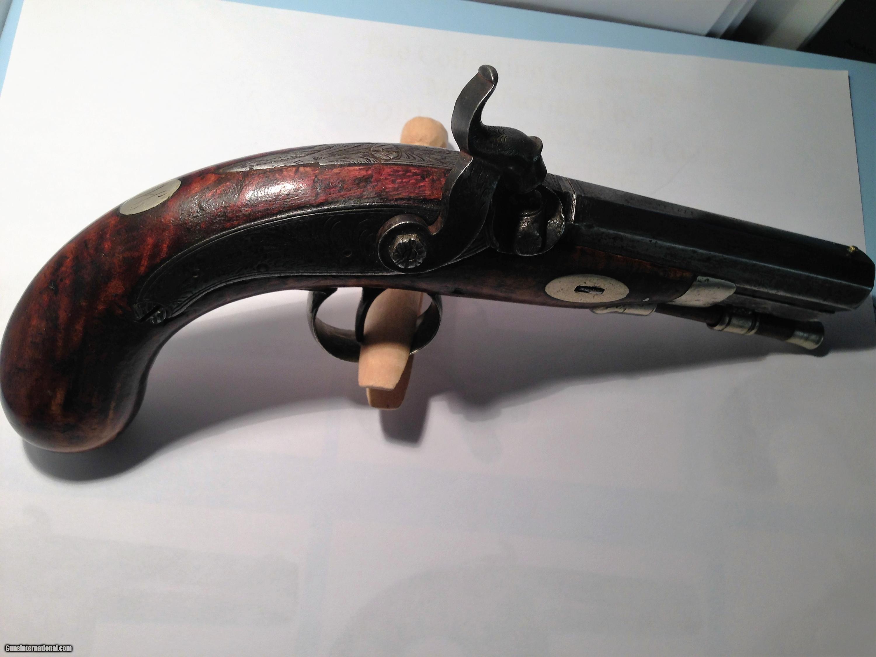Description: This Deringer style pistol is one of only 3 known. It has a tiger maple stock, which is sound and was never checkered. The engraved lock plate is engraved "T. GOWDY", the top barrel flat is engraved "NASHVILLE". The original ram rod is birdseye maple and capped in German Silver. It has a cap box in the butt and the original belt hook is of iron. The tang, breech, trigger guard and cap box doors are all engraved. It has one wide silver band and one very small silver band over the breech where the barrel screws into the breech plug. This is a .52 caliber smooth bore. The barrel is 4" long and the gun overall is 8 1/2" and is Circa 1845-1850. ?Made and marked Deringer style belt pistols are seldom seen for sale. Thomas Gowdy can be accessed on the internet, which shows a picture of Gowdy and bio illustrating pieces of his sterling cups and flatware, the things he was well known for other than guns. An extreme rarity. Free shipping in USA. SOLD Antique: Yes |